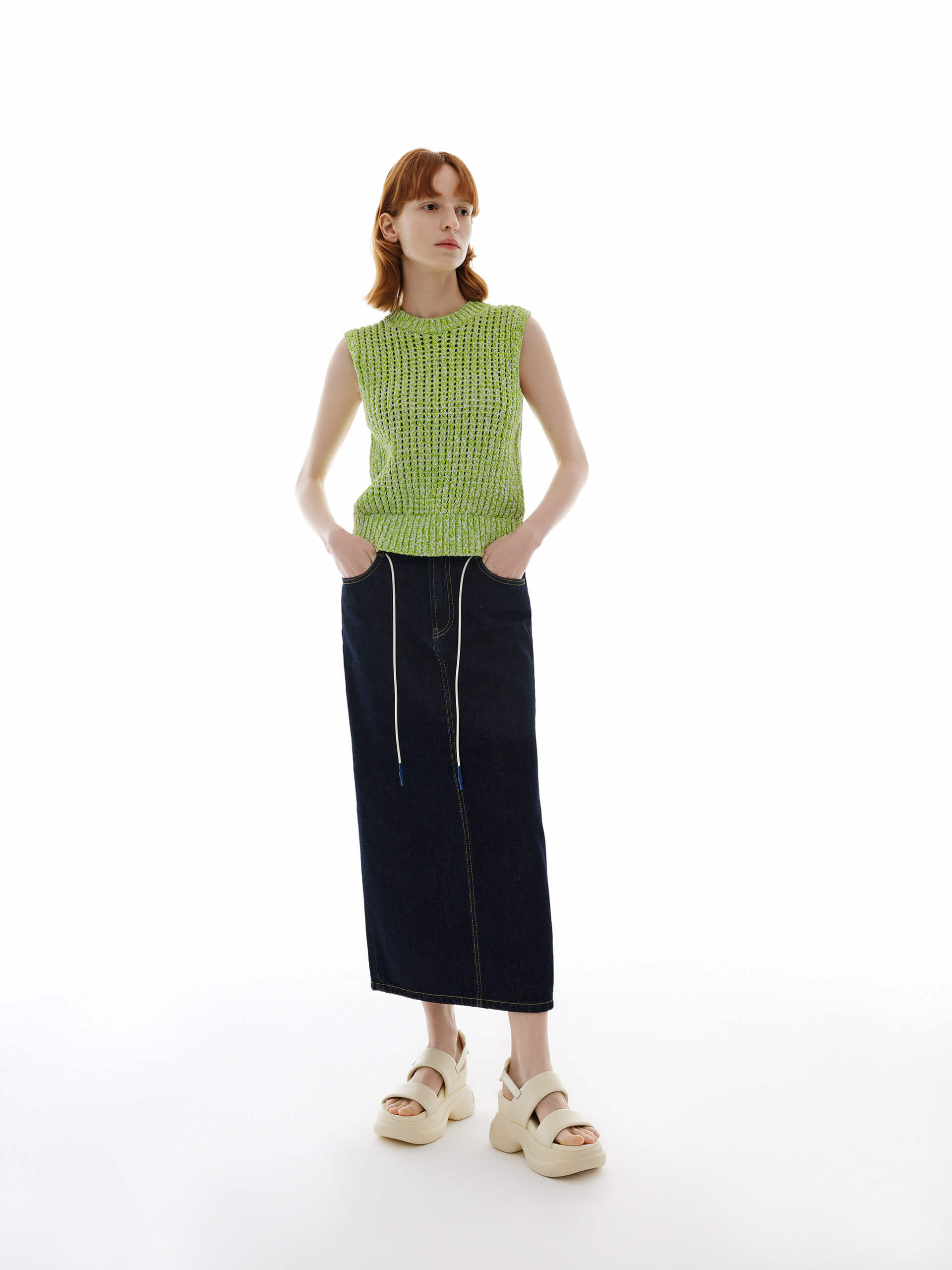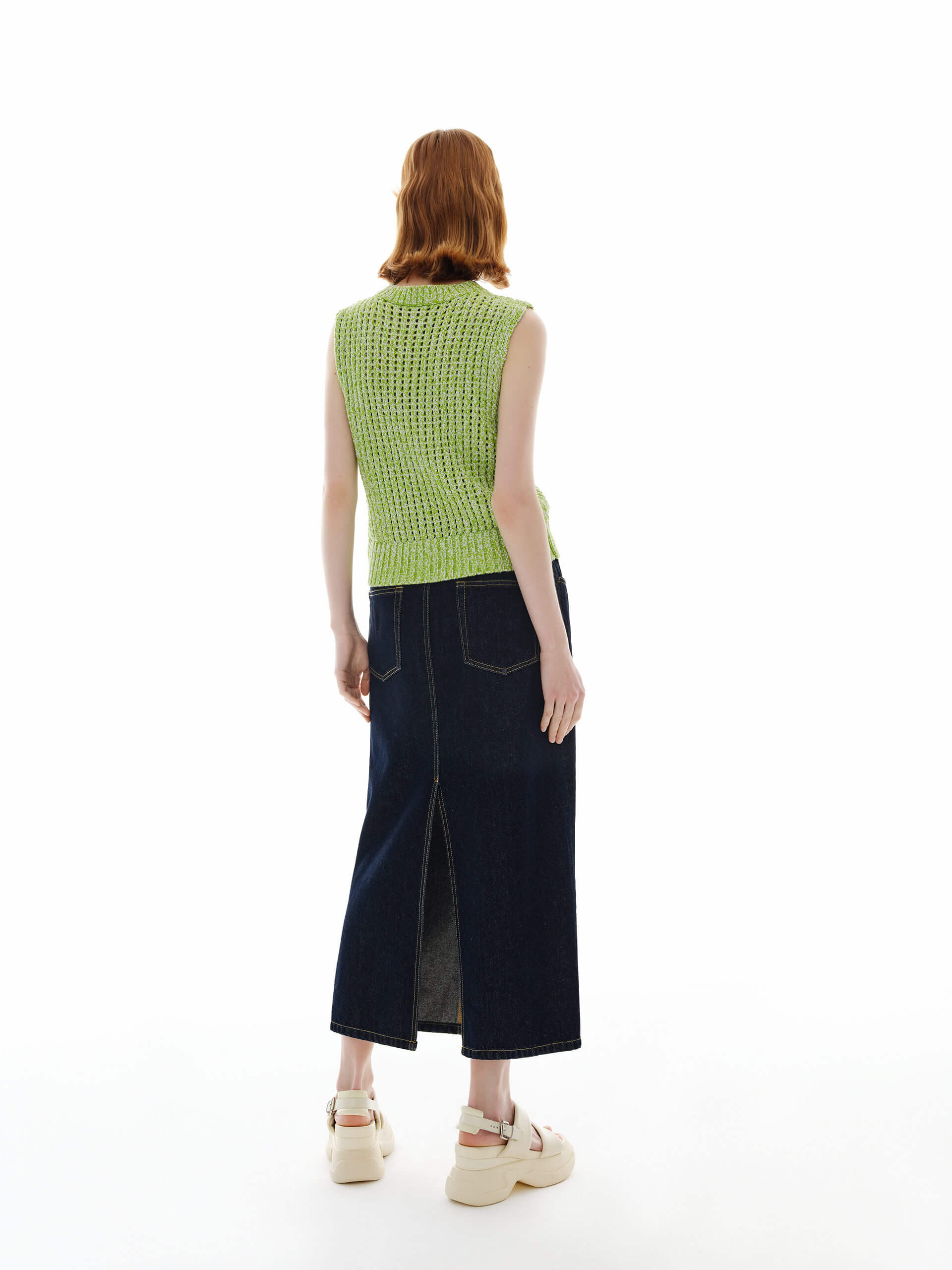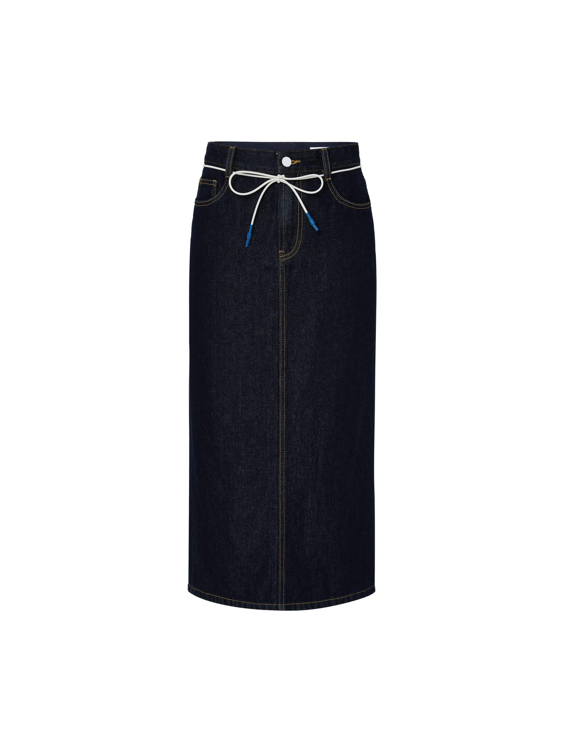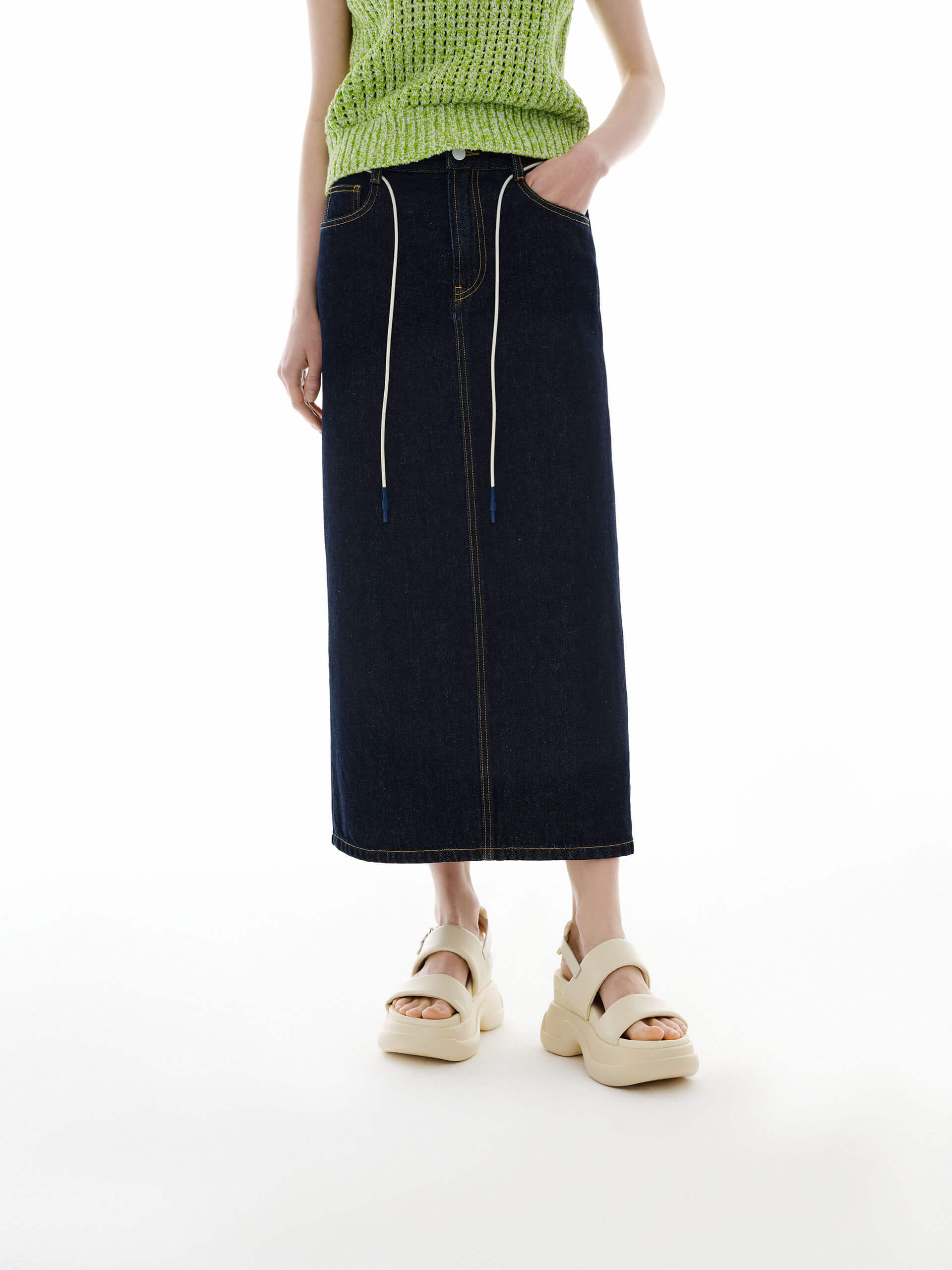 Crafted from pure cotton denim, this skirt features a straight and medium-length silhouette with a delicate back slit detail. Pair it with our green top for a refreshing and stylish spring look. Please note that the natural denim may fade, so please avoid pairing it with light-colored clothing or bags, and wash separately from light colors.