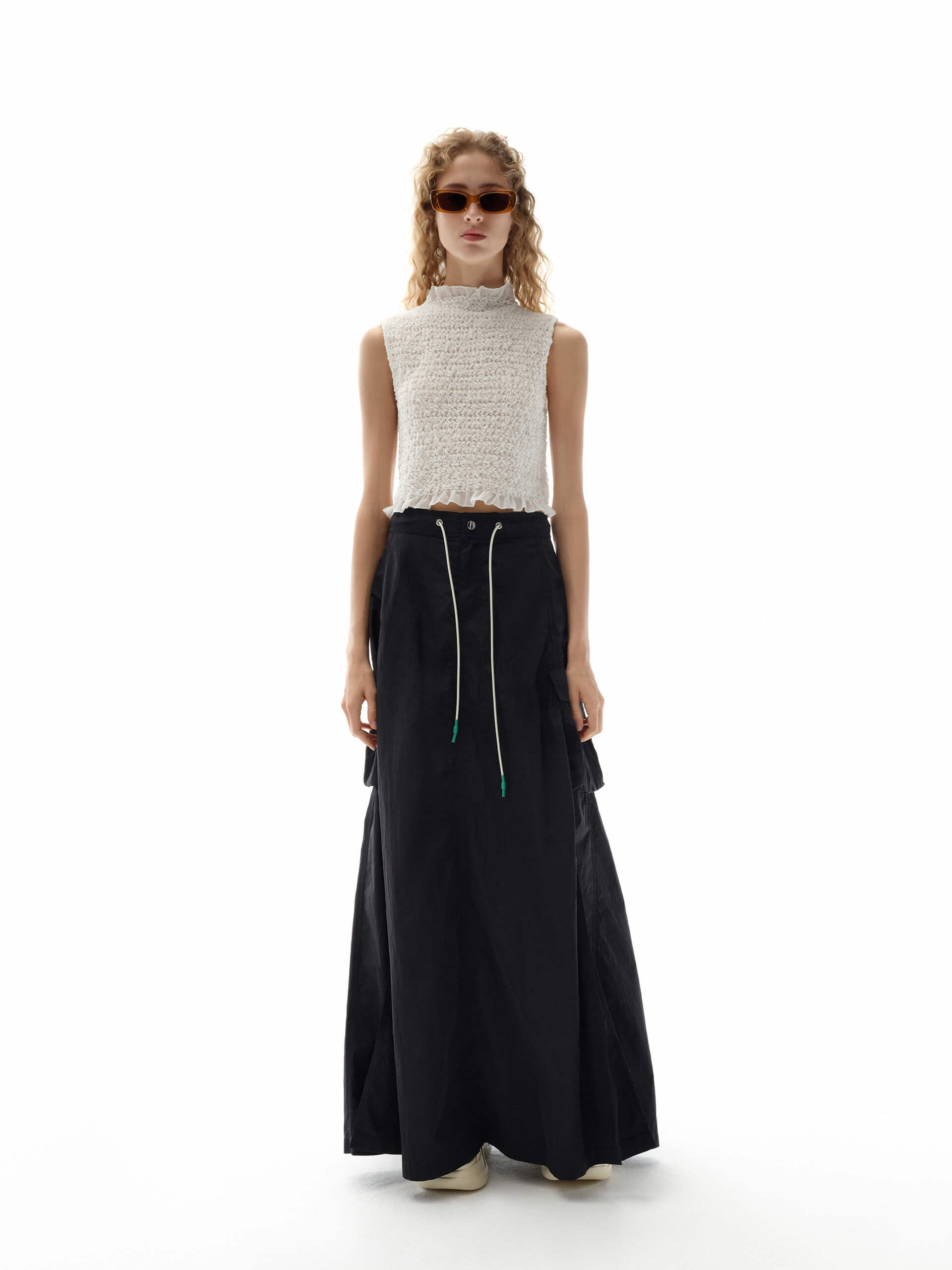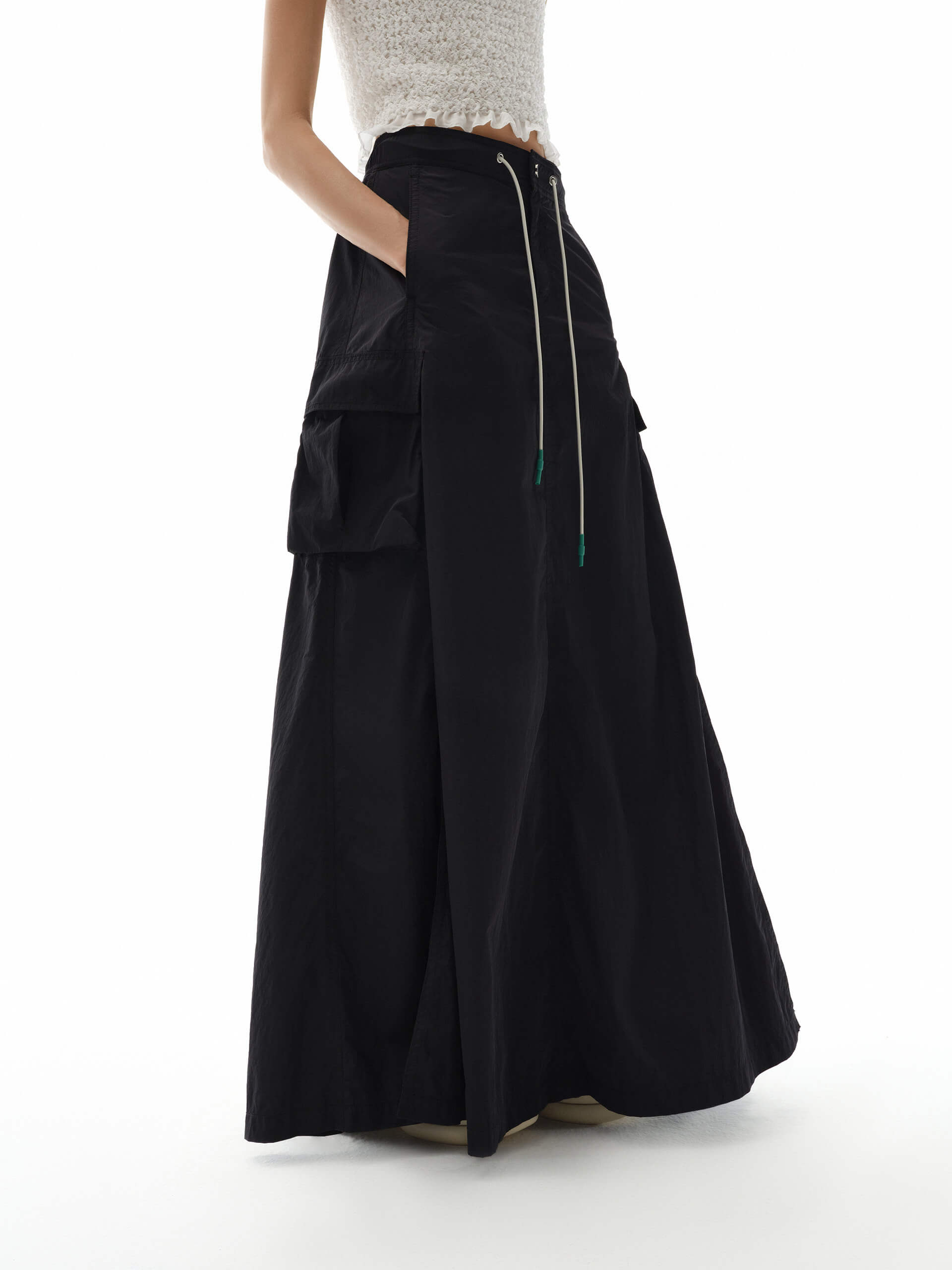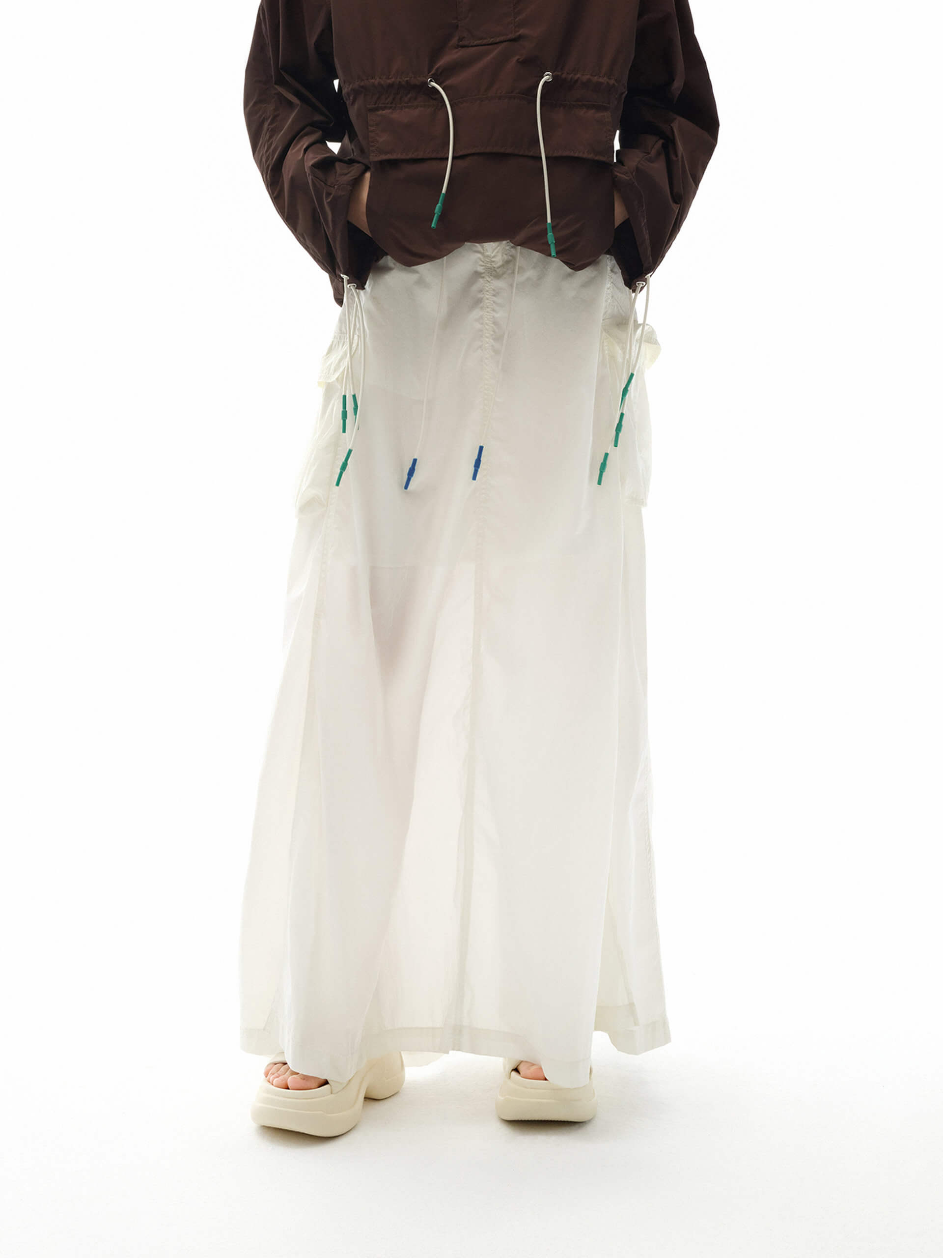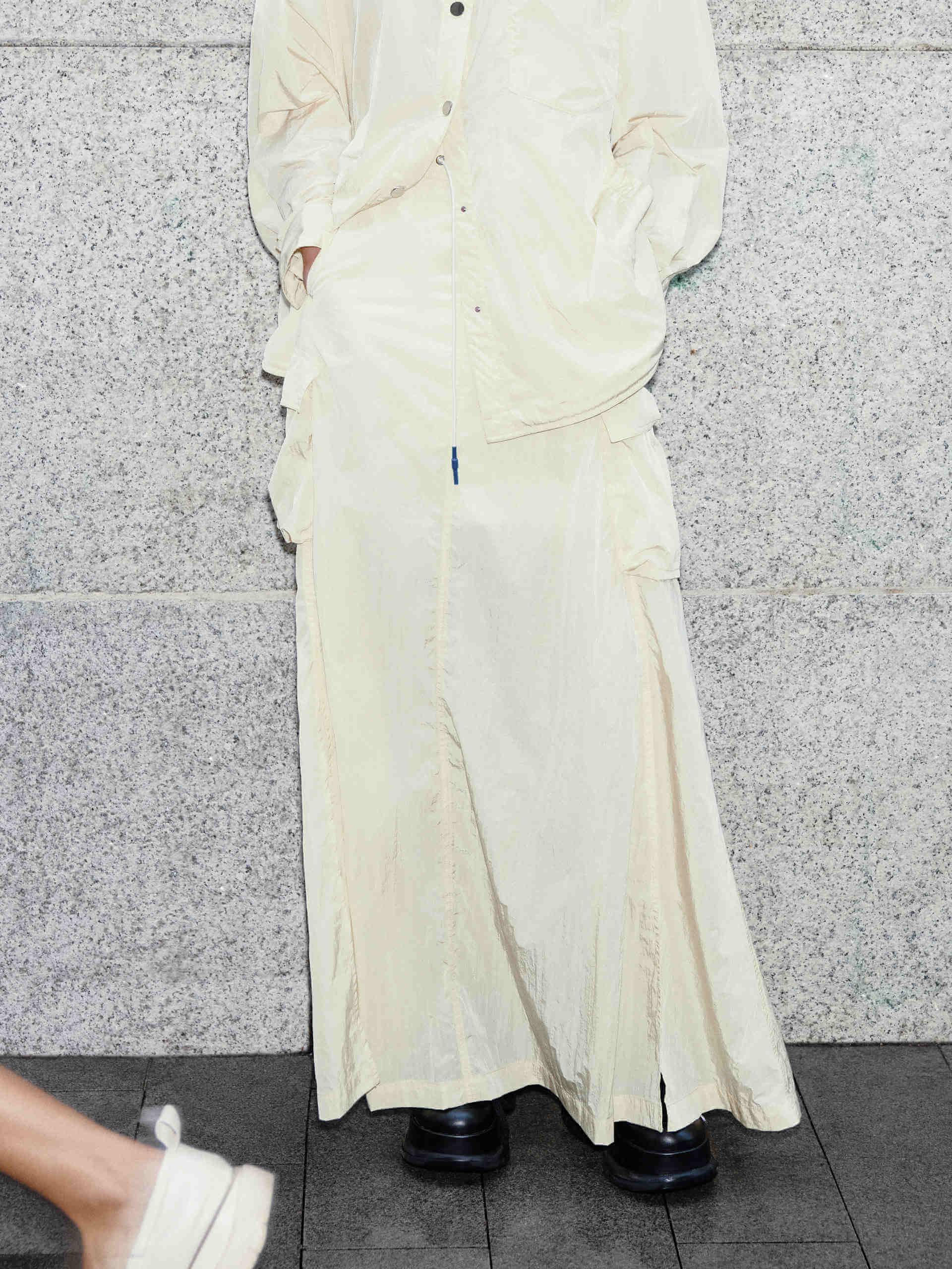 Elevated essentials are central to our collection, this skirt is crafted with intentionally crinkled and lightweight material. The ultra-long length features a built in mini-liner skirt and side slits for effortless movement. Complete with a drawstring waistband and cargo pockets, this skirt pairs perfectly with its matching jacket or top for a trendy coordinated look.