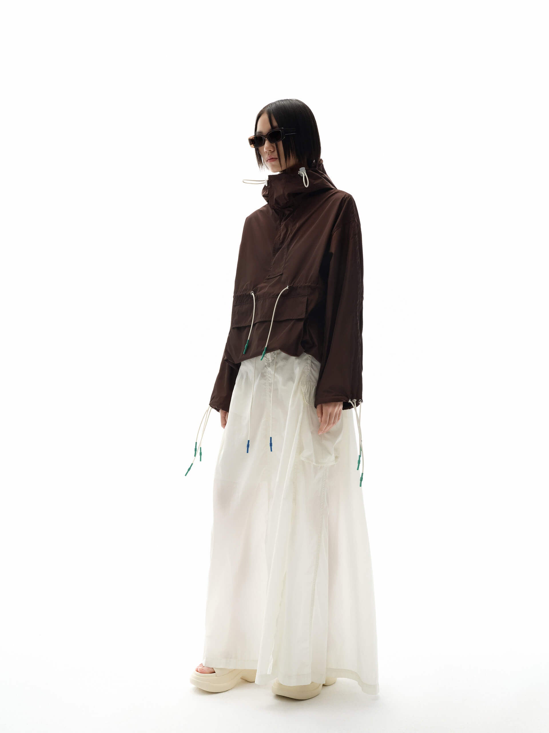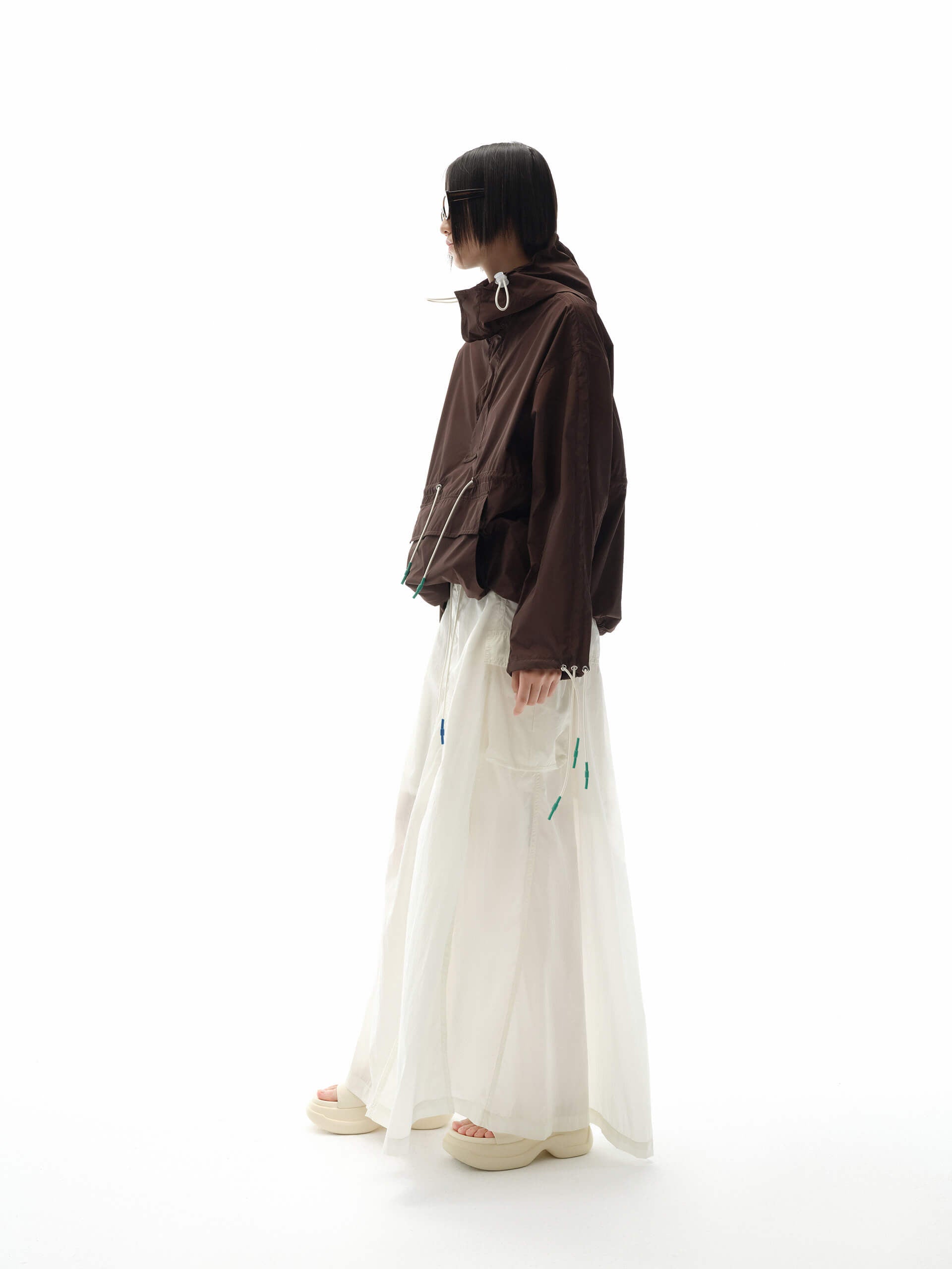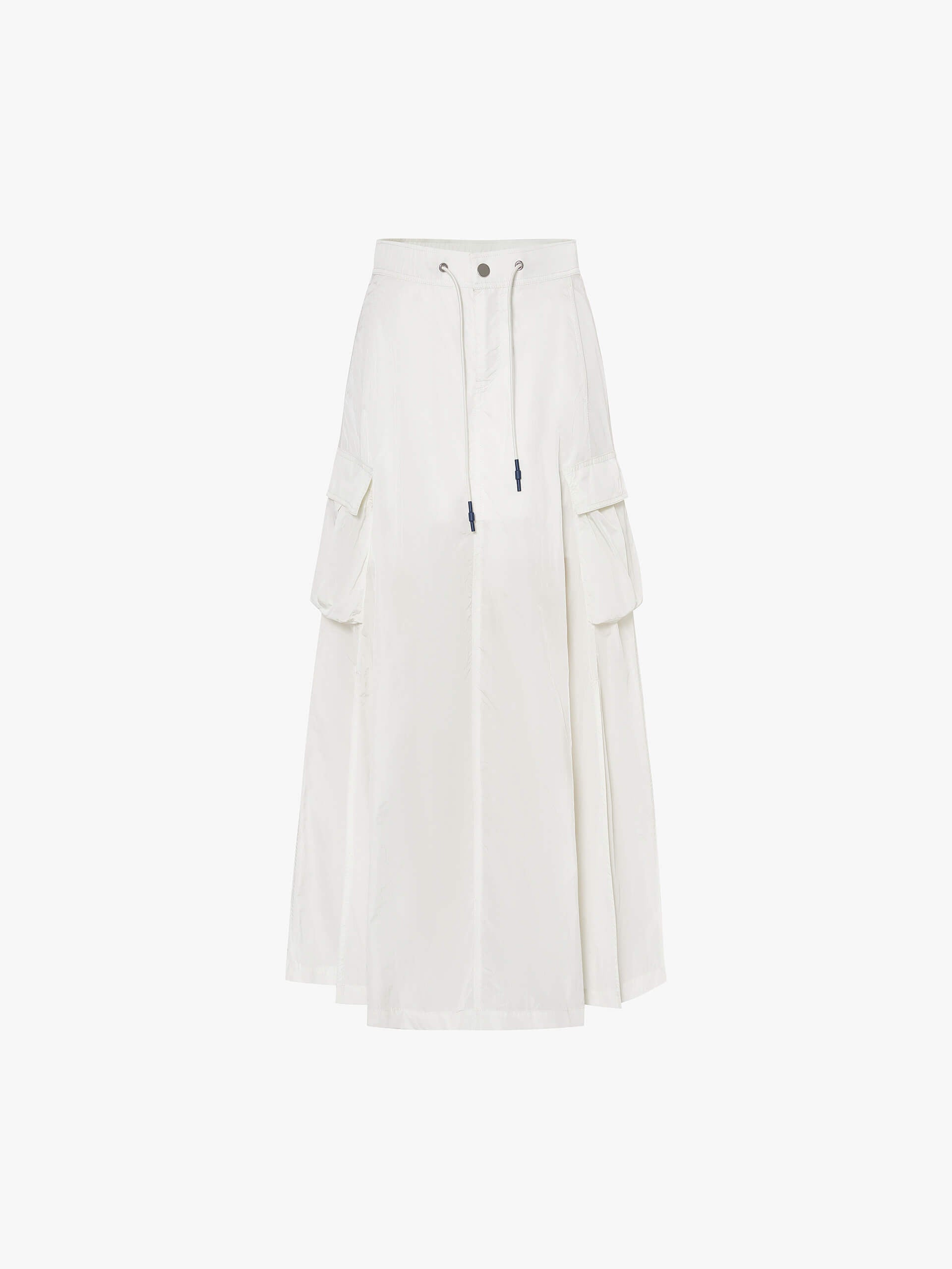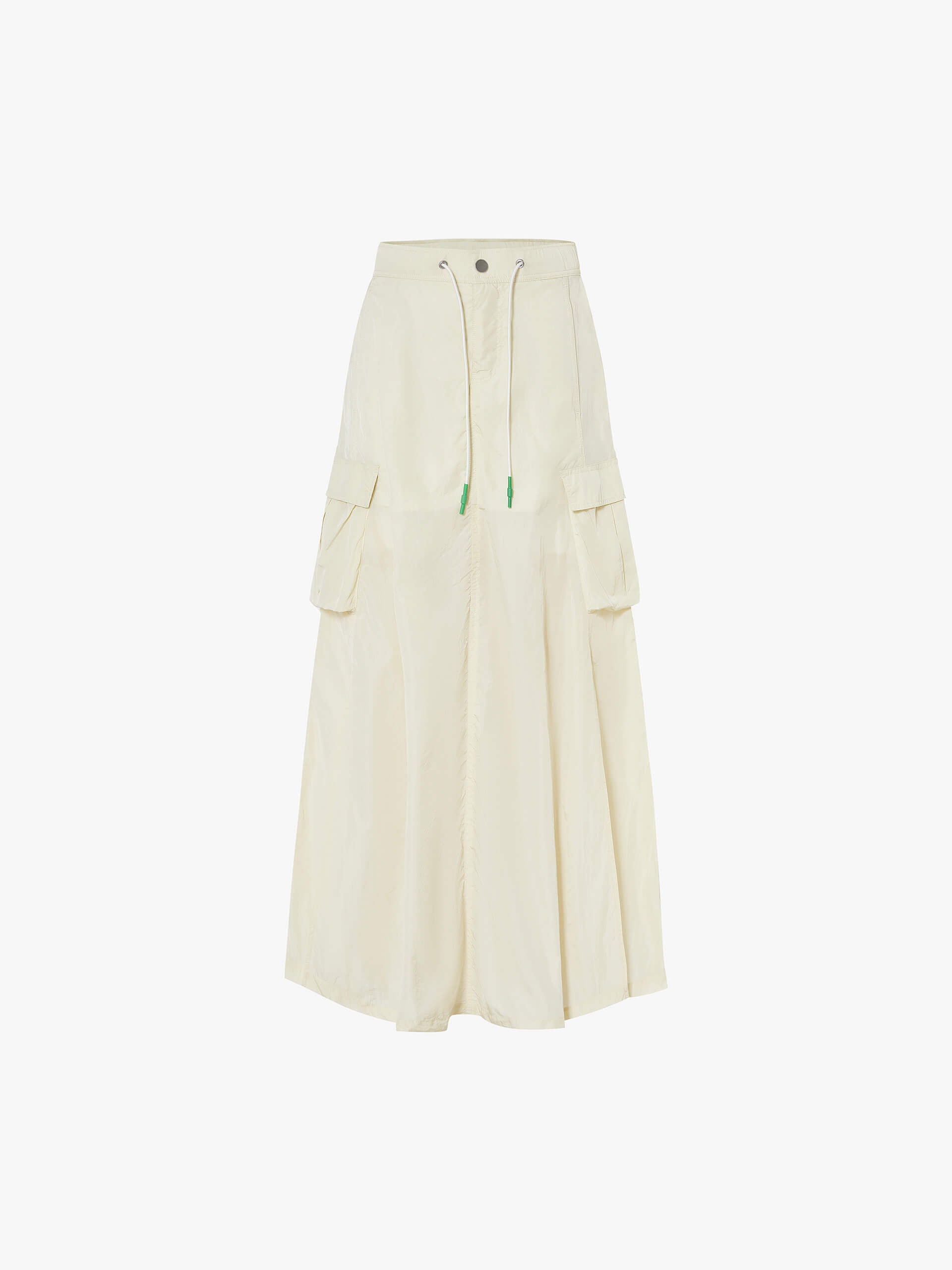Elevated essentials are central to our collection, this skirt is crafted with intentionally crinkled and lightweight material. The ultra-long length features a built in mini-liner skirt and side slits for effortless movement. Complete with a drawstring waistband and cargo pockets, this skirt pairs perfectly with its matching jacket or top for a trendy coordinated look.