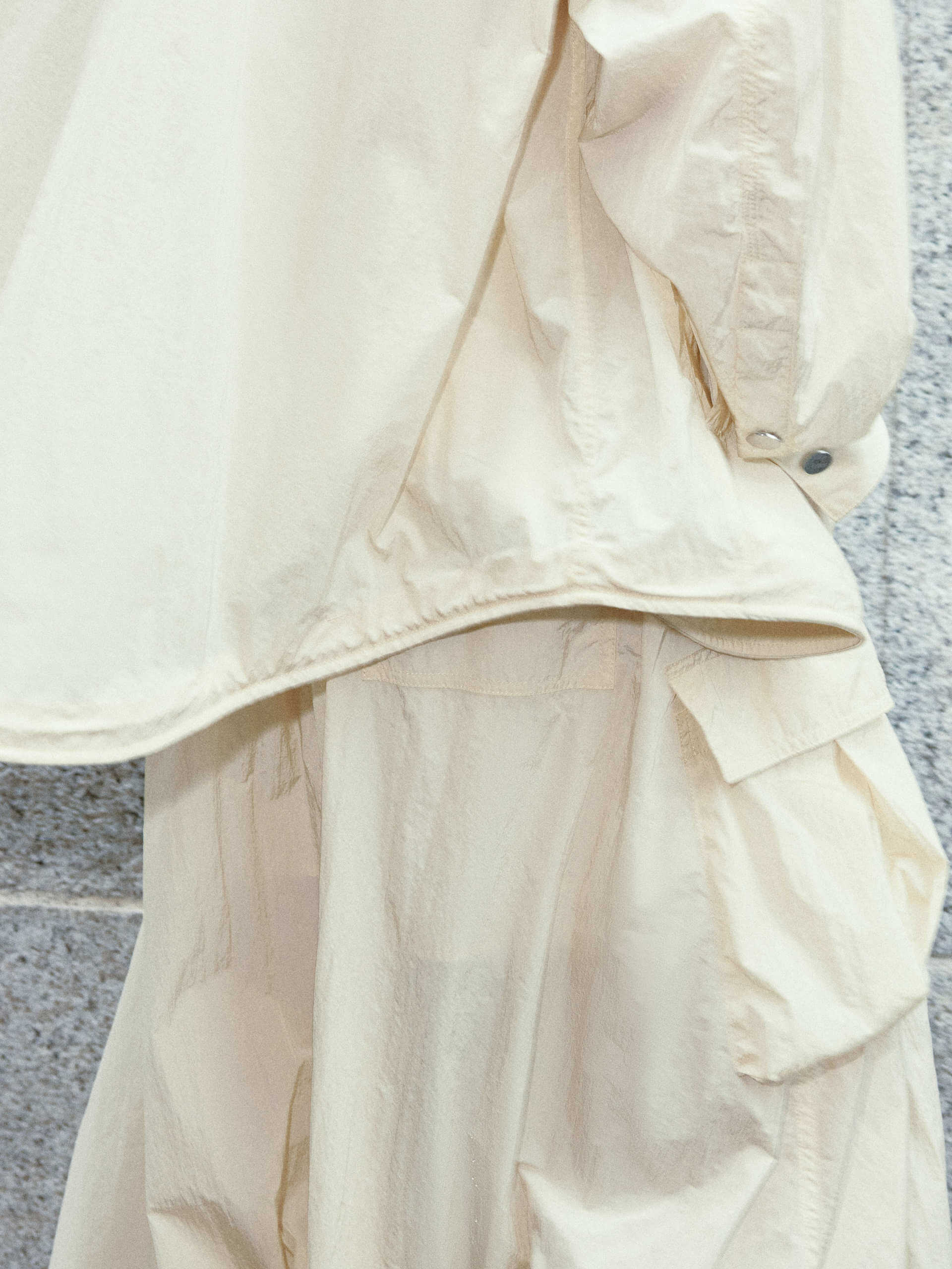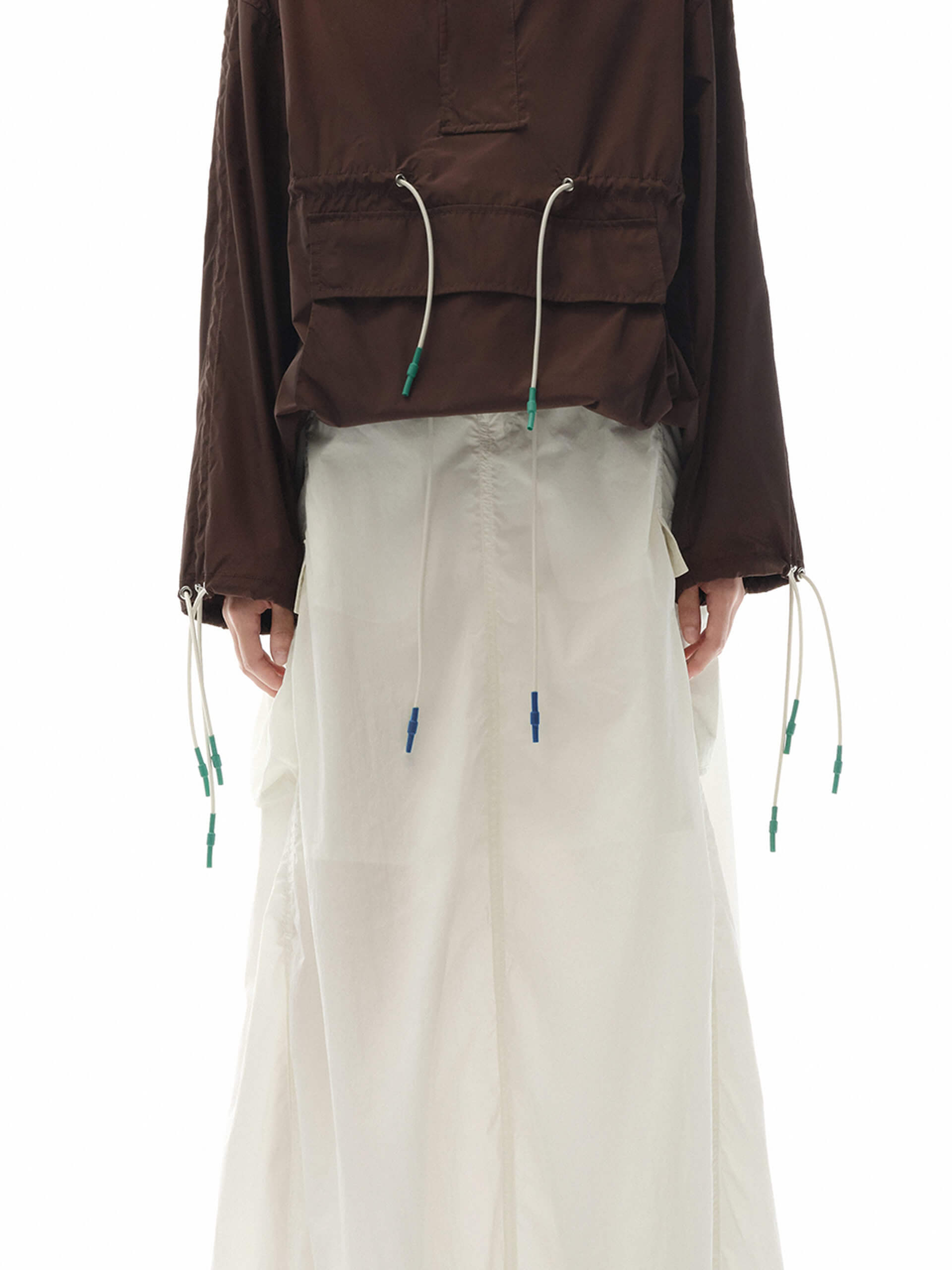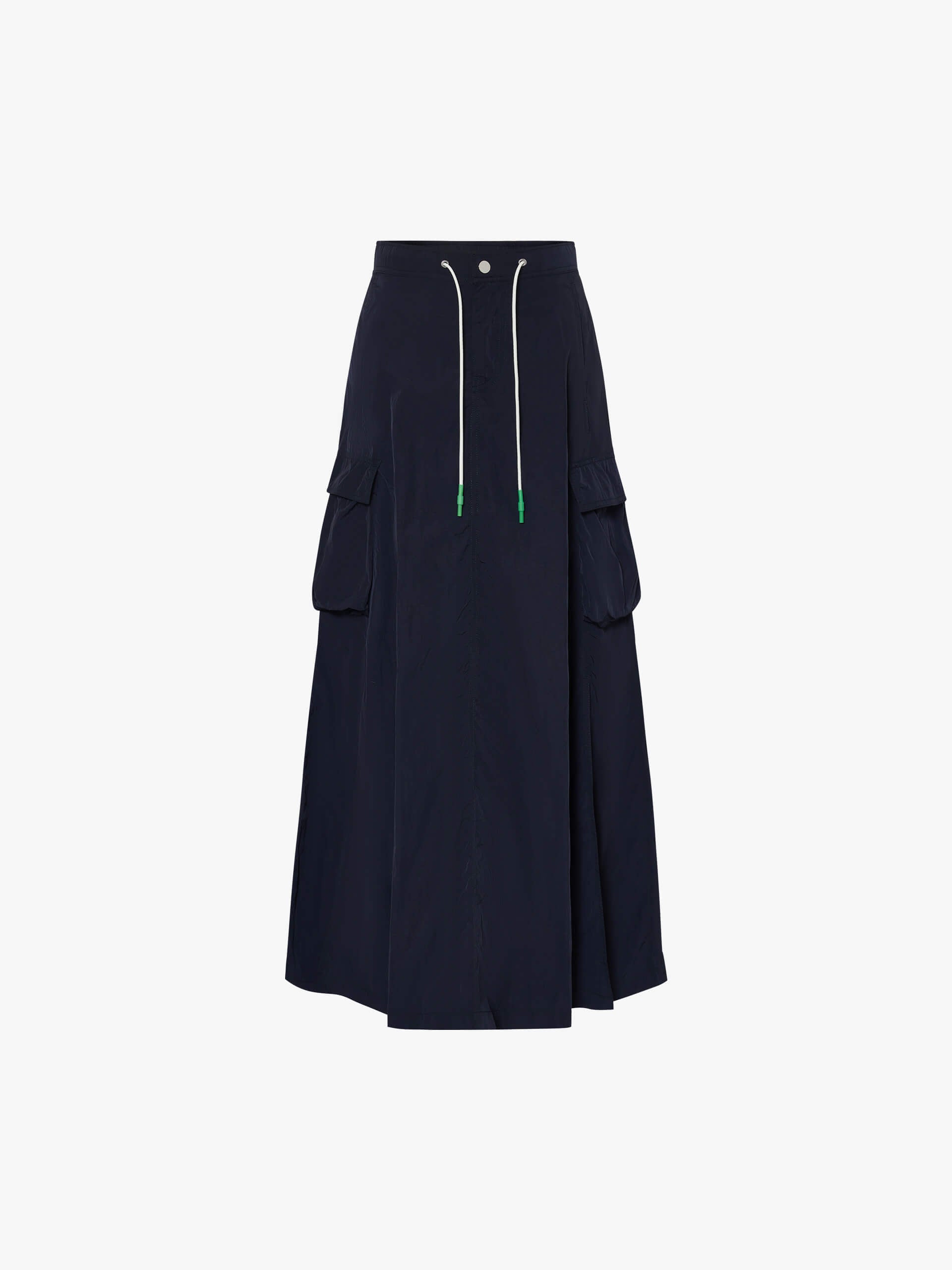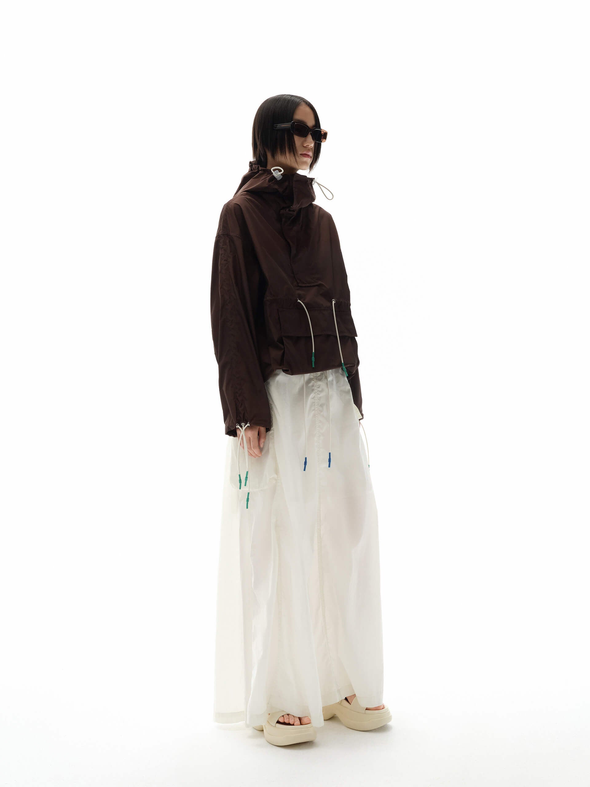 Elevated essentials are central to our collection, this skirt is crafted with intentionally crinkled and lightweight material. The ultra-long length features a built in mini-liner skirt and side slits for effortless movement. Complete with a drawstring waistband and cargo pockets, this skirt pairs perfectly with its matching jacket or top for a trendy coordinated look.