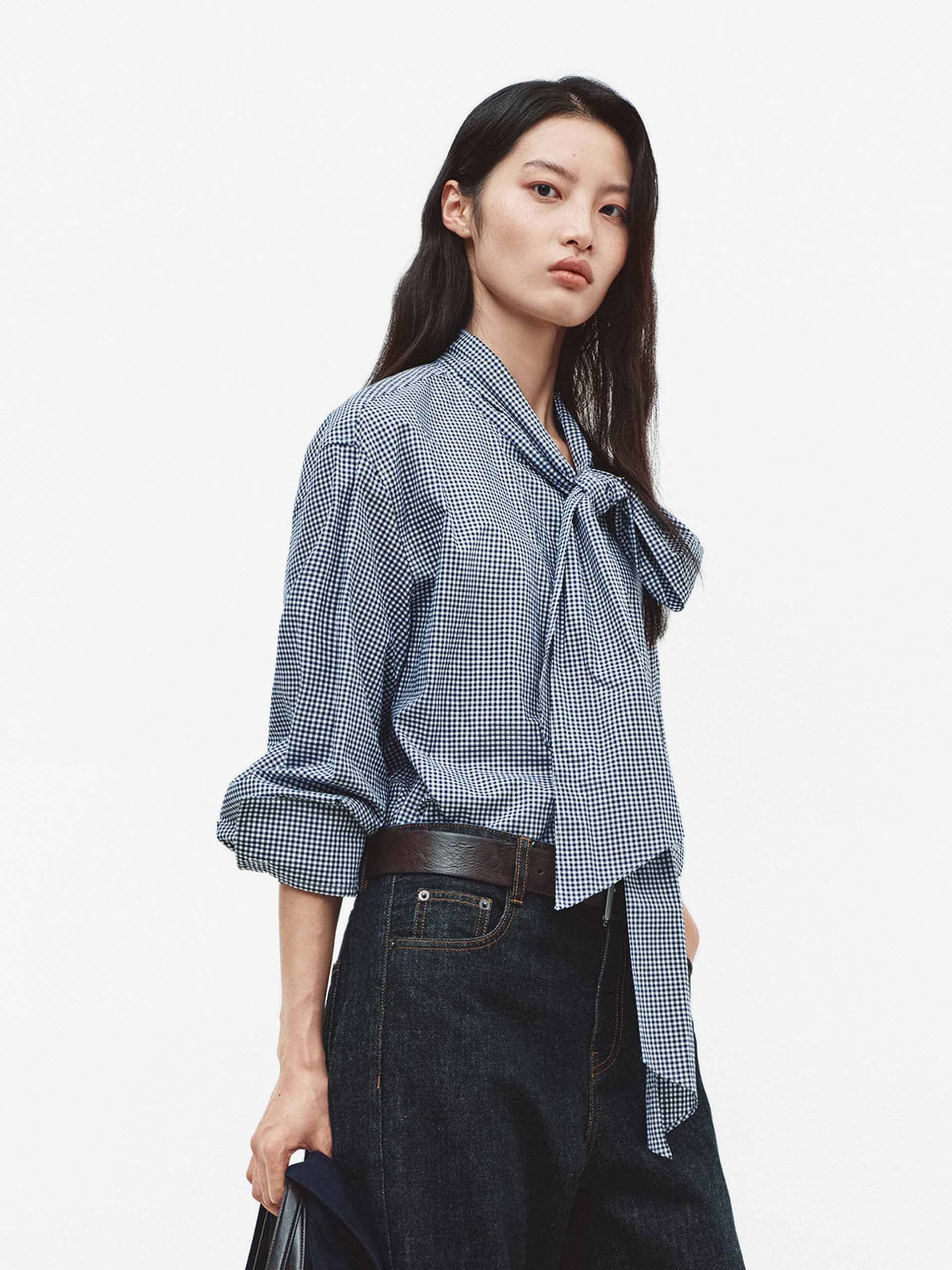This pure cotton plaid blouse features a rounded, slit hem, exuding a casual yet lively vibe. The widened and lengthened ribbon can be tied into a bow or left to hang loose, making it perfect for pairing with high-waisted bottoms to create a relaxed yet sophisticated everyday look. Please note: actual garment color may differ slightly from model photos due to lighting and screen settings.