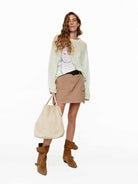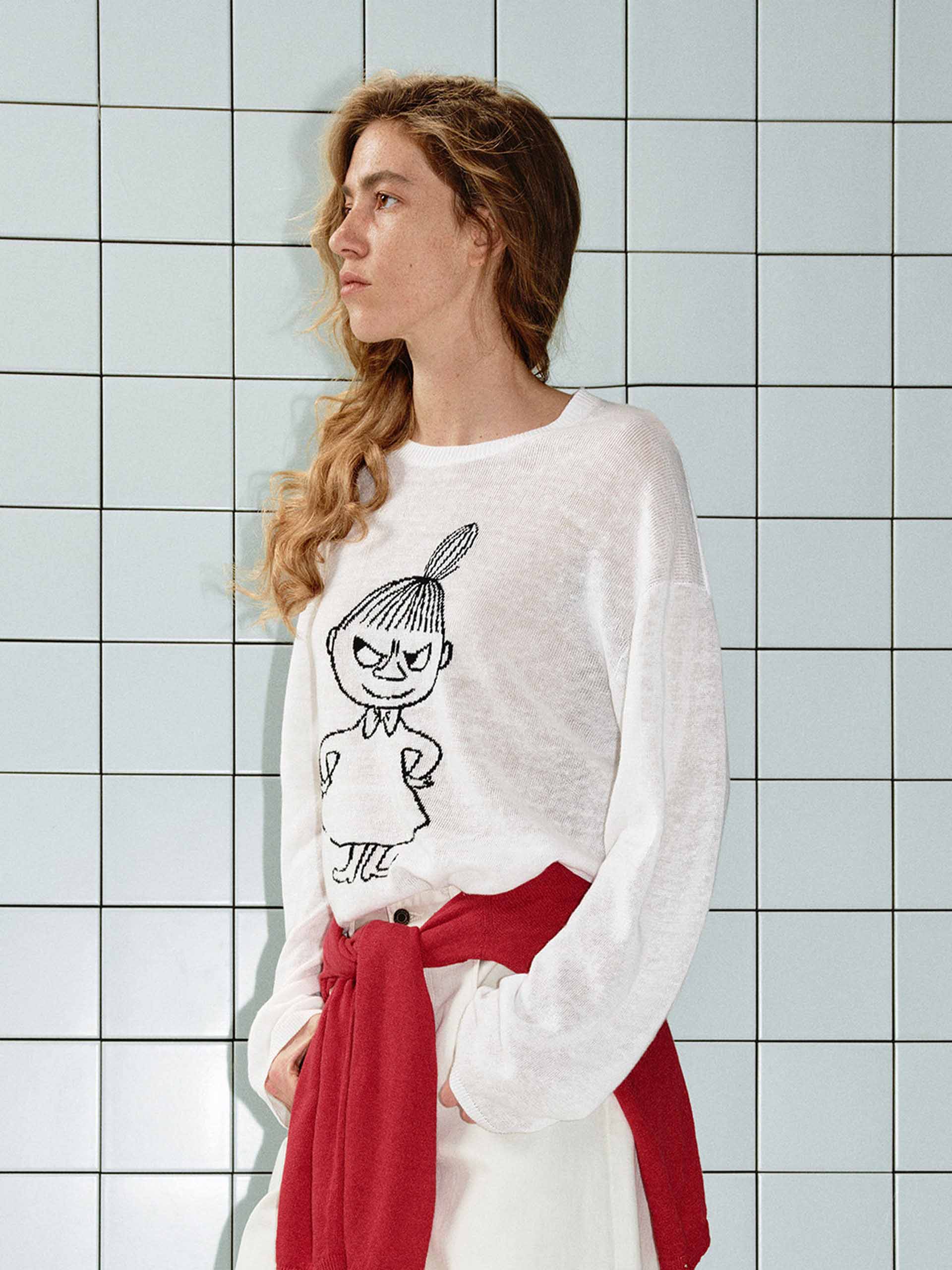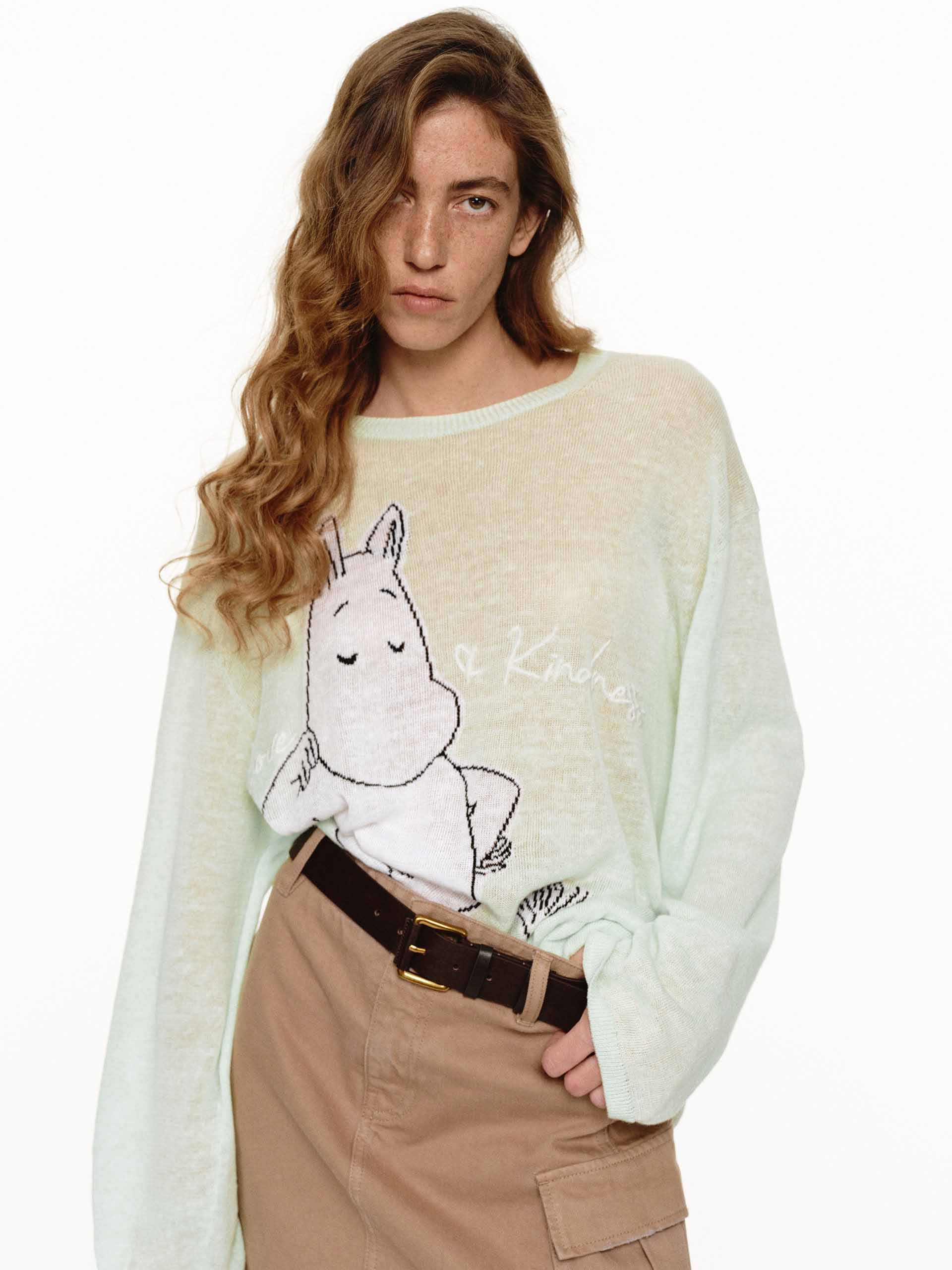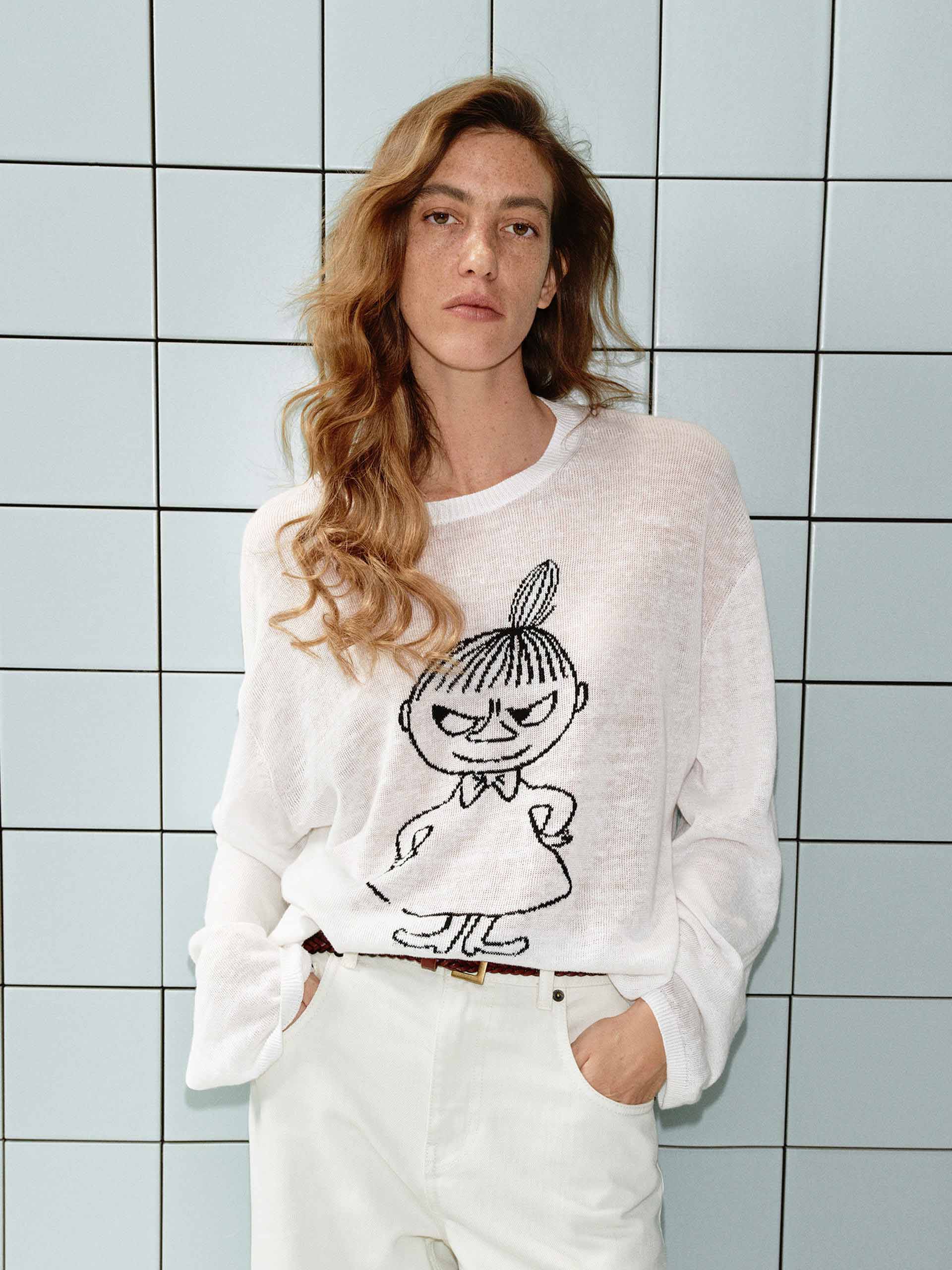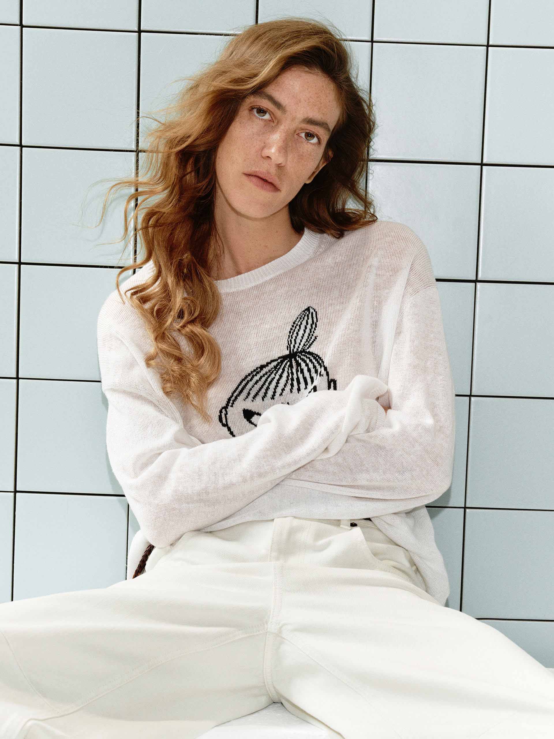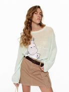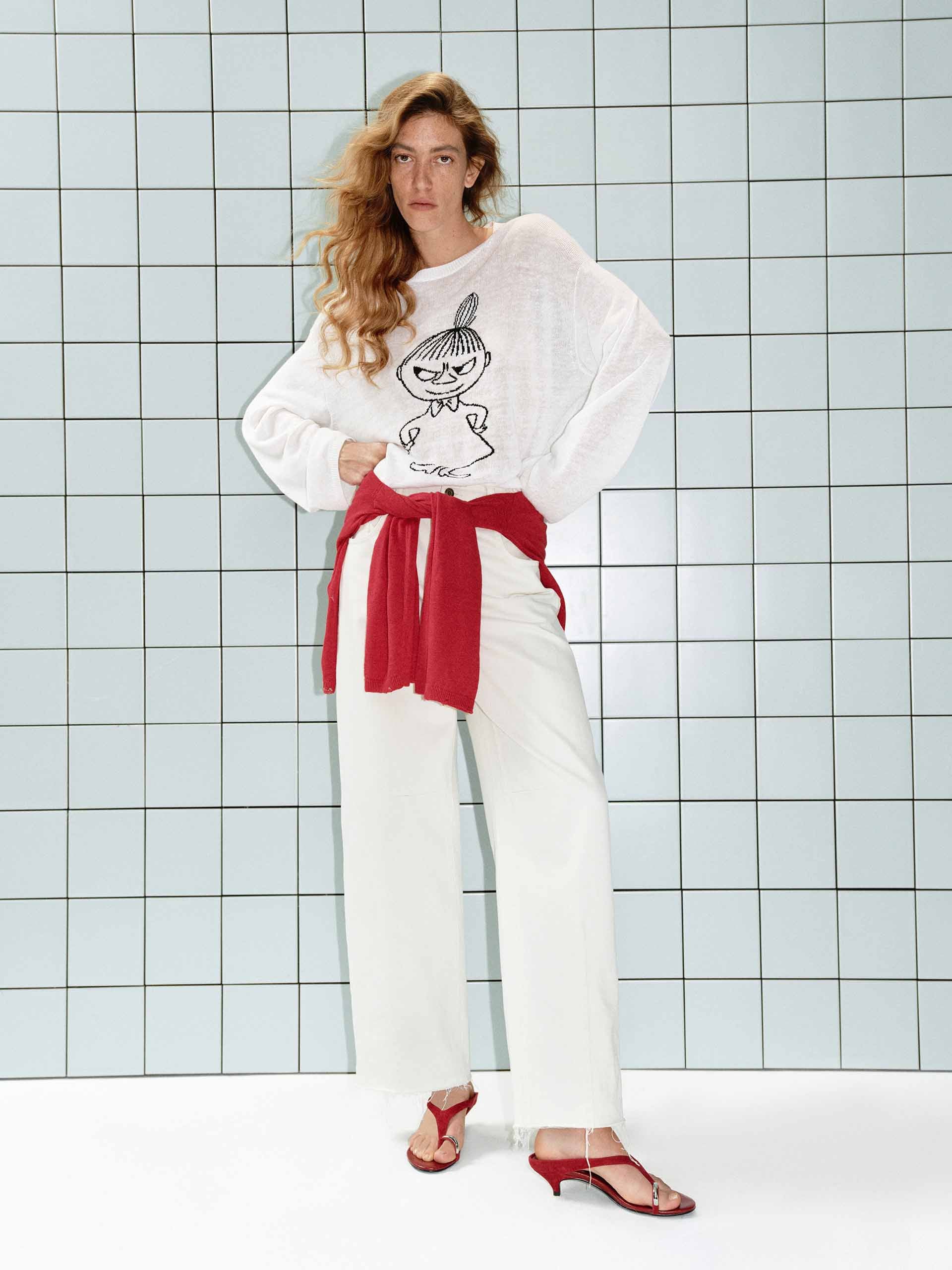 This MO&Co. x MOOMIN collaboration knit top offers a playful yet refined take on casual style. The lightweight linen-cotton blend creates a subtly sheer, airy feel, while the charming Moomin embroidery adds a playful touch to your spring and summer looks.