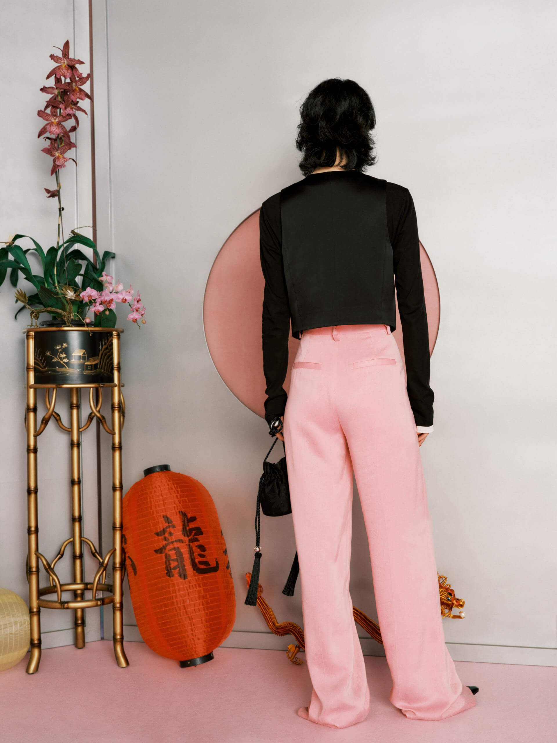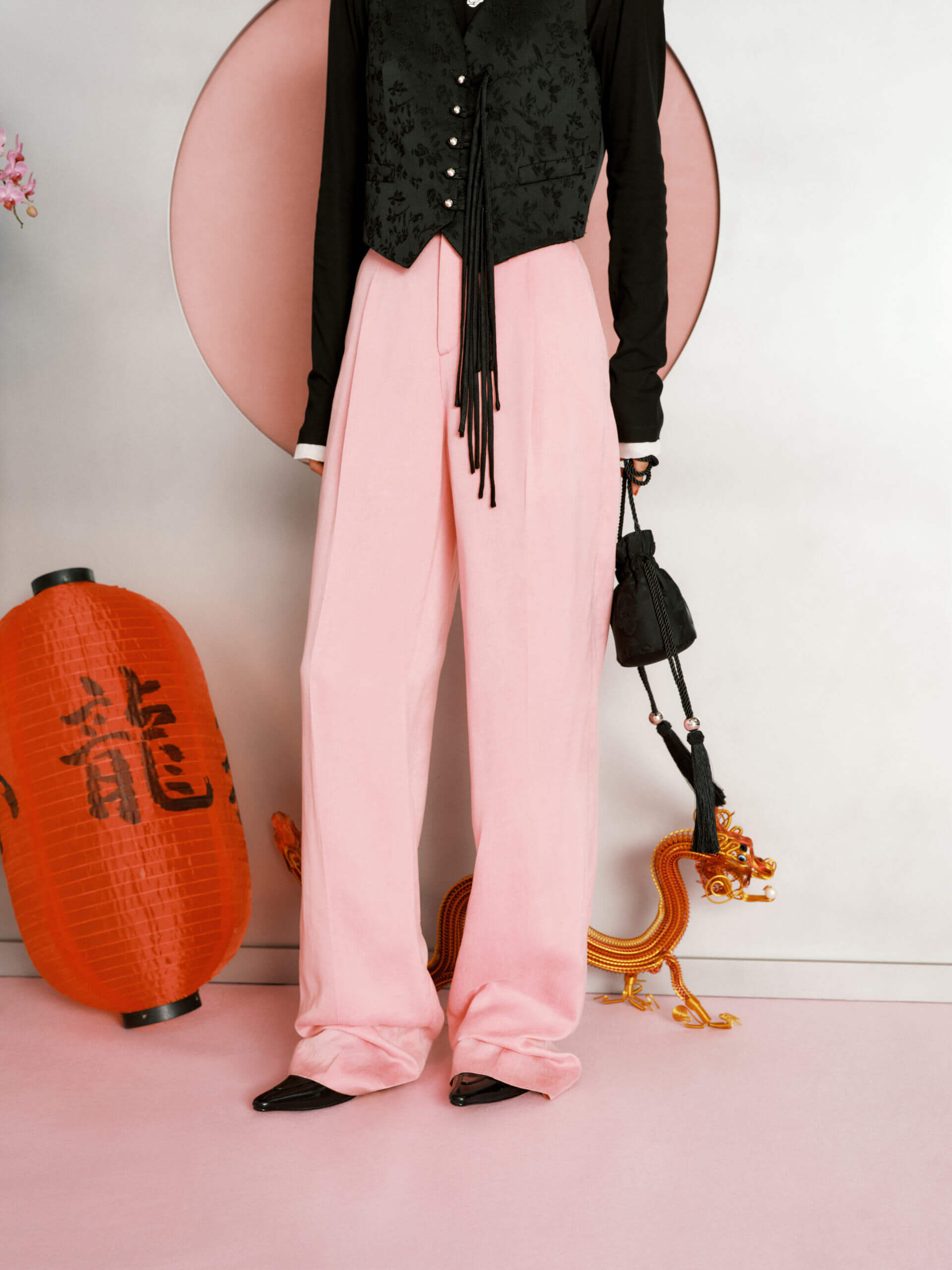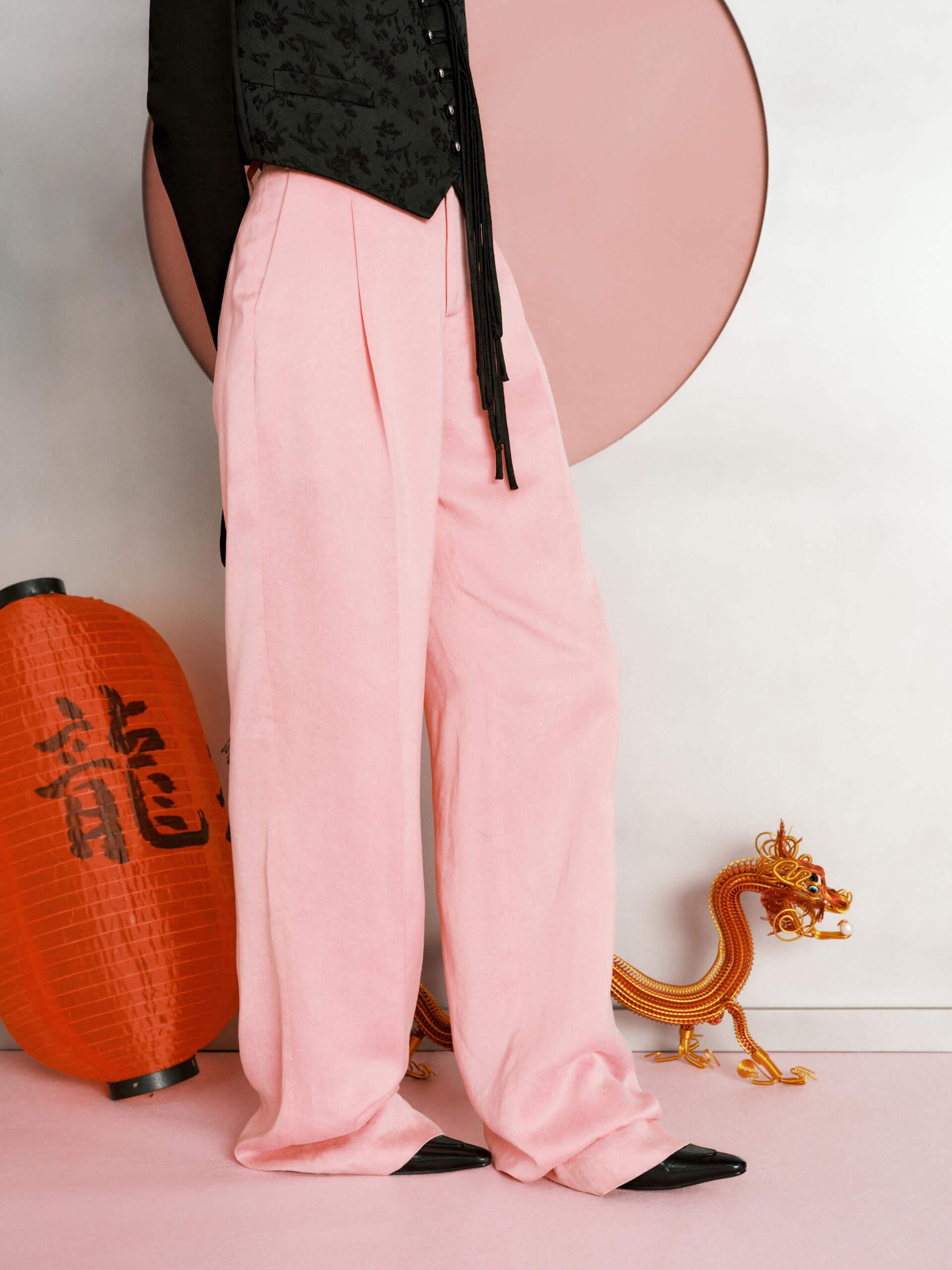 These pants are calling for a slouchy special day. Crafted from well-made fabric, they are shaped with a streamlined straight silhouette with a fully smooth and comfy texture. A soft pink hue adds a touch of elegance, making it a standout for special occasions.