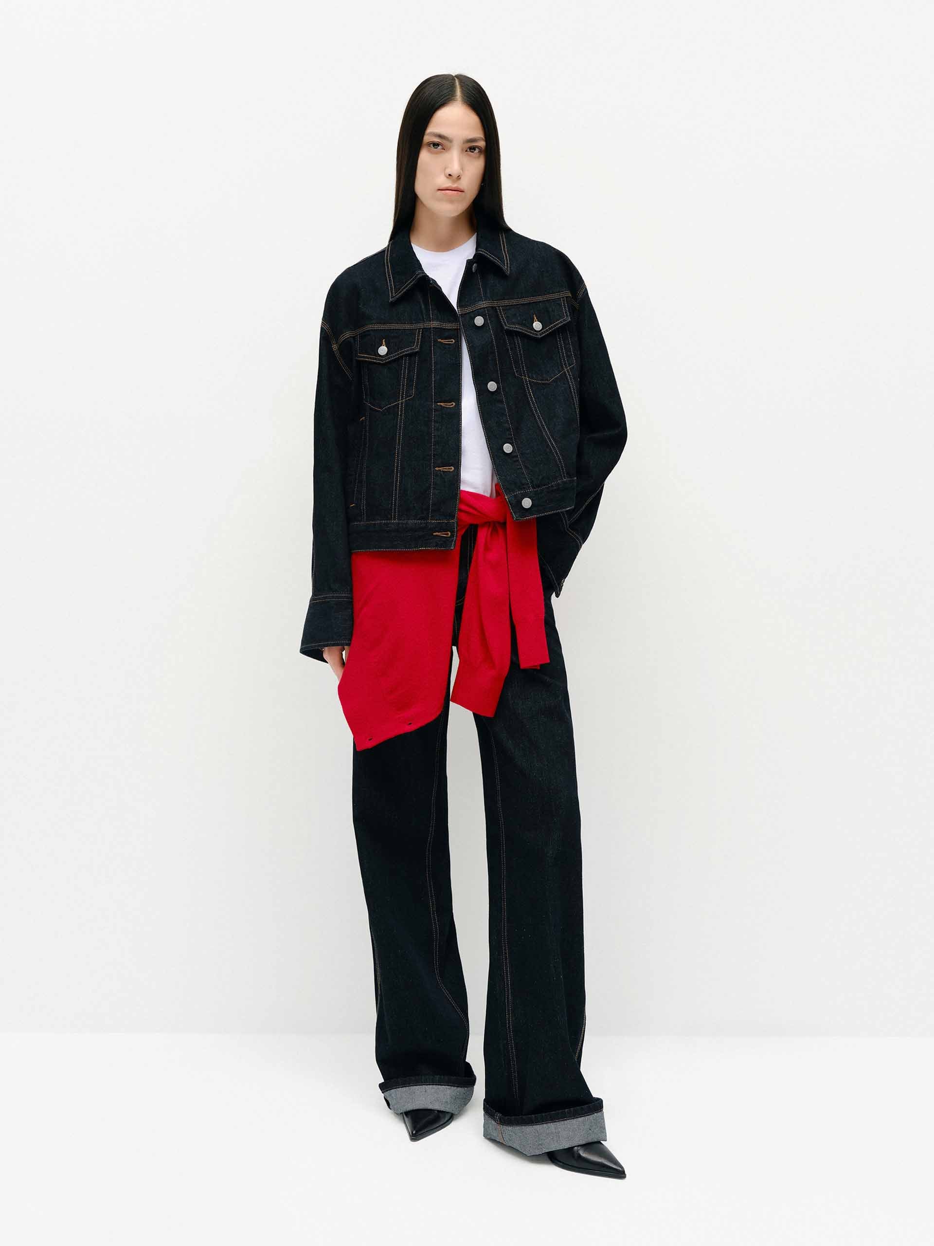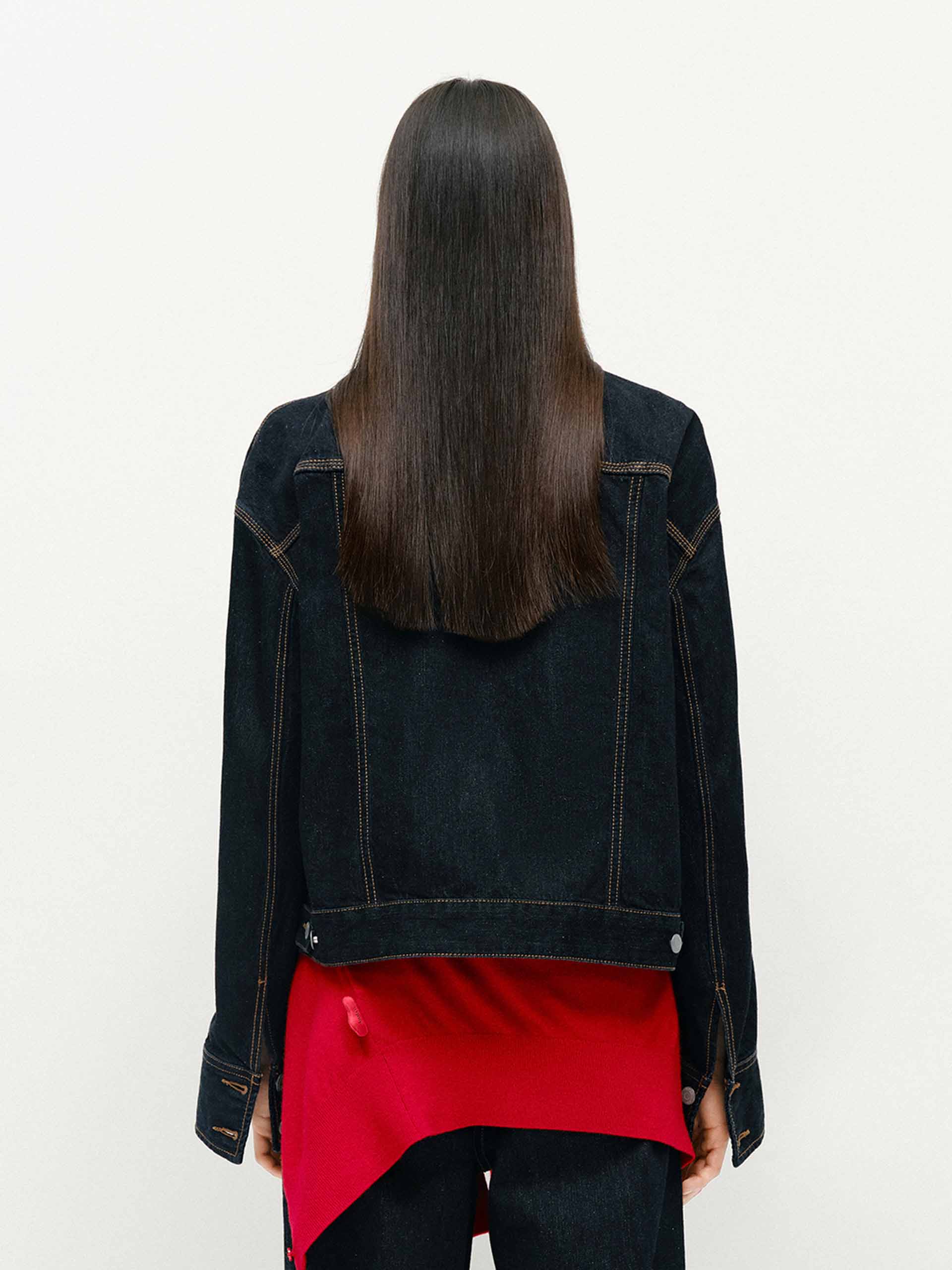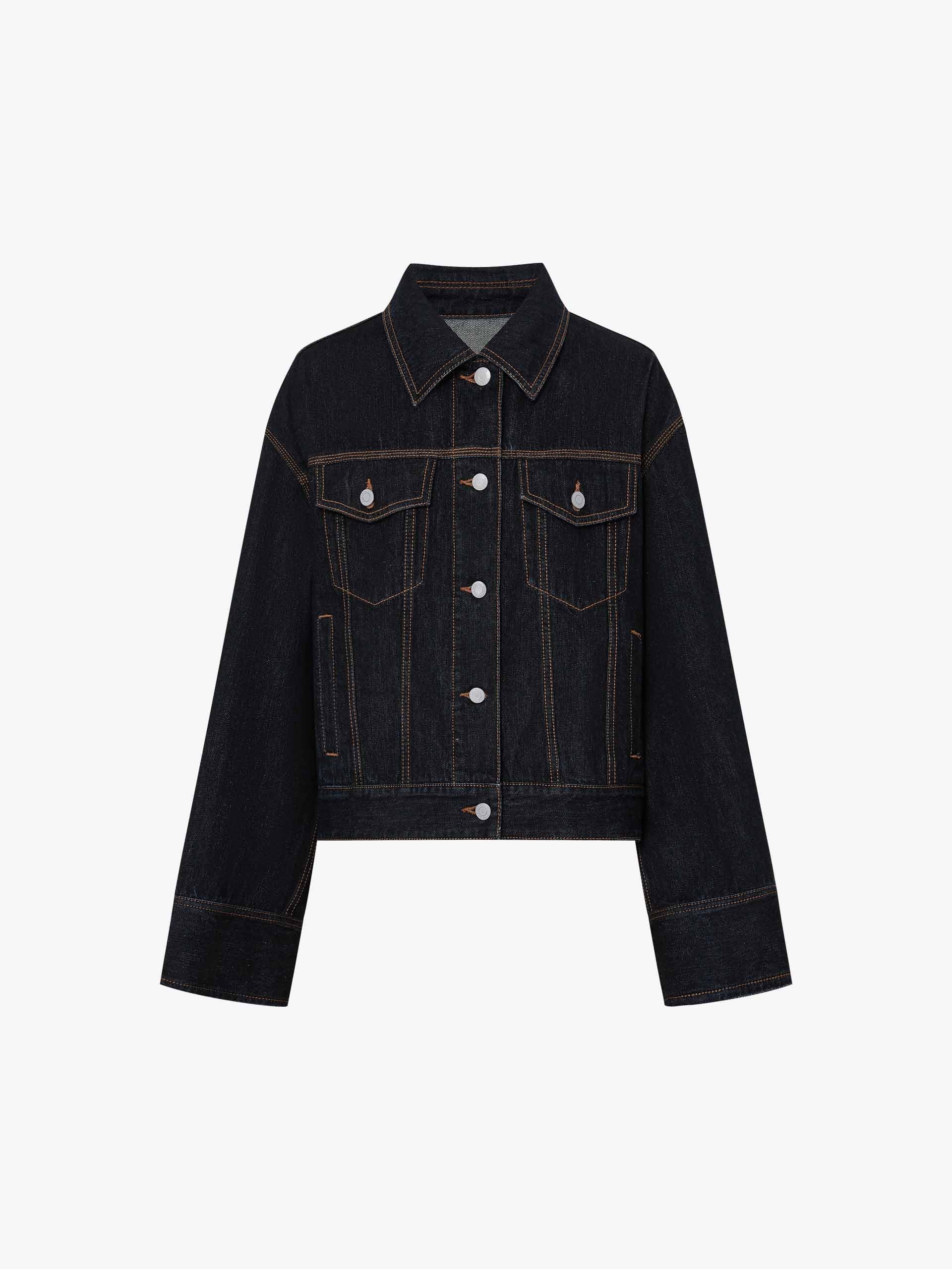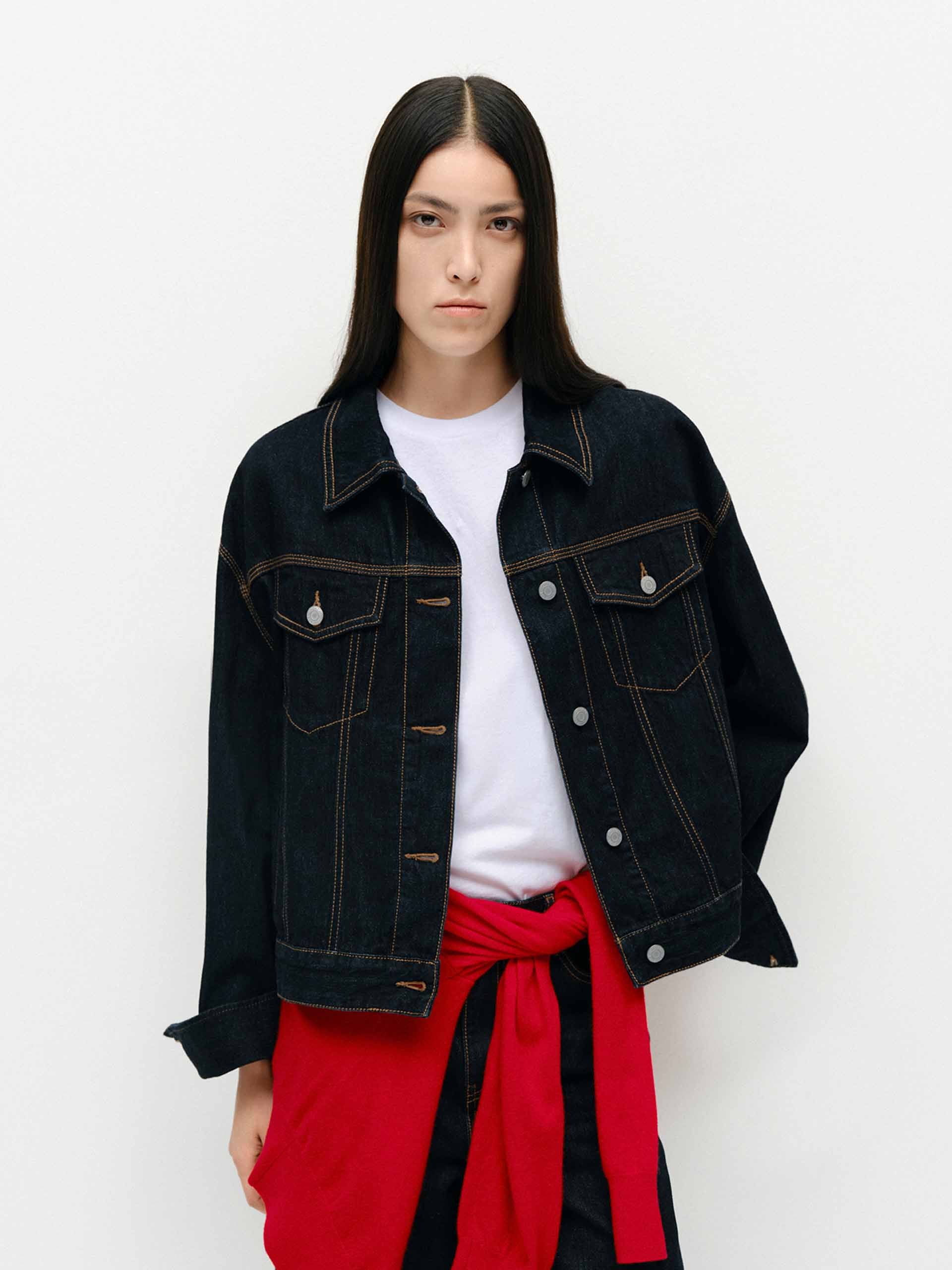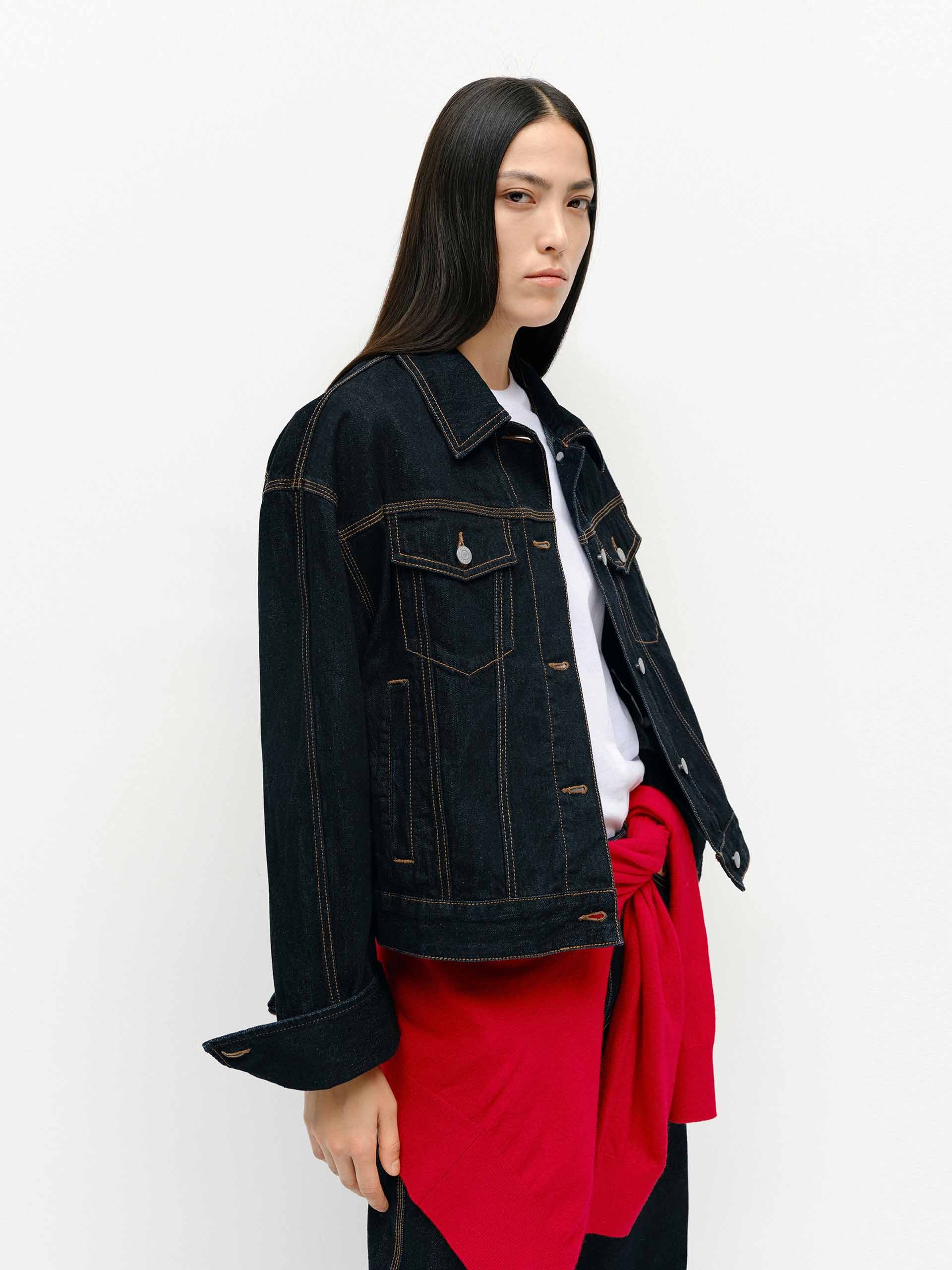 Expertly crafted from a soft cotton blend, this cropped jacket in a versatile dark blue wash is the perfect addition to your transitional wardrobe. With a chest pocket and contrast topstitching detail, perfect for layering and casual outfits.