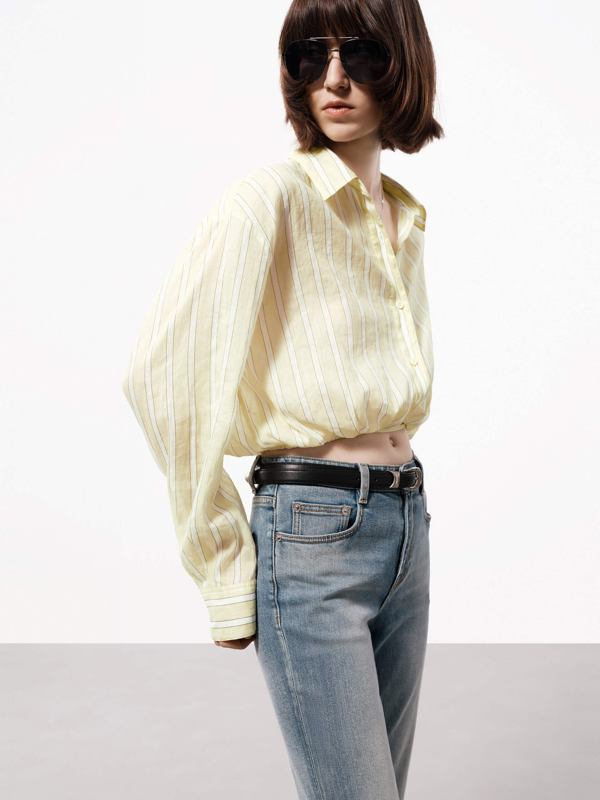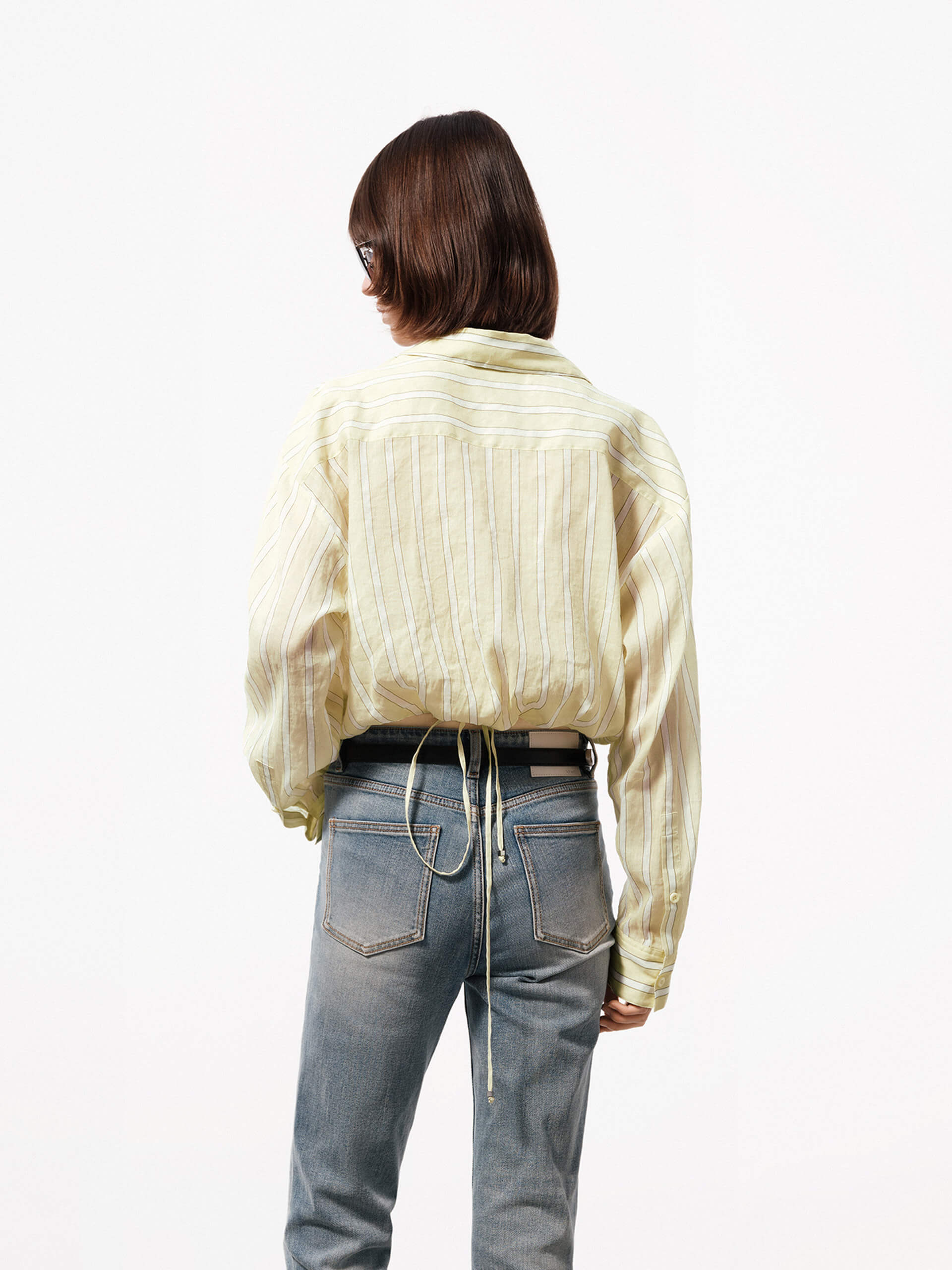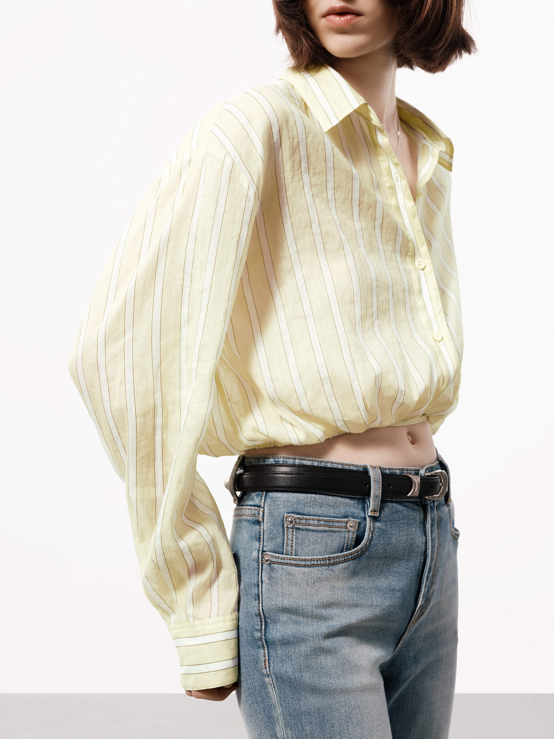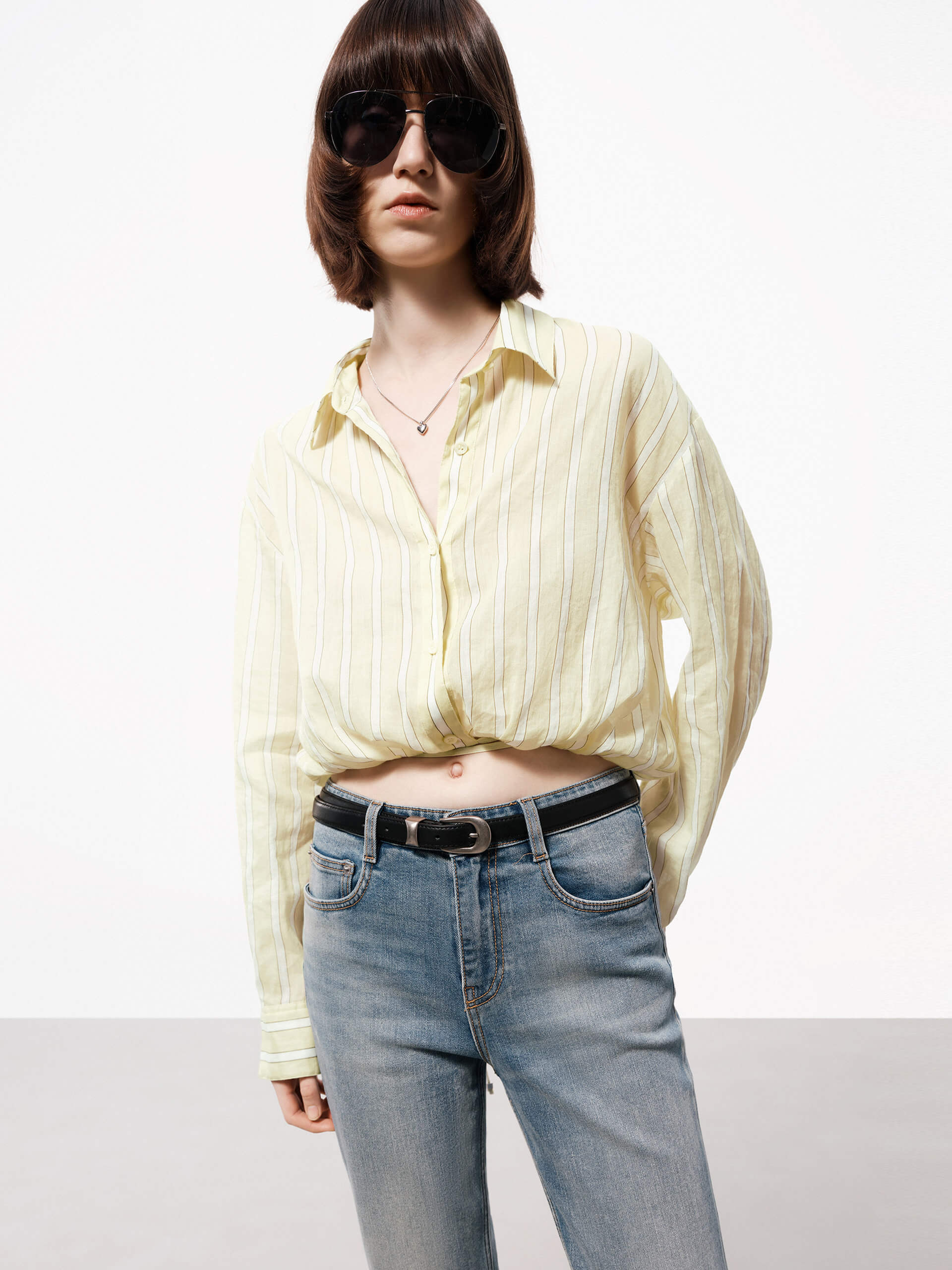 This cropped blouse has a shirt-style design made from a lightweight and breathable blend of ramie and cotton fabrics. The strappy waist detail adds a trendy and flattering touch. Features a classic pinstriped pattern in a neutral color palette that makes it easy to style with different bottoms. Perfect for the summer season, the airy material and cropped length provide a breezy, summer-ready look. Pair it with with shorts or jeans.