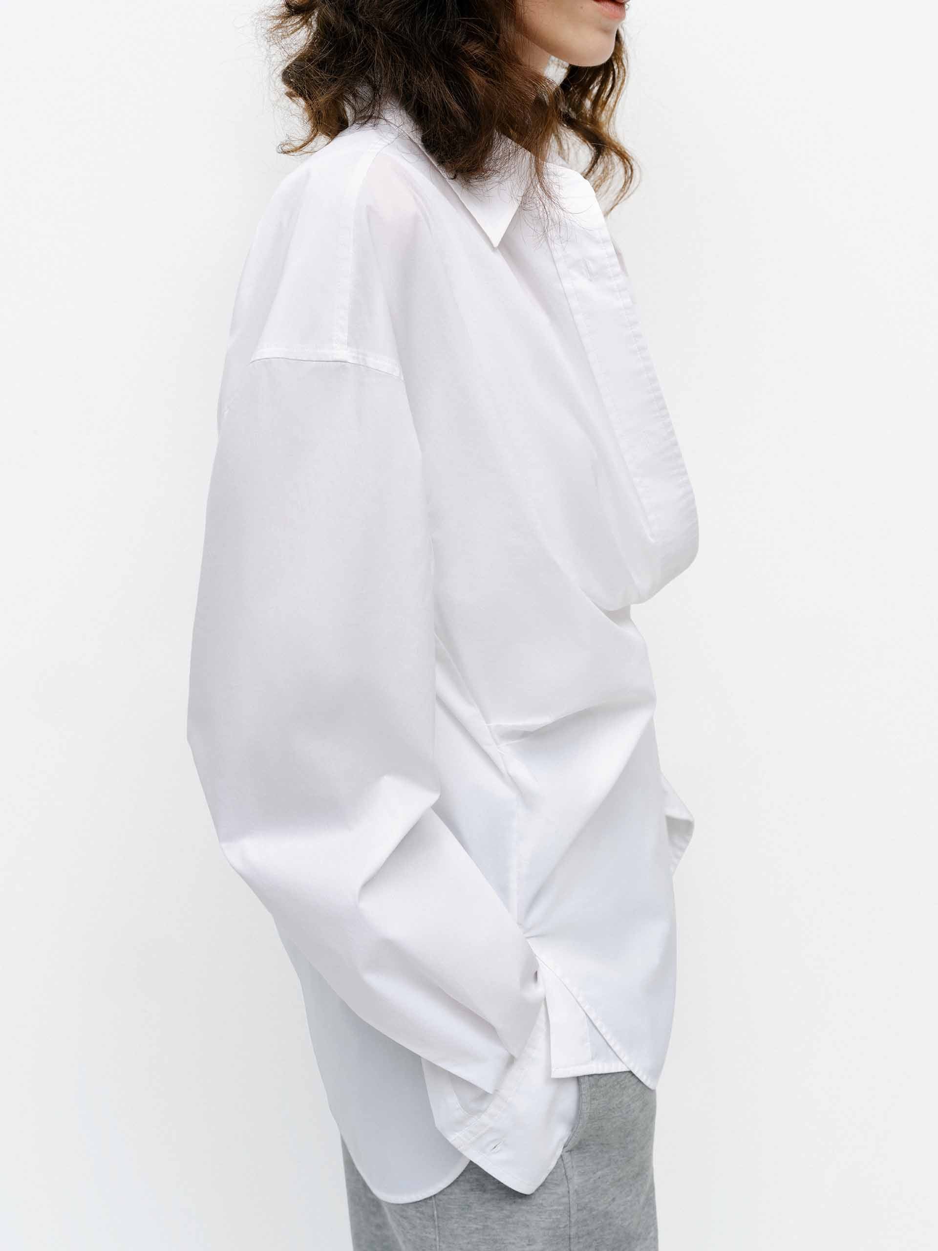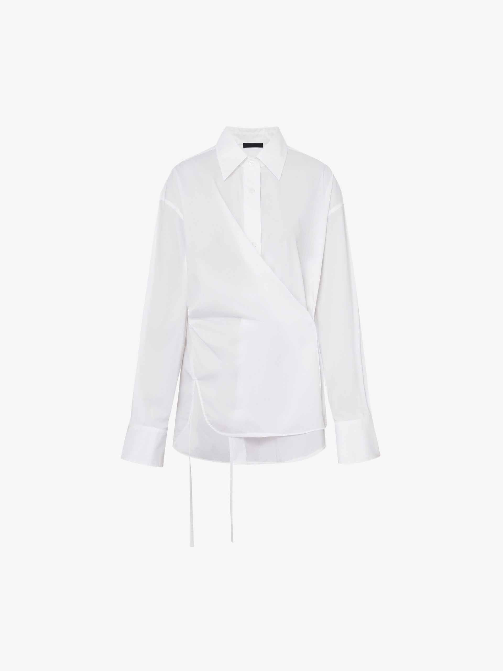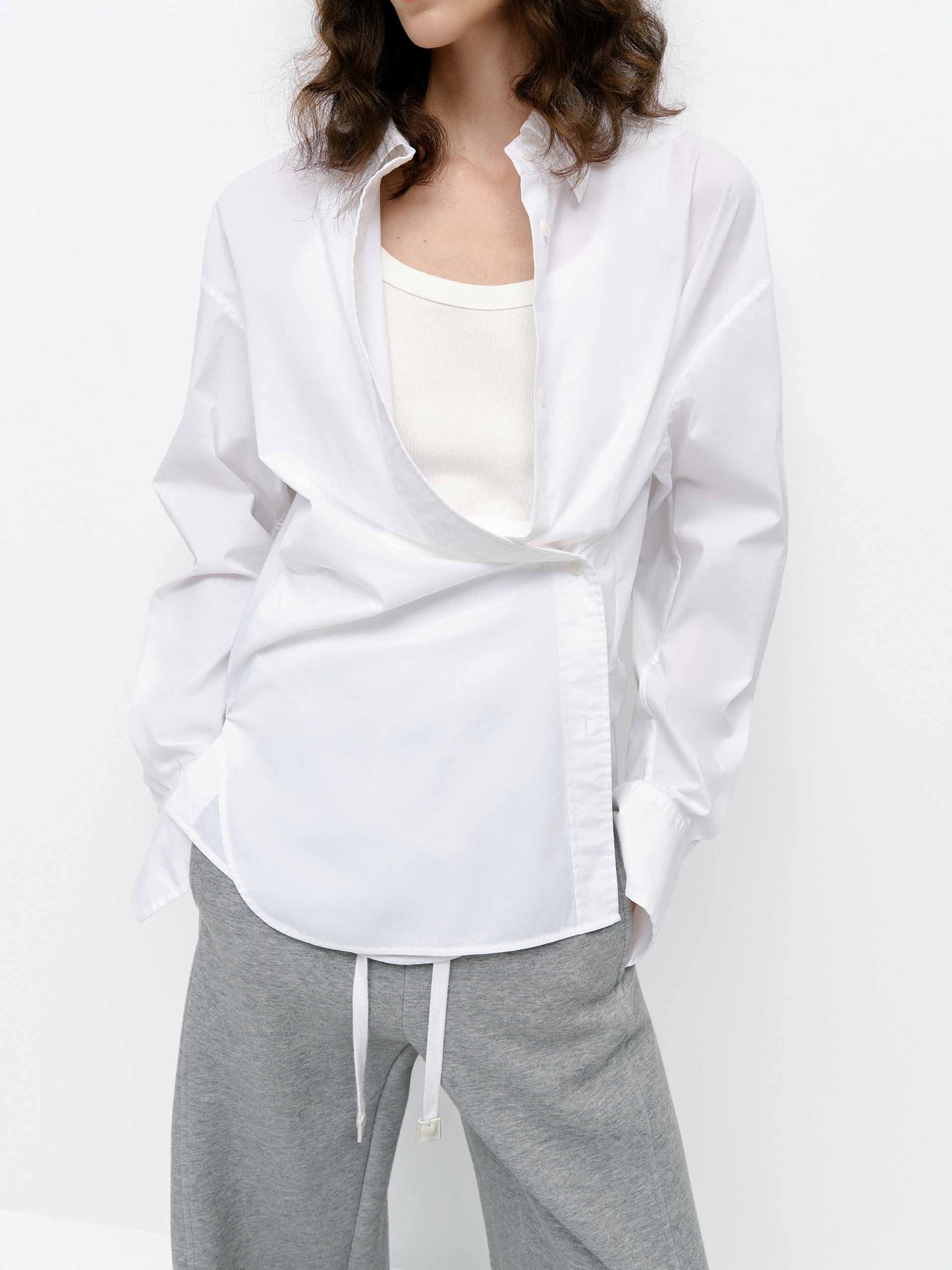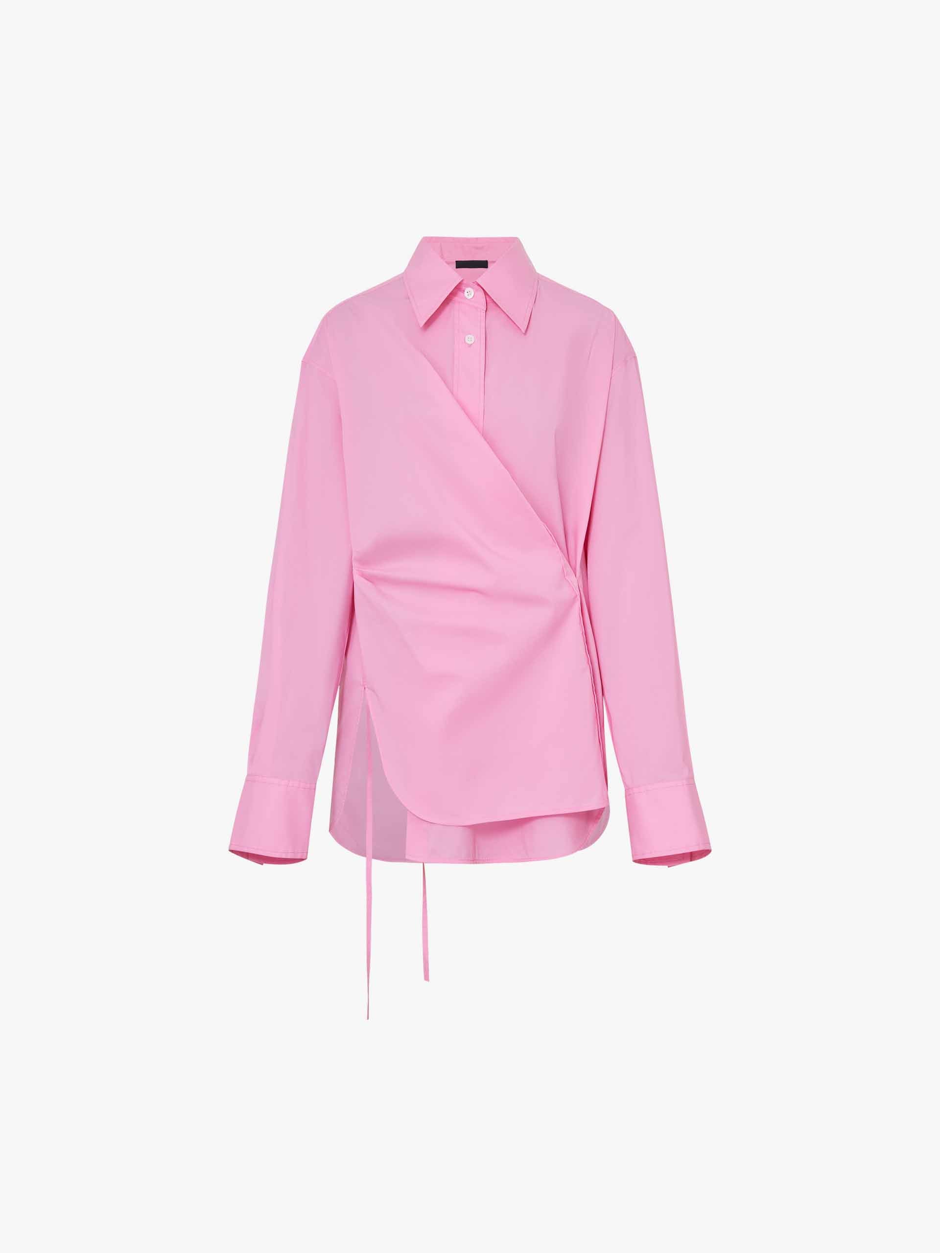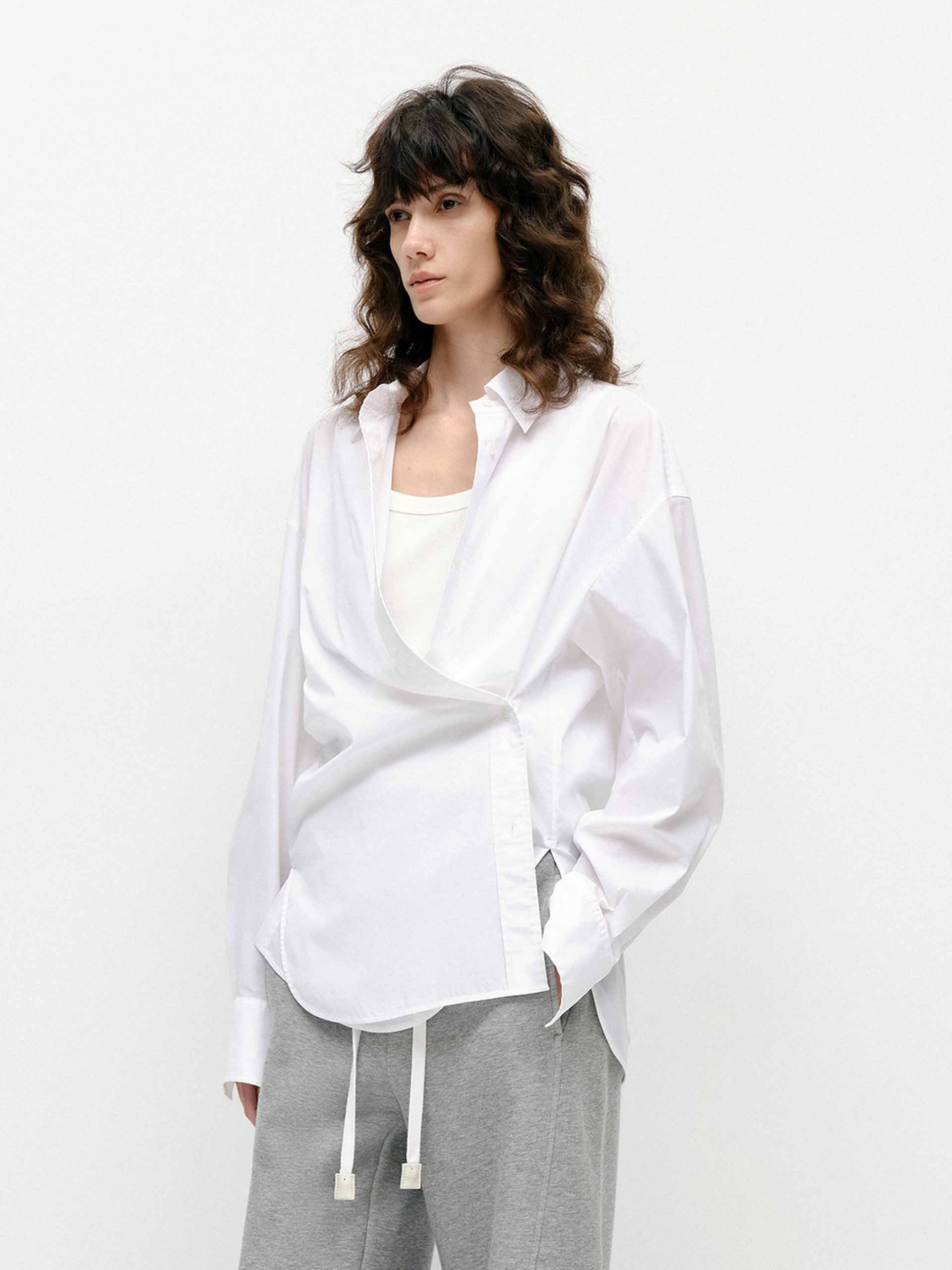 This shirt is made from a comfortable cotton blend, it offers a relaxed fit and versatile wearing options with its side pleated design and self-tie and button closure.
