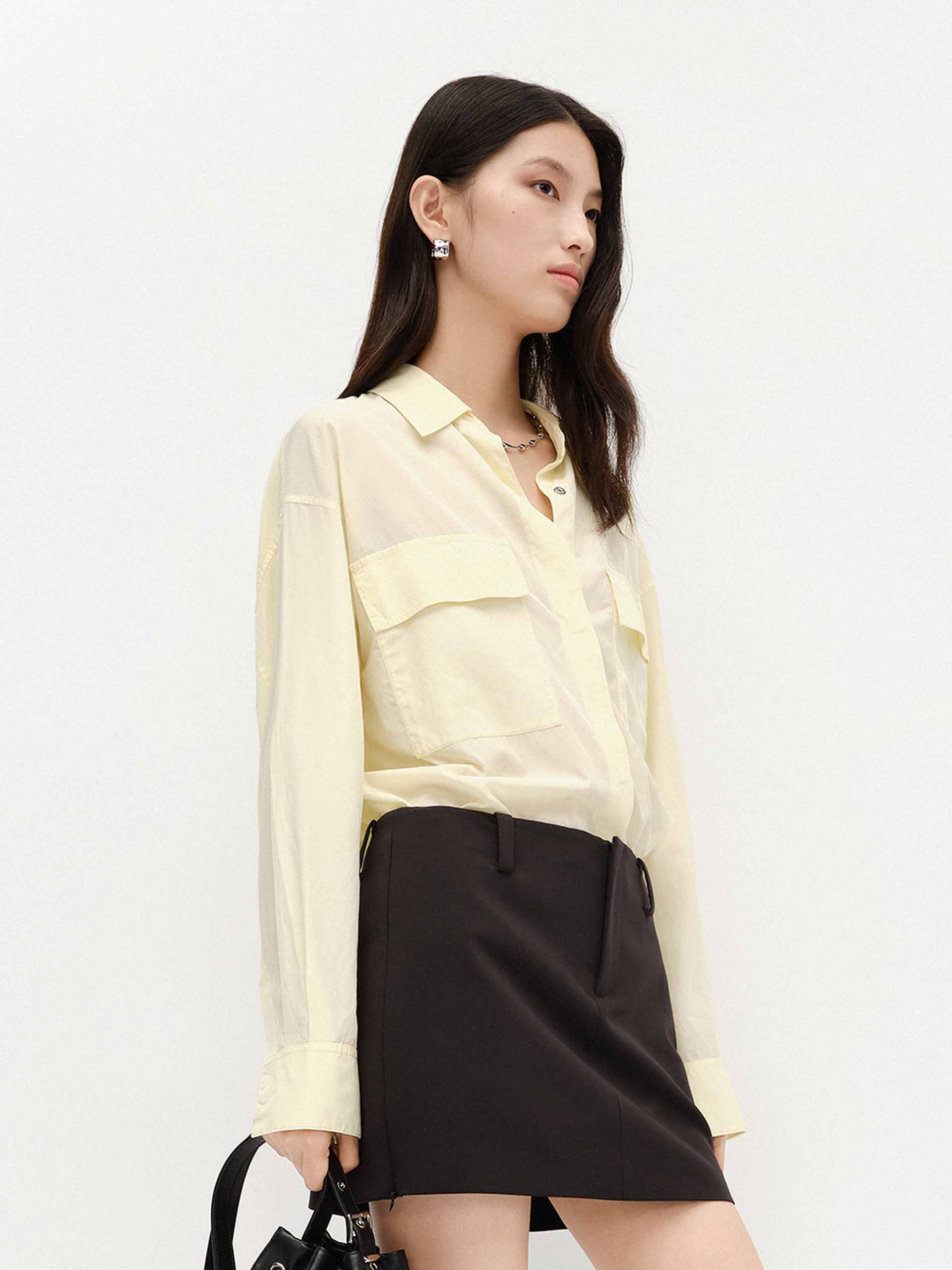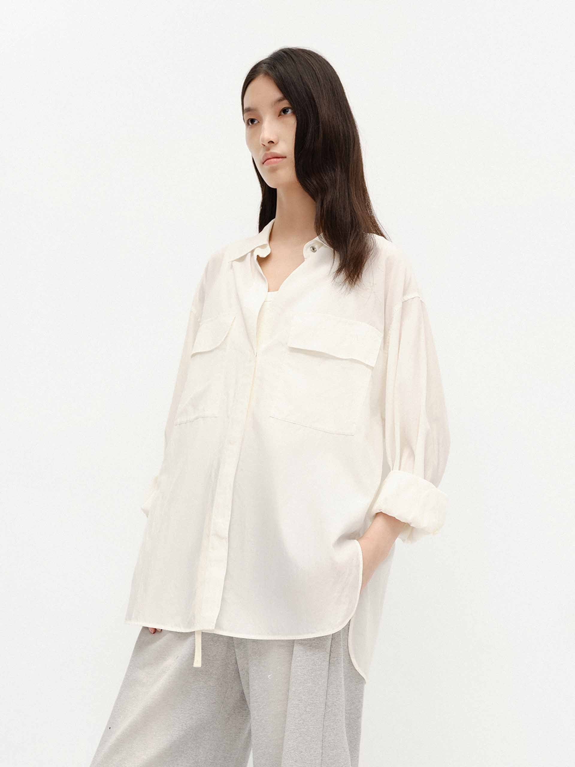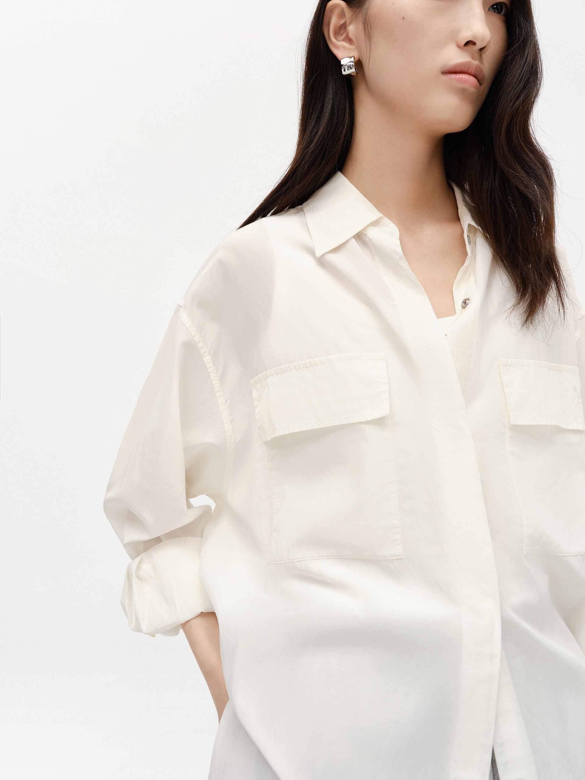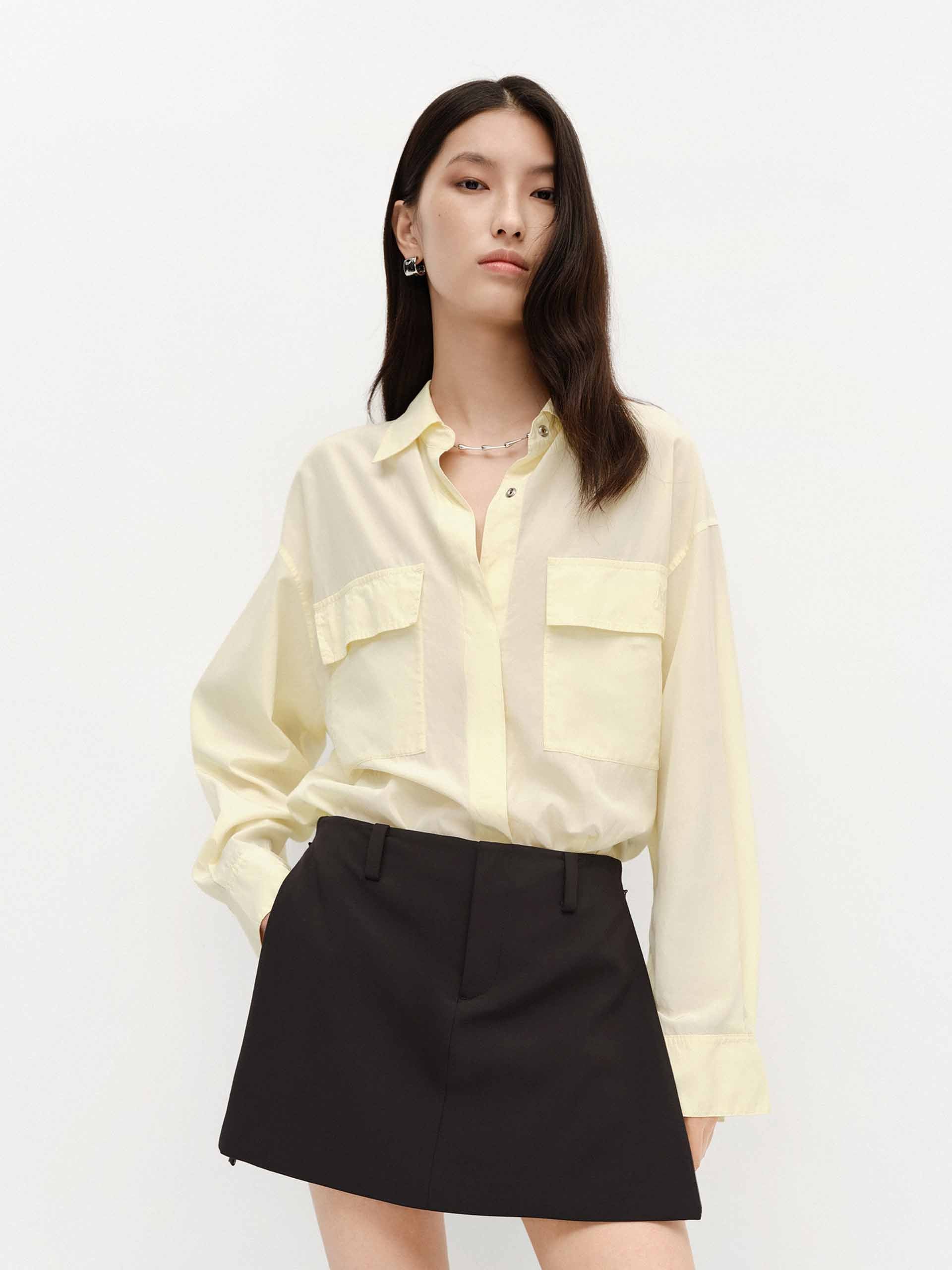 This loose shirt features a curved hemline and chest pockets with a cargo style, adding a touch of casualness to the overall look. Made from breathable and comfortable fabric, it also features hidden metal buttons for a sleek finish. Ideal for coffee runs, weekend errands, or casual Fridays at the office.