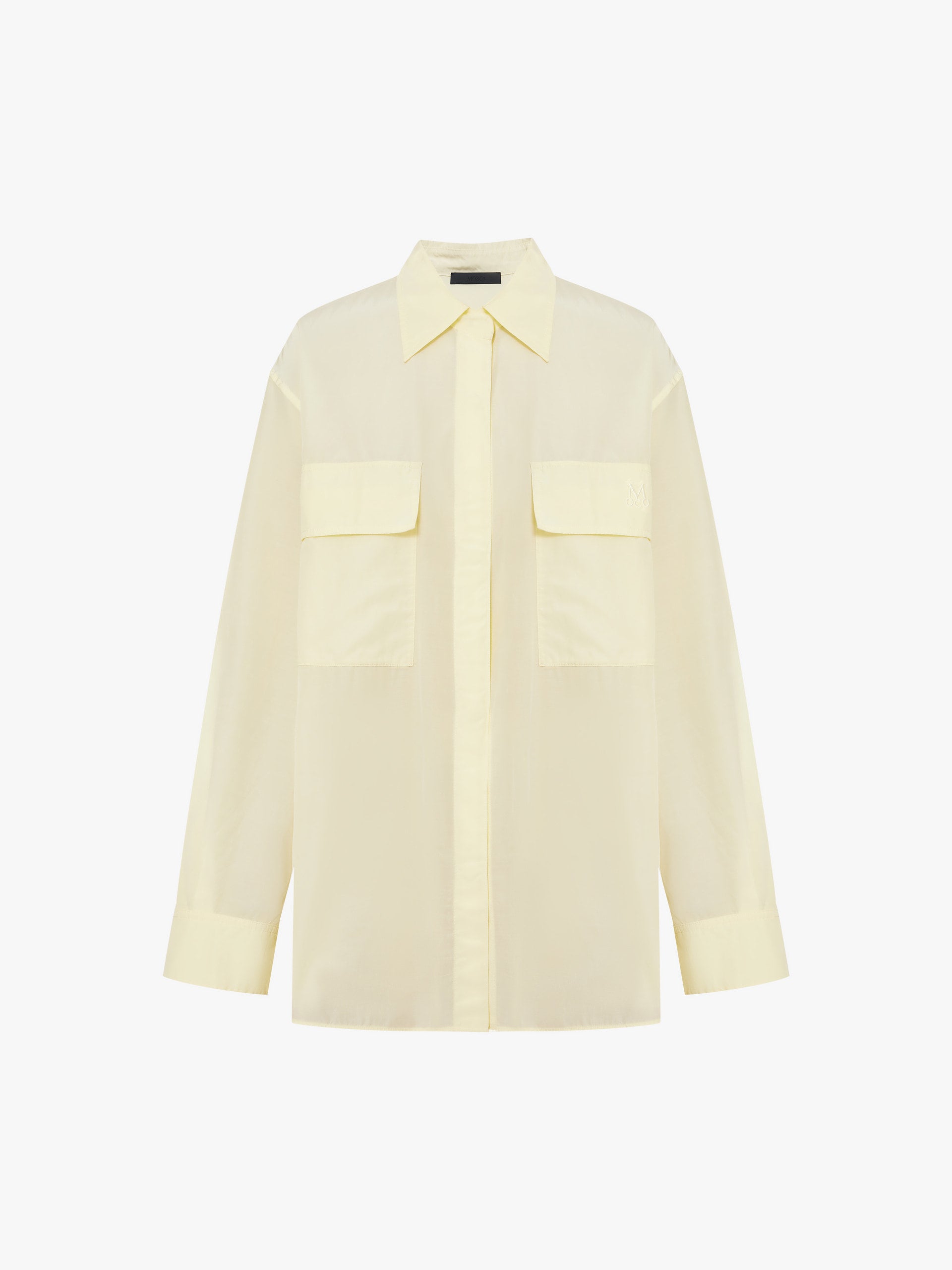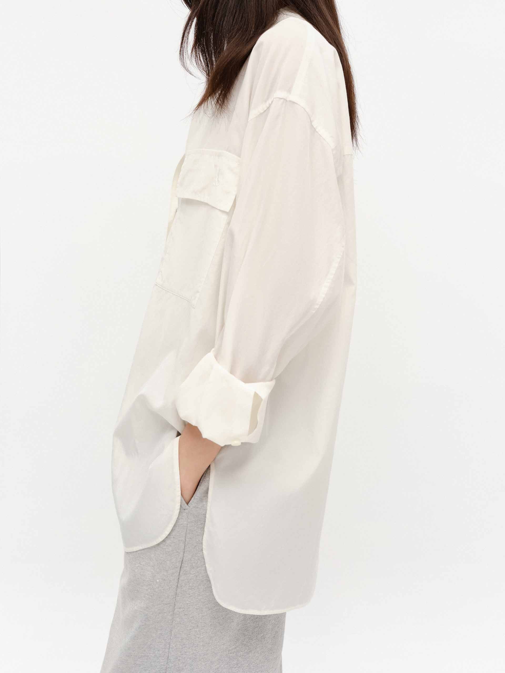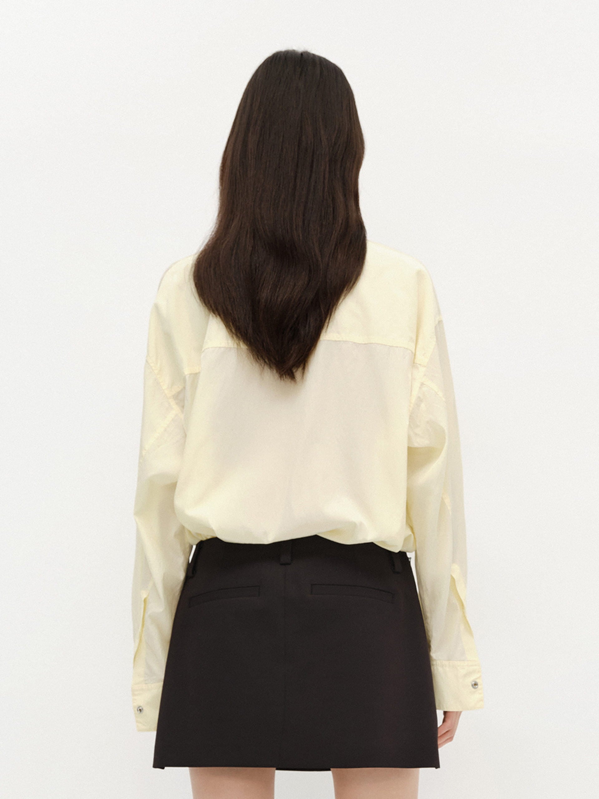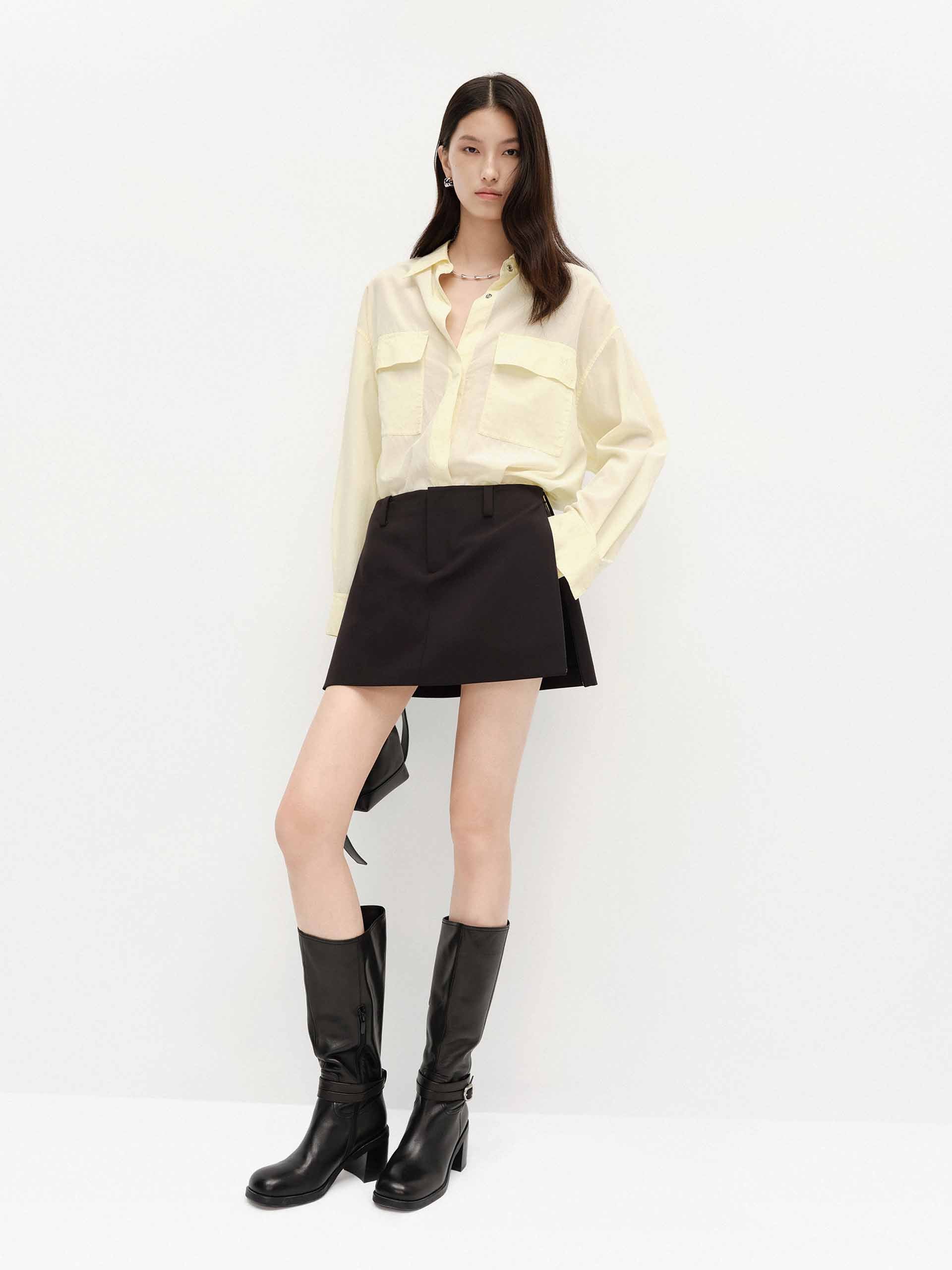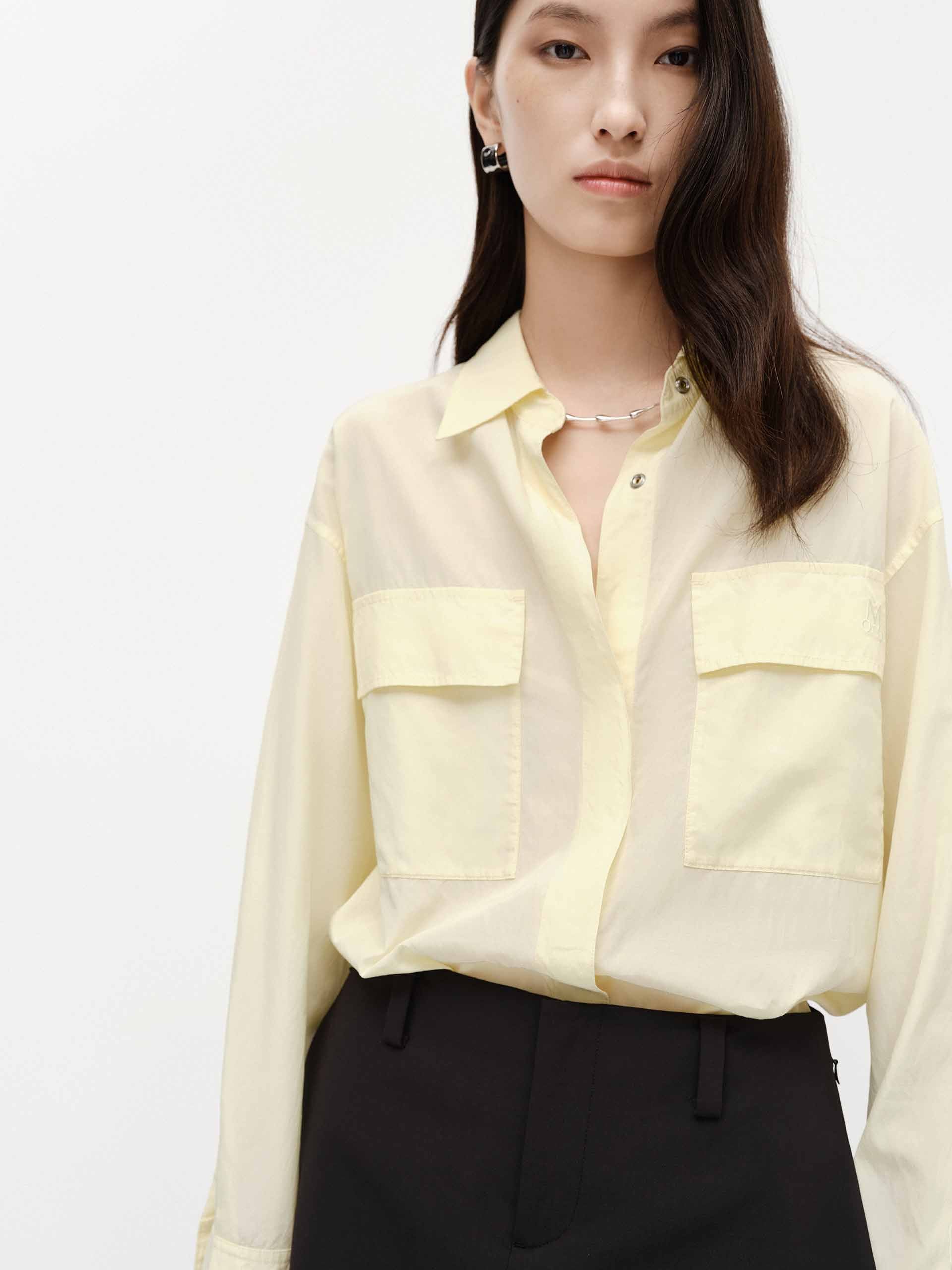 This loose shirt features a curved hemline and chest pockets with a cargo style, adding a touch of casualness to the overall look. Made from breathable and comfortable fabric, it also features hidden metal buttons for a sleek finish. Ideal for coffee runs, weekend errands, or casual Fridays at the office.