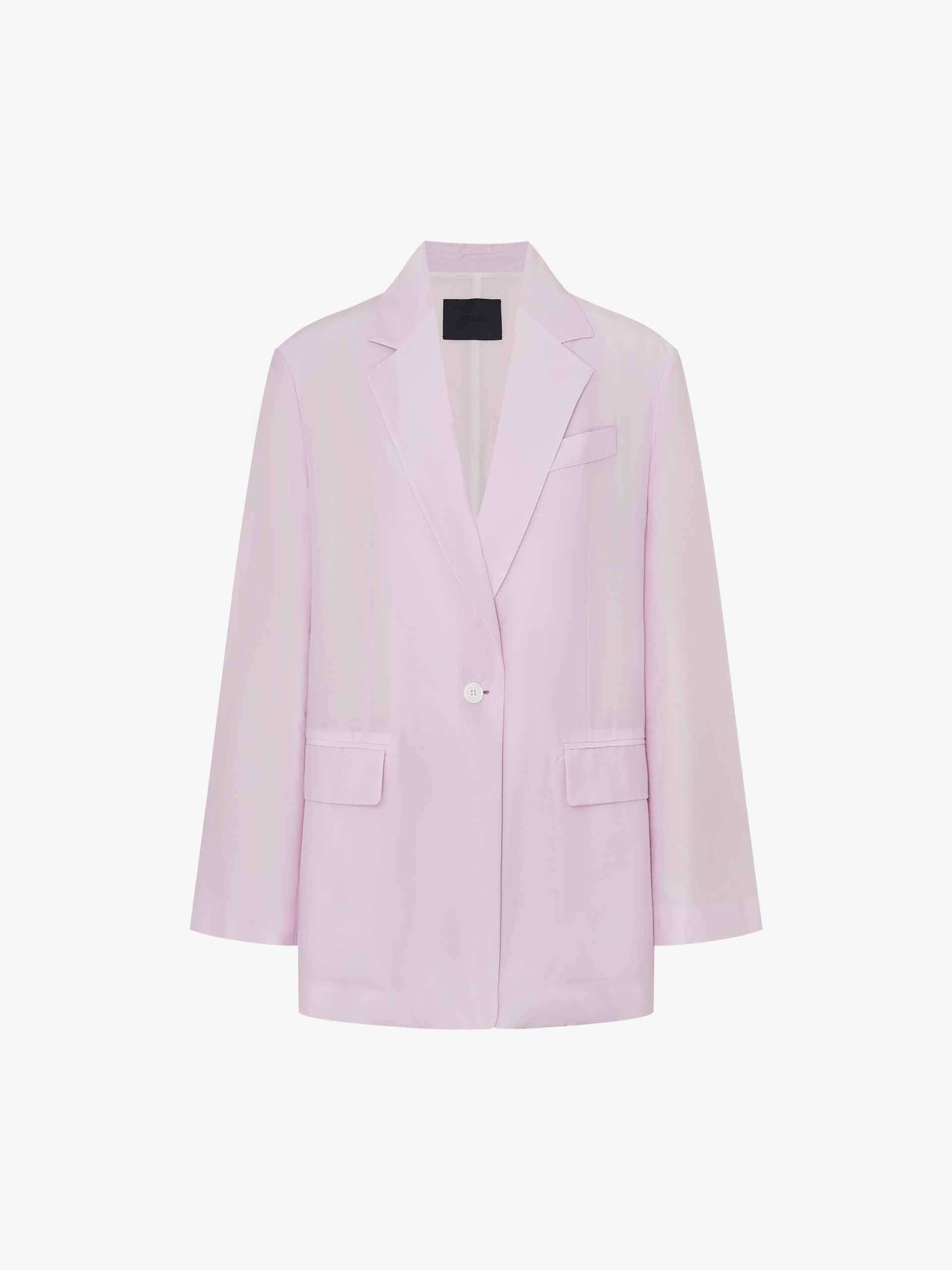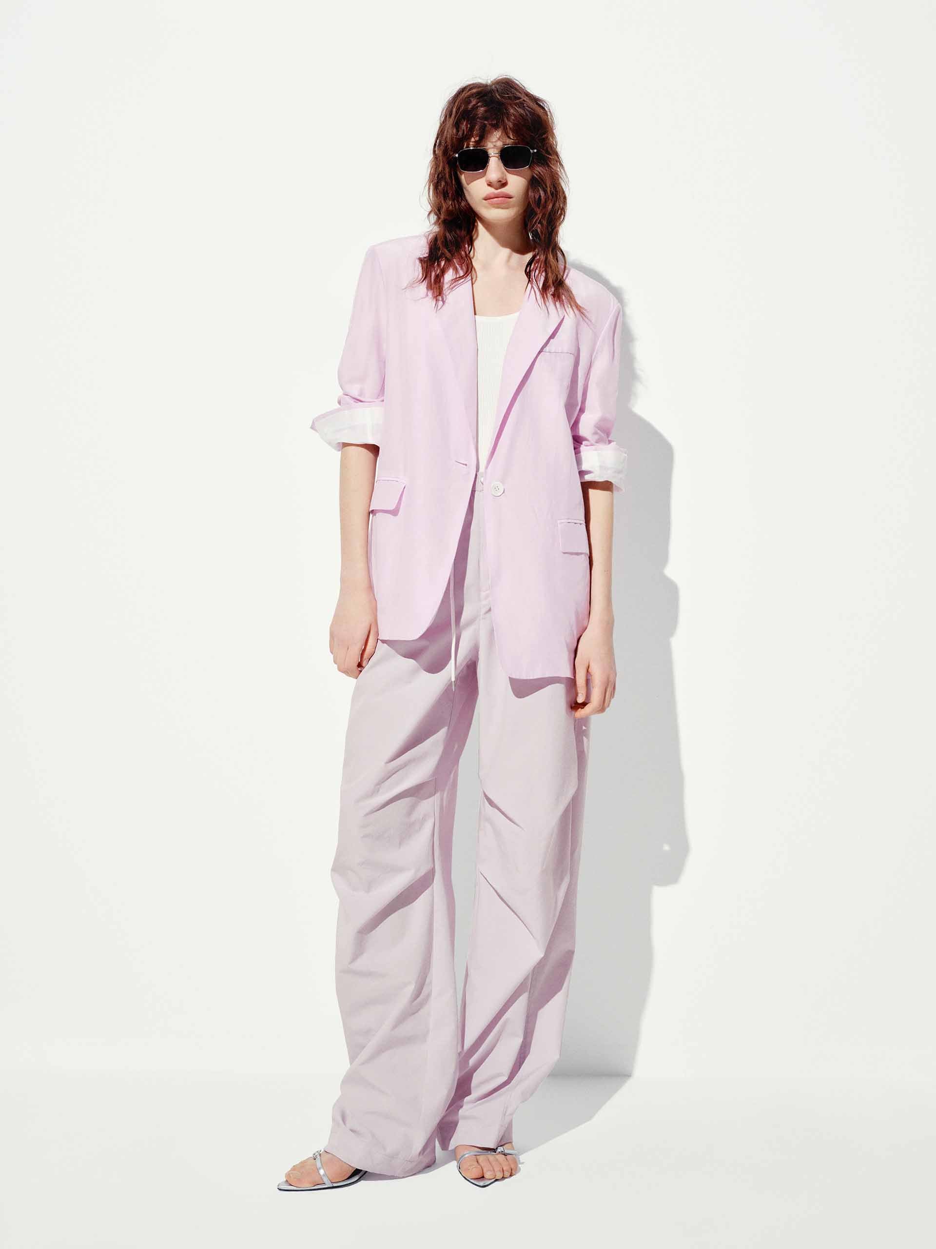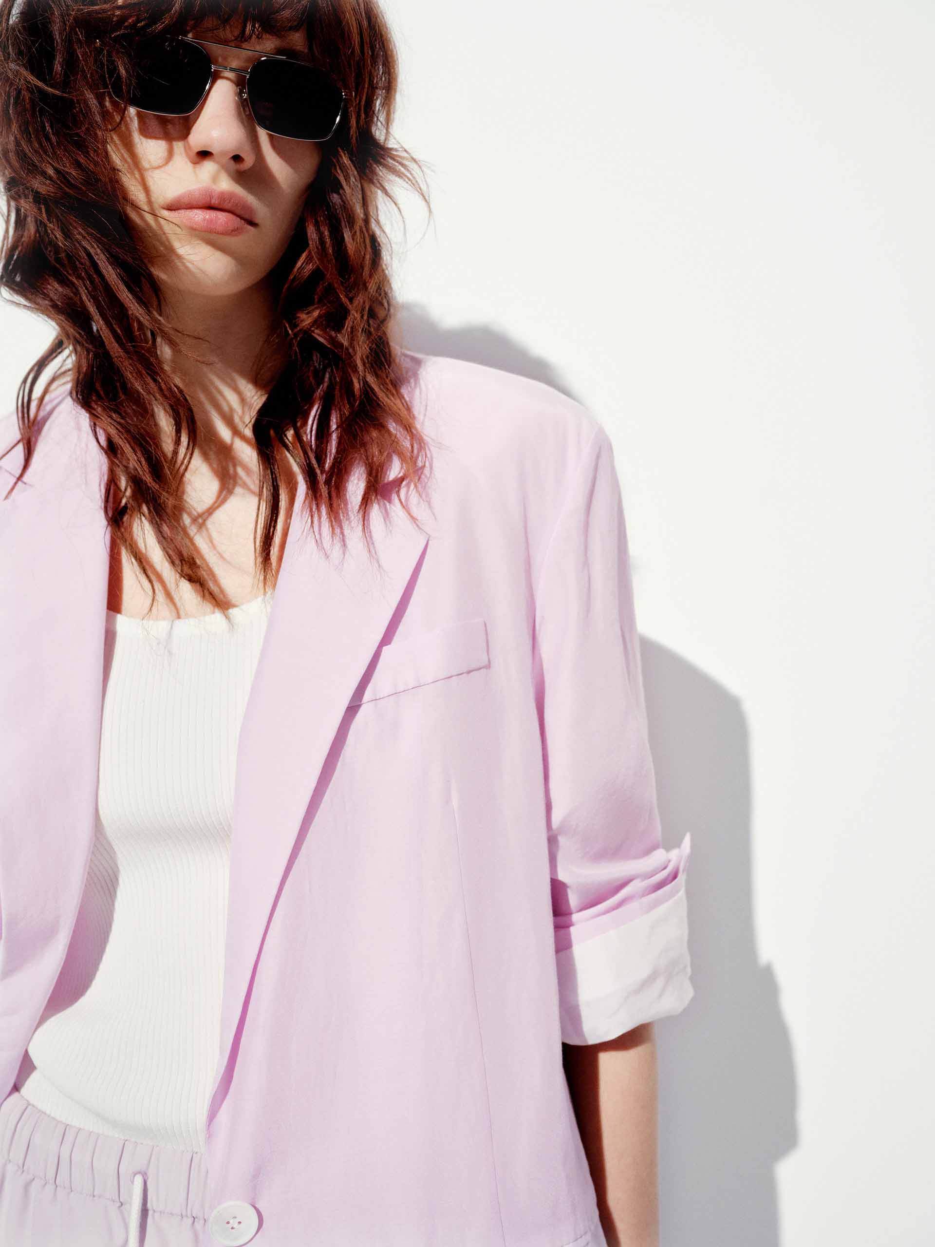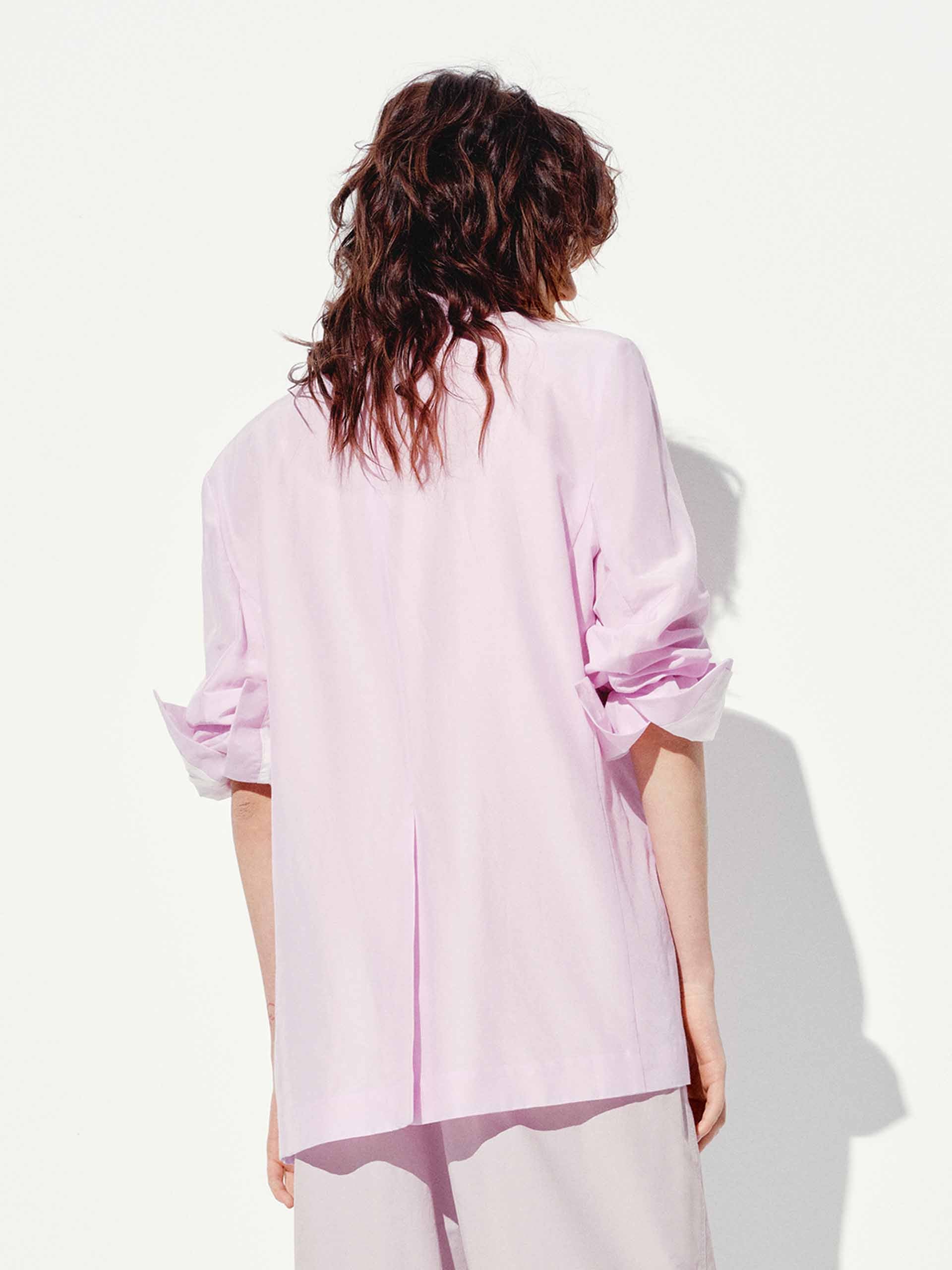 This blazer combines the natural comfort of cotton with the luxurious sheen of silk, offering a breathable yet refined drape. Designed for versatility, the long sleeves and back slit ensure effortless movement, while the padded shoulders add structured polish. A subtle flap pocket detail completes the sleek aesthetic, making it a perfect layering piece for both office elegance and evening allure.