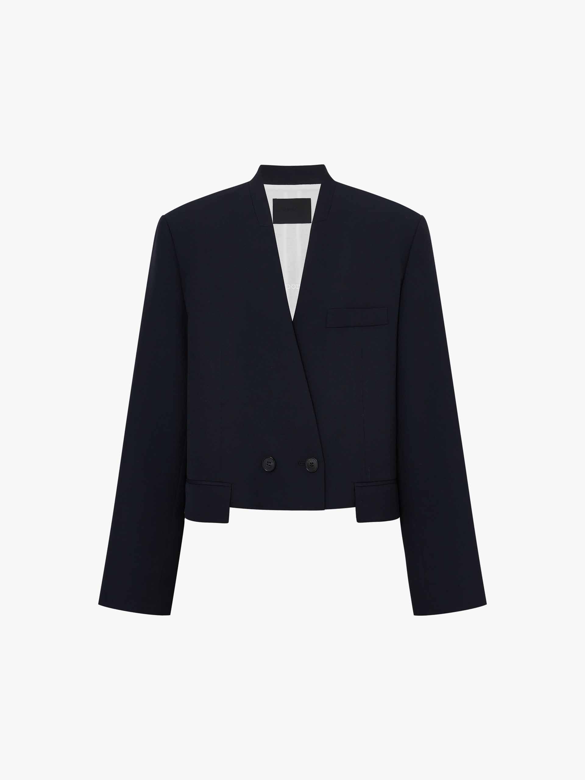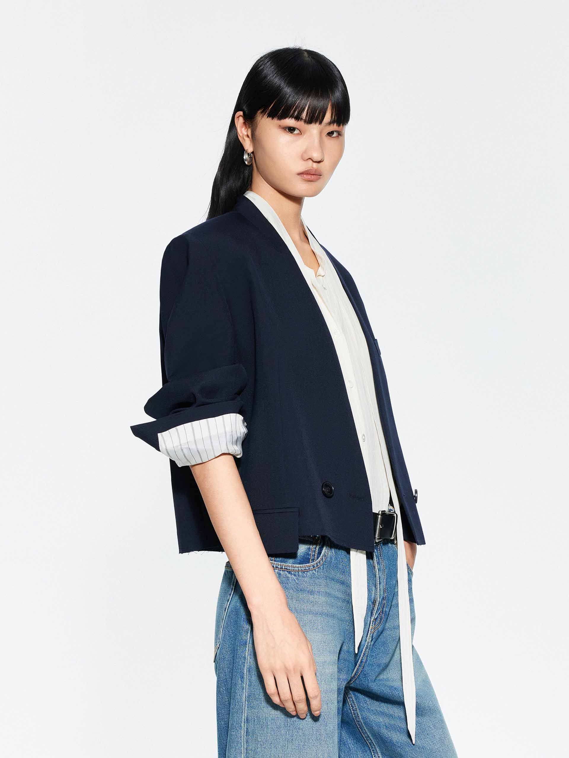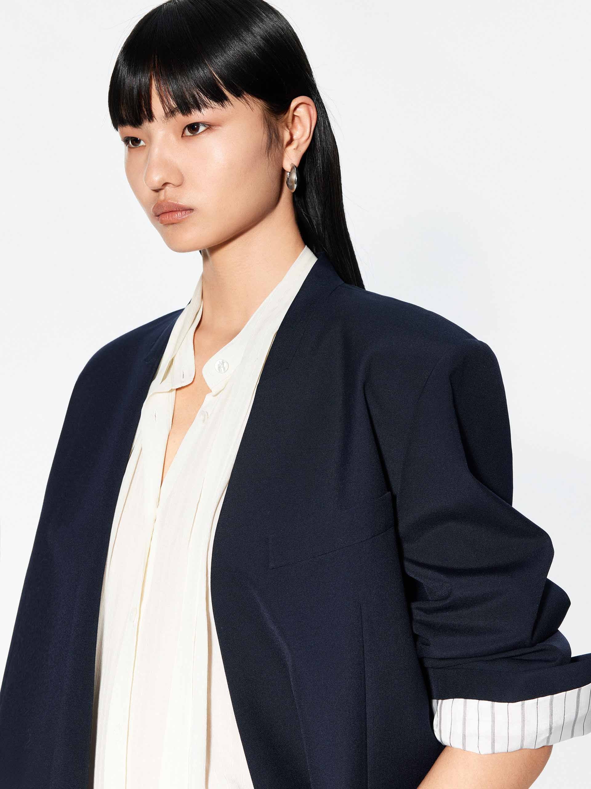 Introducing our blazer. With long sleeves and a button closure, this short blazer is both stylish and practical. Designed with a sleek, collarless neckline and a comfortable inner lining, it is the perfect addition to any wardrobe.