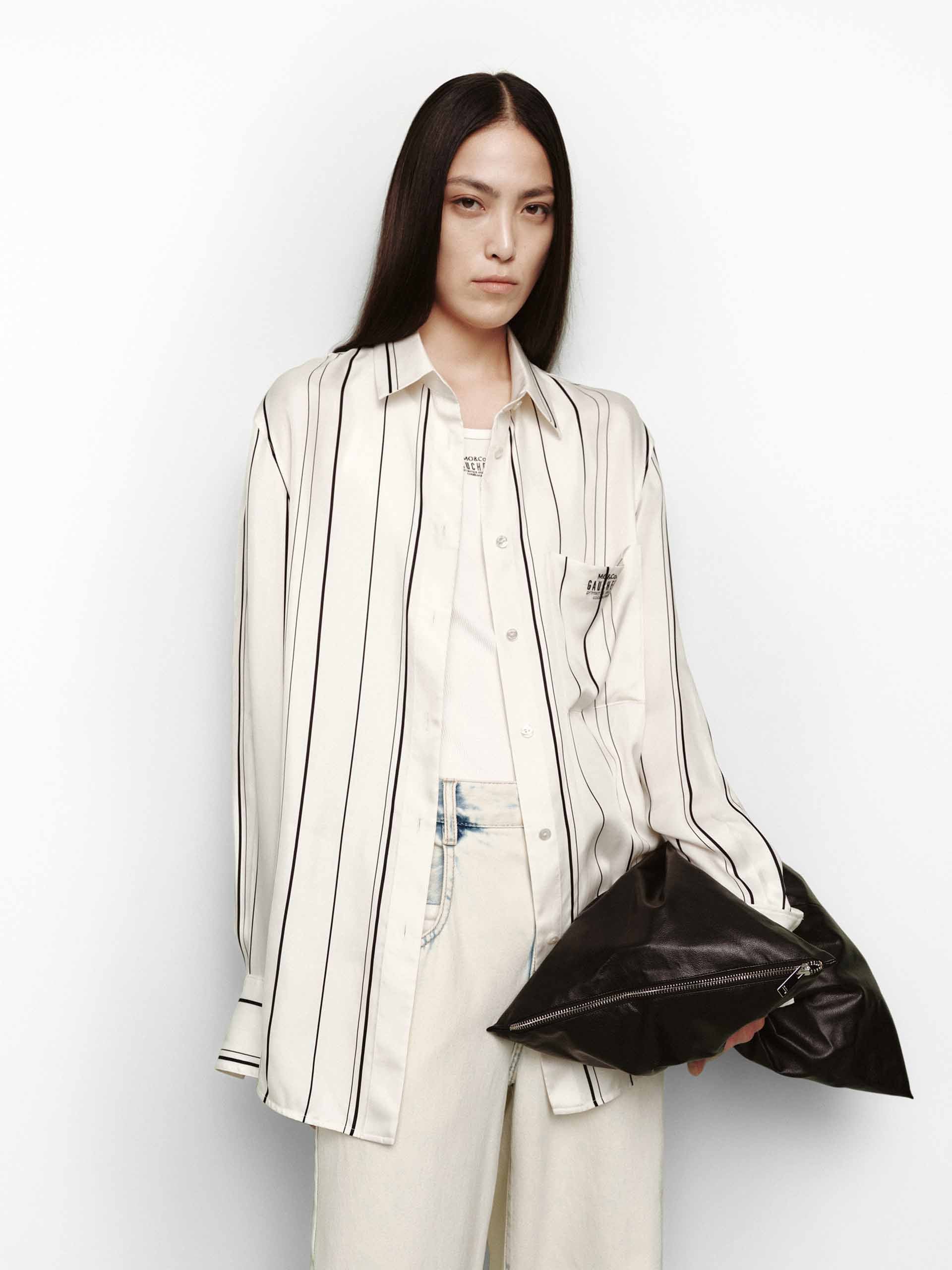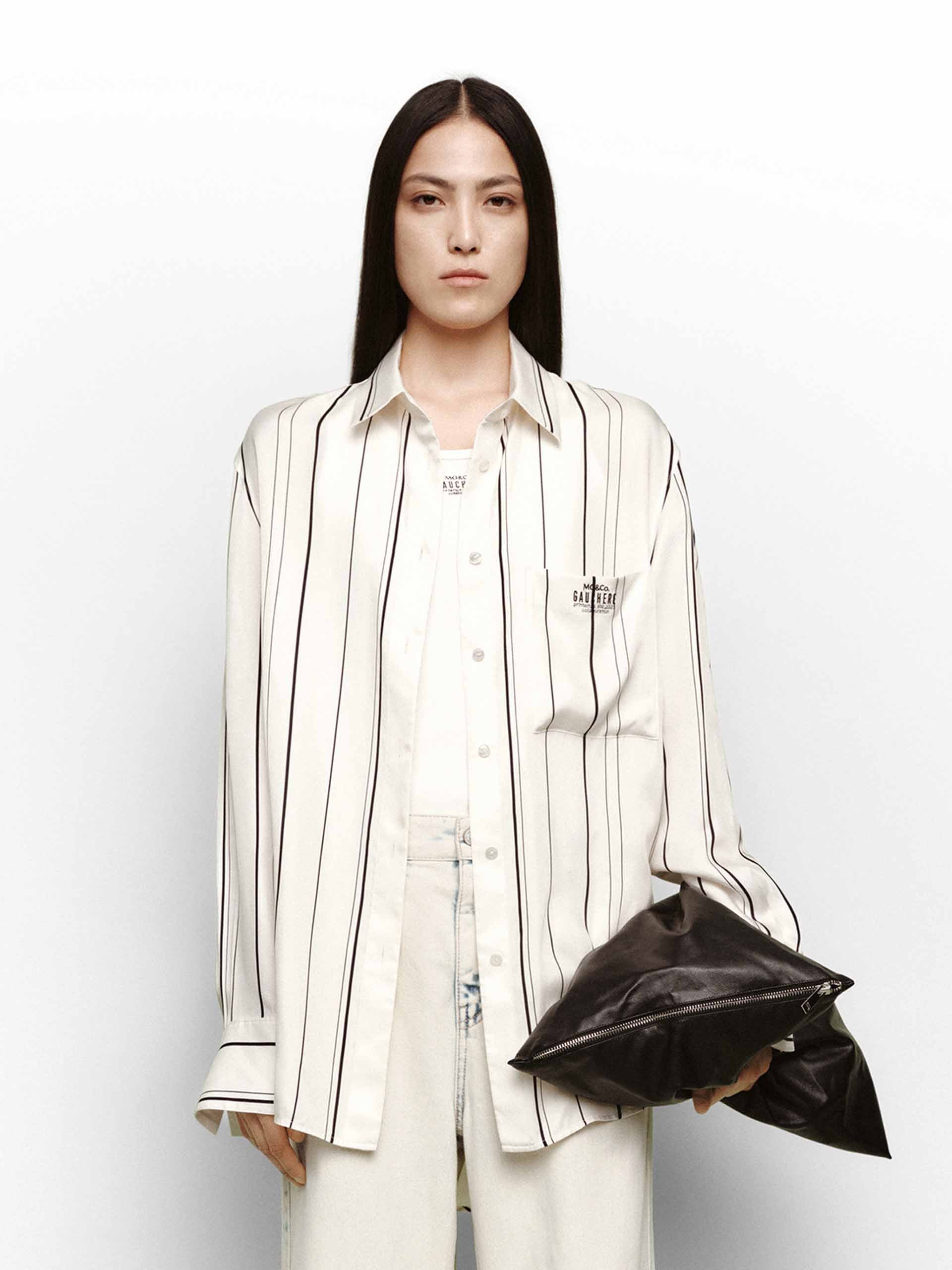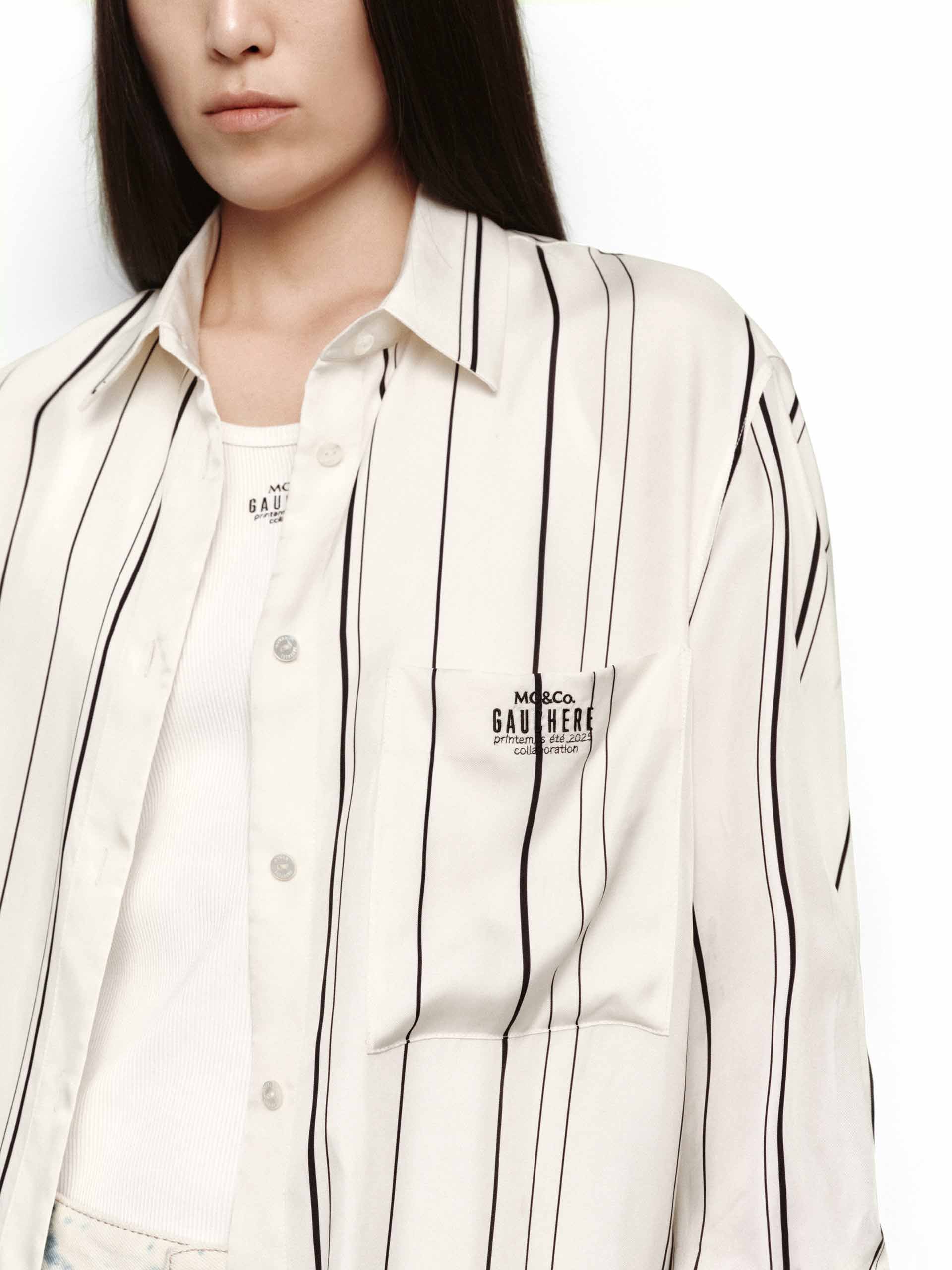 The MO&Co x GAUCHERE collaboration introduces a refined shirt made from a soft cupro blend, offering a luxurious silky and smooth texture. This piece features a clean and crisp design, elevated by subtle yet striking details. Feature pinstripe pattern and a chest pocket adorned with logo details, add a touch of sophistication, while the cutout design at the back introduces a contemporary and edgy element.