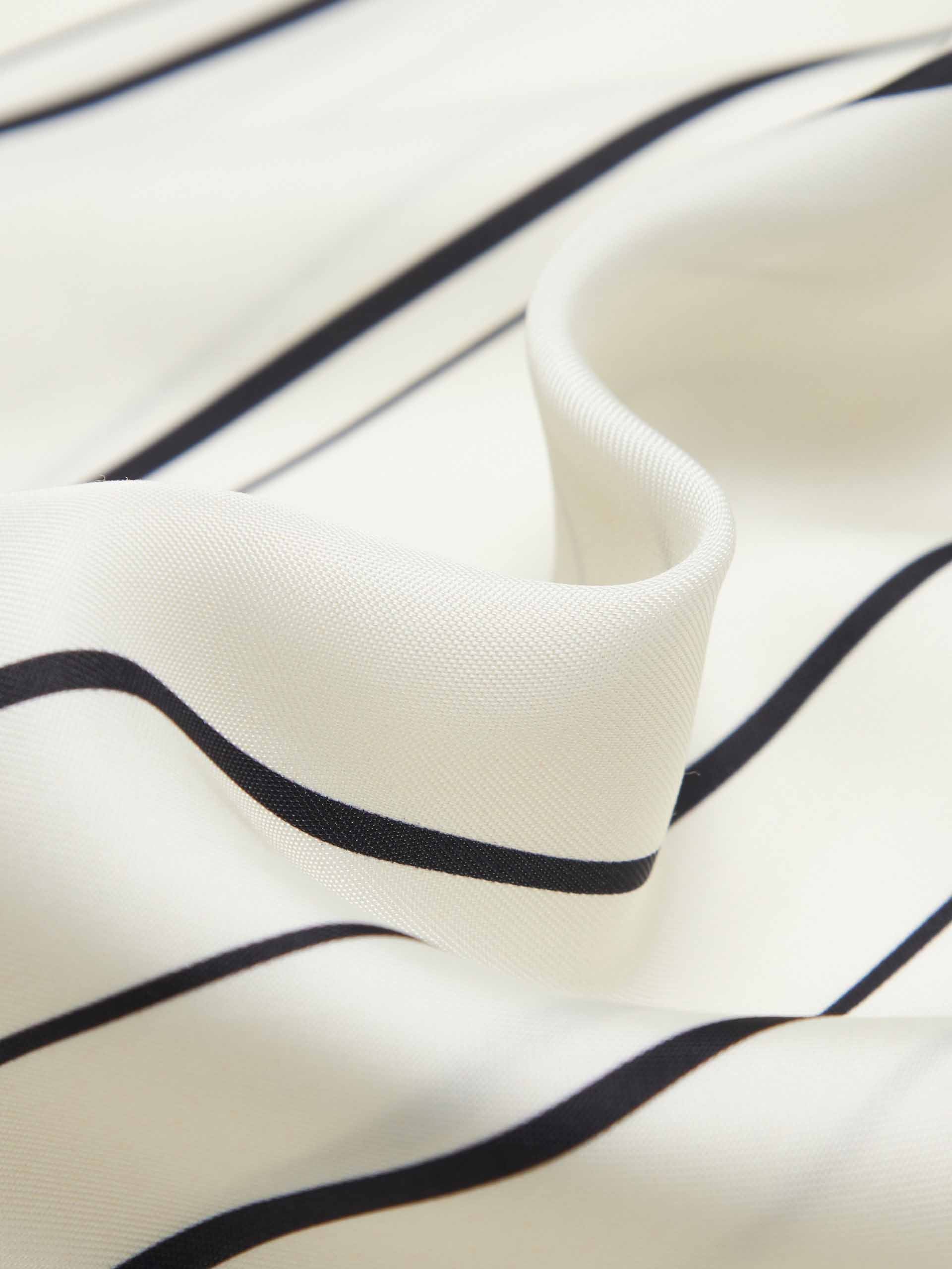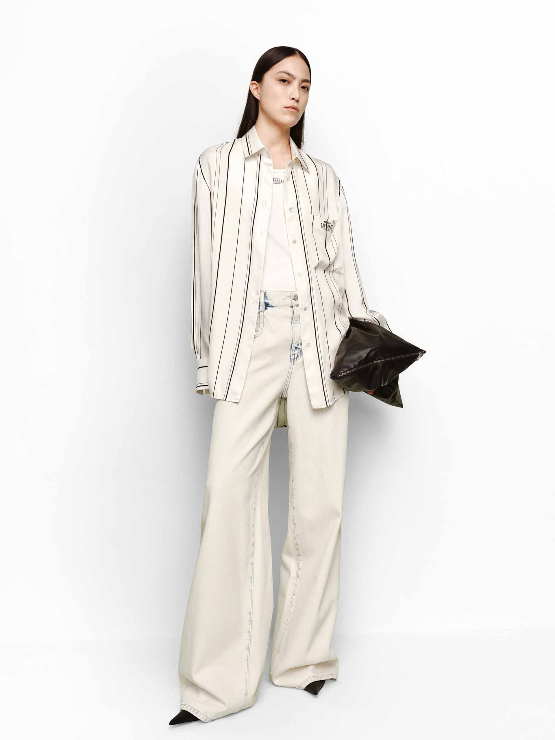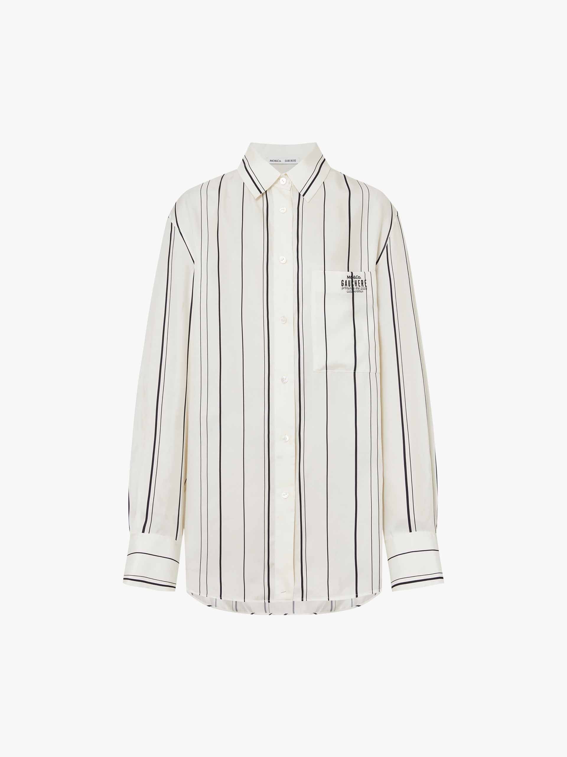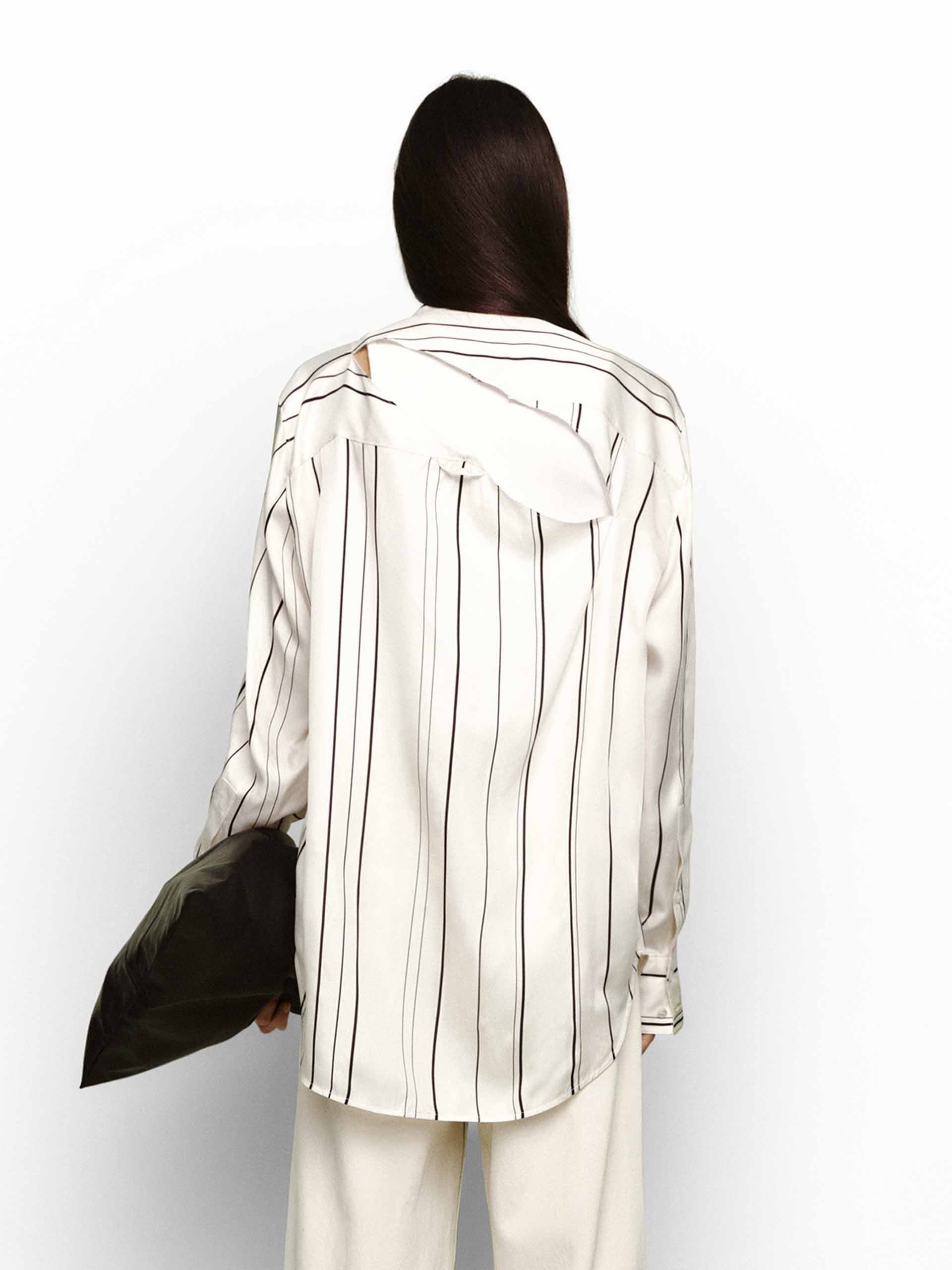 The MO&Co x GAUCHERE collaboration introduces a refined shirt made from a soft cupro blend, offering a luxurious silky and smooth texture. This piece features a clean and crisp design, elevated by subtle yet striking details. Feature pinstripe pattern and a chest pocket adorned with logo details, add a touch of sophistication, while the cutout design at the back introduces a contemporary and edgy element.
