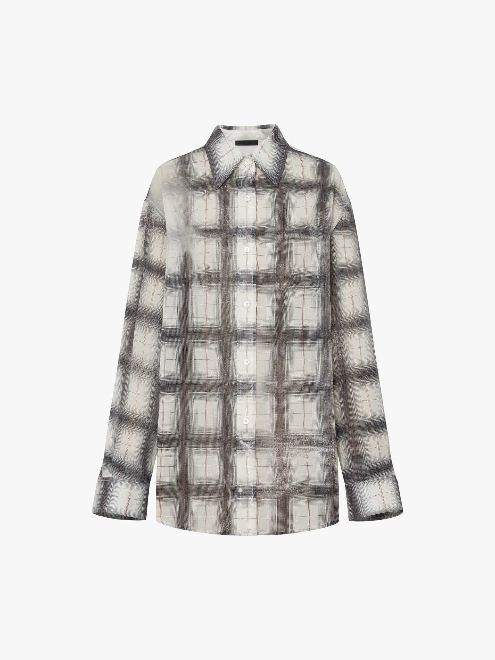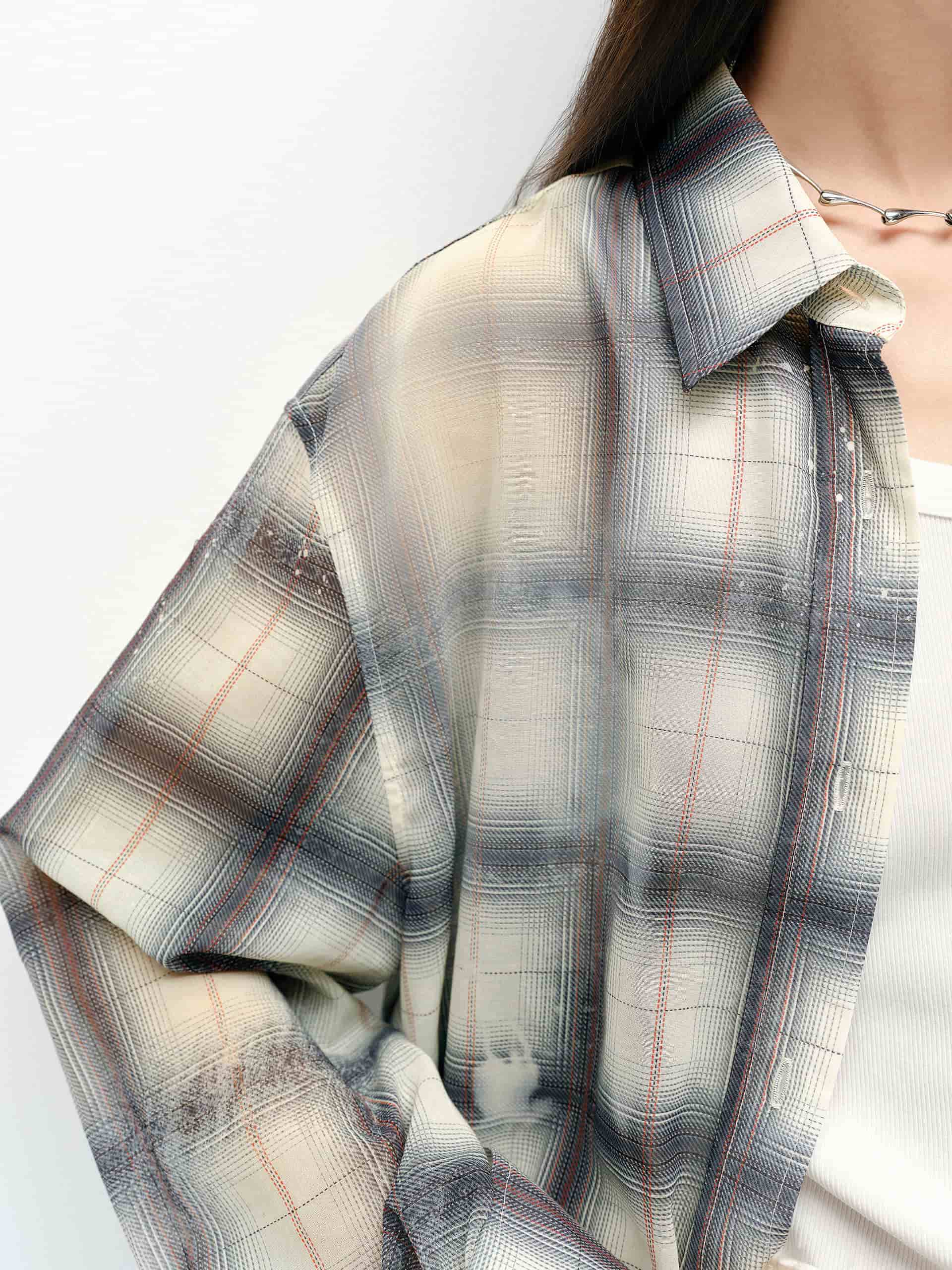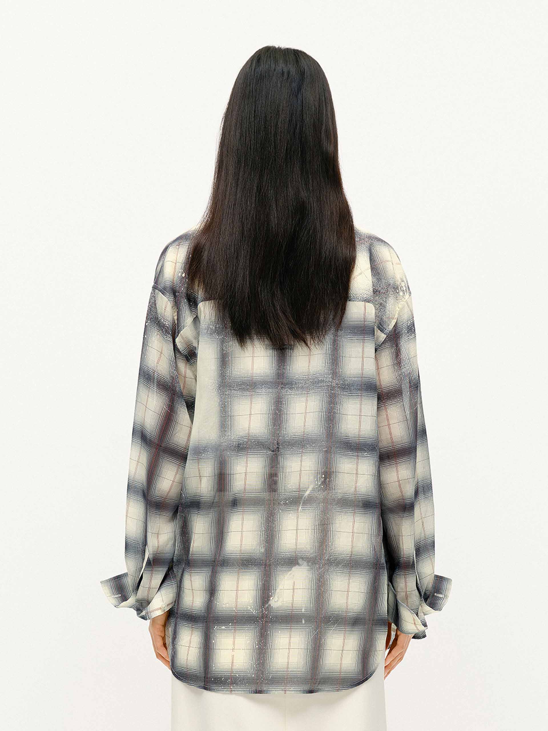 This shirt is crafted from 100% soft and comfortable cotton, offering a relaxed and easy-going fit. It features a curved hem for a modern touch, along with artistic paint splatters and a blurred plaid pattern that gives it a stylish, lived-in appearance. Perfect for a casual yet trendy look.