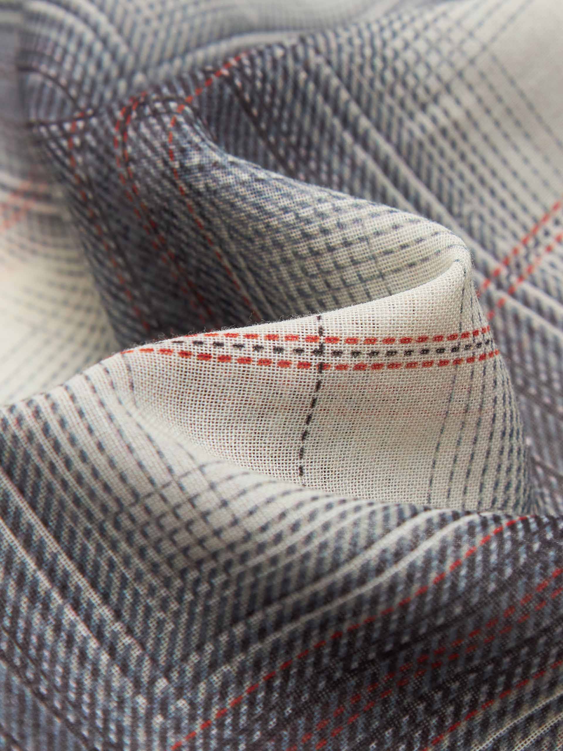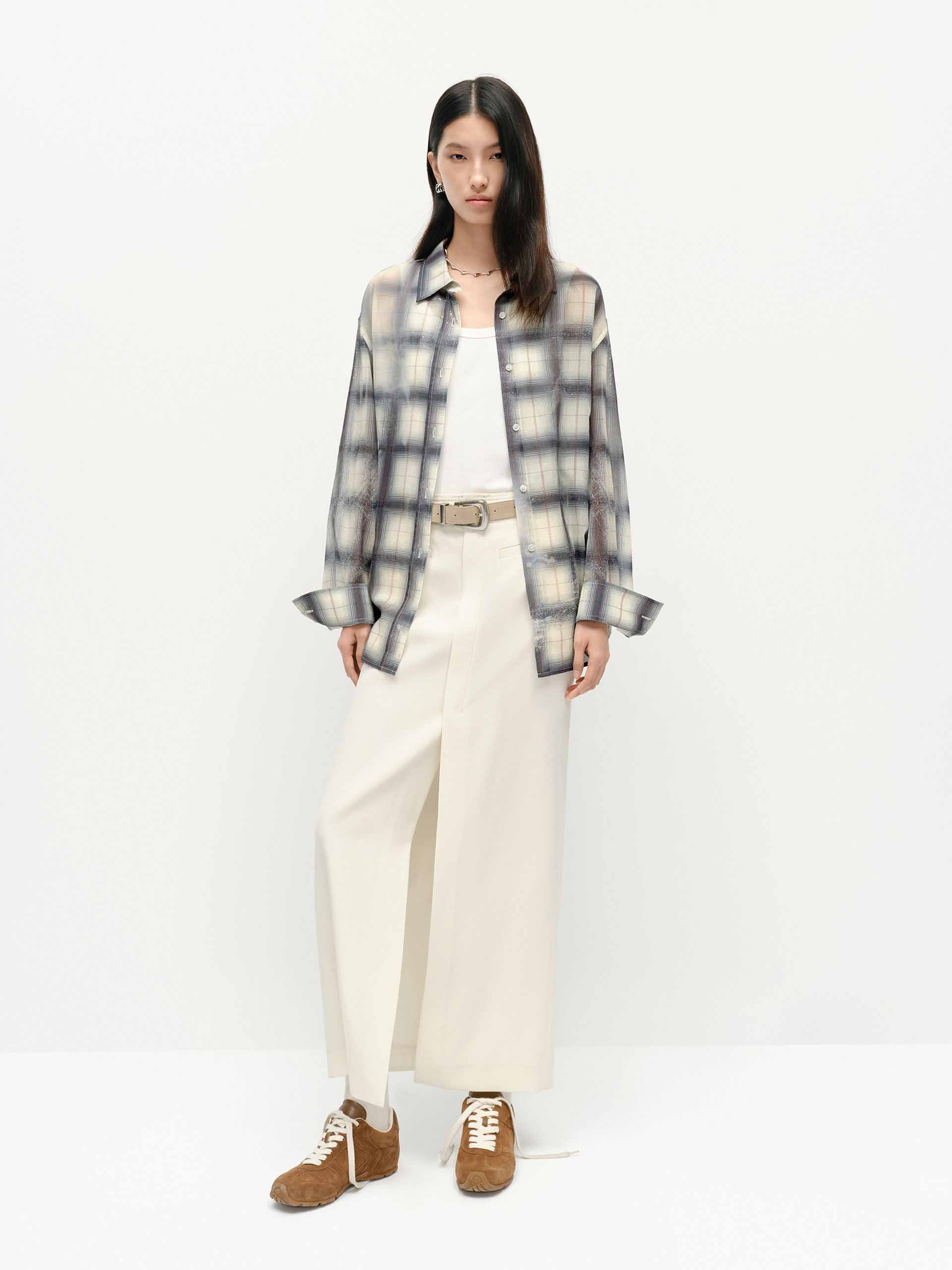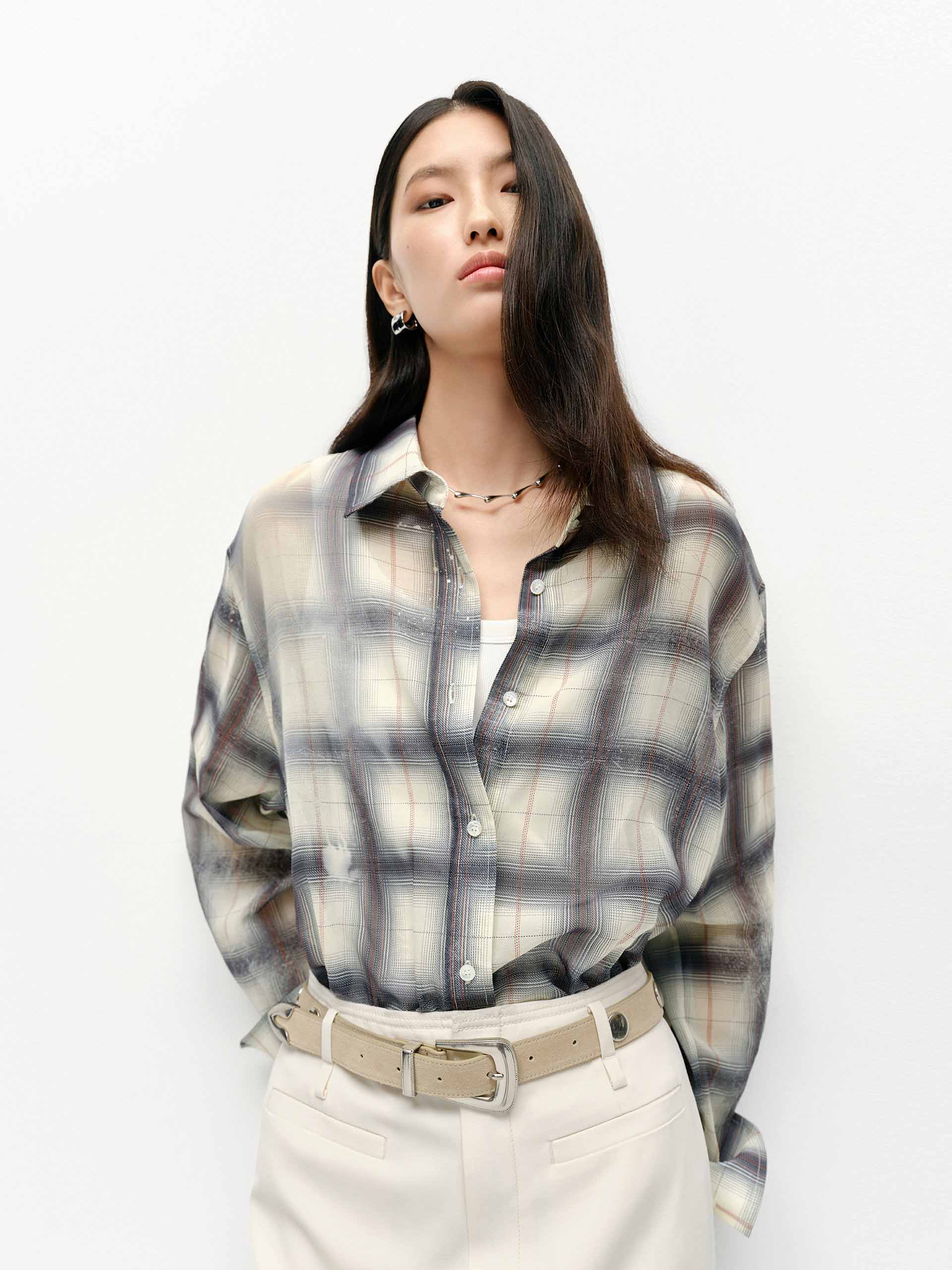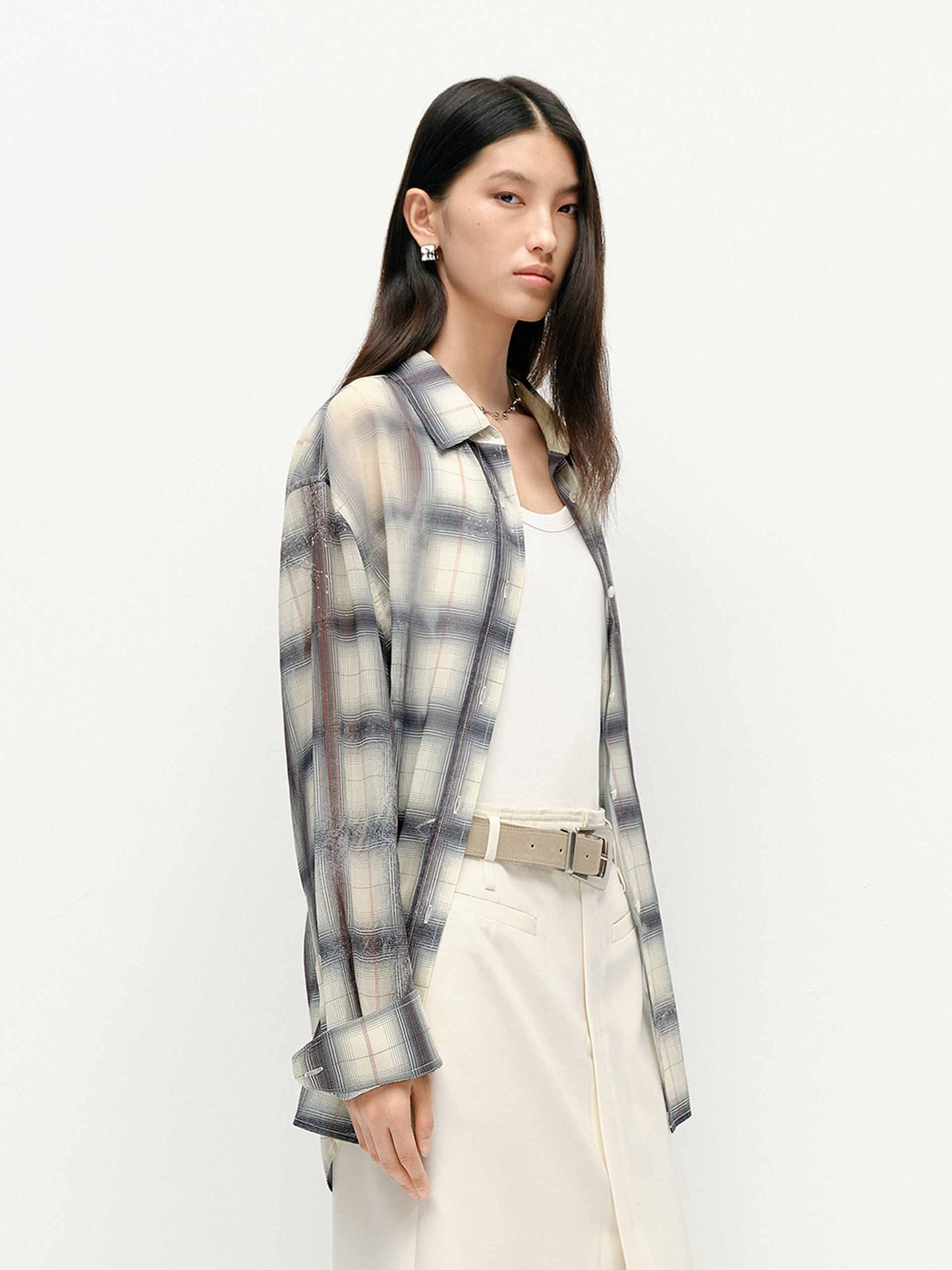 This shirt is crafted from 100% soft and comfortable cotton, offering a relaxed and easy-going fit. It features a curved hem for a modern touch, along with artistic paint splatters and a blurred plaid pattern that gives it a stylish, lived-in appearance. Perfect for a casual yet trendy look.