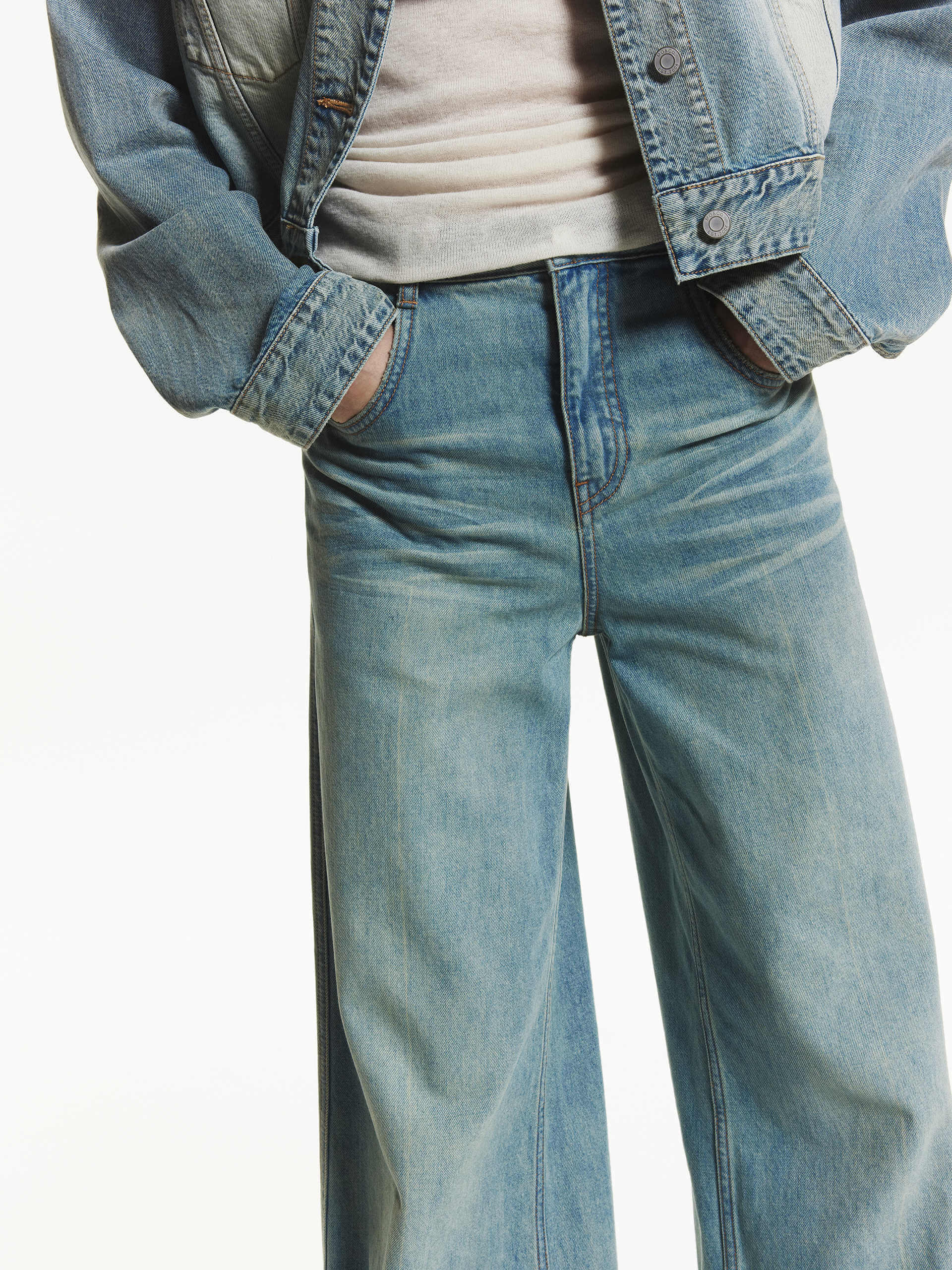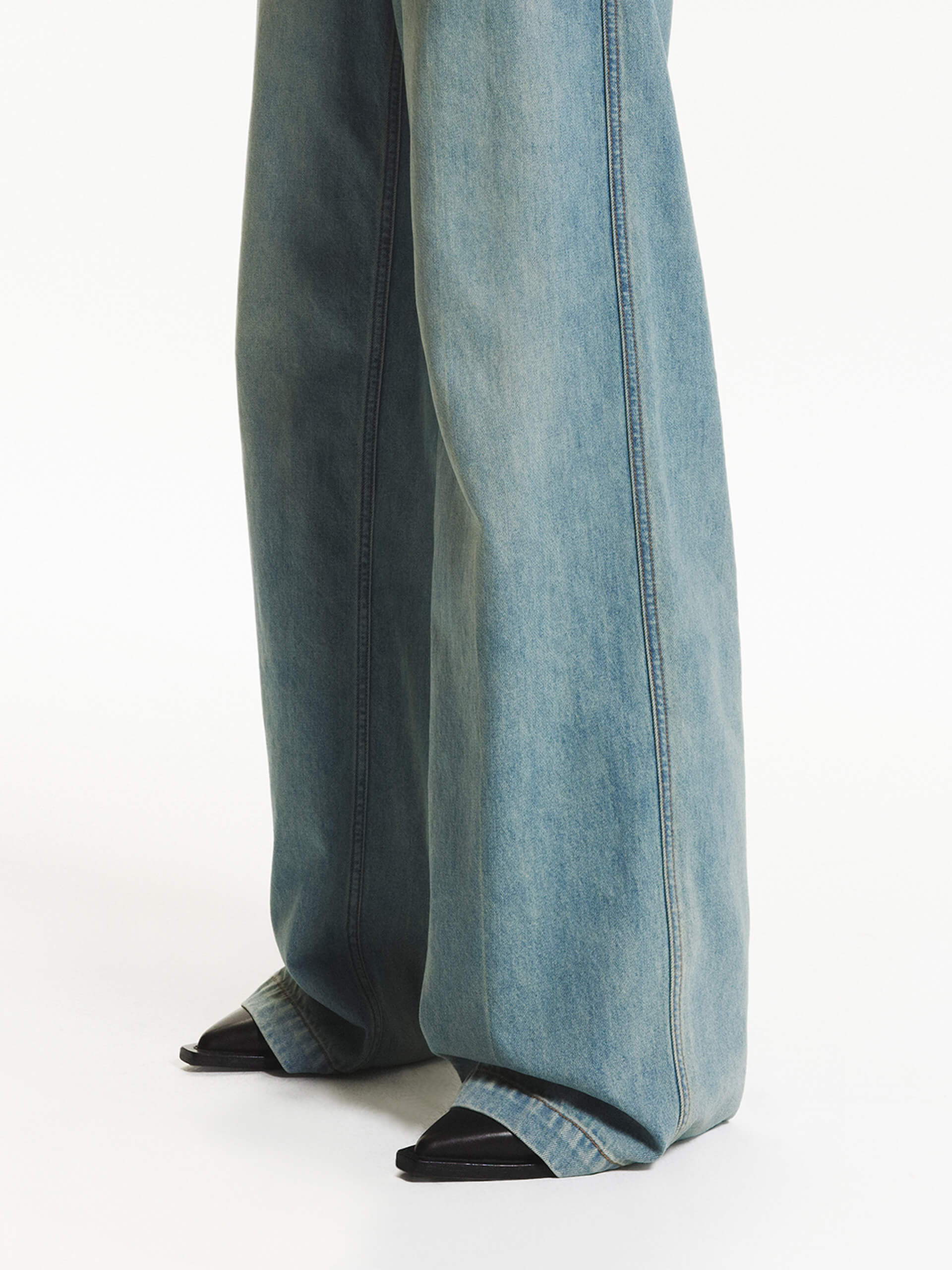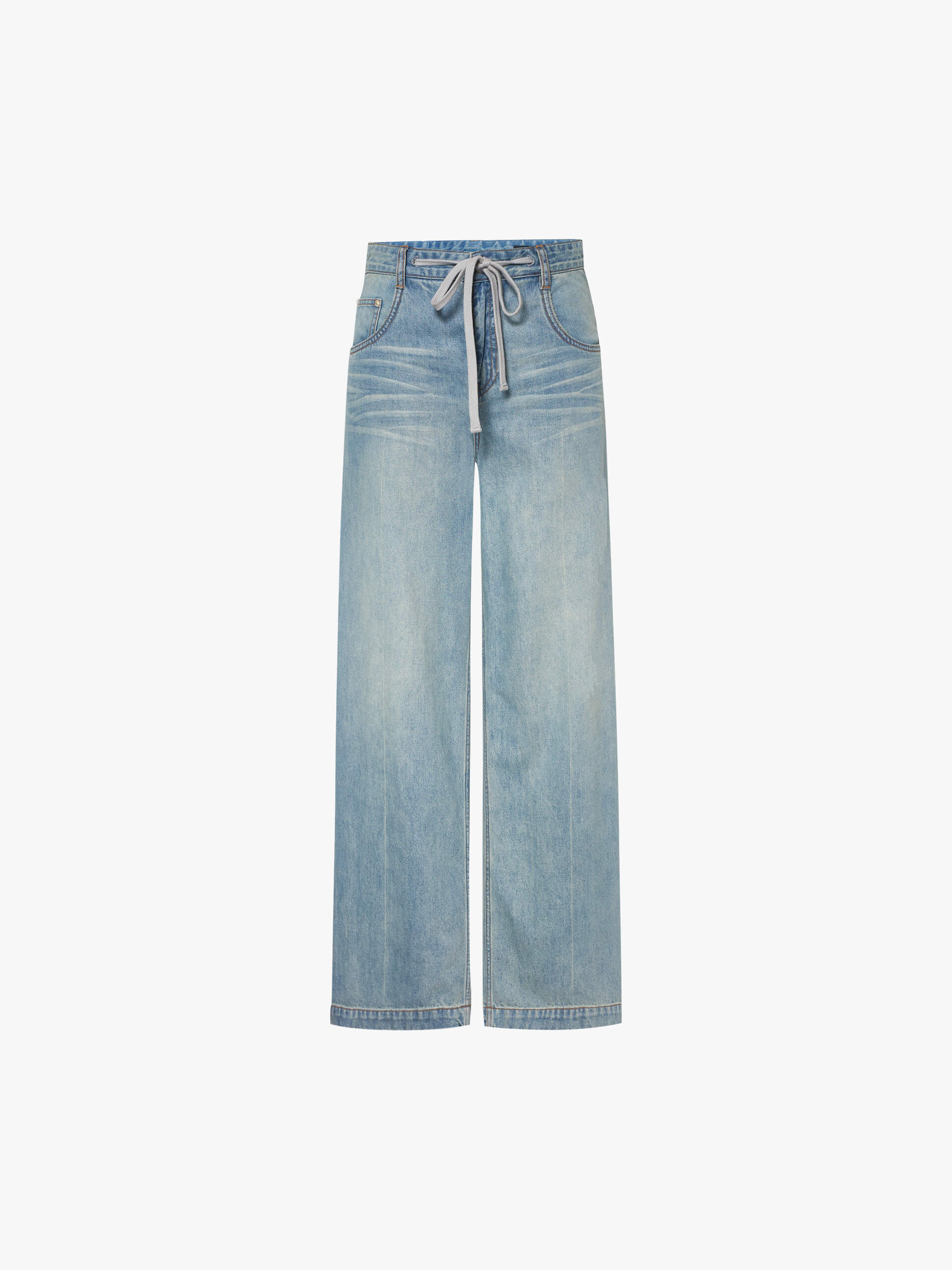 Expertly crafted from a soft blend of cotton and silk, our jeans offer superior comfort and a luxurious feel. The drawstring waist detail allows for a customizable fit while the loose straight leg design provides a relaxed yet flattering silhouette. Finished with a beautiful blue wash and whisker detail.