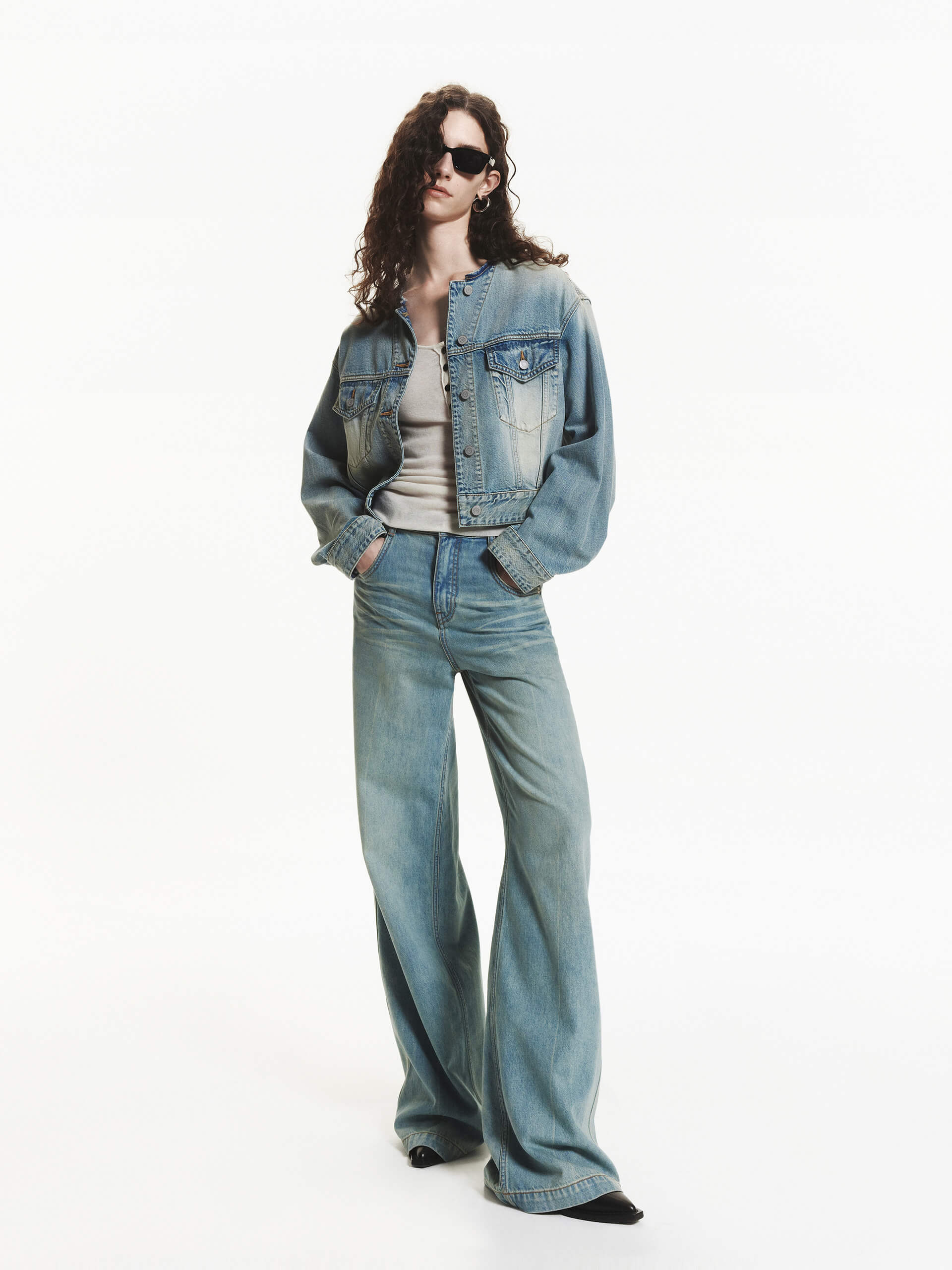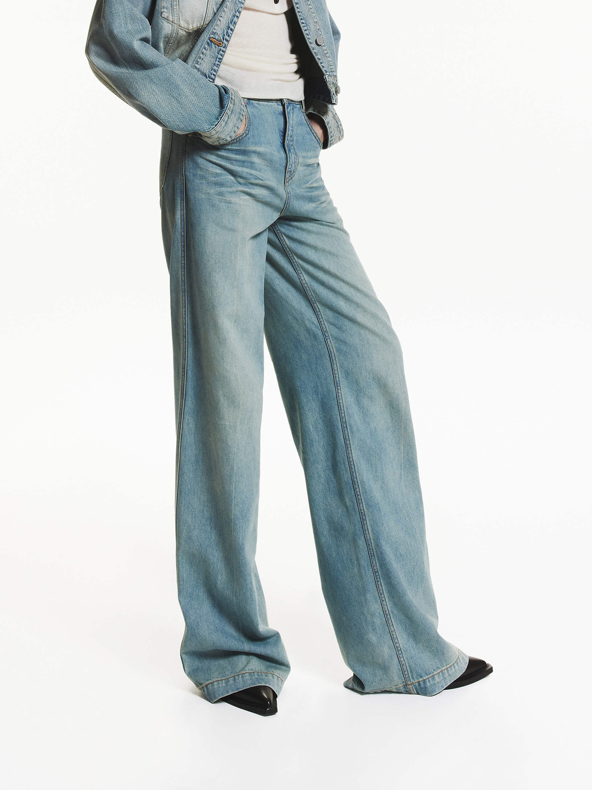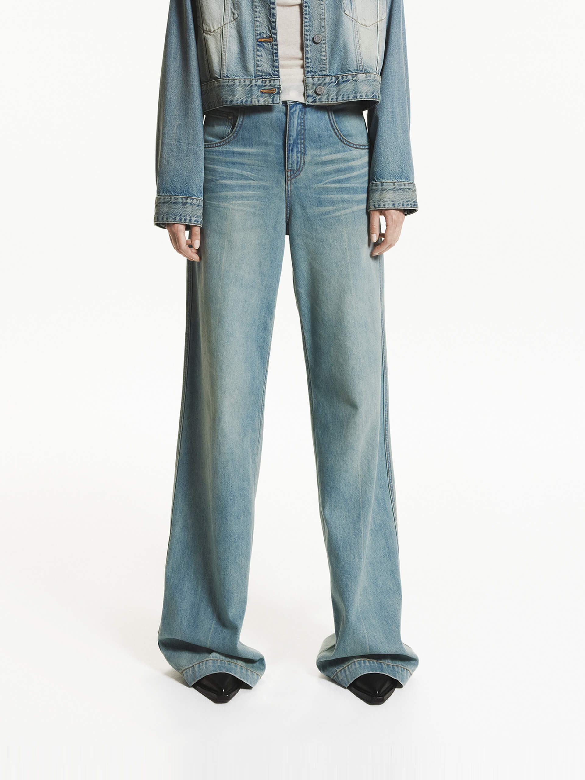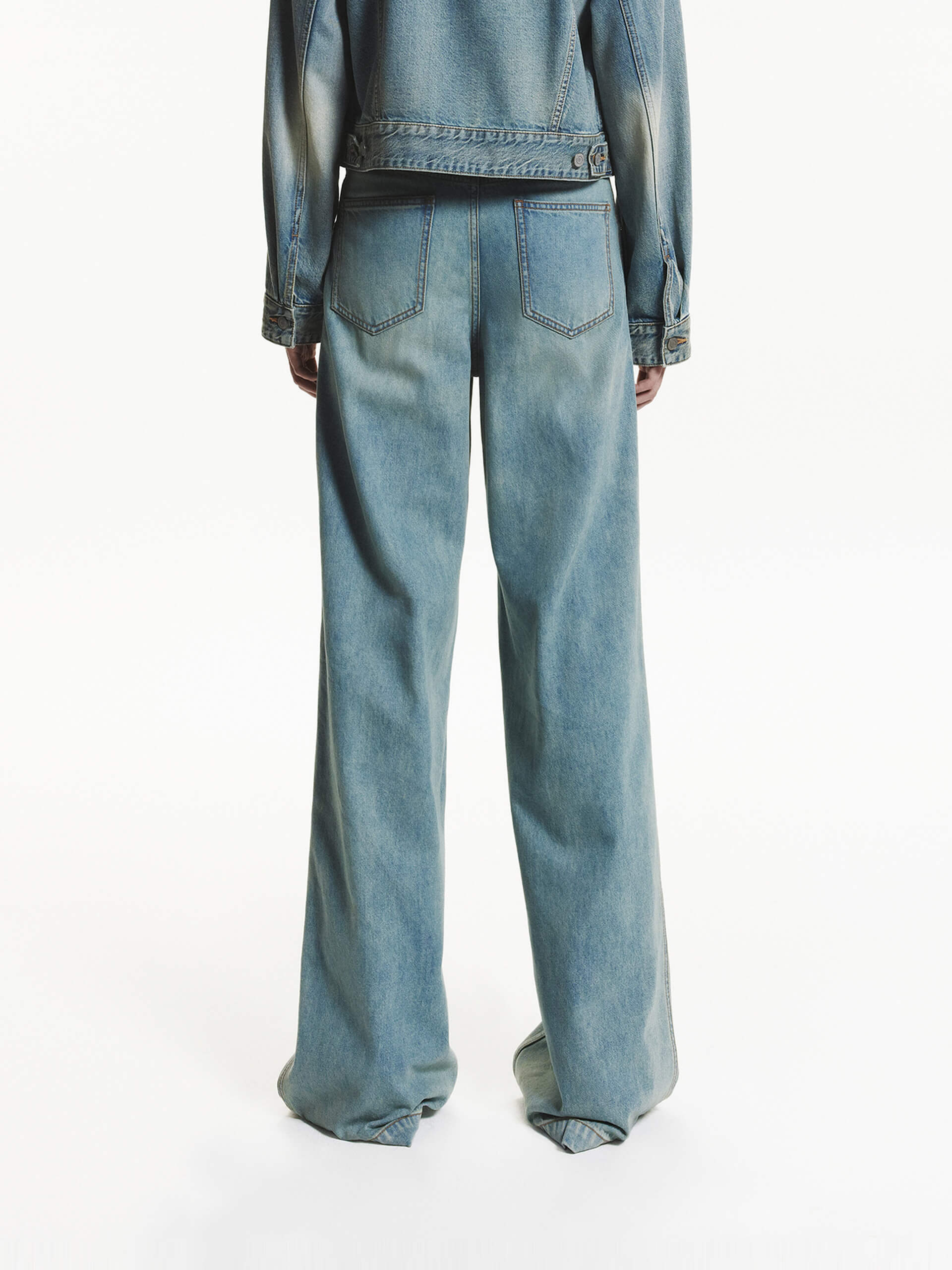 Expertly crafted from a soft blend of cotton and silk, our jeans offer superior comfort and a luxurious feel. The drawstring waist detail allows for a customizable fit while the loose straight leg design provides a relaxed yet flattering silhouette. Finished with a beautiful blue wash and whisker detail.