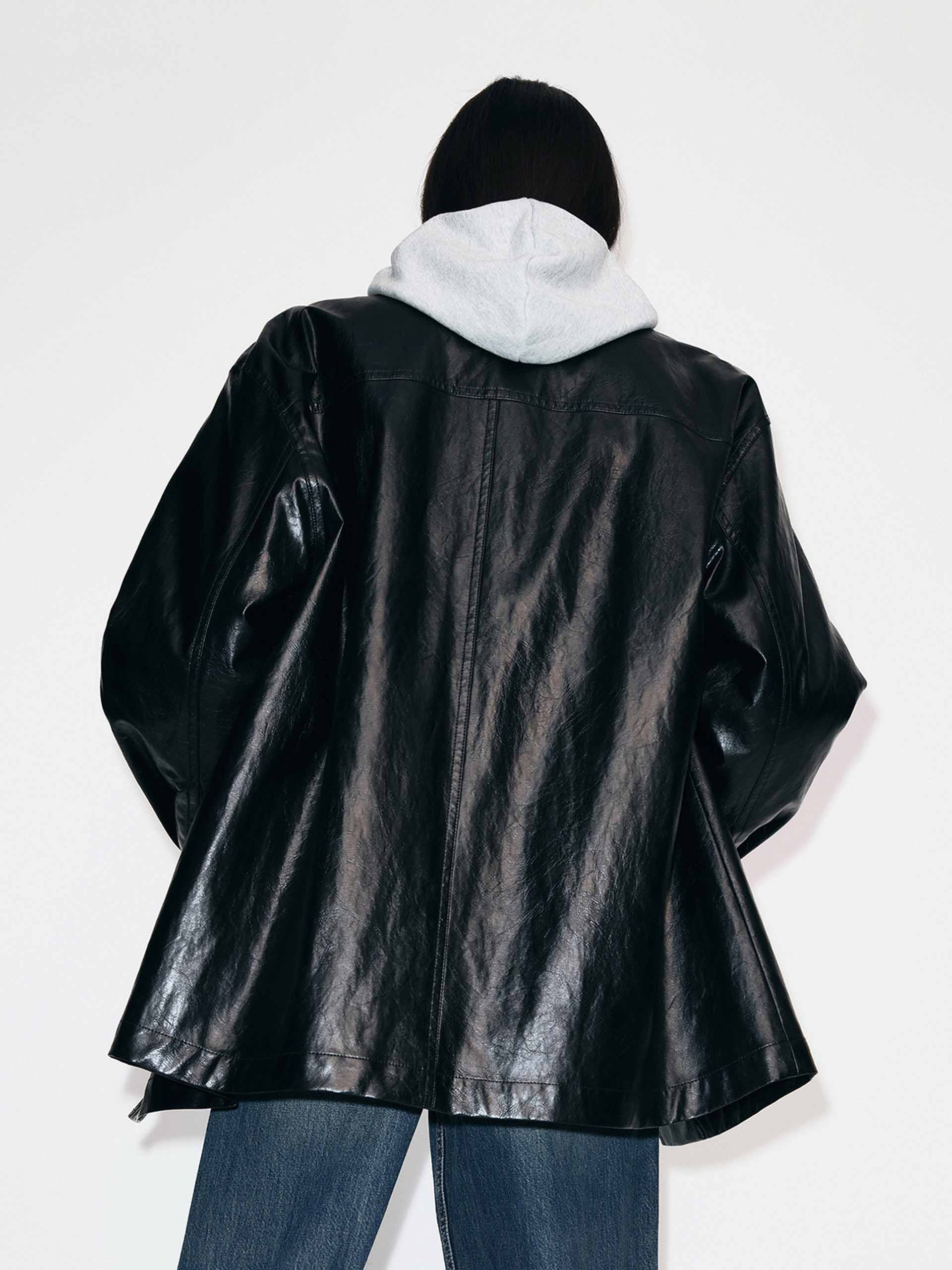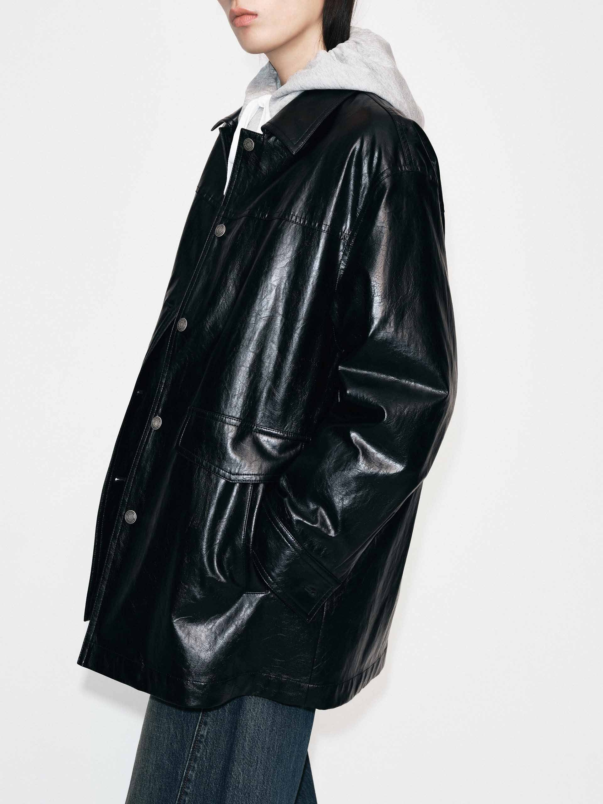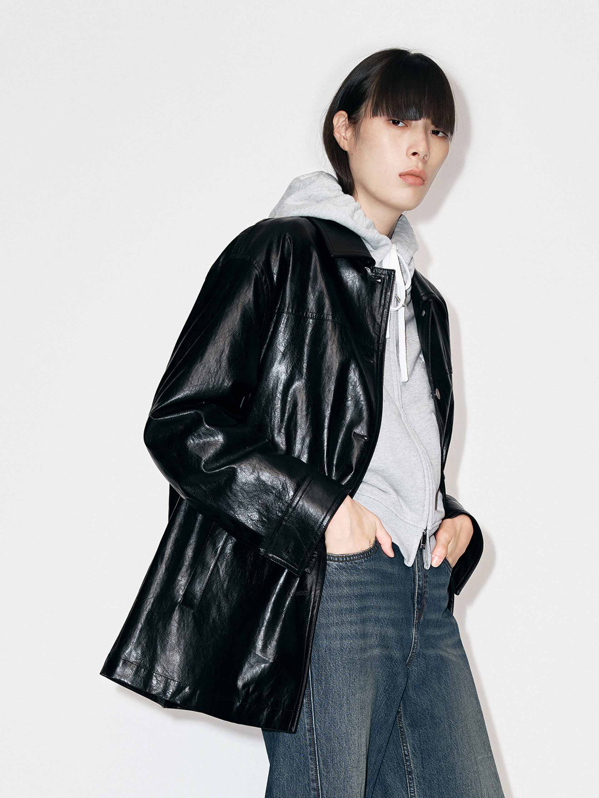 Blending sleek style with urban functionality, this down jacket is crafted from premium PU leather fabric for a modern, luxe look. Designed with long sleeves and practical side pockets, it combines aesthetic appeal with everyday convenience. The classic button closure ensures a secure and adjustable fit while adding a touch of timeless sophistication.