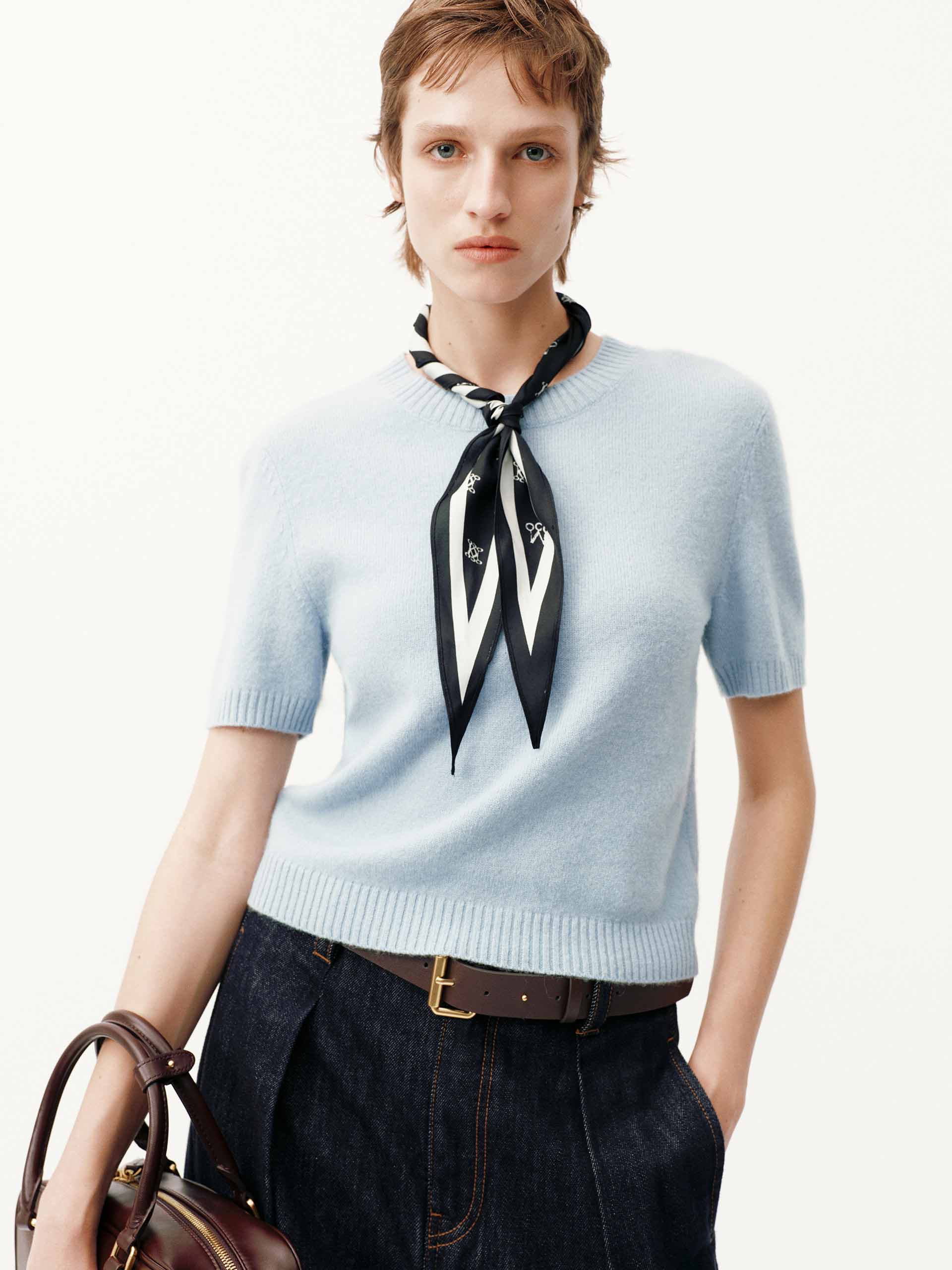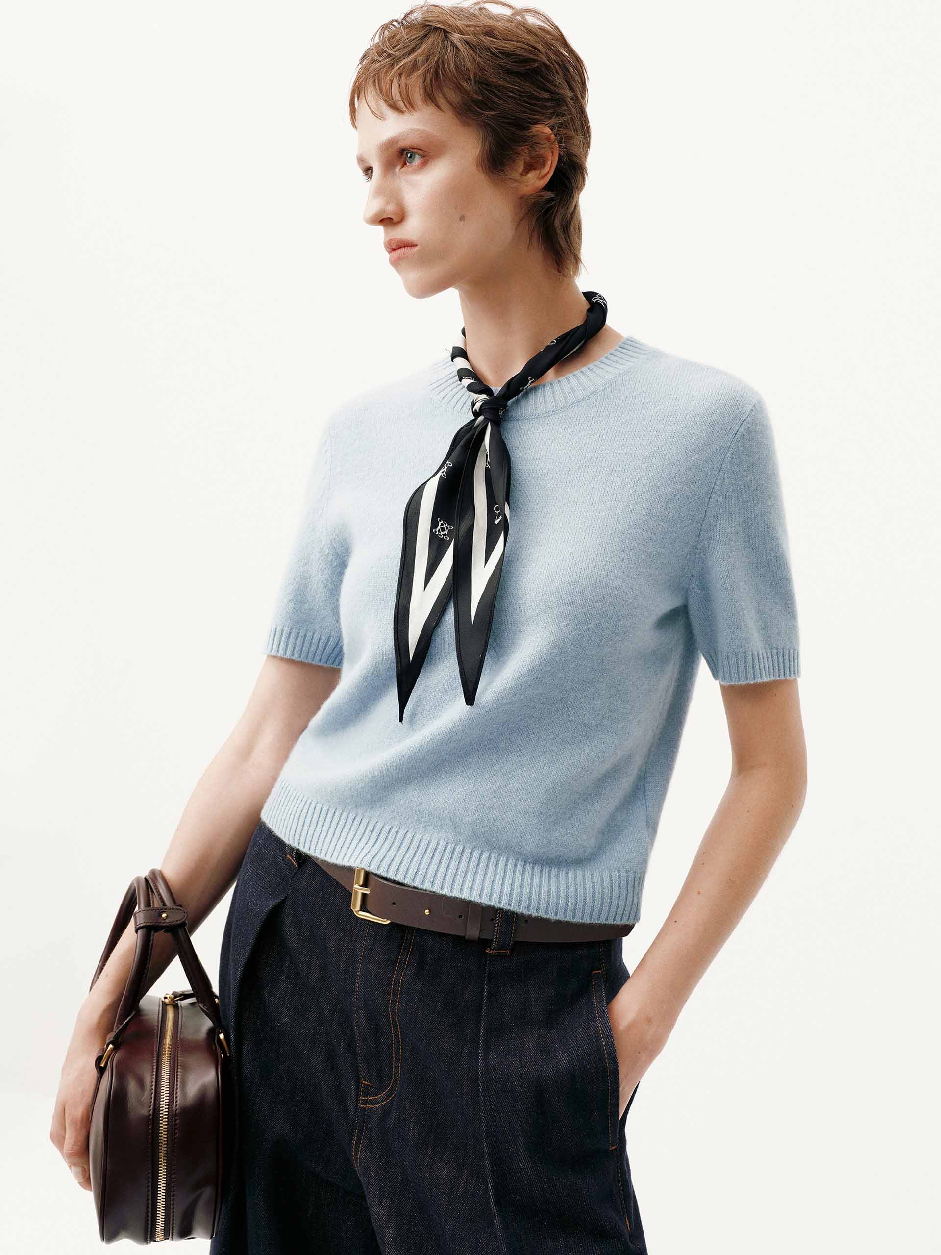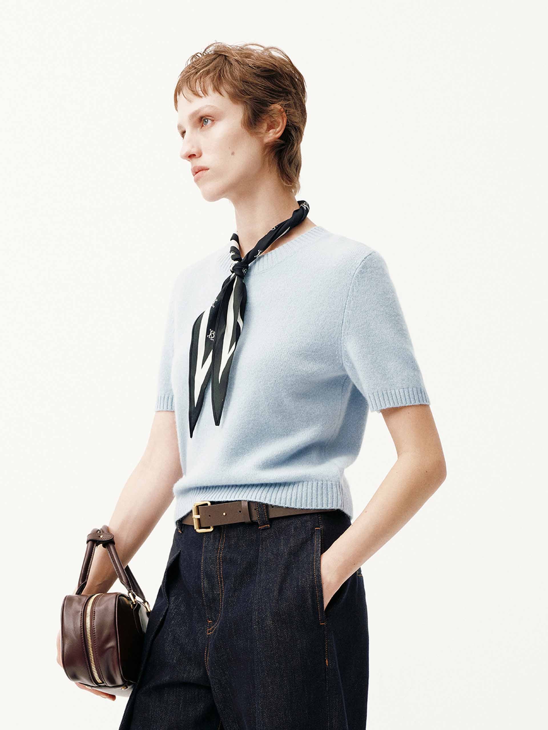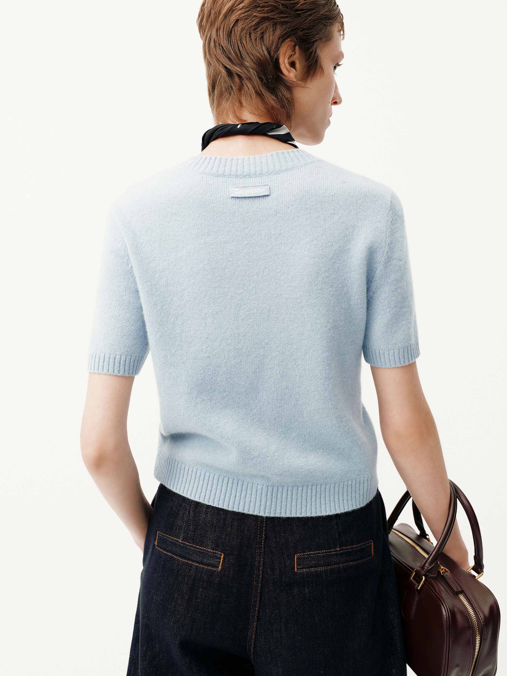 Embrace modern knitwear charm with this knitted top, featuring a contemporary cropped fit that pairs perfectly with high-waisted bottoms for a stylish silhouette. The design is defined by a classic round neck and short sleeves, both finished with subtle ribbed trim for a clean, structured outline. A delicate woven label at the back adds a final touch of understated branding.
