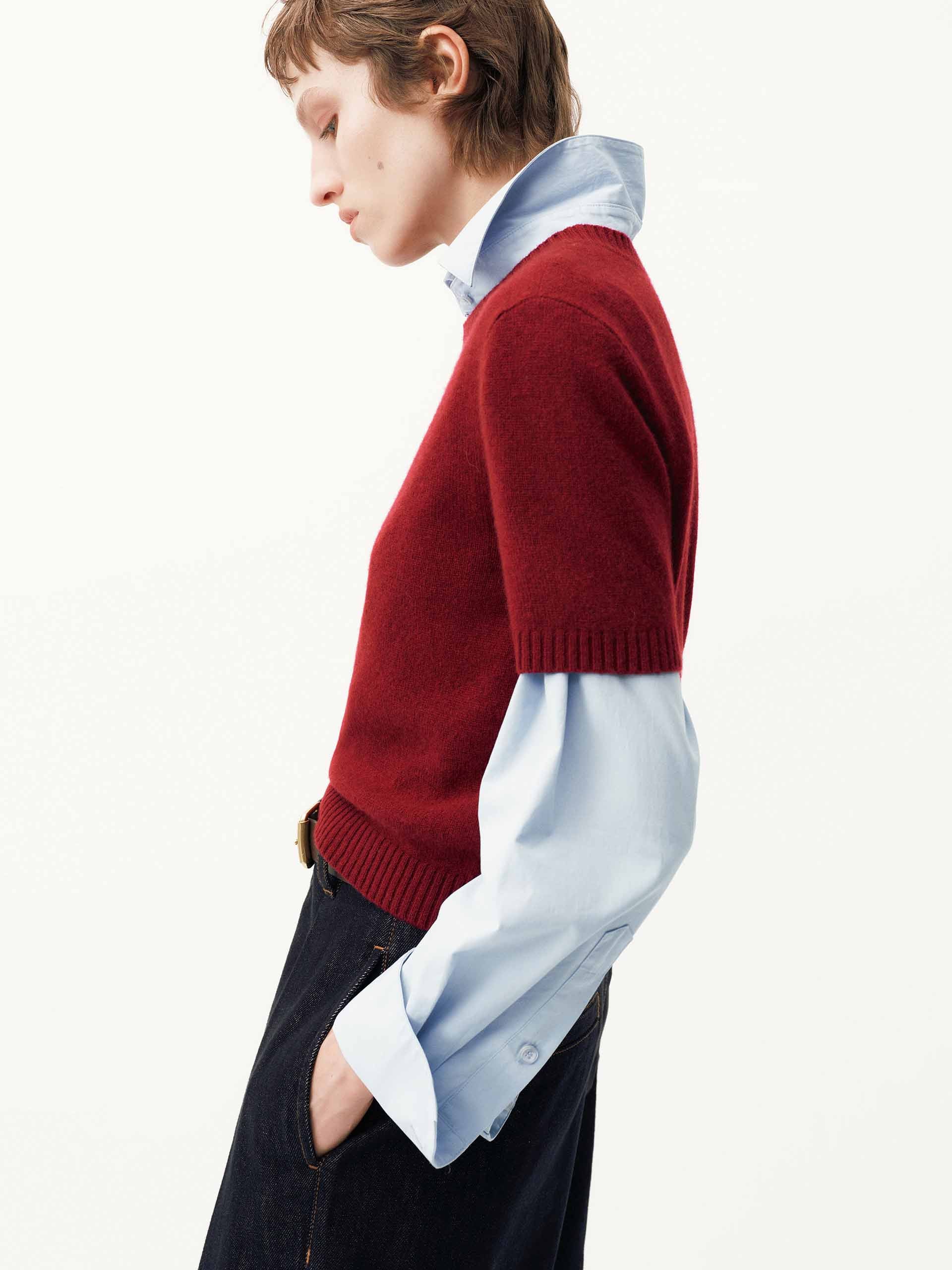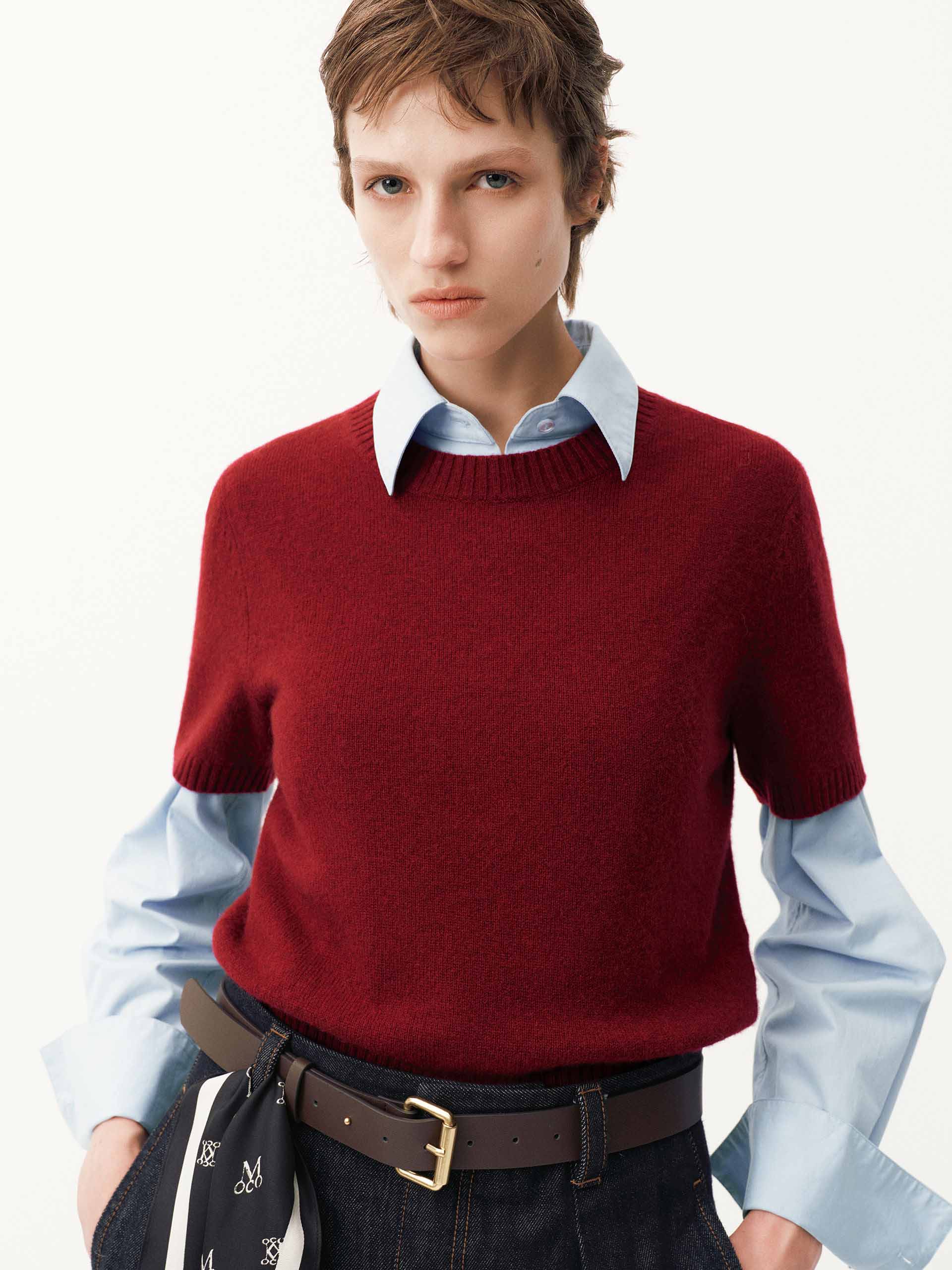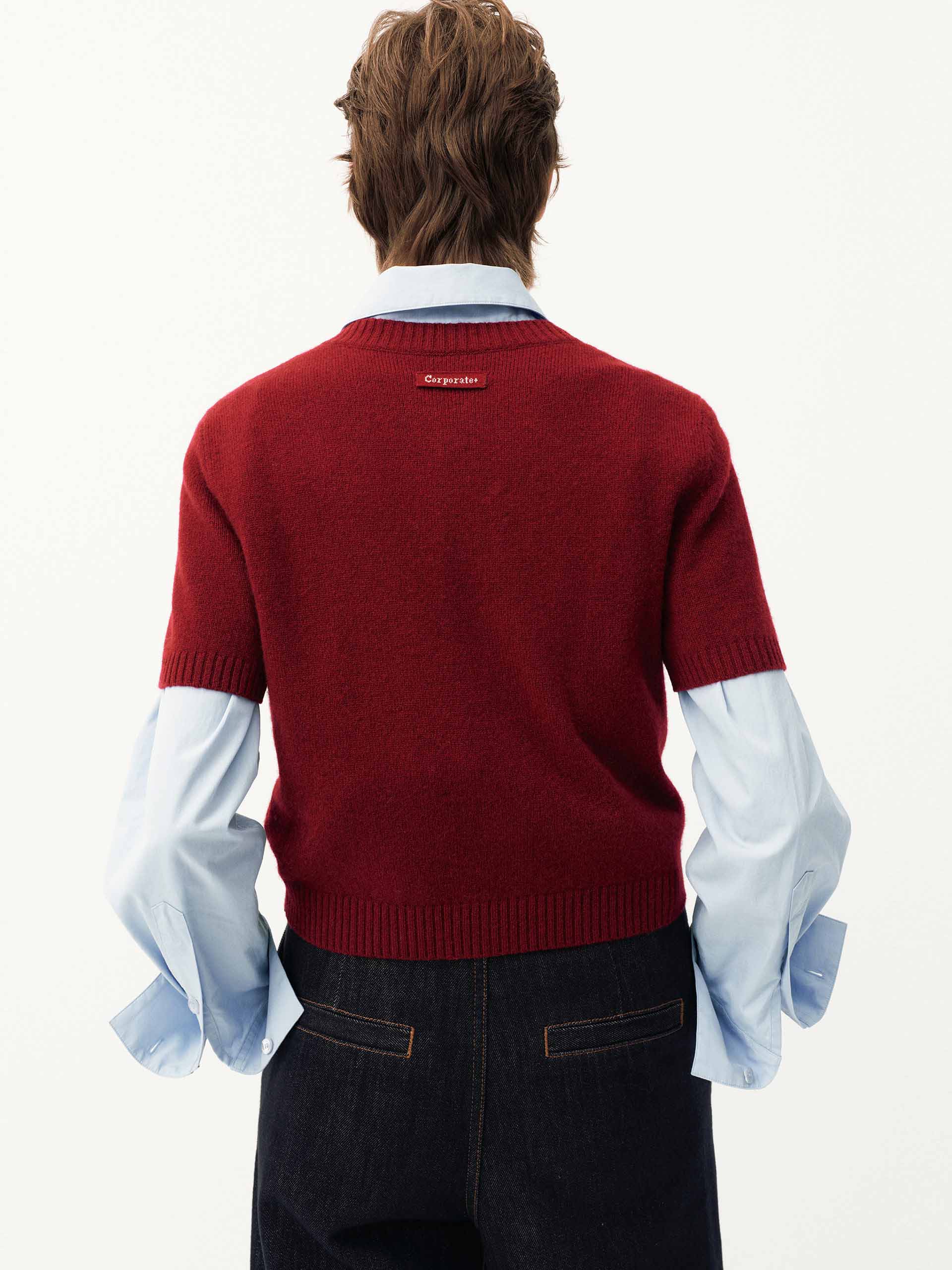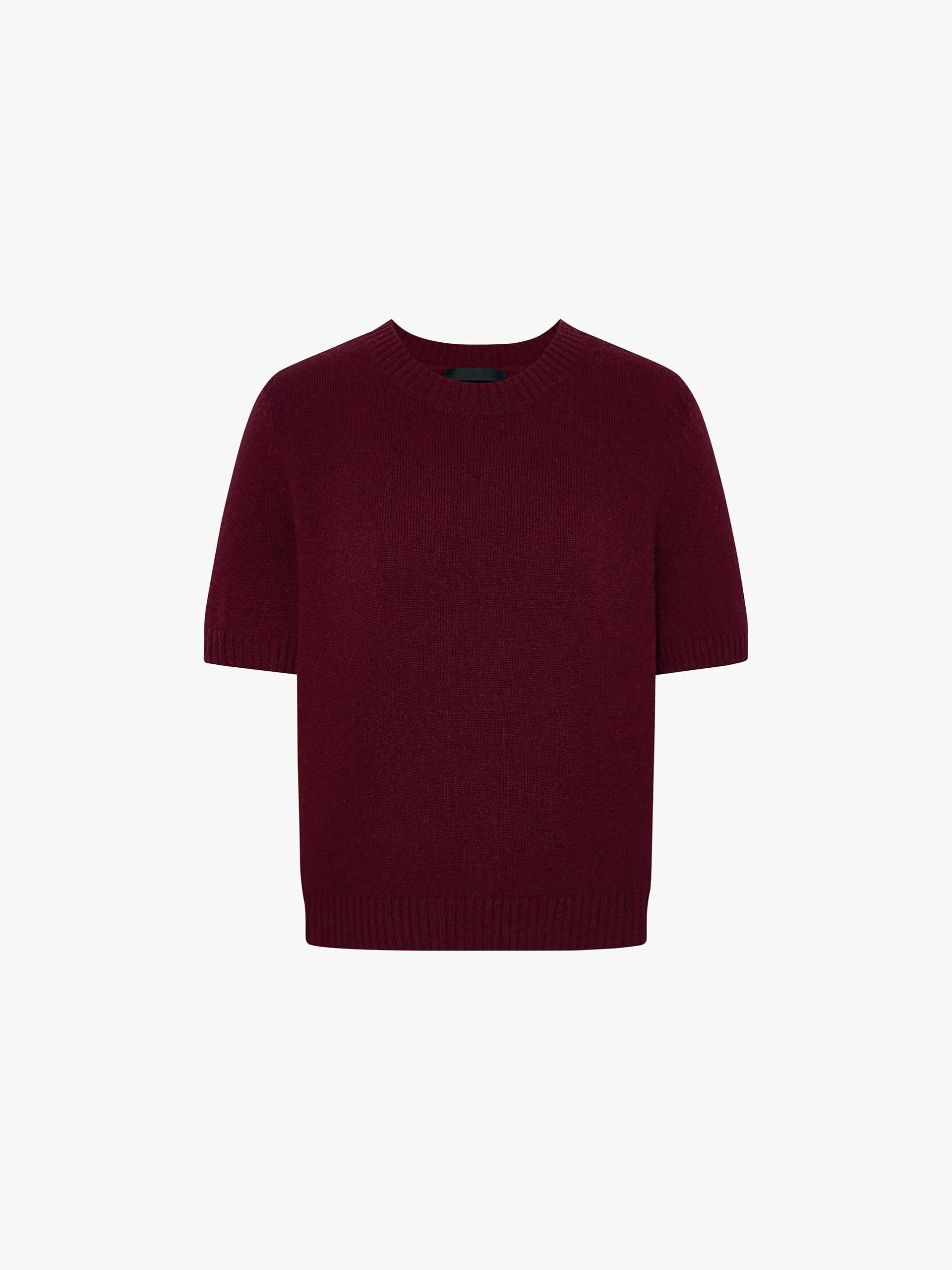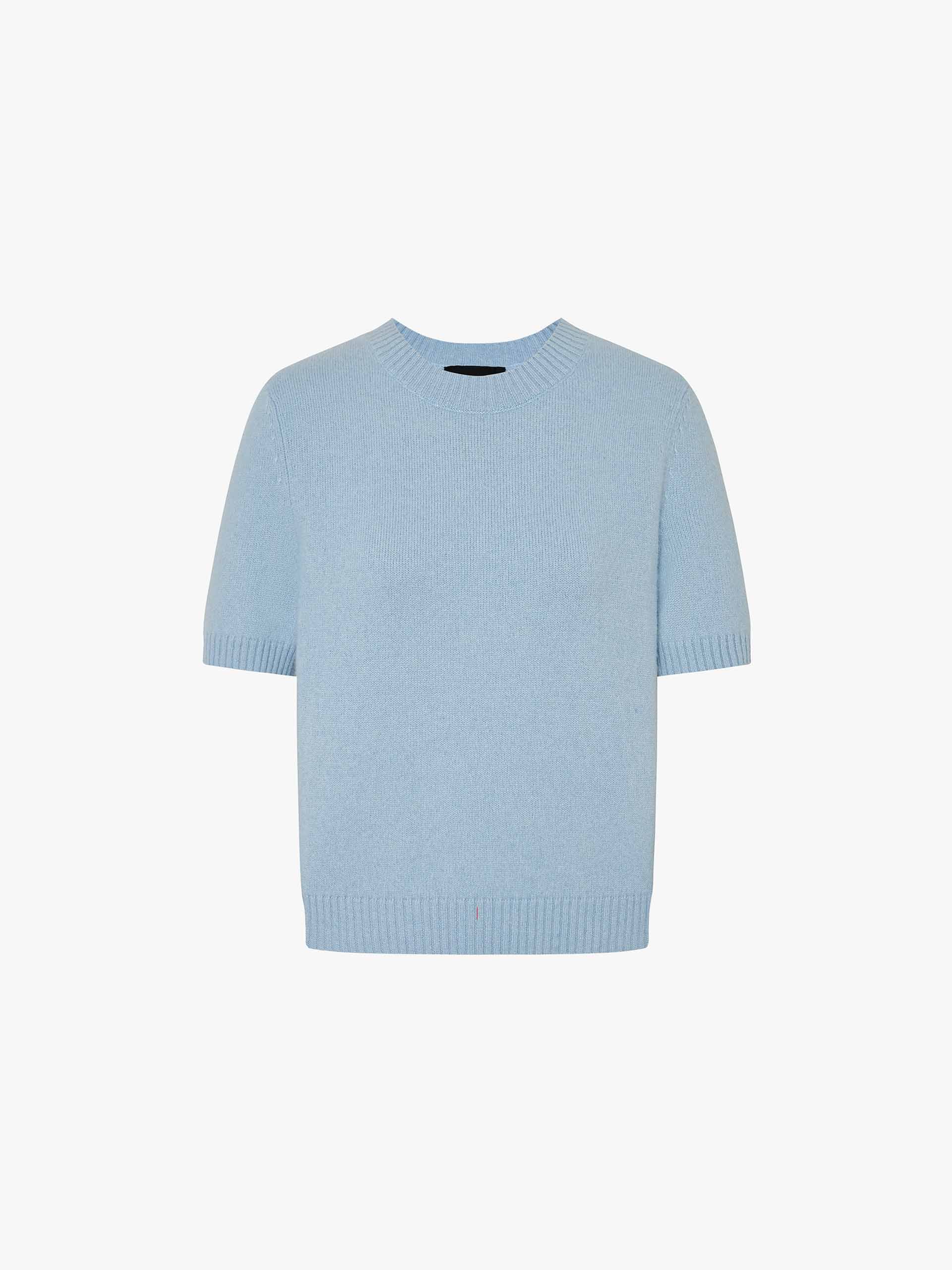 Embrace modern knitwear charm with this knitted top, featuring a contemporary cropped fit that pairs perfectly with high-waisted bottoms for a stylish silhouette. The design is defined by a classic round neck and short sleeves, both finished with subtle ribbed trim for a clean, structured outline. A delicate woven label at the back adds a final touch of understated branding.