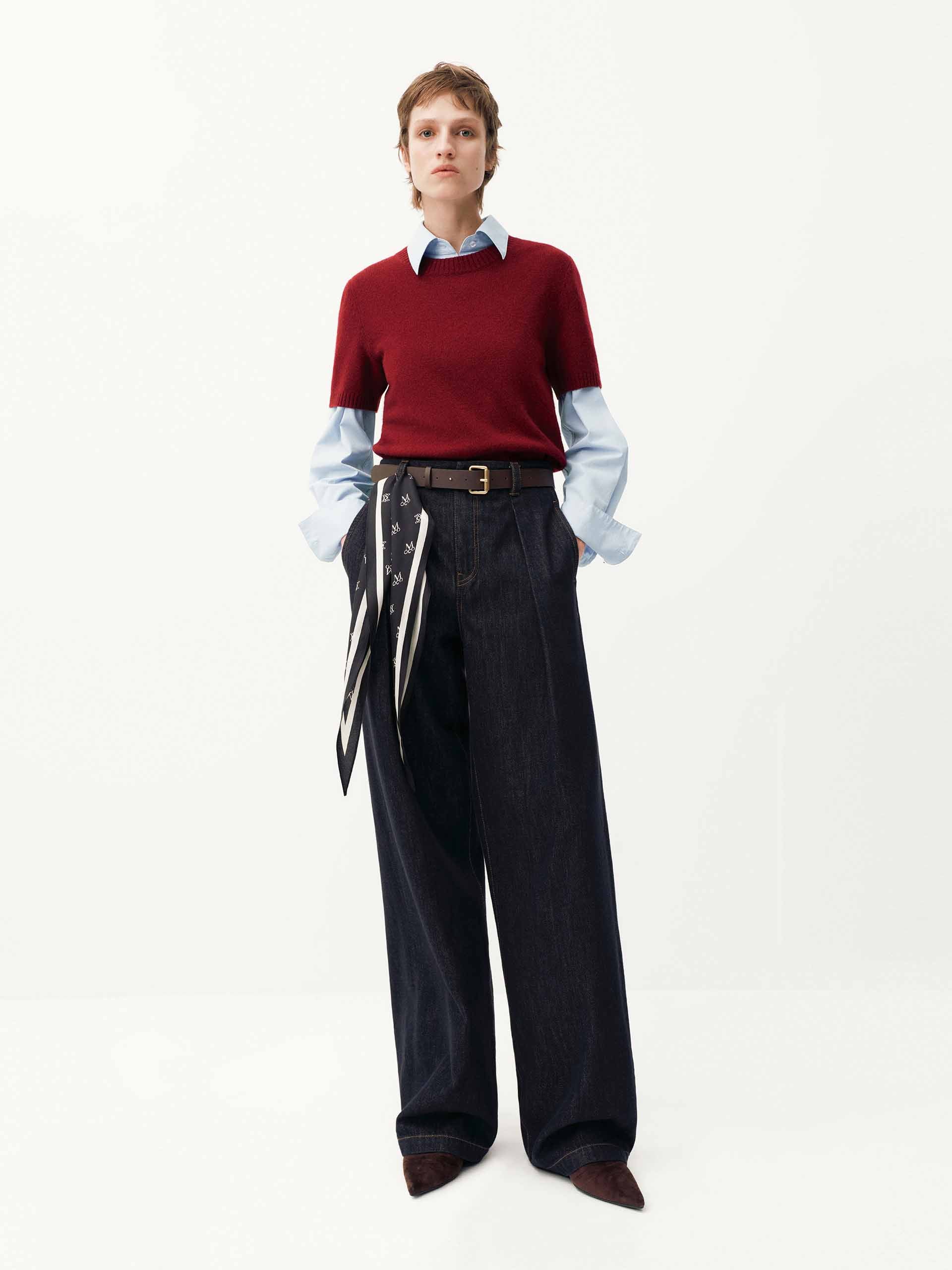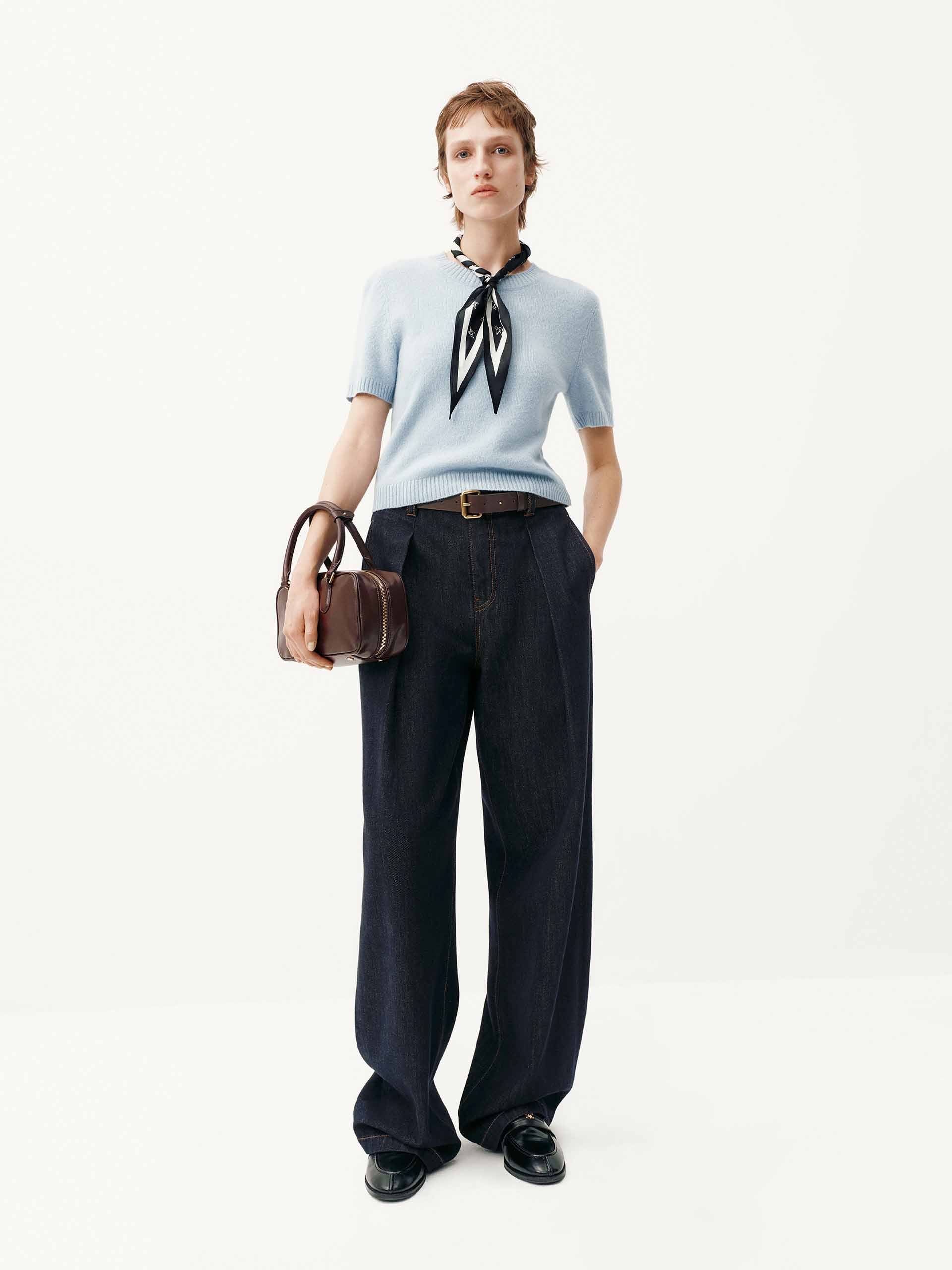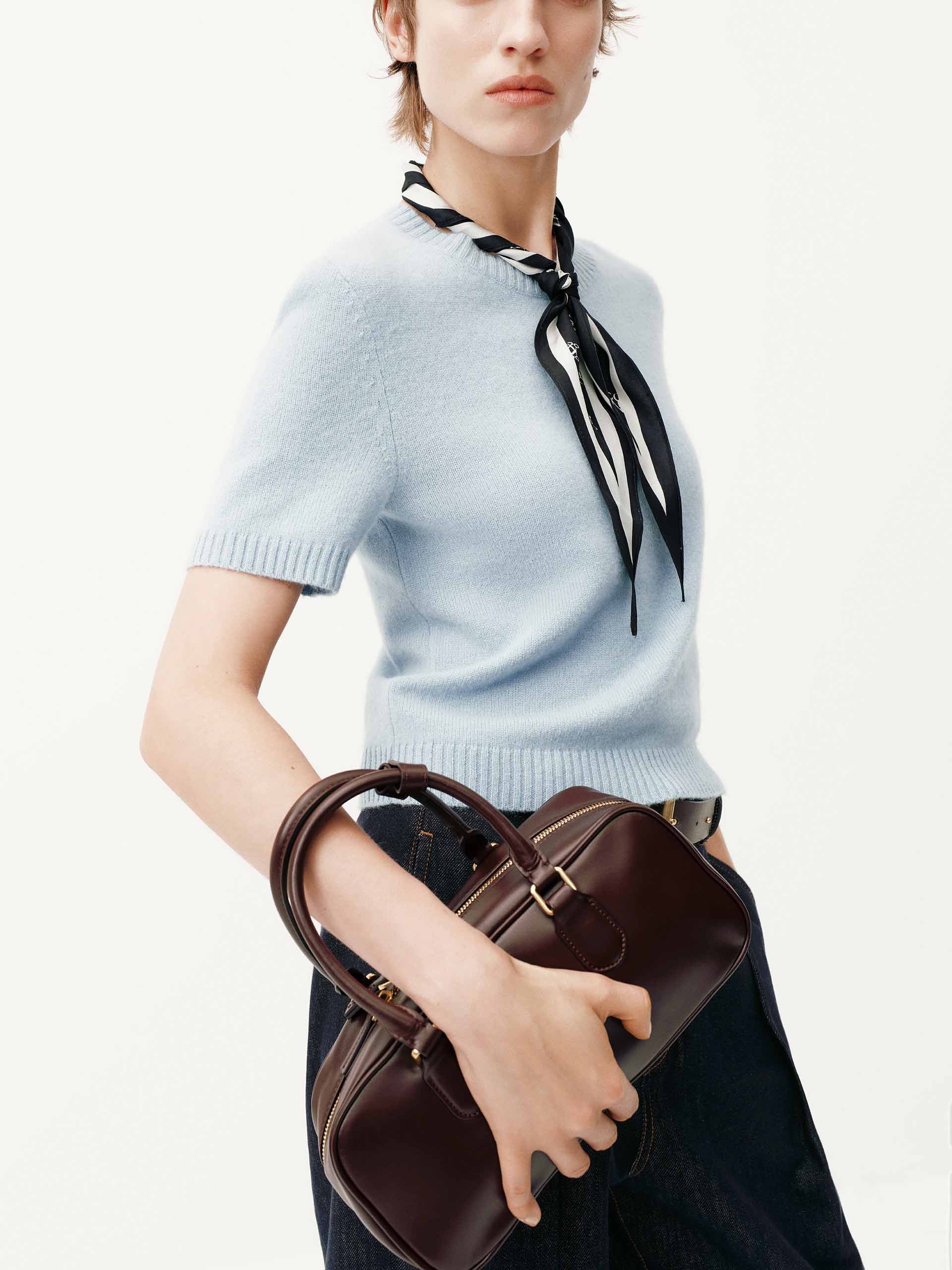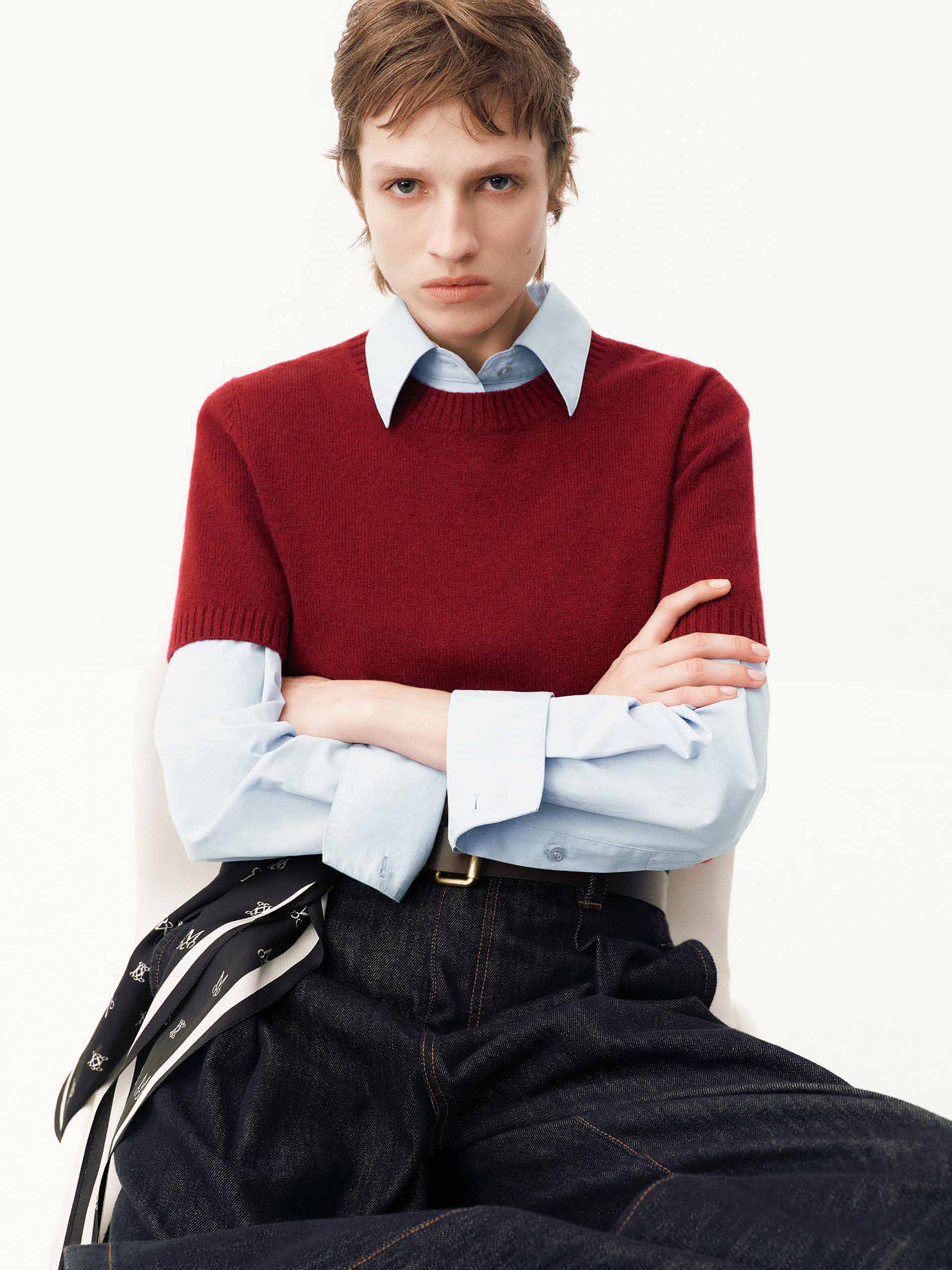 Embrace modern knitwear charm with this knitted top, featuring a contemporary cropped fit that pairs perfectly with high-waisted bottoms for a stylish silhouette. The design is defined by a classic round neck and short sleeves, both finished with subtle ribbed trim for a clean, structured outline. A delicate woven label at the back adds a final touch of understated branding.