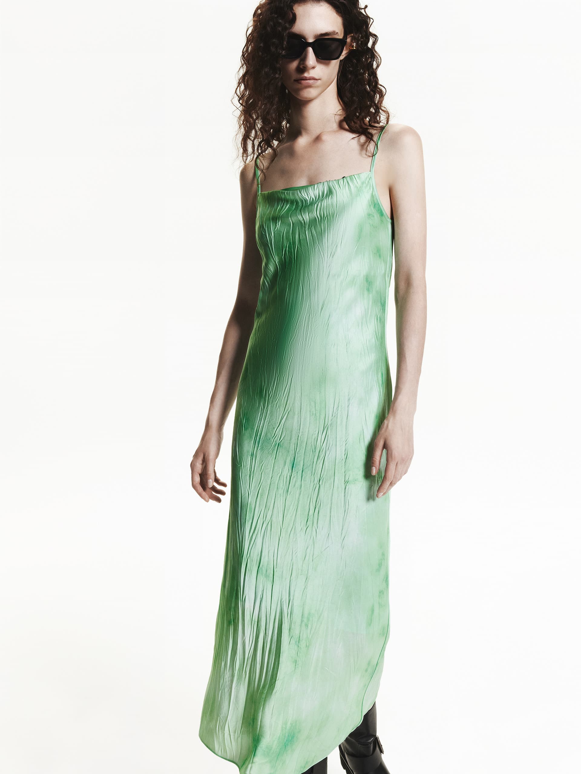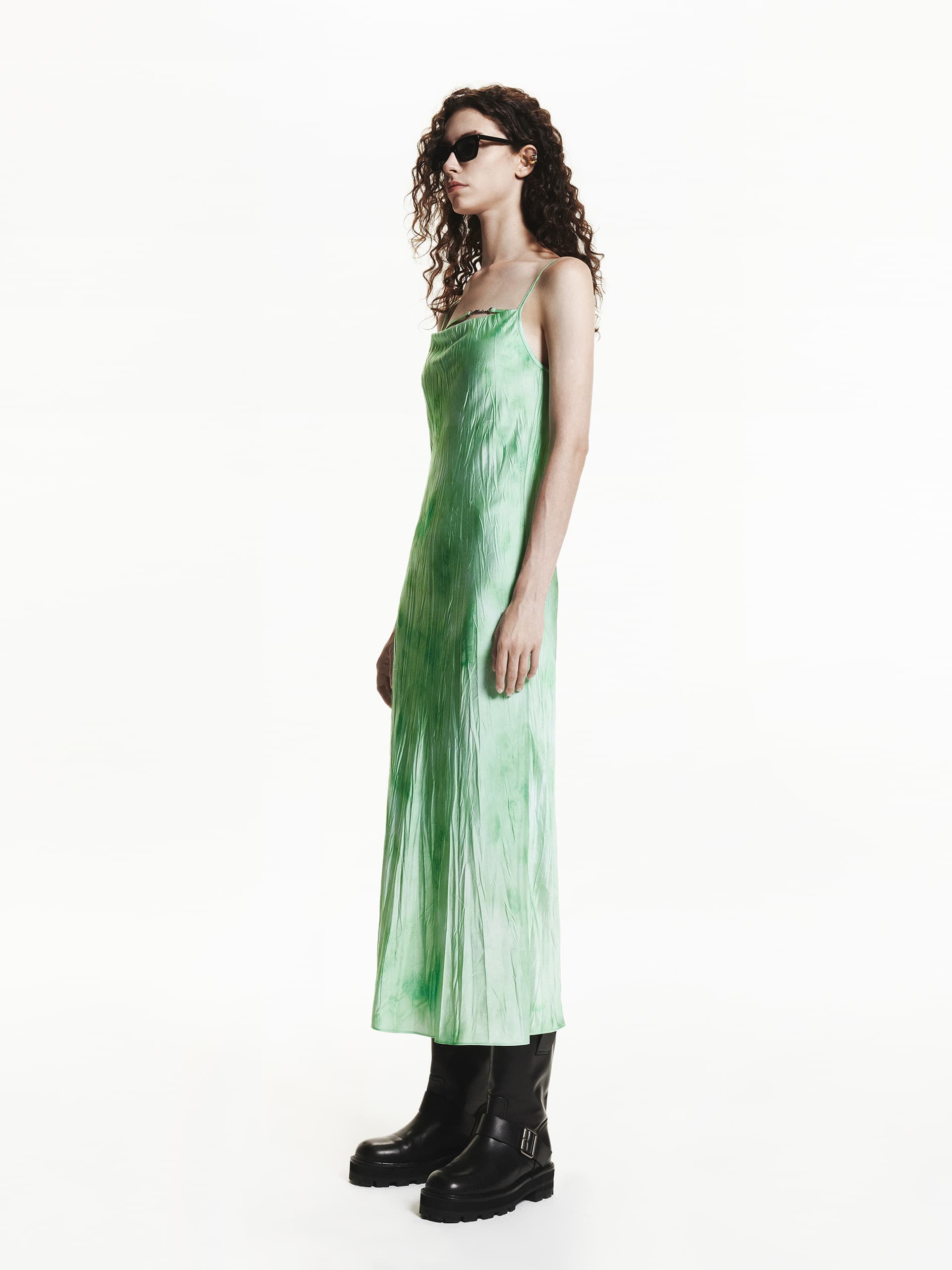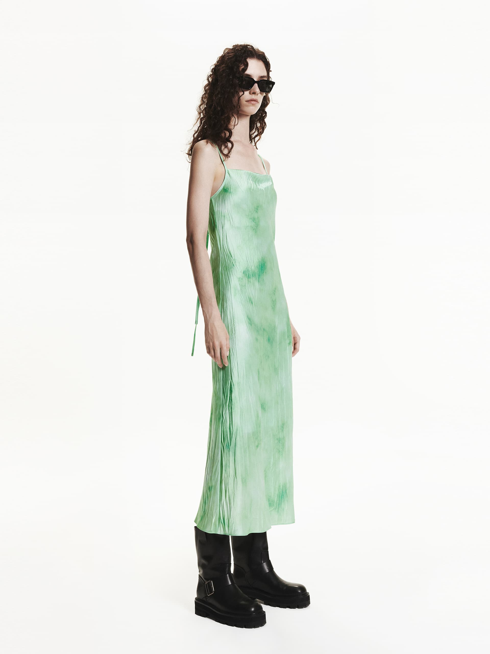 This light green midi dress is expertly crafted from smooth acetate fabric, offering a luxurious feel. The adjustable shoulder straps provide a customizable fit while the printed design and crinkled texture add unique visual interest.