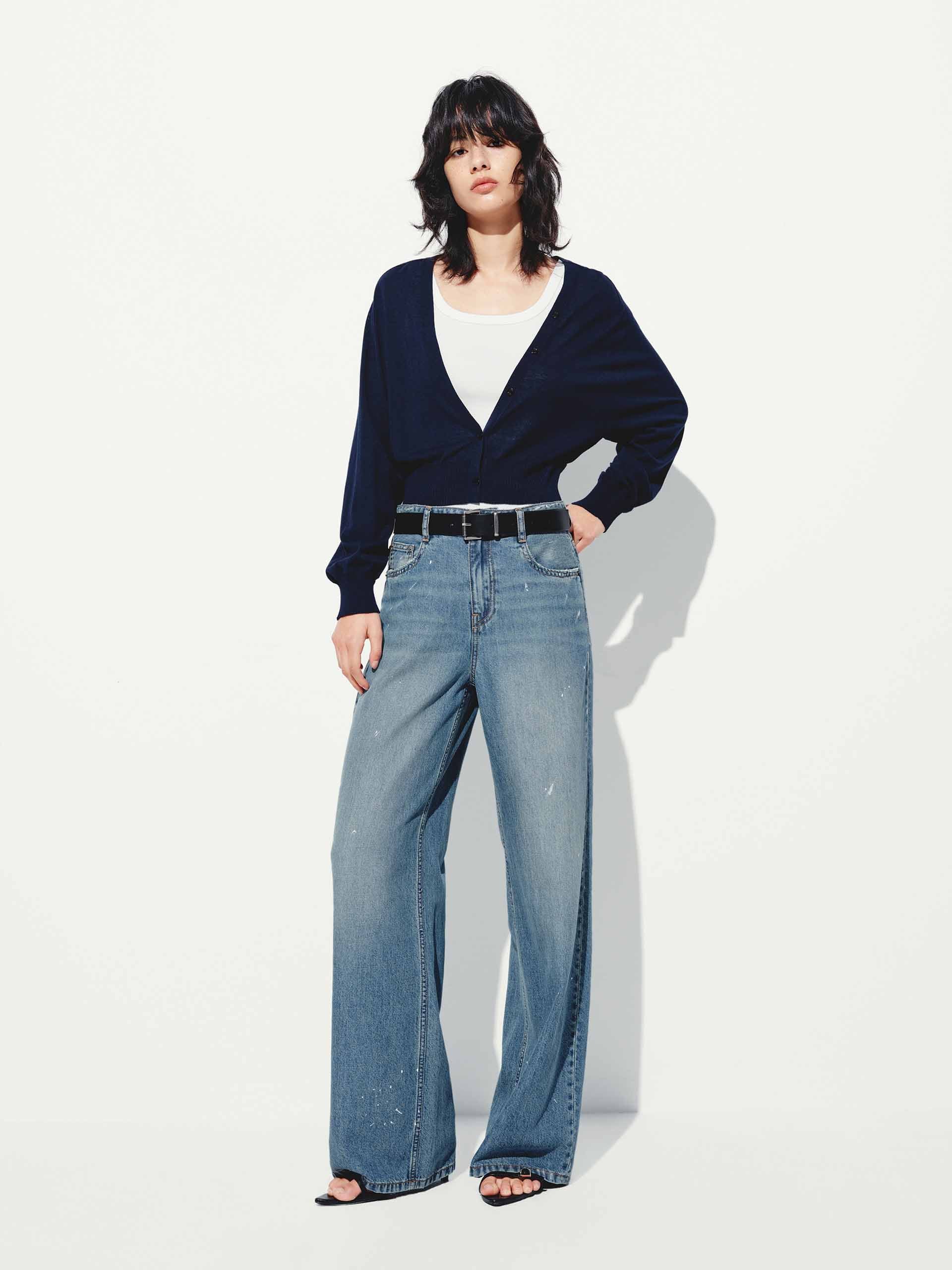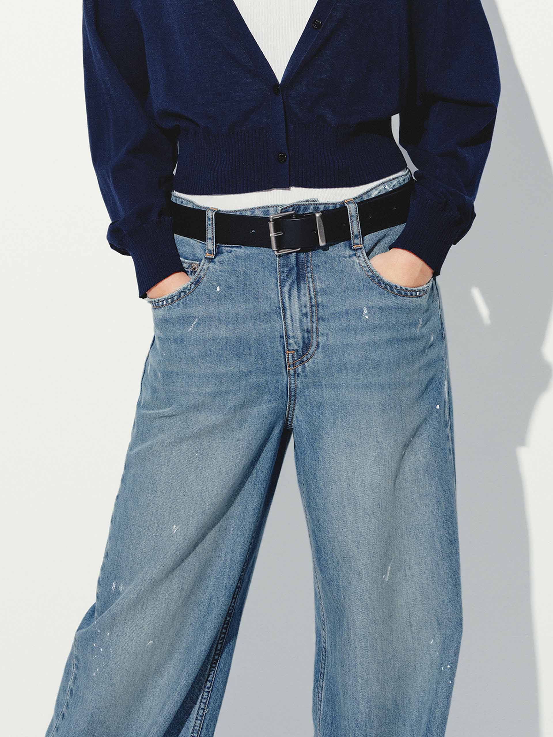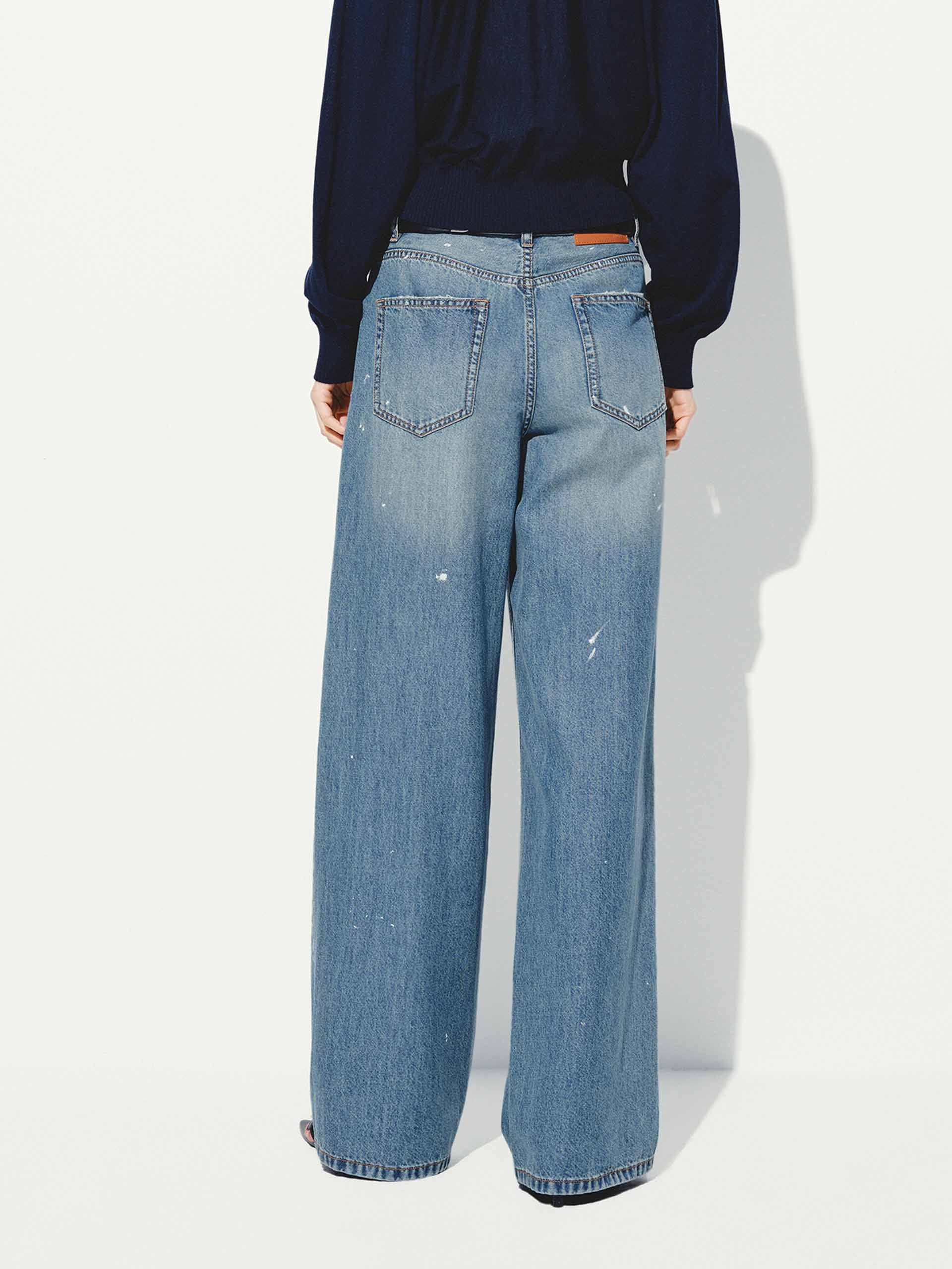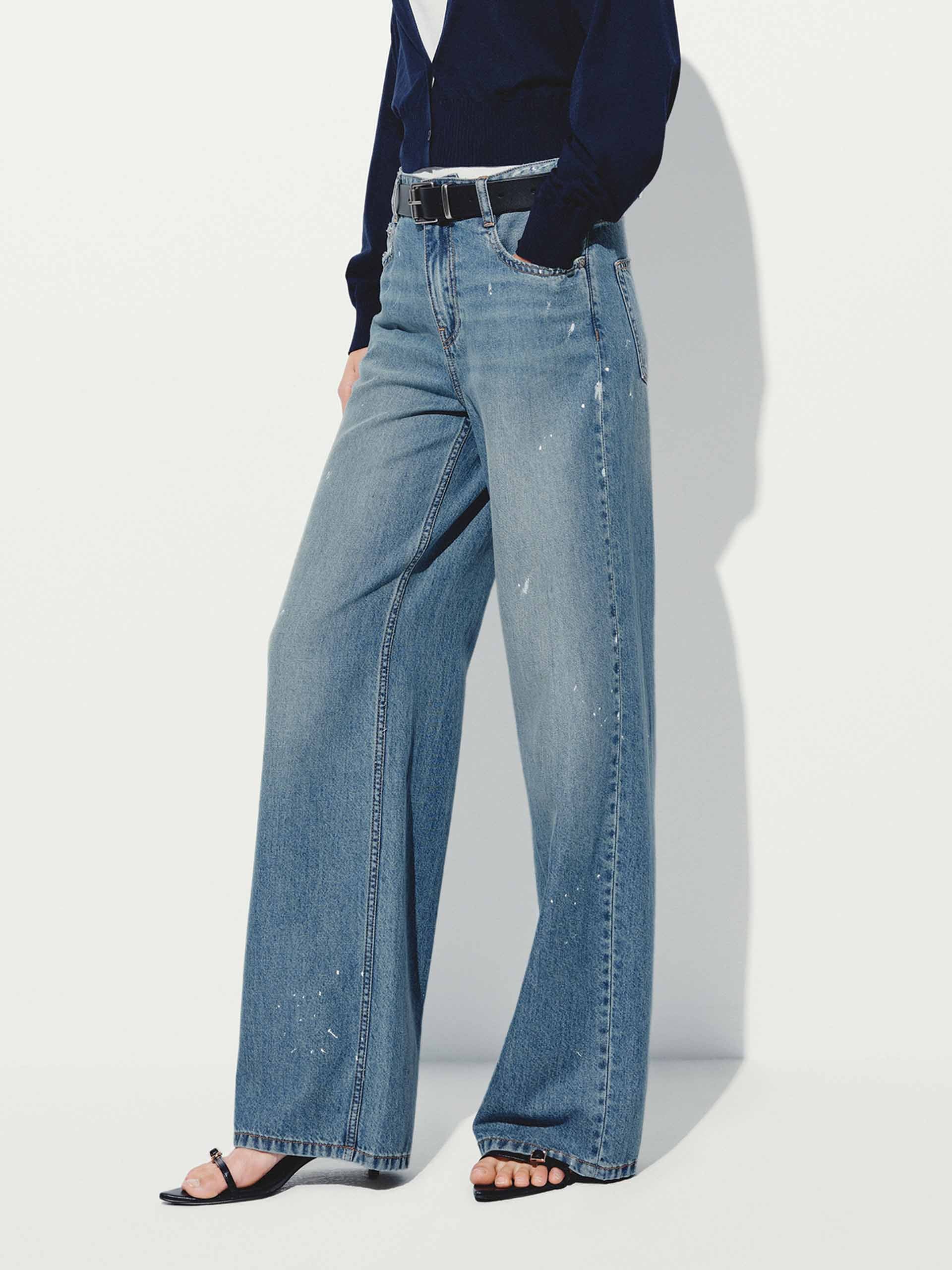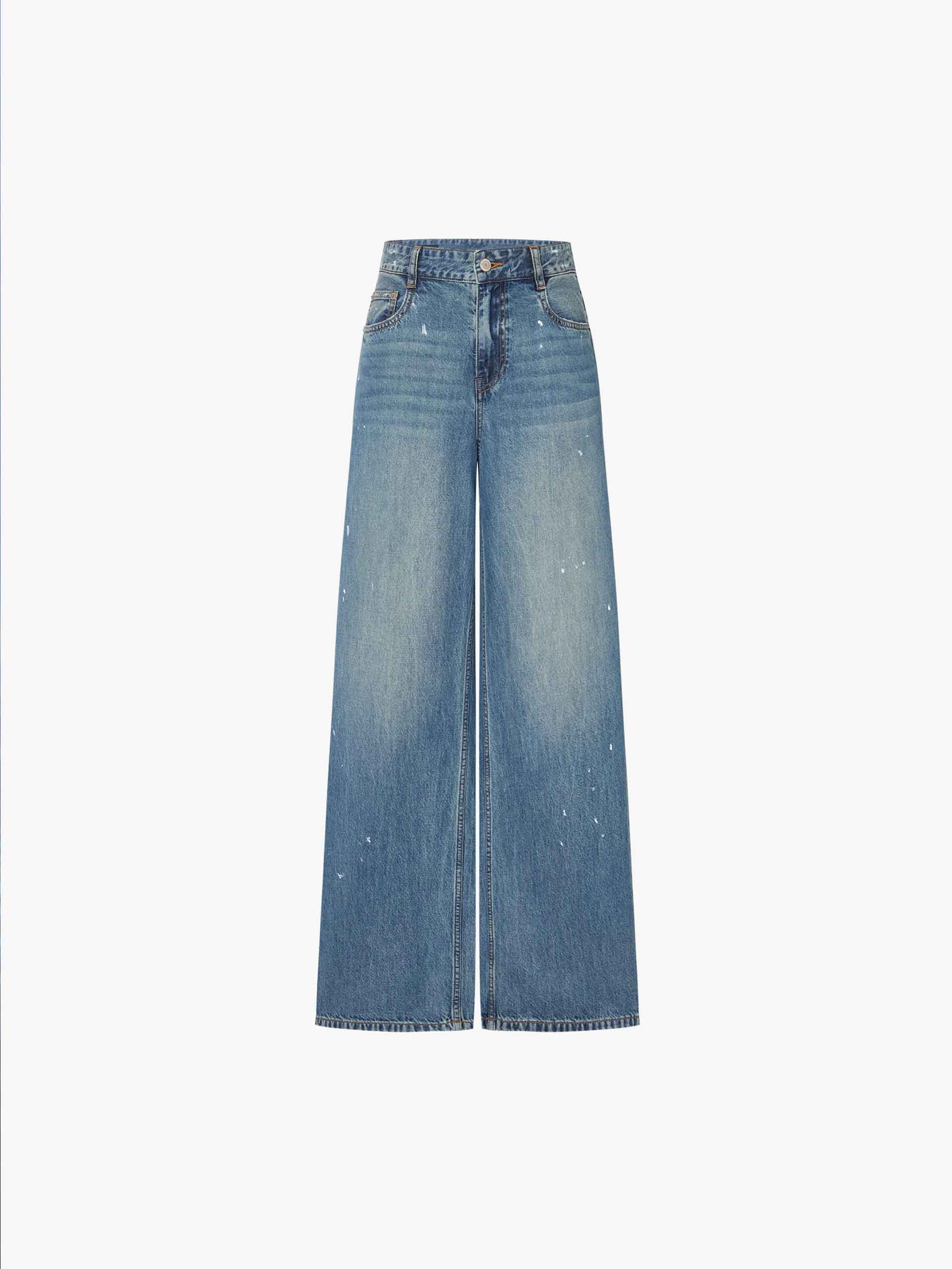 Introducing our wide-leg jeans - the perfect combination of fashion and comfort. Crafted with a stylish ink-splashed design, these straight pants feature a convenient zip and button closure and classic five pockets for added practicality.