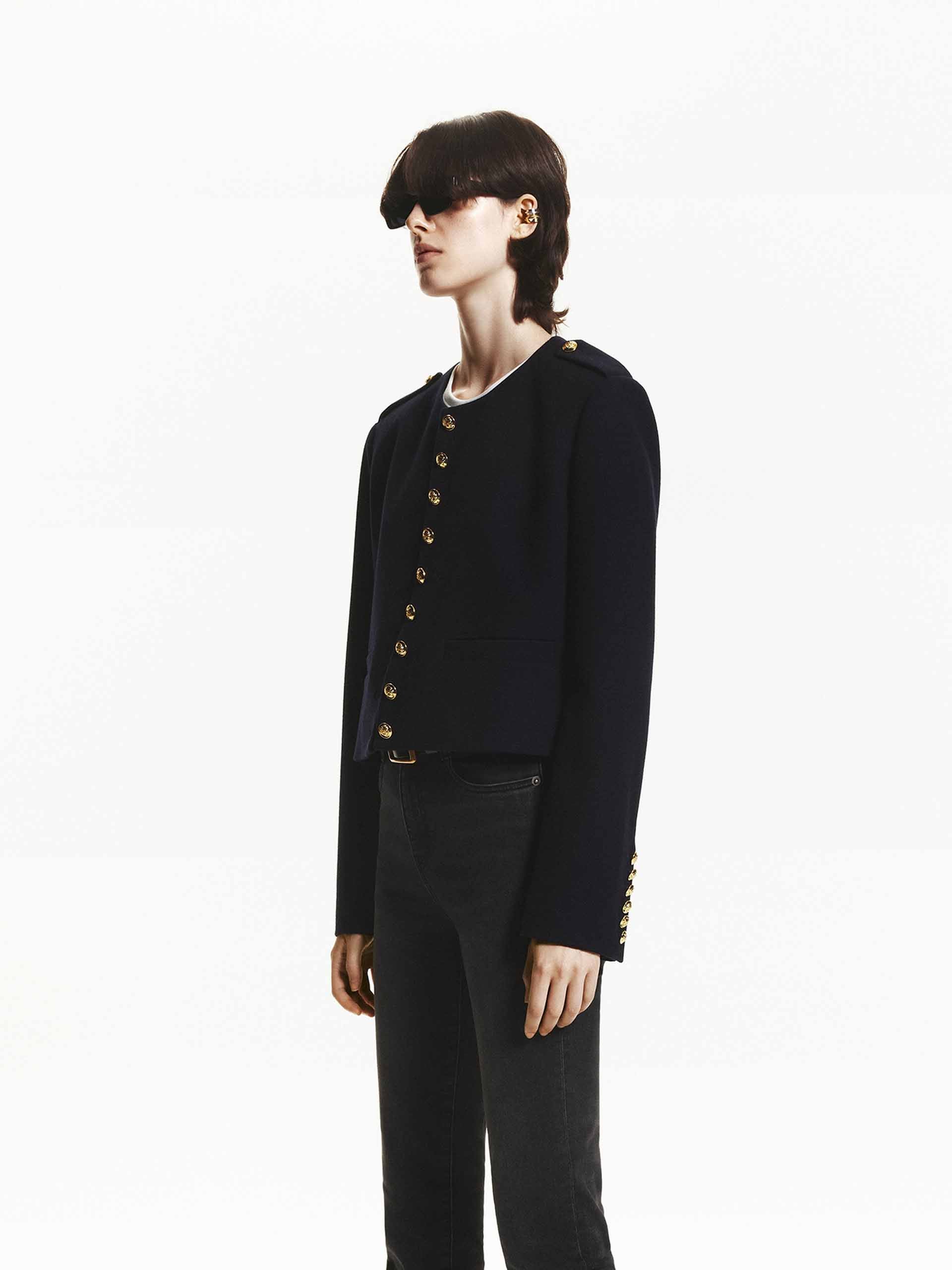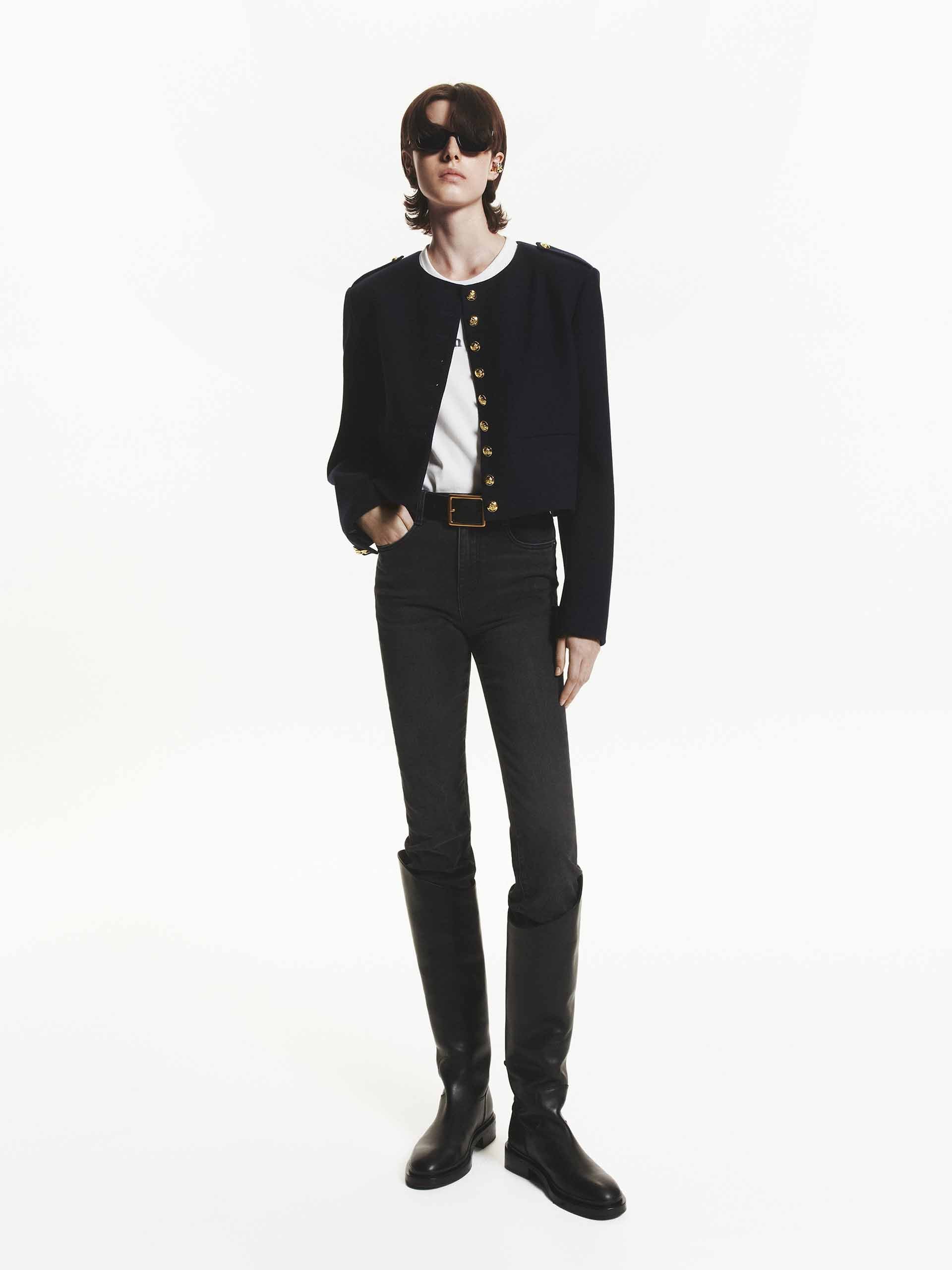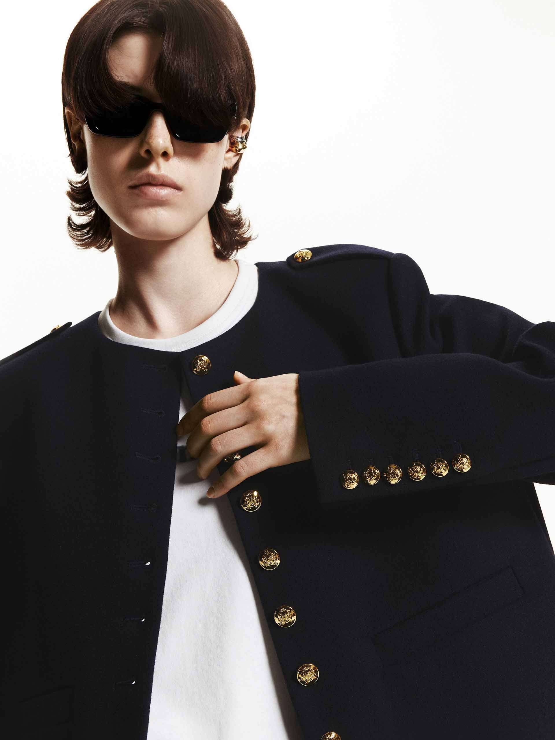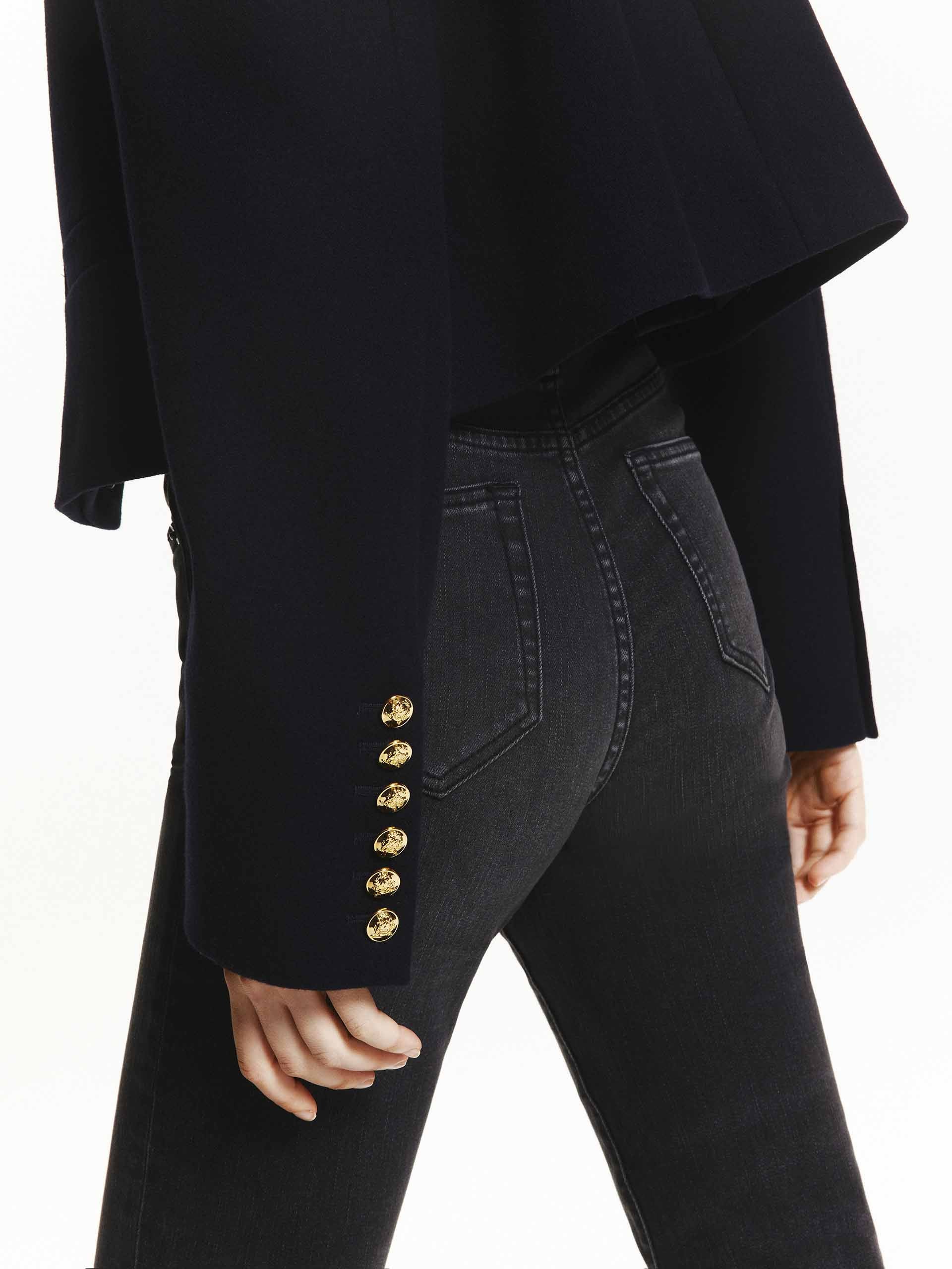 This coat is expertly crafted from premium Merino wool, offering a luxurious and warm fit. It has a cropped shape and padded shoulders provide a stylish and stiff silhouette. The satin lining makes it easy to layer over everything from turtlenecks to T-shirts.