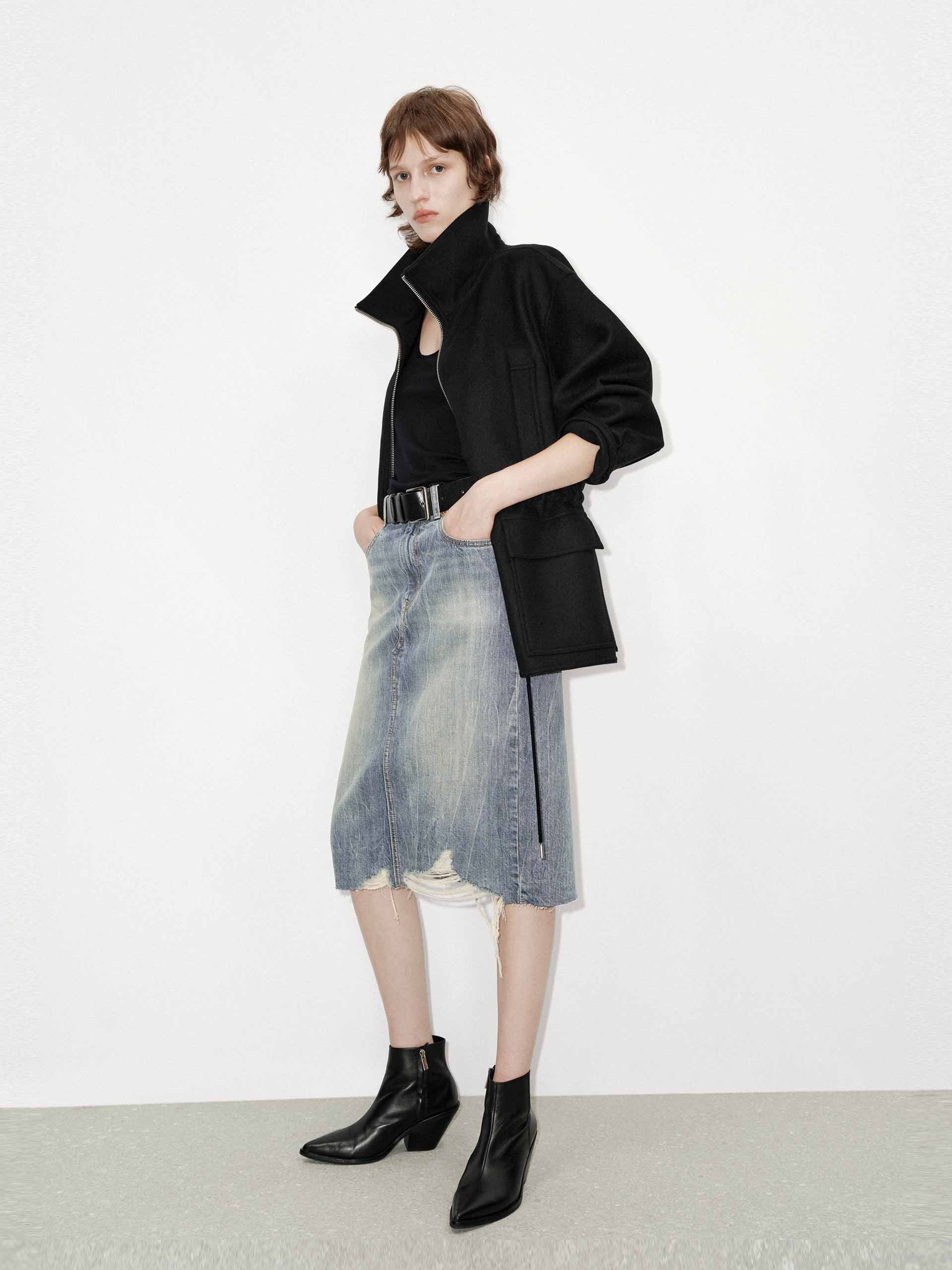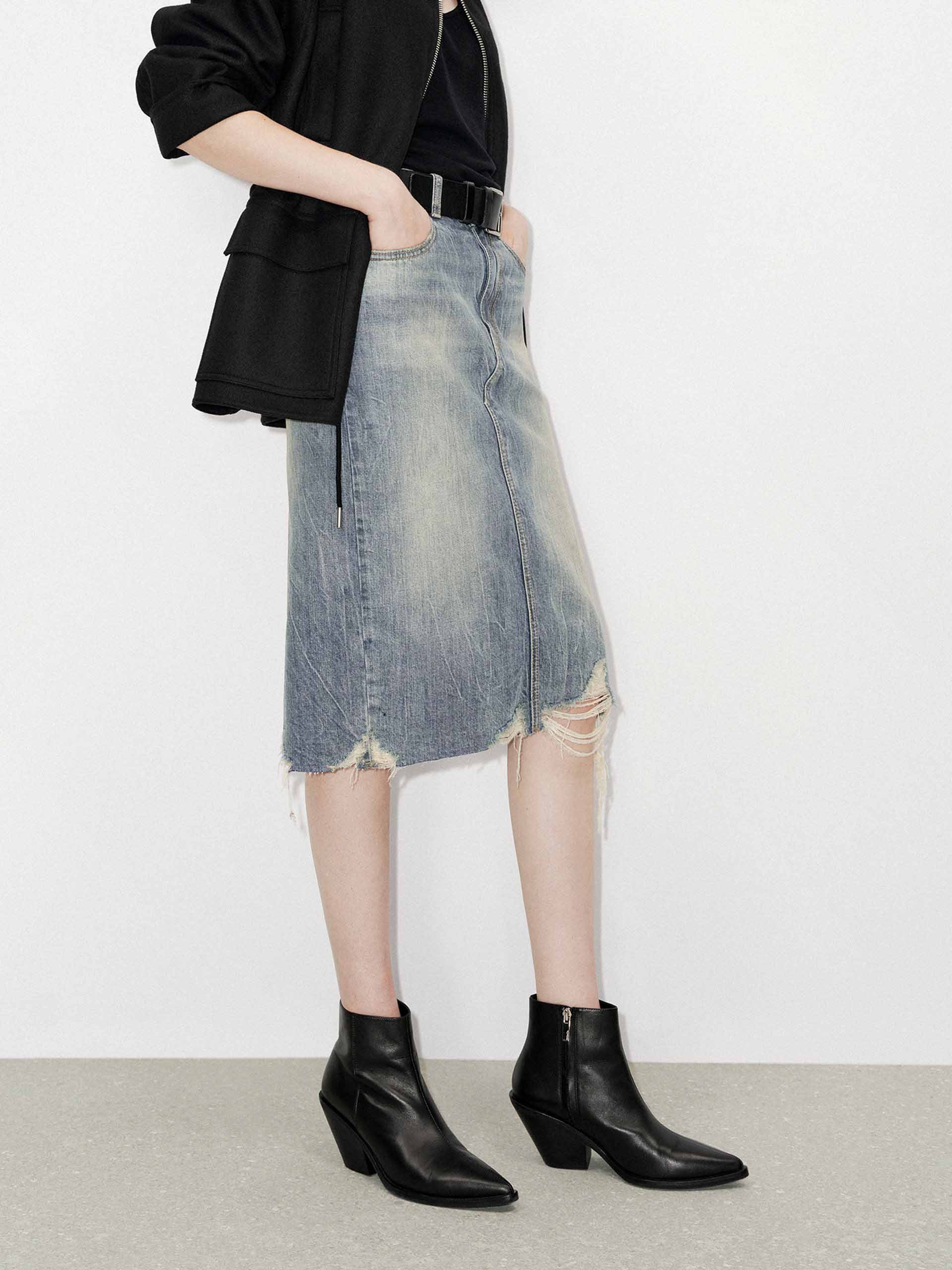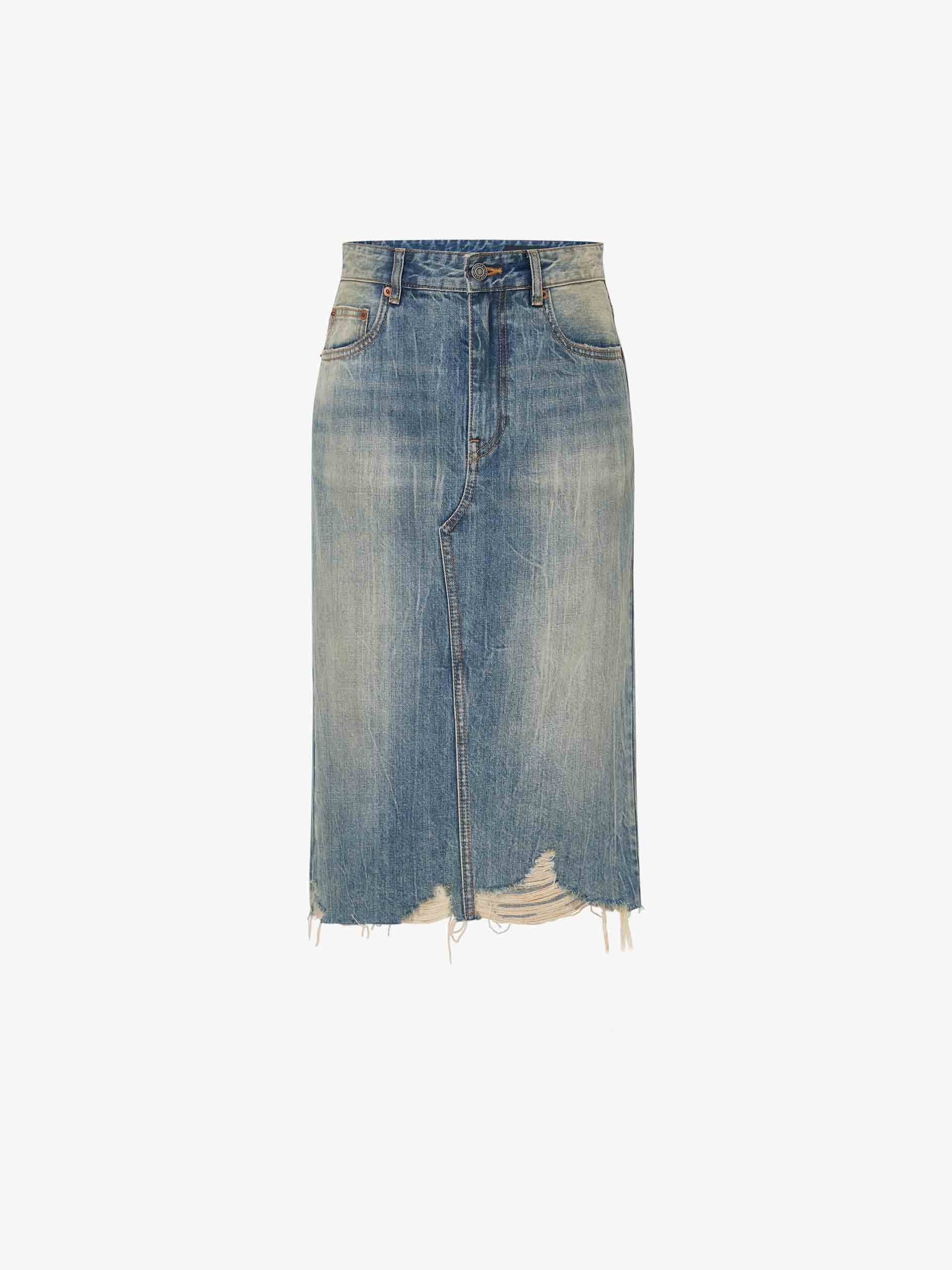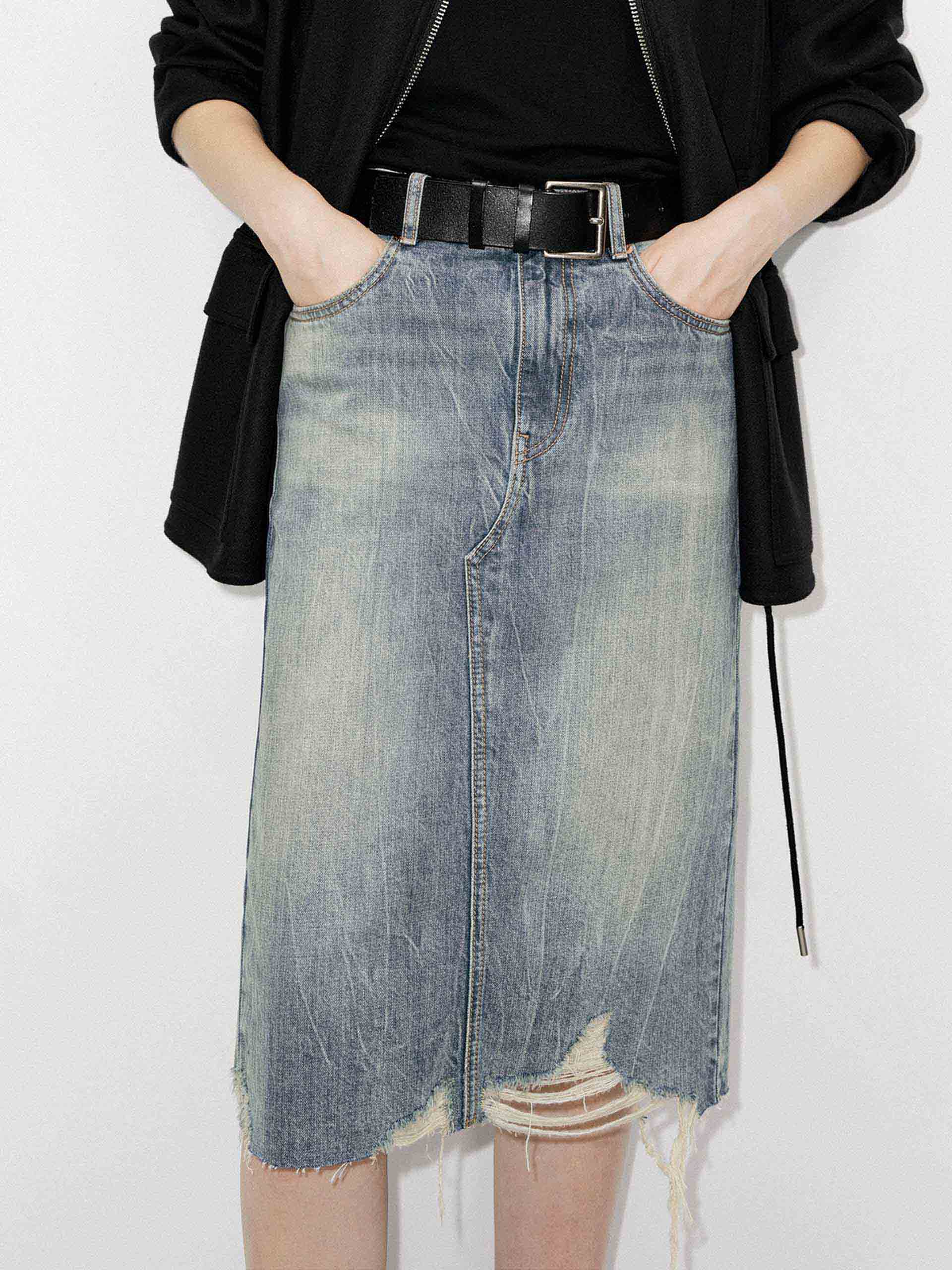 This skirt is crafted from a durable blend of denim and cotton, Its straight silhouette creates a sleek and modern look. The ripped hem gives the skirt a ripped, worn look that adds character and texture, while the back slit adds a touch of sophistication and makes the skirt even more comfortable to wear.