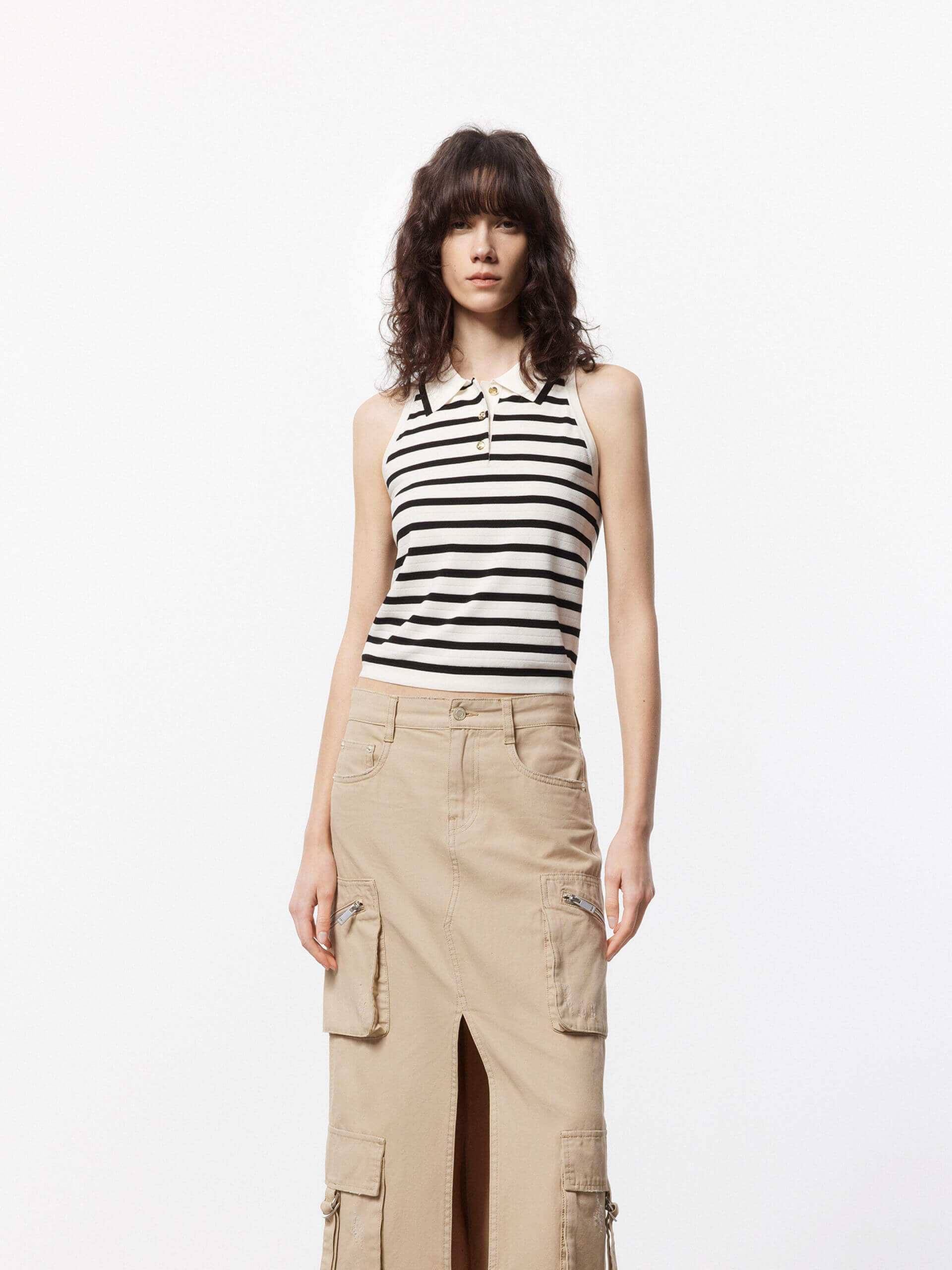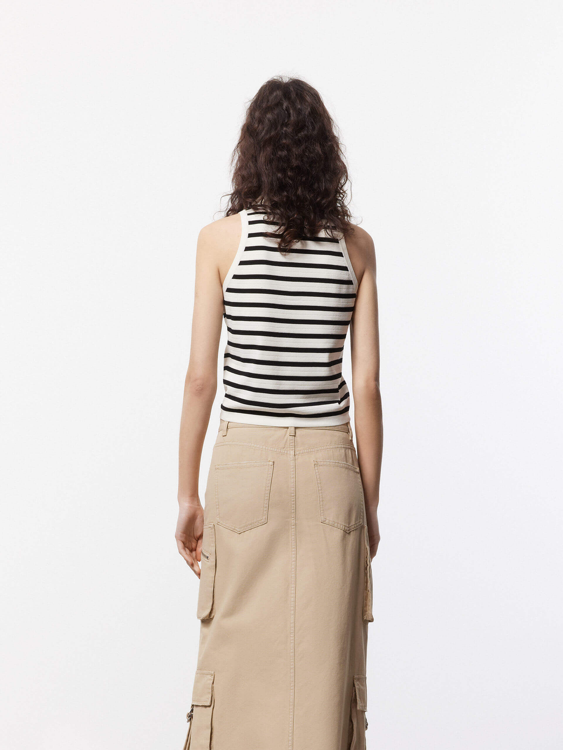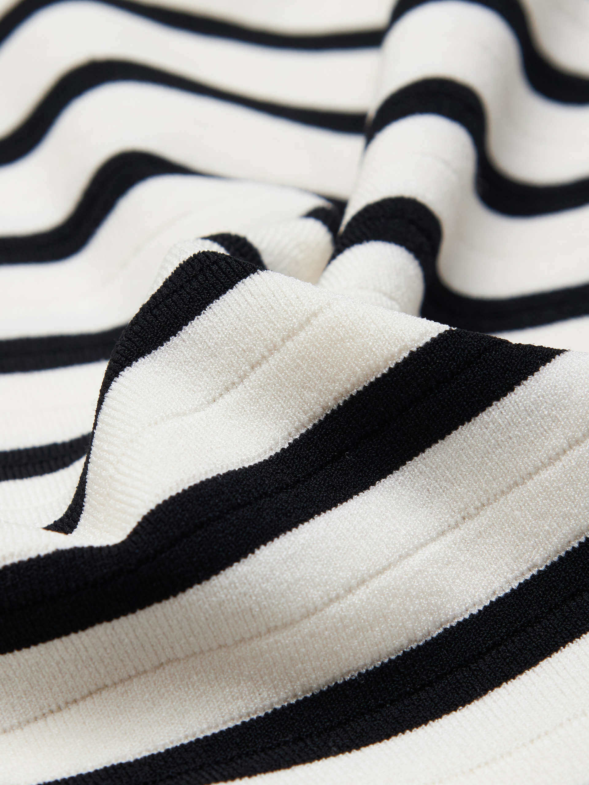 This knit top features a comfortable and stretchy fabric, classic black and white stripes, and a fitted silhouette. Pair it with our cargo skirt for a timeless, chic look that exudes sophistication.