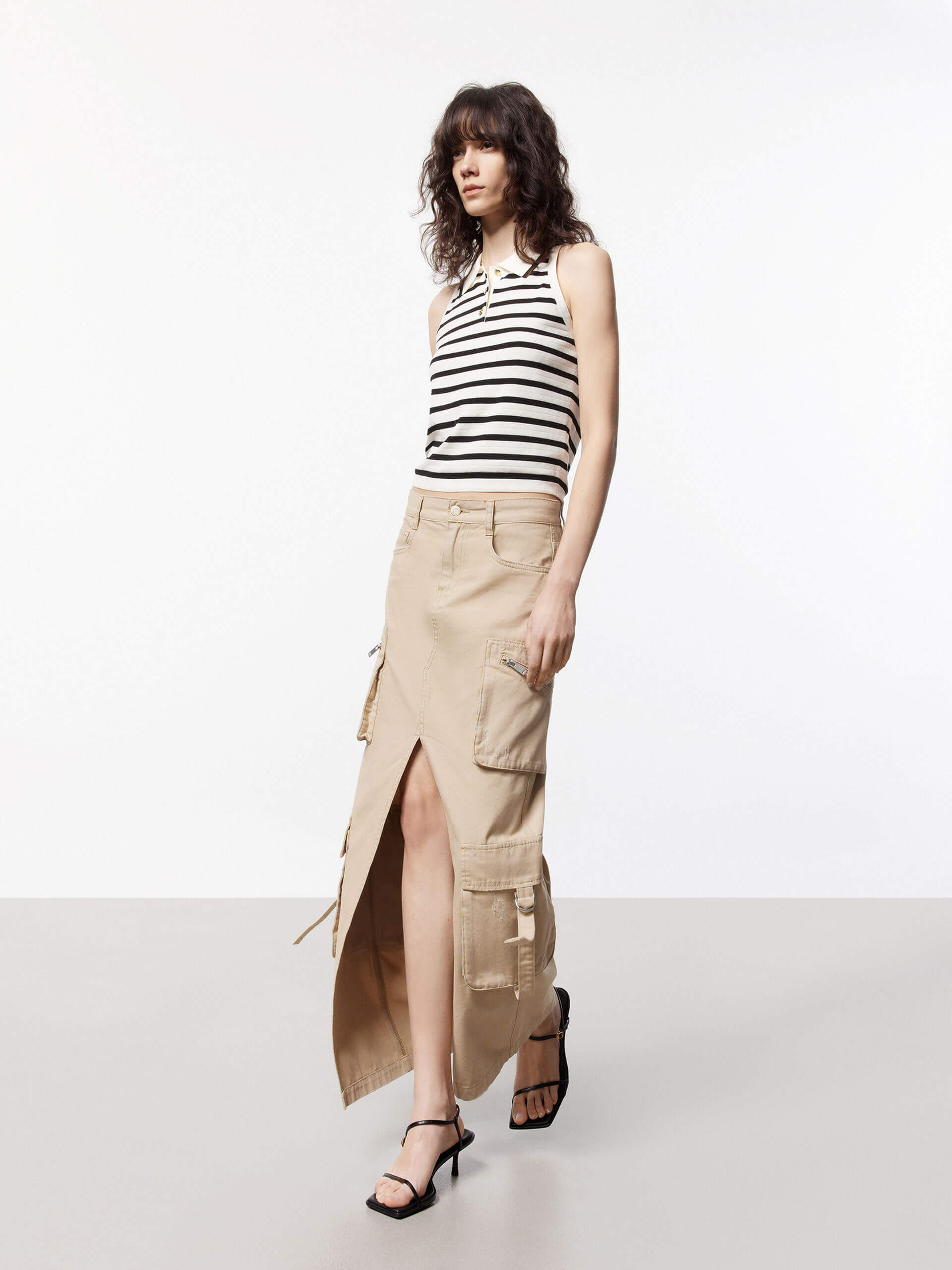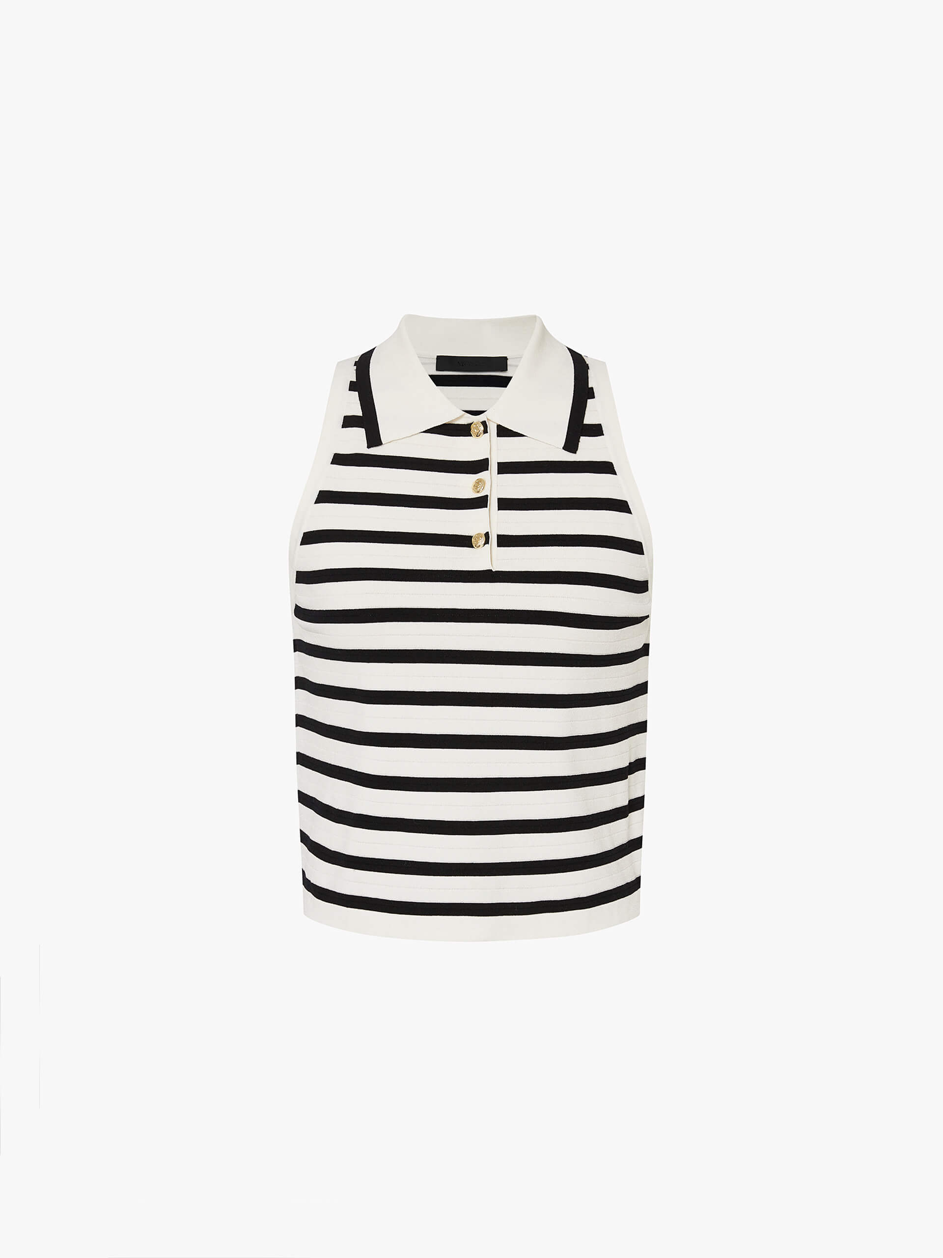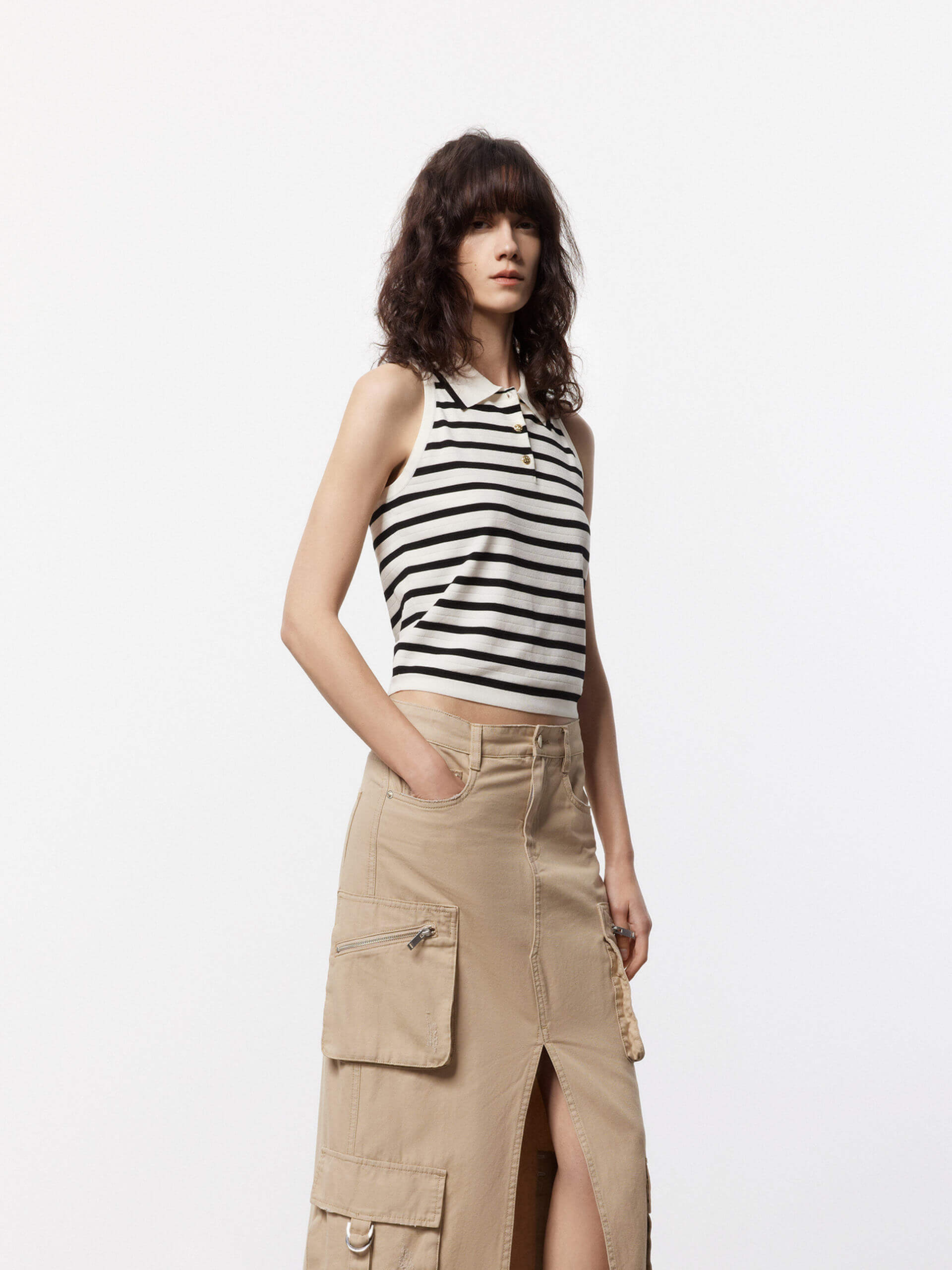 This knit top features a comfortable and stretchy fabric, classic black and white stripes, and a fitted silhouette. Pair it with our cargo skirt for a timeless, chic look that exudes sophistication.