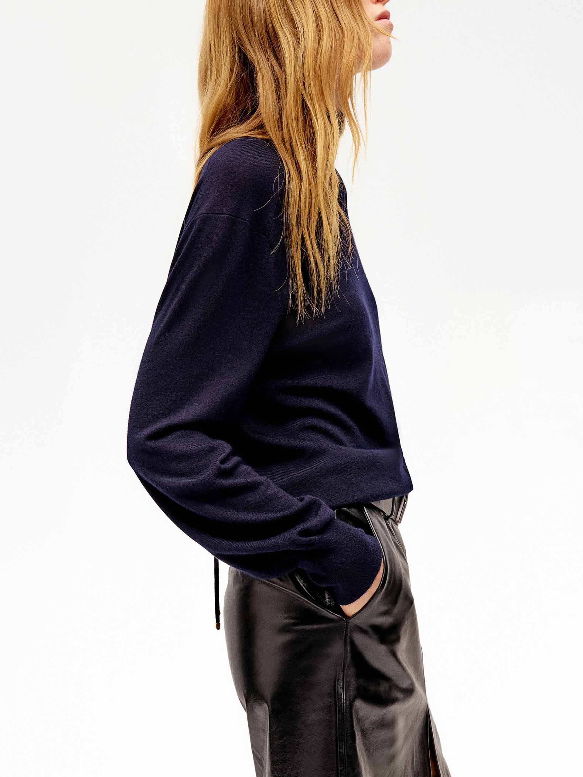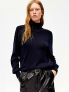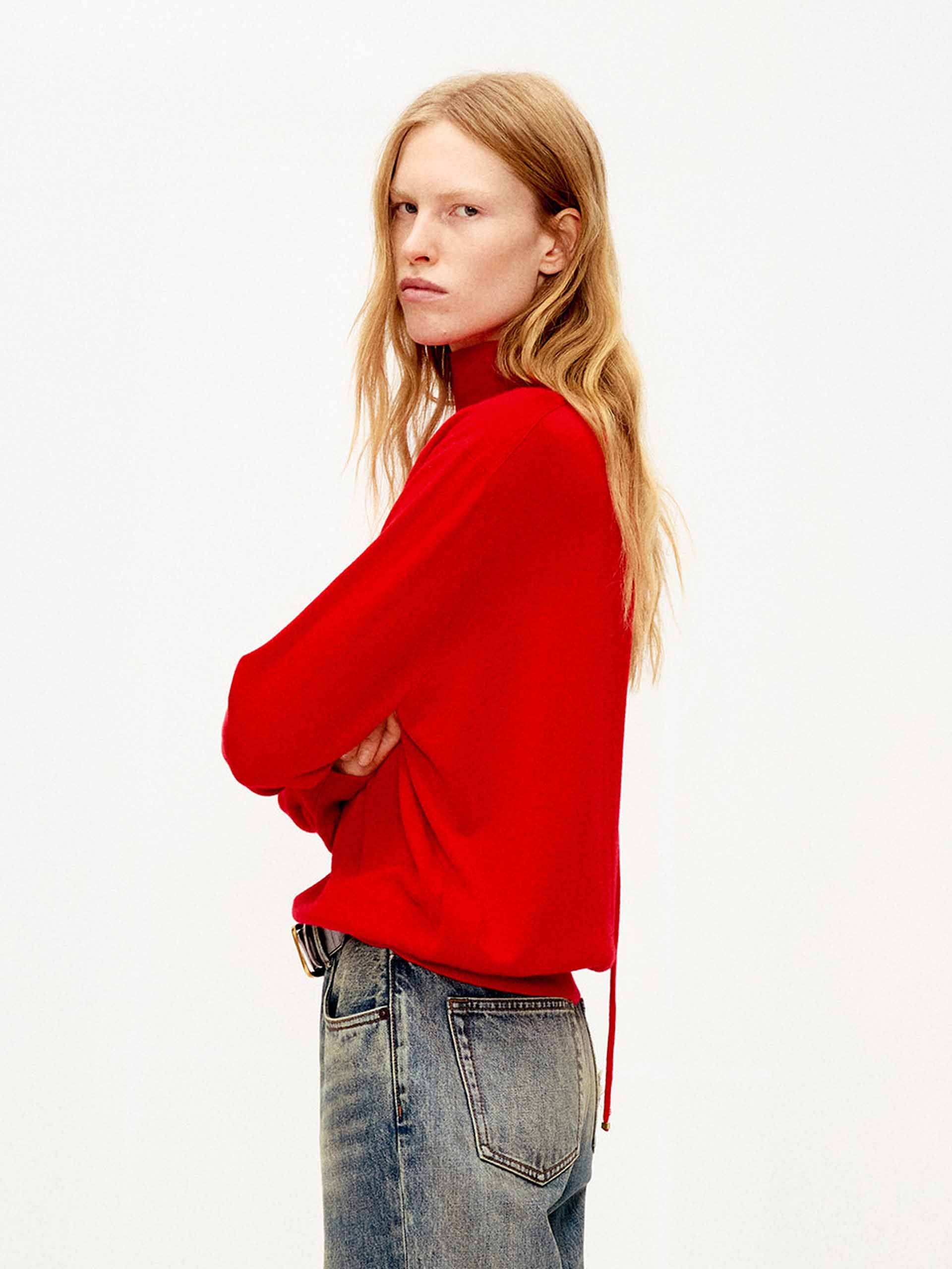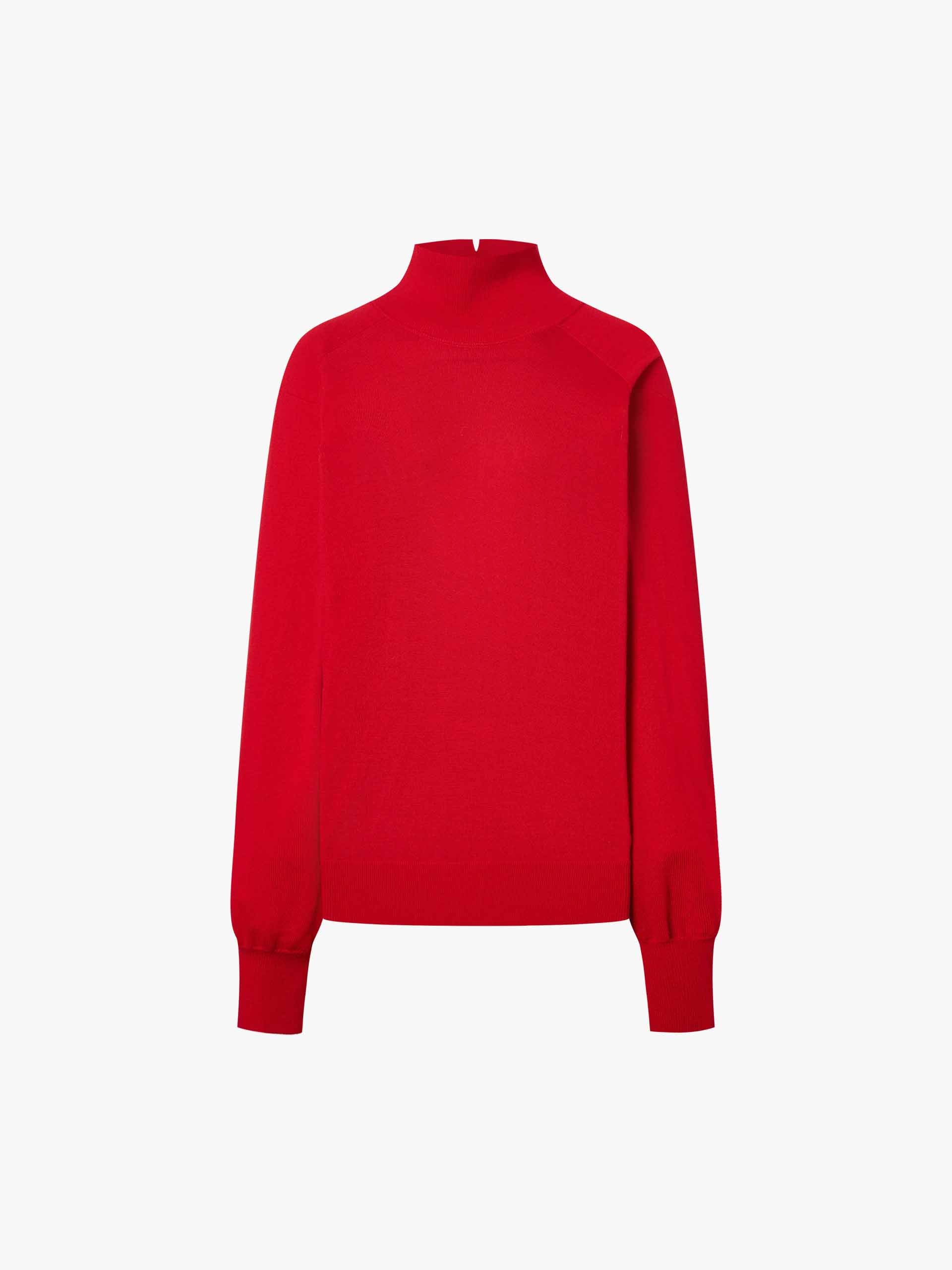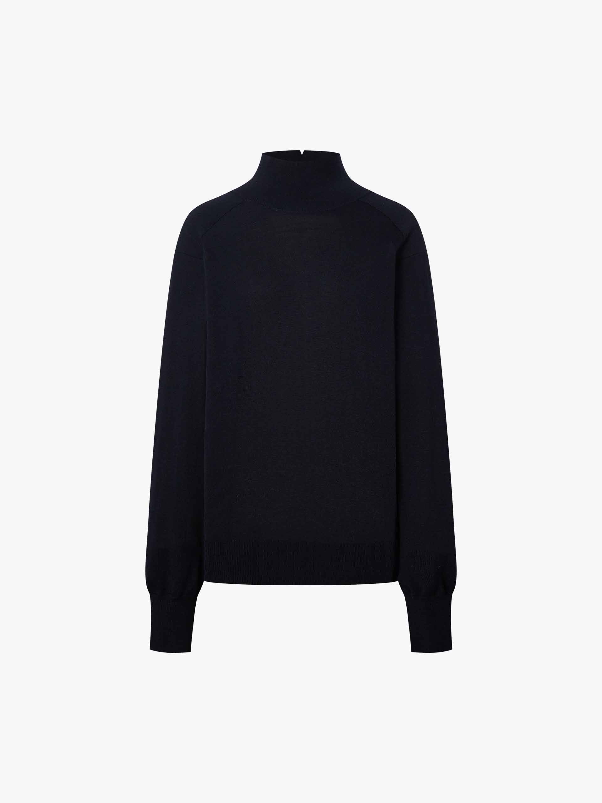 Experience luxurious comfort in this sweater, fashioned from an exquisite blend of wool, cashmere, and silk. Its classic regular fit and ribbed trims provide effortless style, while the sophisticated turtleneck is complemented by a distinctive tie-detailed keyhole cutout at the back. This piece masterfully balances sumptuous texture with a modern, elegant silhouette.