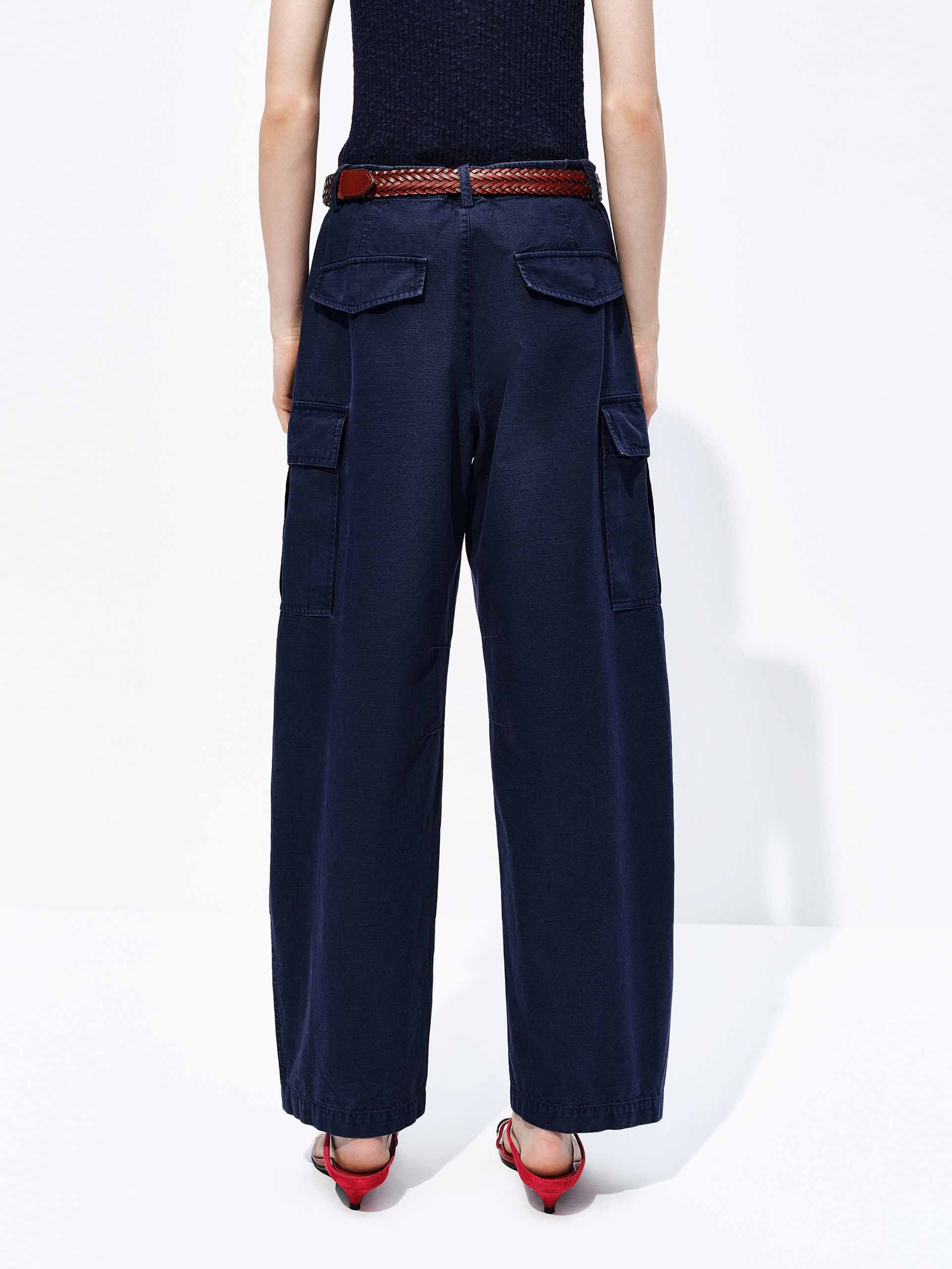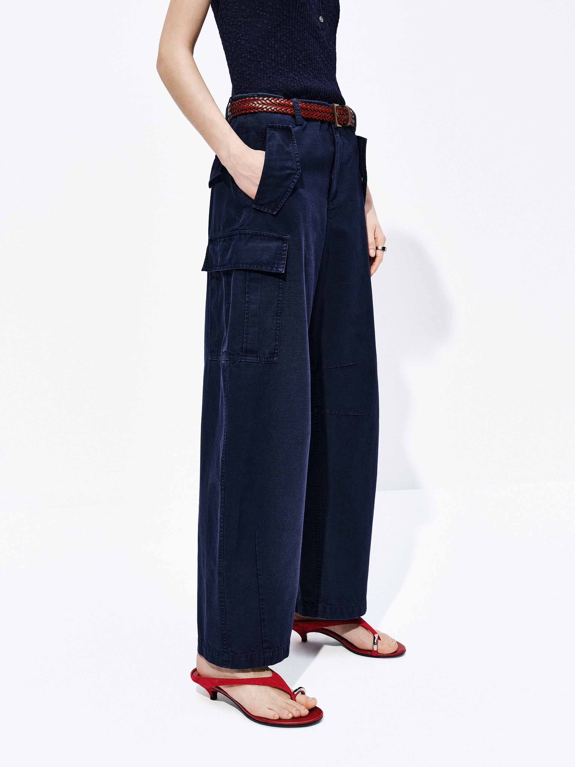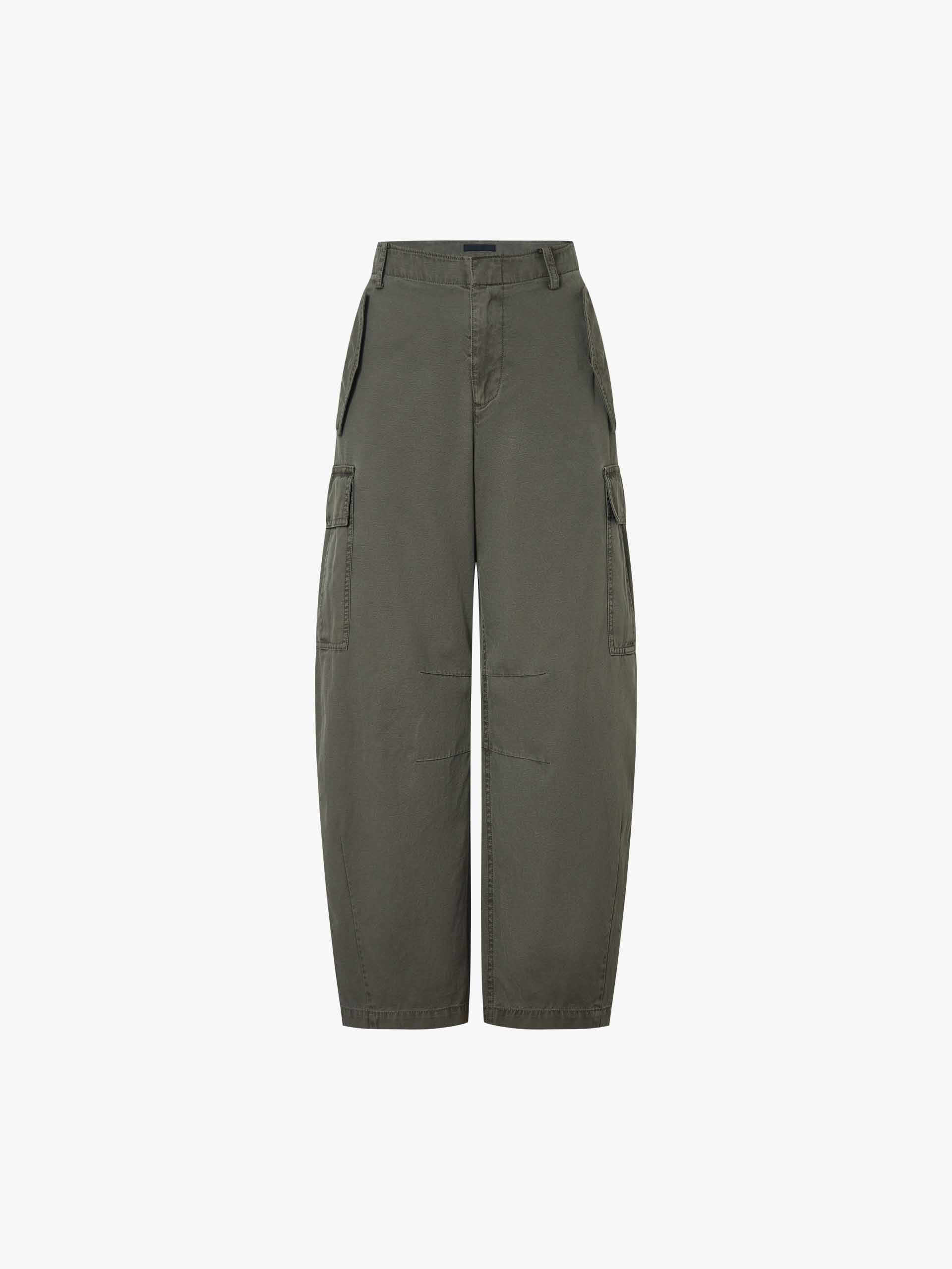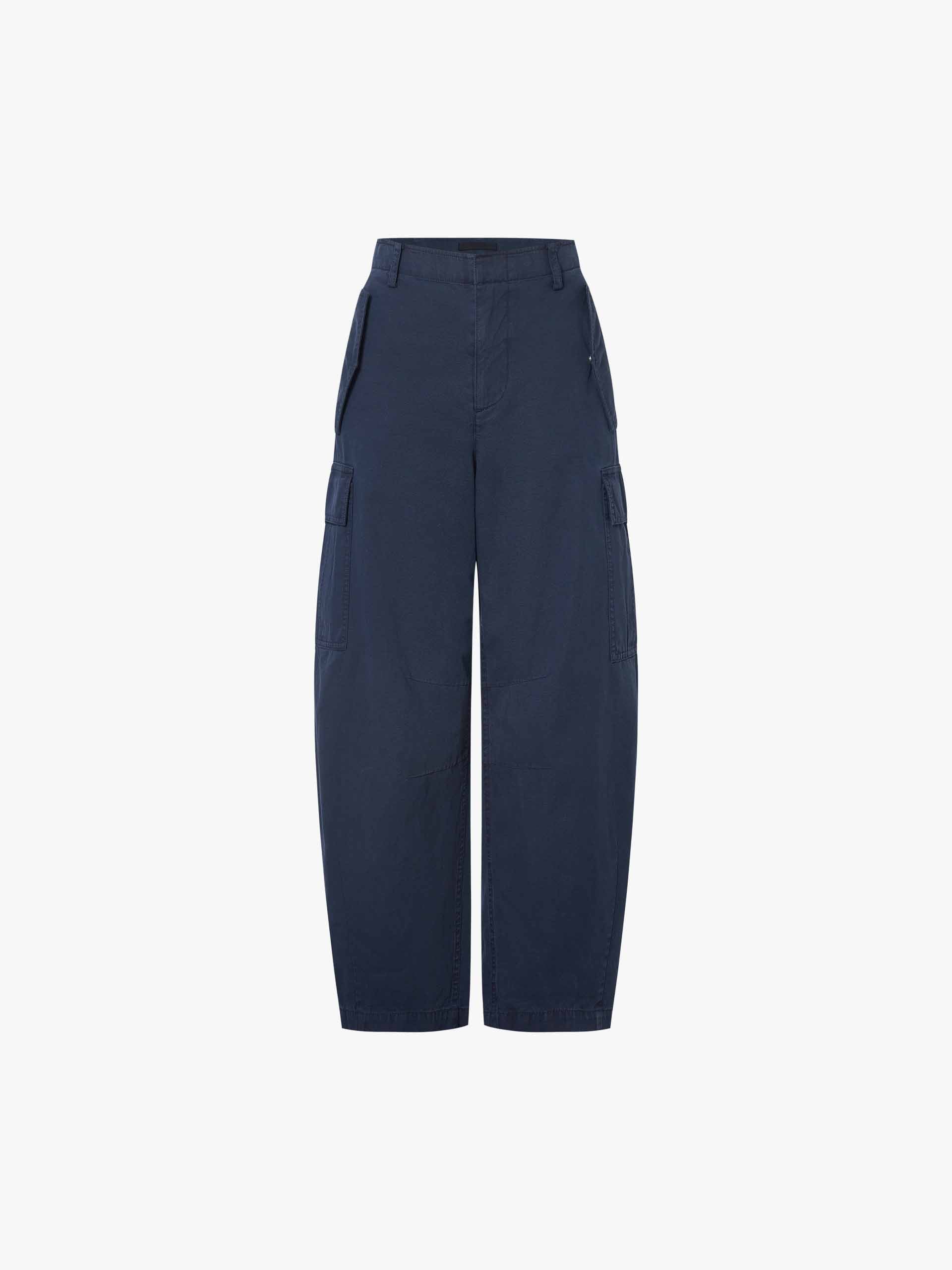 A cargo-style trouser redefined through a curved lens. Cut from pure cotton, the silhouette follows an arched seam line — curved through the leg for movement and volume, then cropped to a clean ankle length.