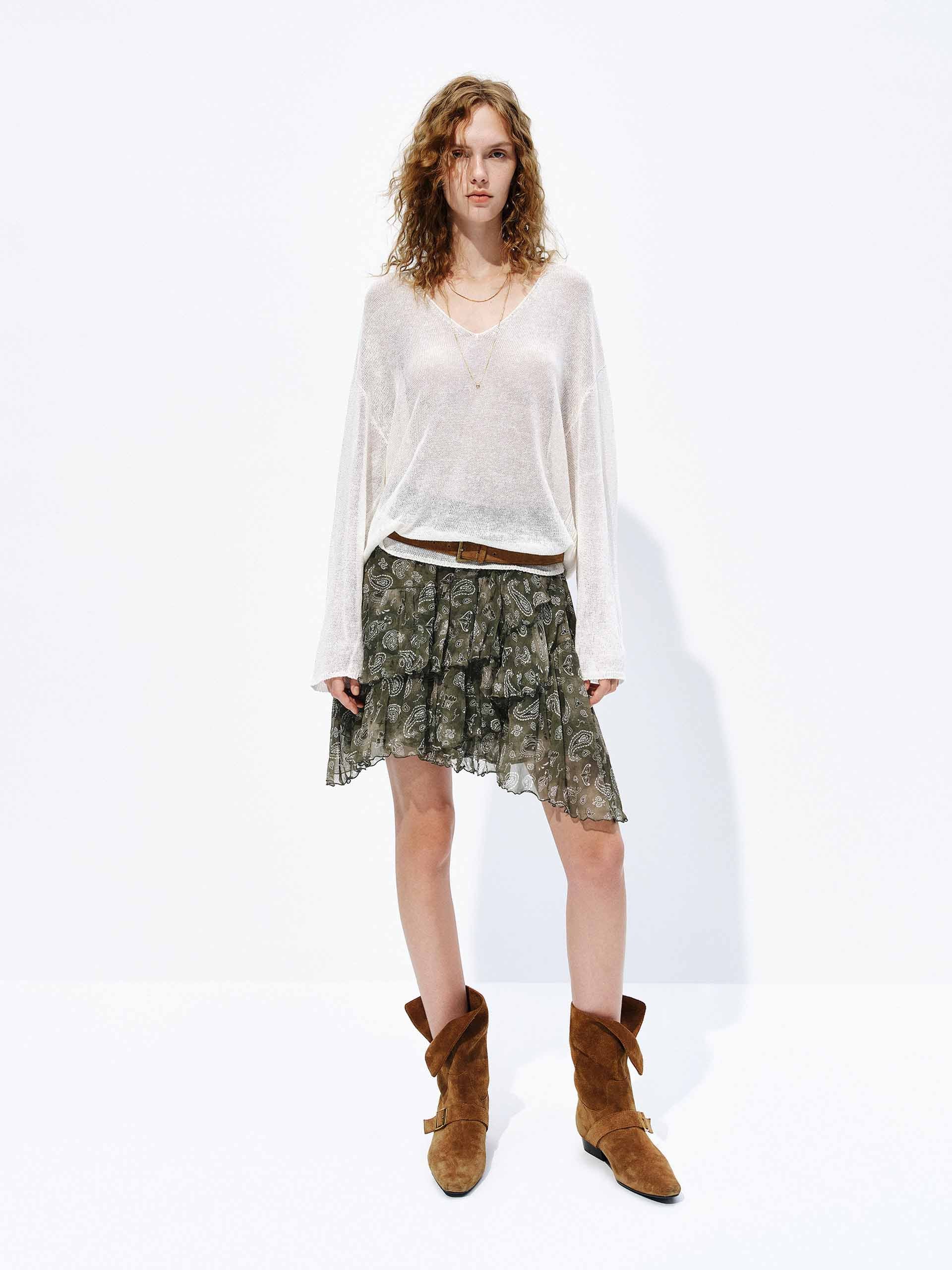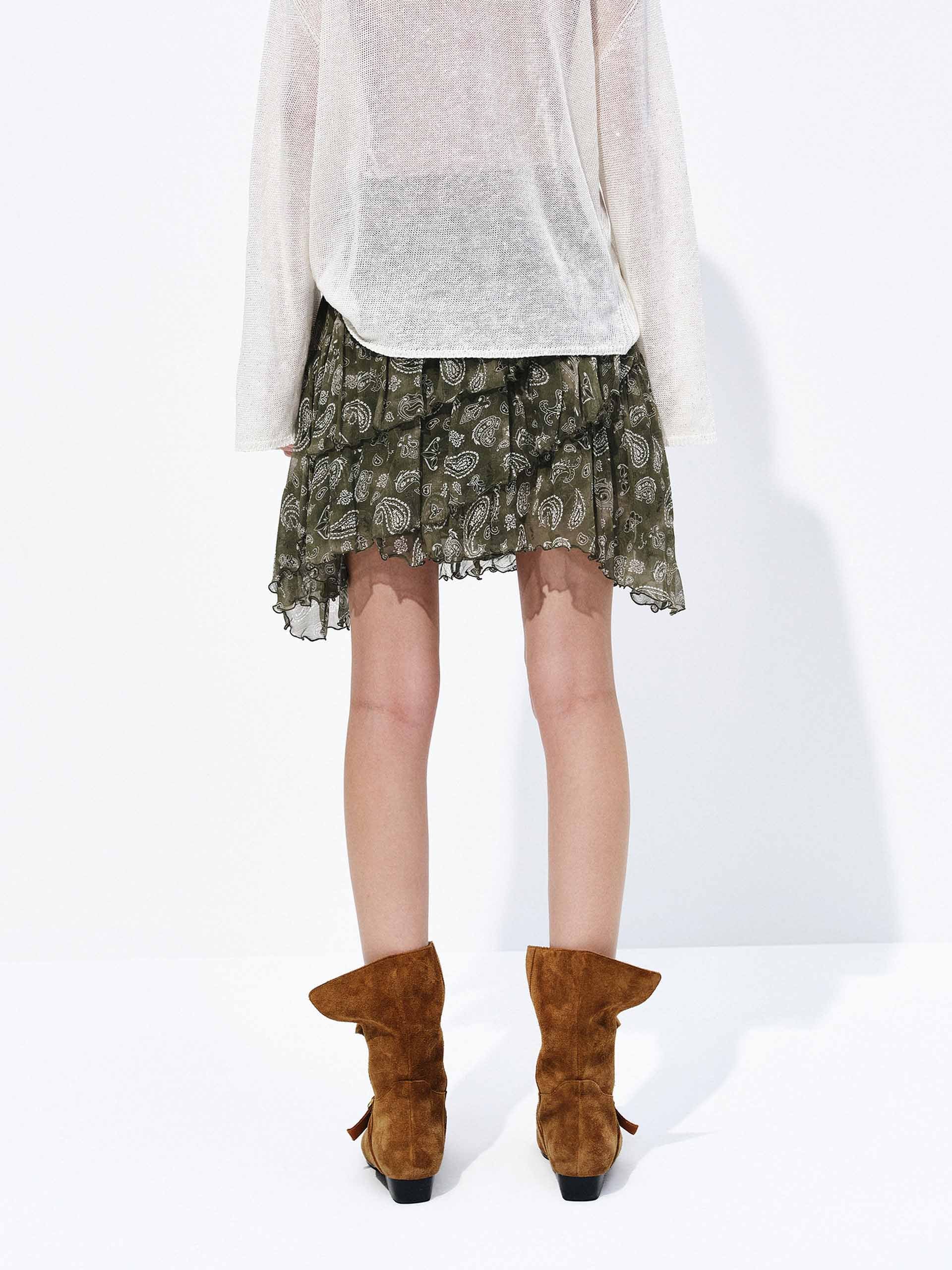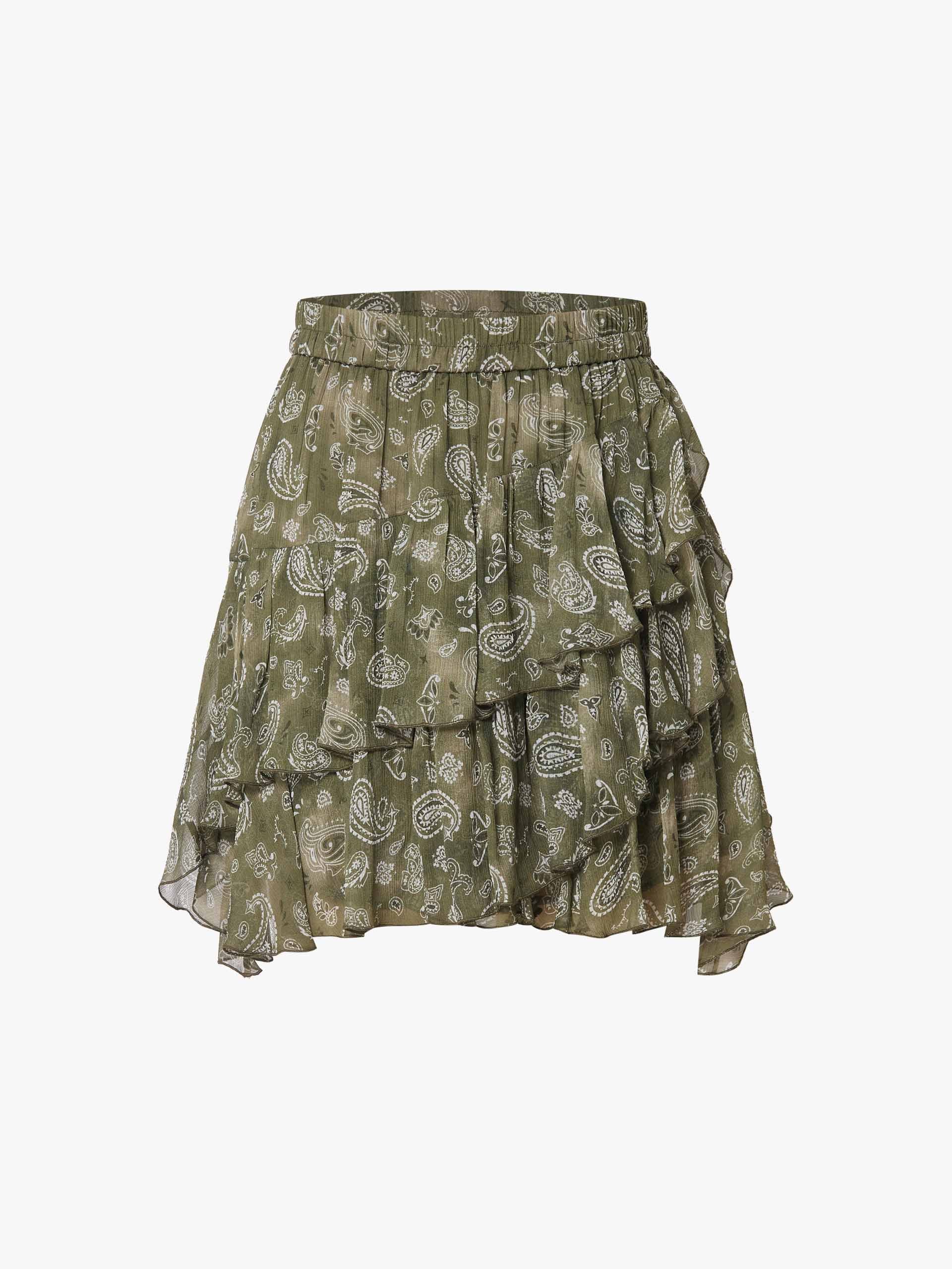This mini skirt is defined by its asymmetric hem and cascading ruffles, creating gentle movement with every step. Crafted from lightweight chiffon, the design features an all-over paisley motif in a muted green hue. The elasticated waistband ensures a comfortable, secure fit throughout the day.