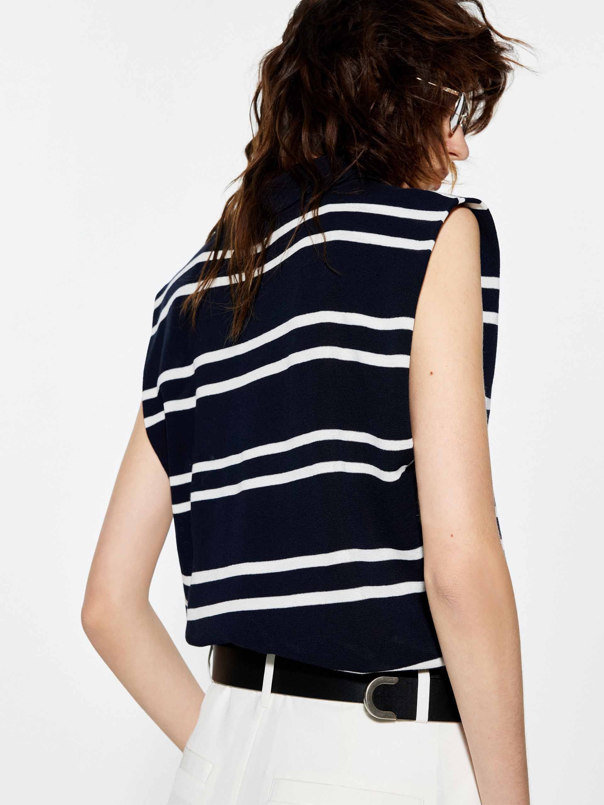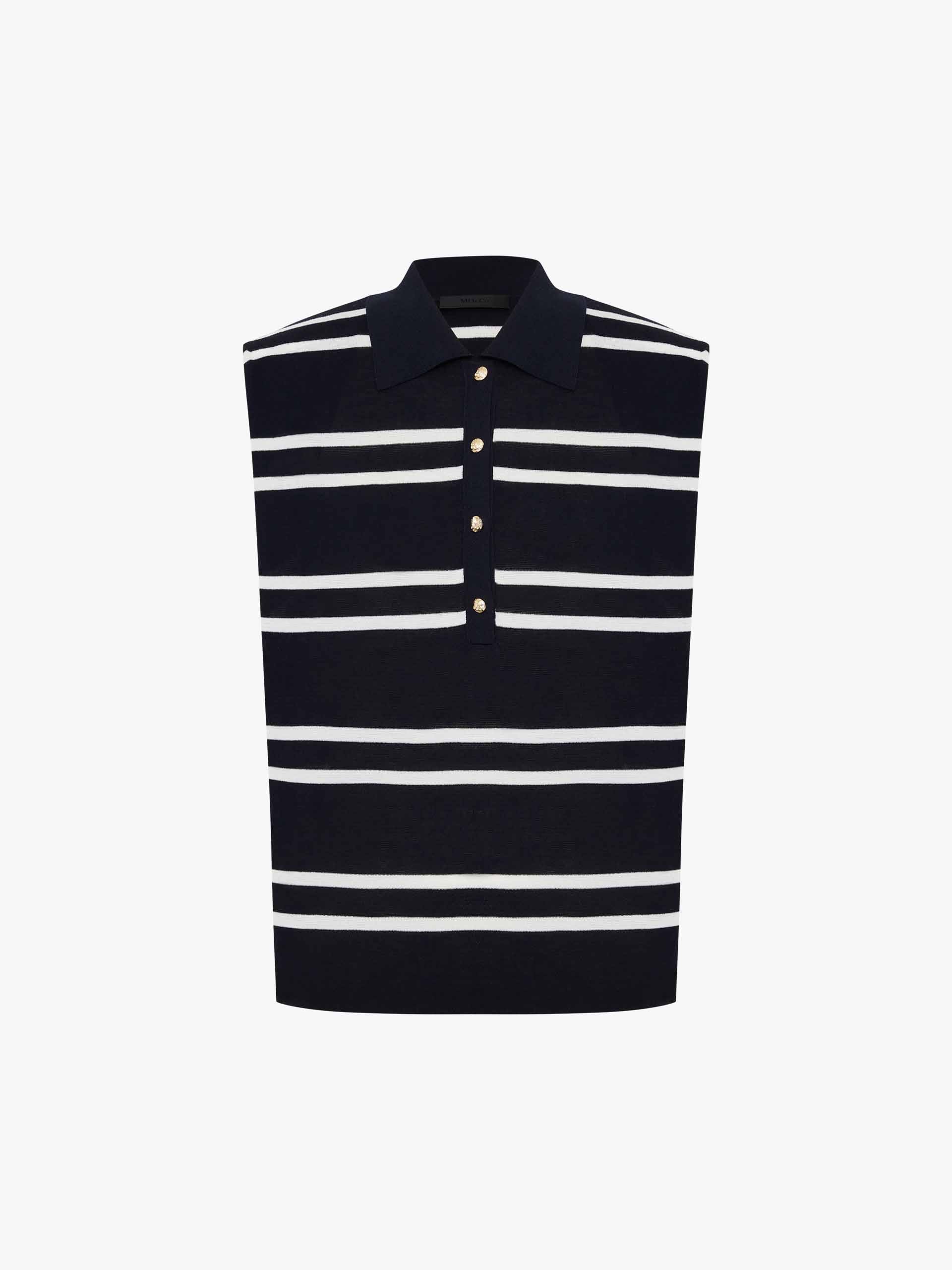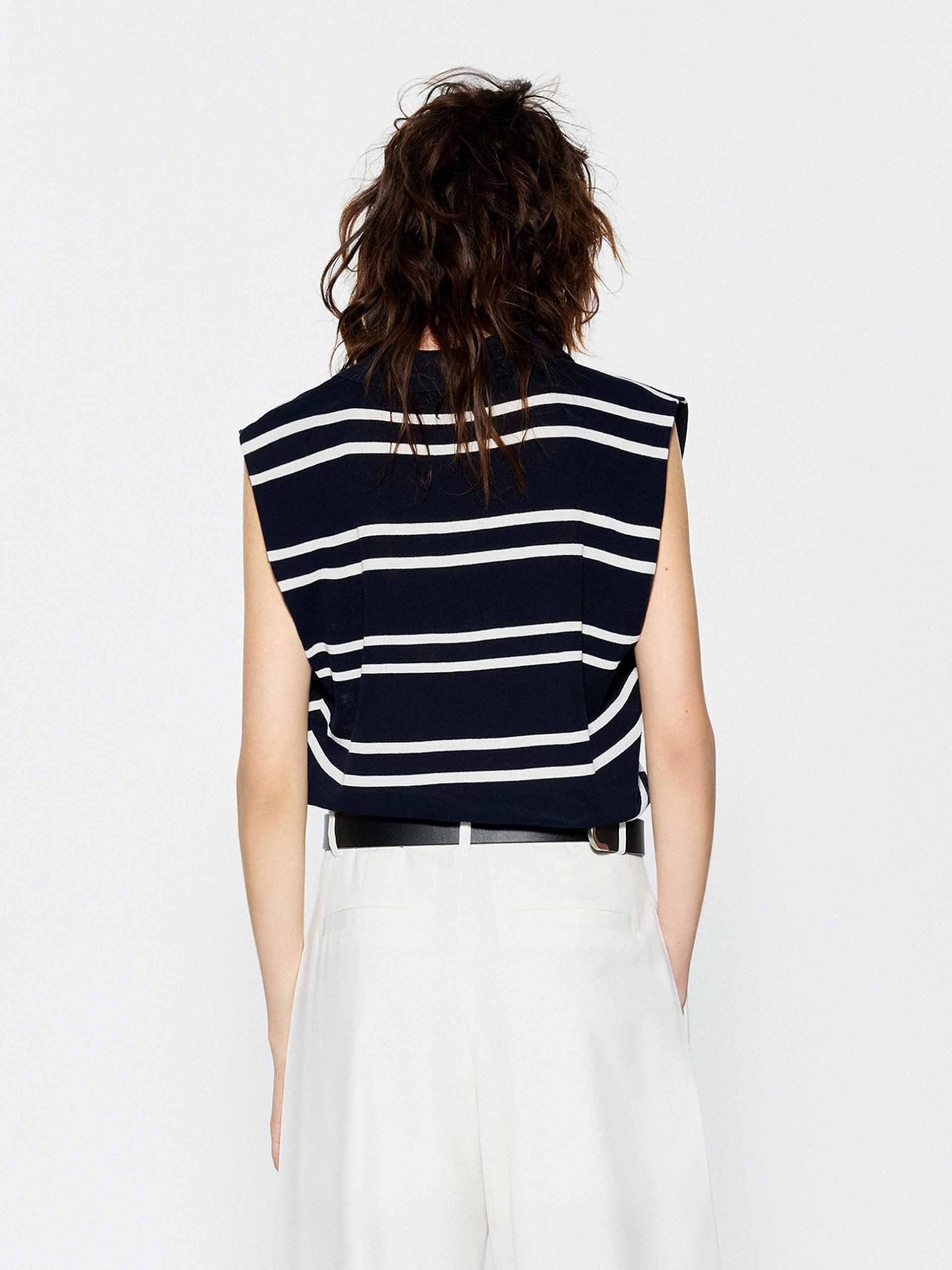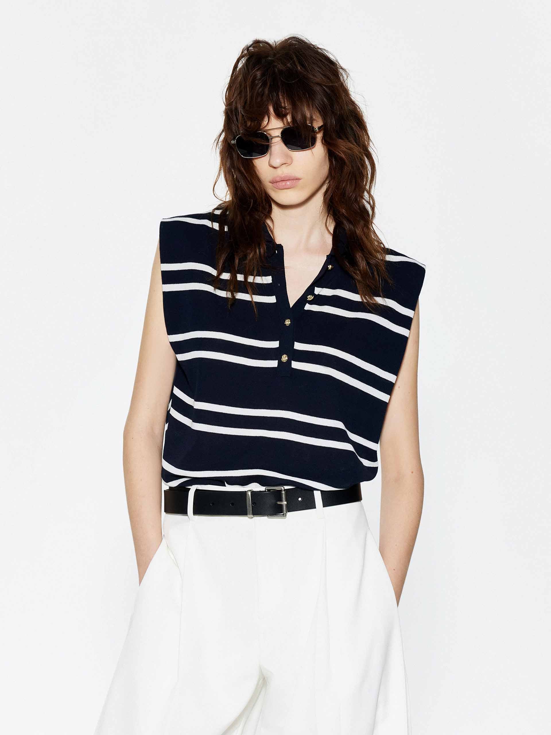Stay effortlessly stylish with this timeless knitted top. The sleeveless design and flattering V-neck keep it fresh and airy—perfect for warm-weather layering. Featuring a classic striped pattern and a chic half-button detail, this top adds a touch of understated elegance to any outfit. The lightweight knitted fabric ensures breathability and ease of movement, making it ideal for both casual and semi-casual occasions.