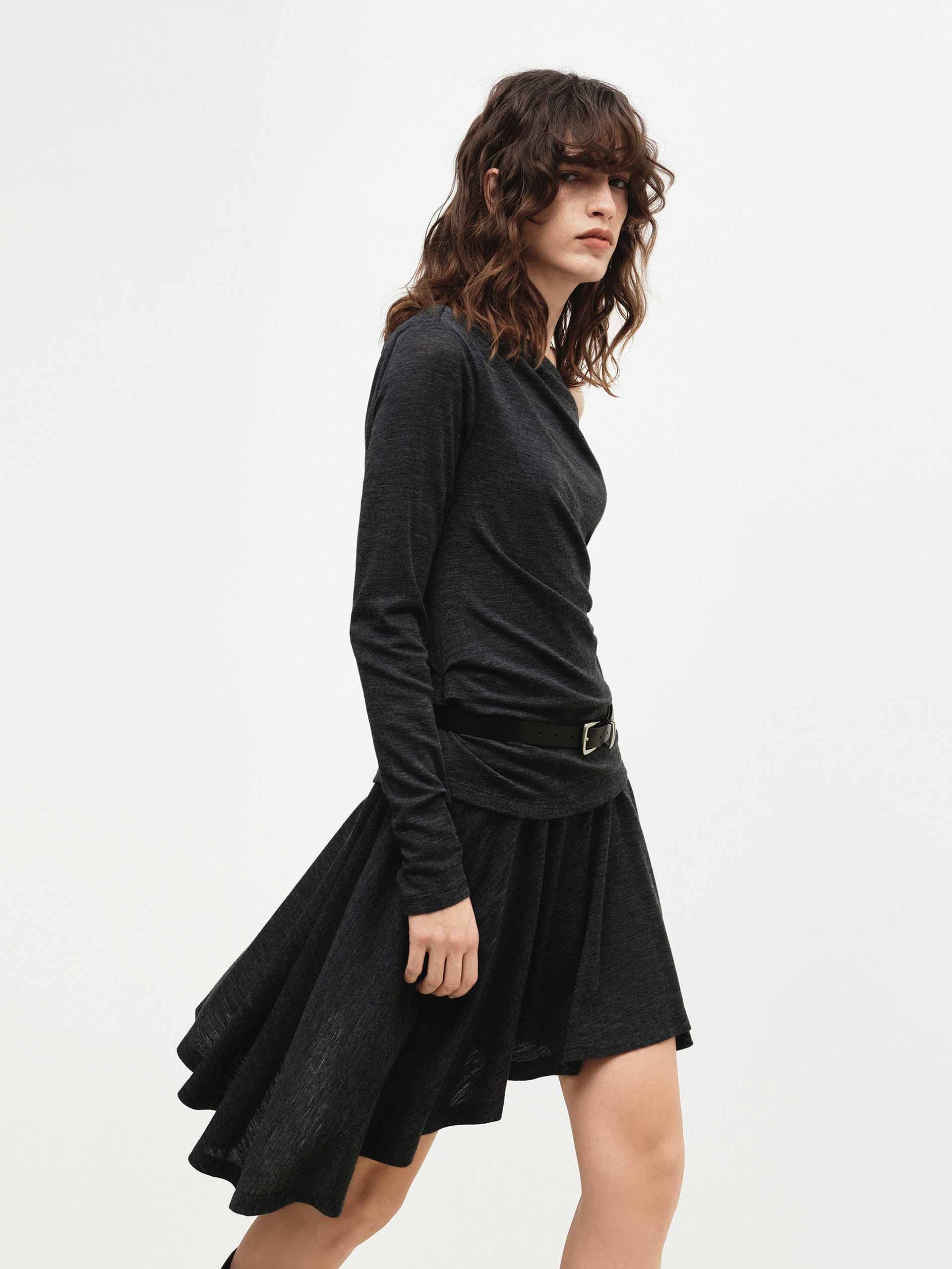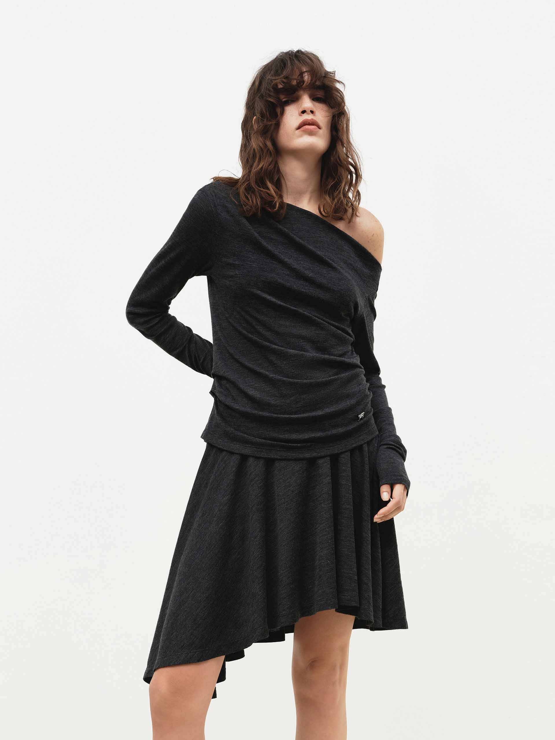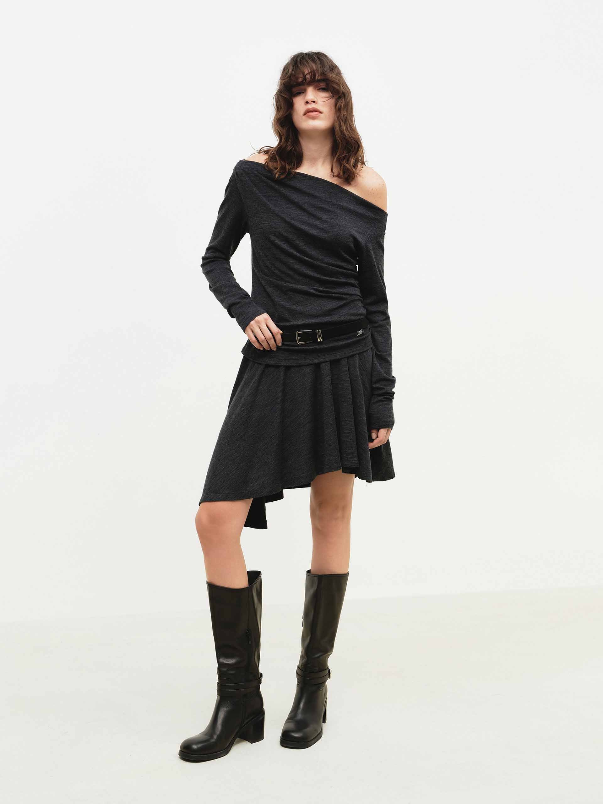 The dress exudes modern femininity with its chic silhouette, featuring a comfortable regular fit and a flirty mini length. The elegant off-shoulder neckline offers a graceful touch, while the playful irregular hem adds a contemporary and artistic edge. Crafted from a soft wool blend fabric, this dress drapes beautifully, combining effortless comfort with a distinctly stylish and romantic appeal for any occasion.