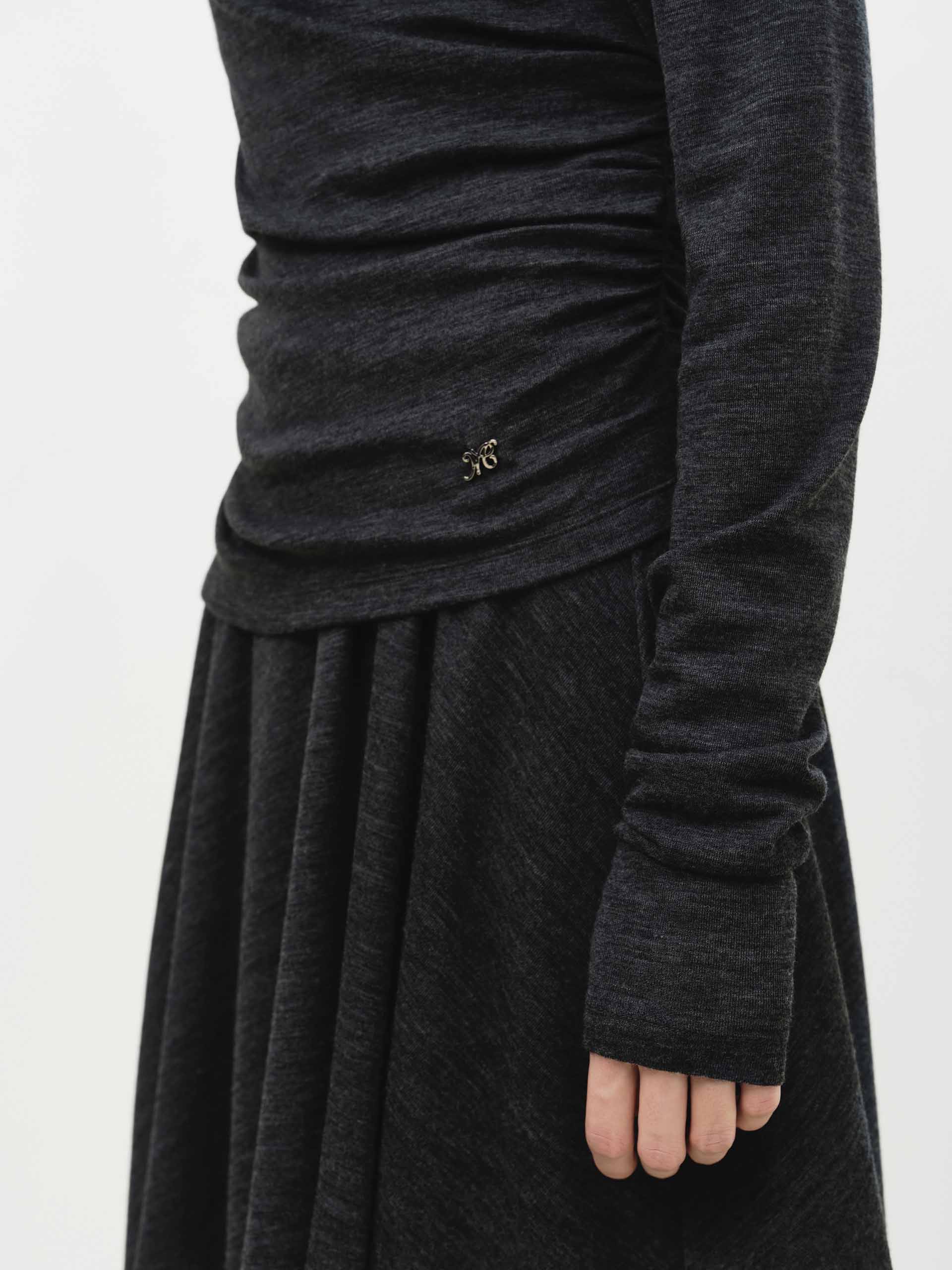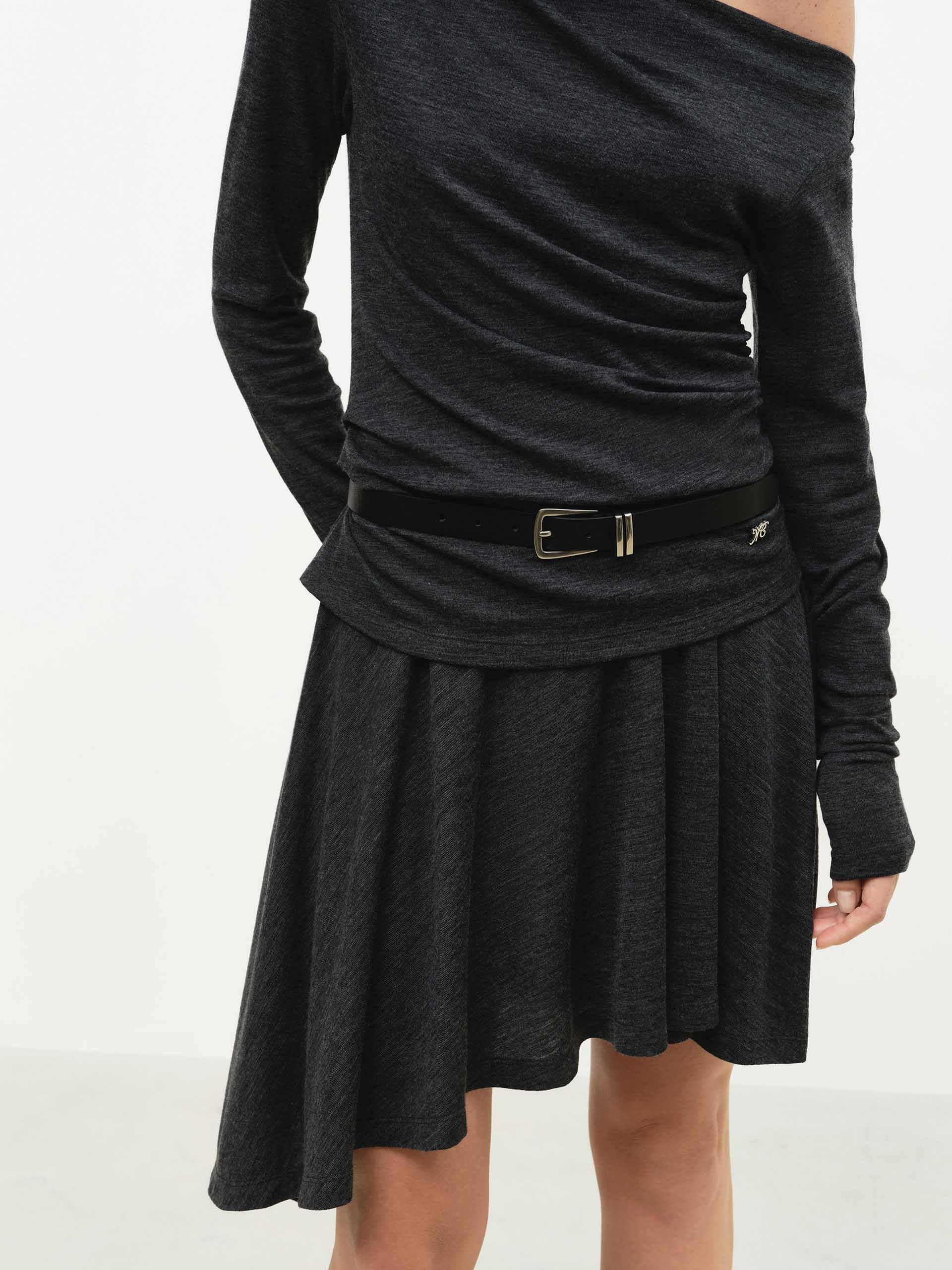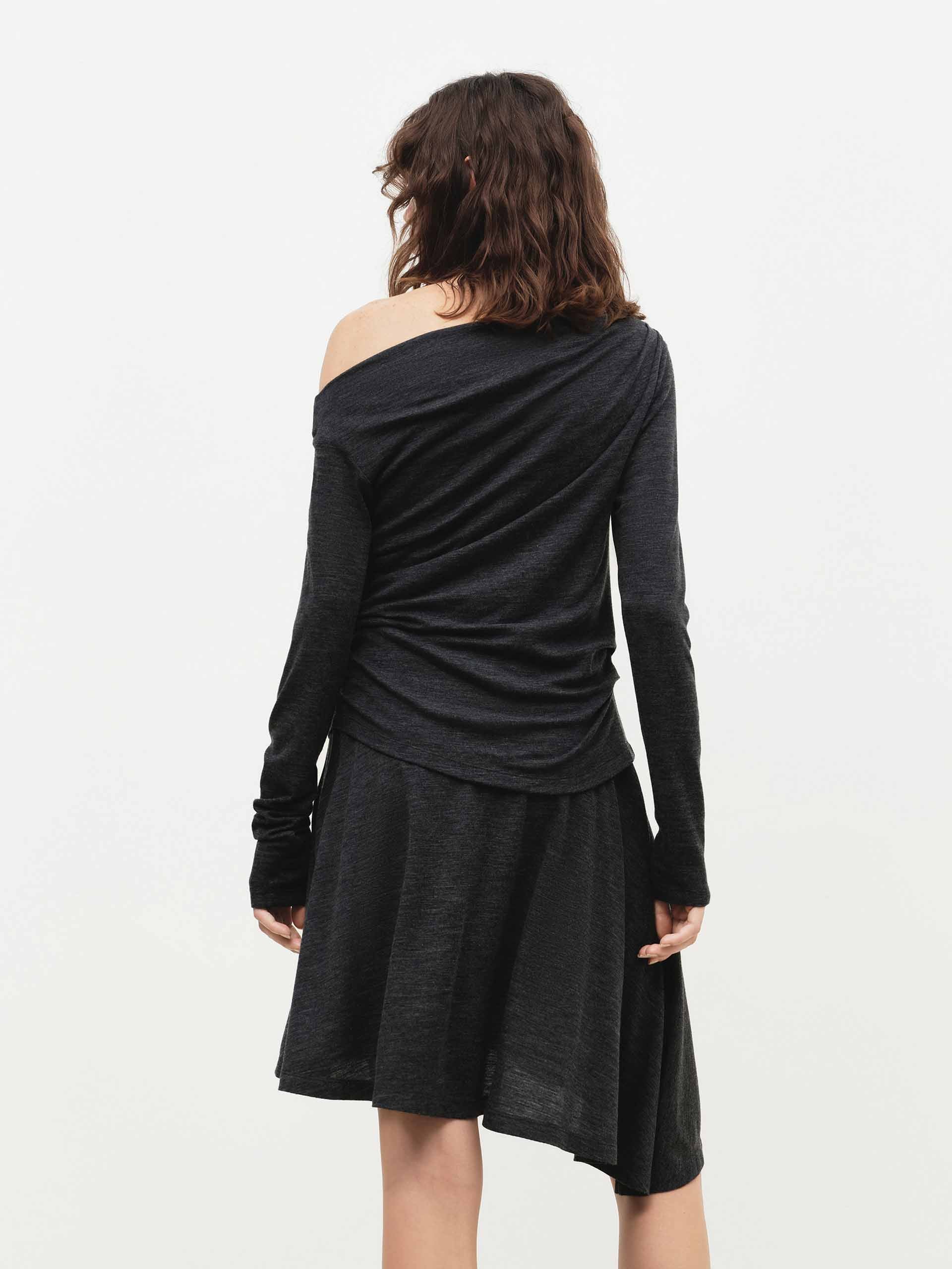The dress exudes modern femininity with its chic silhouette, featuring a comfortable regular fit and a flirty mini length. The elegant off-shoulder neckline offers a graceful touch, while the playful irregular hem adds a contemporary and artistic edge. Crafted from a soft wool blend fabric, this dress drapes beautifully, combining effortless comfort with a distinctly stylish and romantic appeal for any occasion.