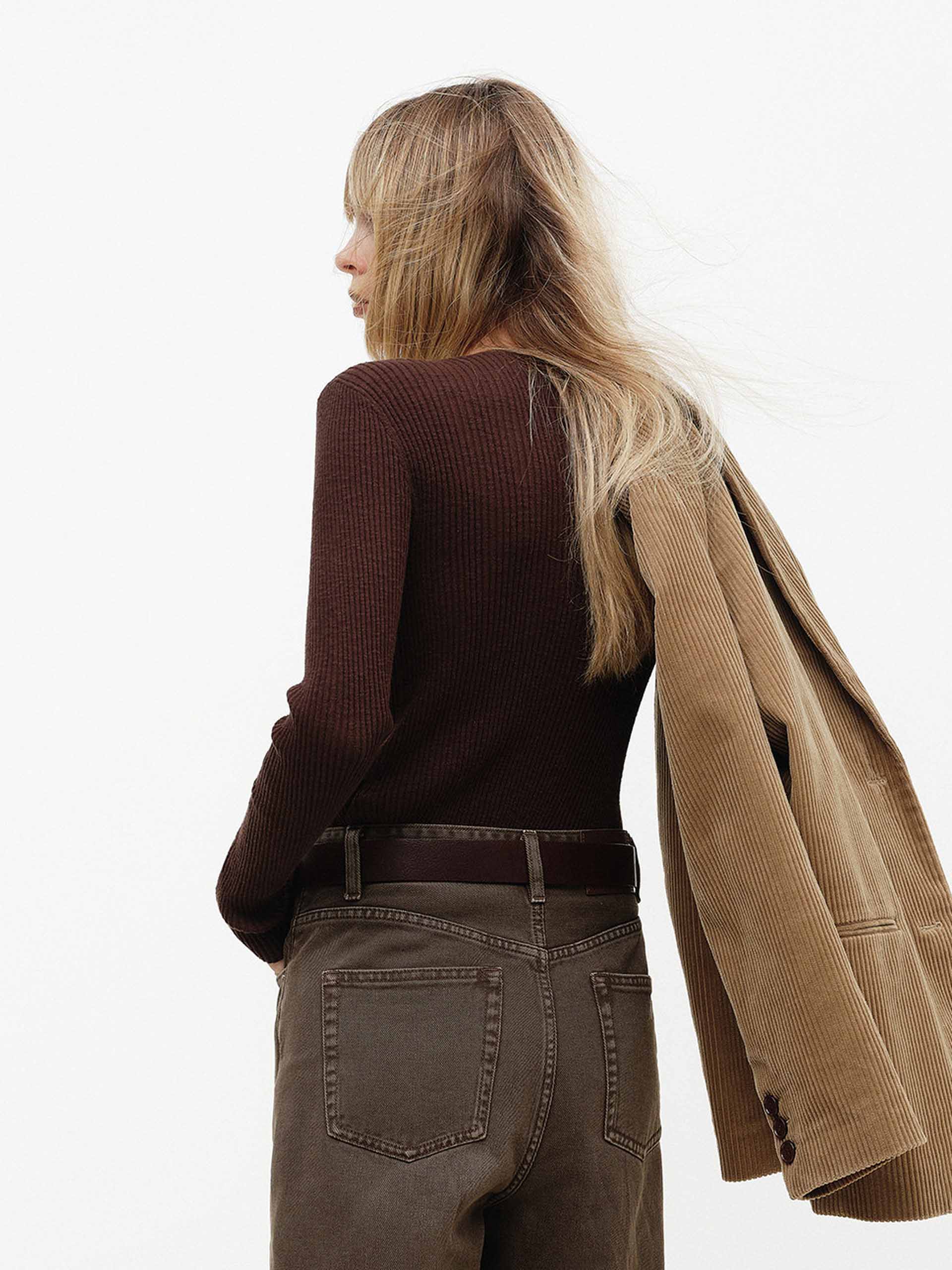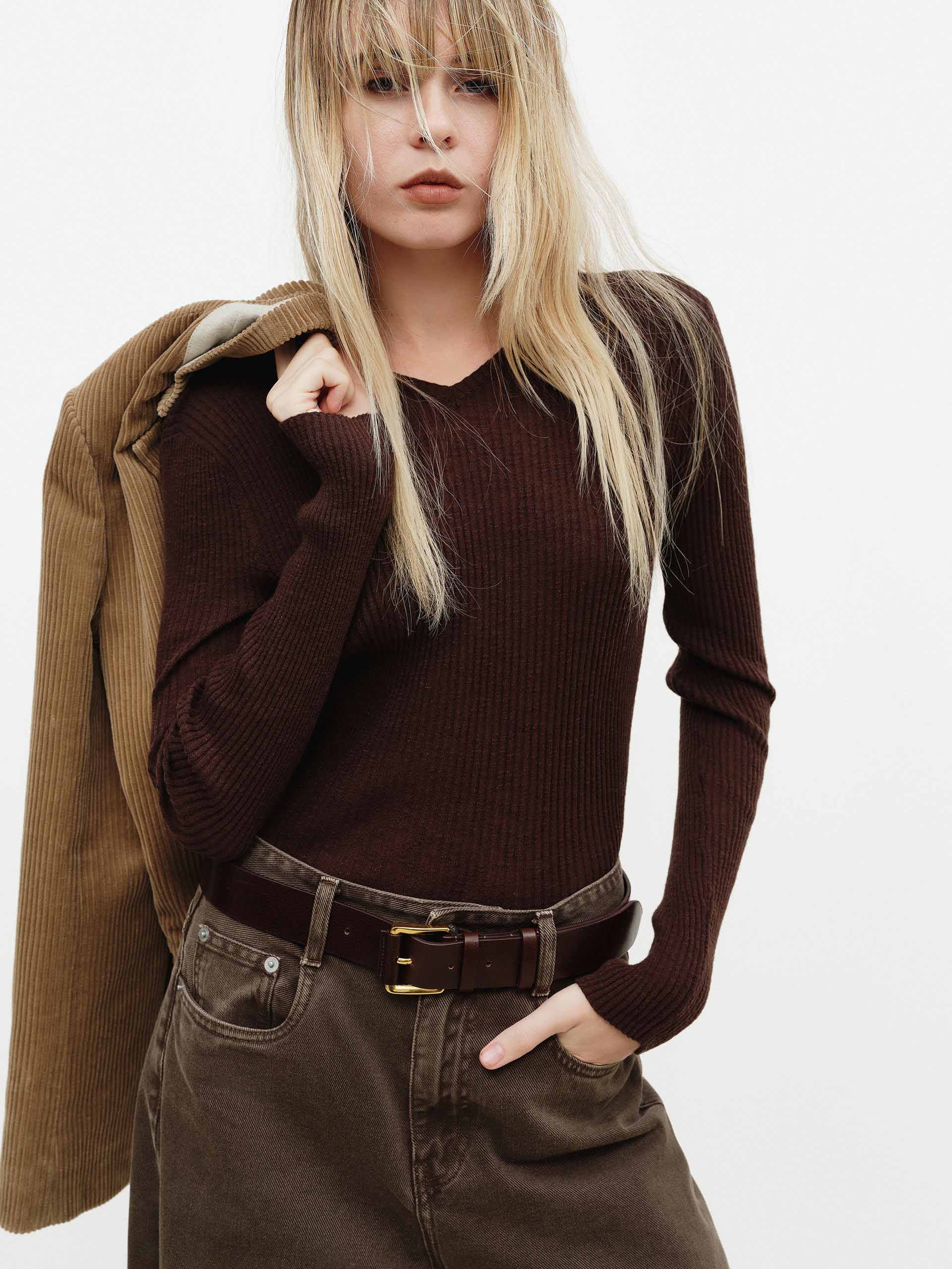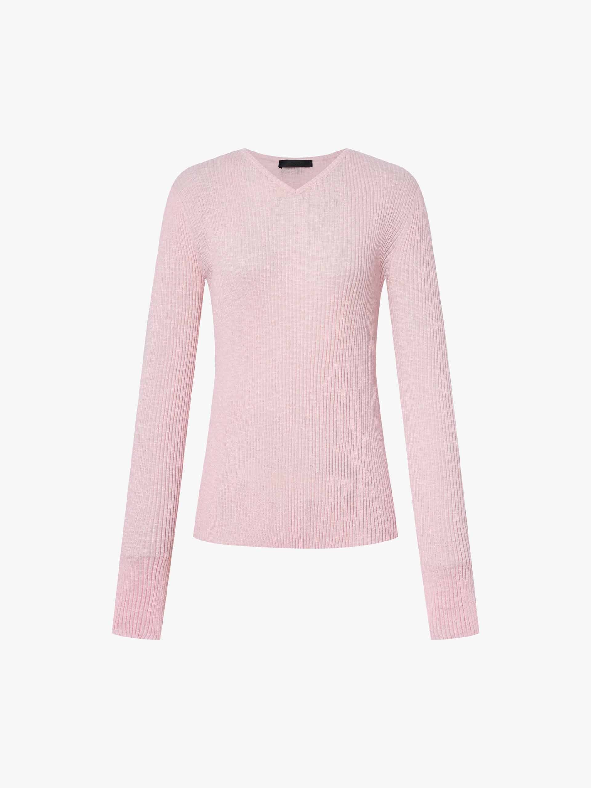 A modern essential with refined texture, this sweater is designed with a sleek, figure-skimming slim fit. The V-neckline and delicate ribbed knitting create a flattering, tactile appeal, while a discreet back label adds a polished finish. Made from a soft cotton blend, it offers versatile comfort for effortless layering or standalone style.