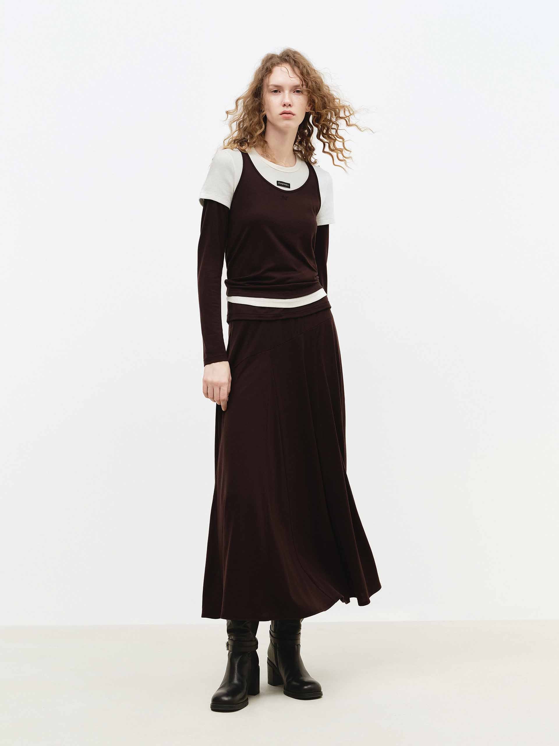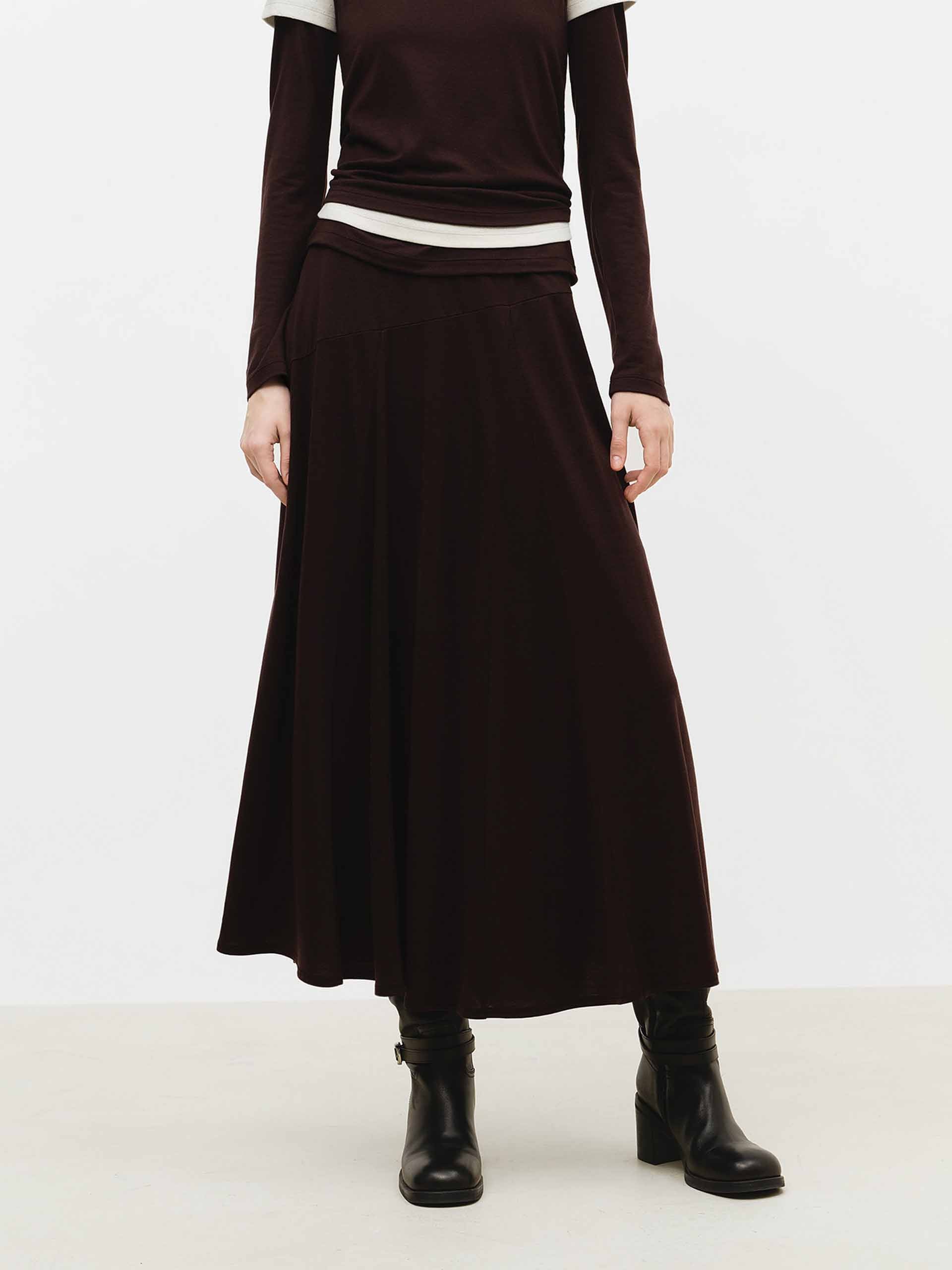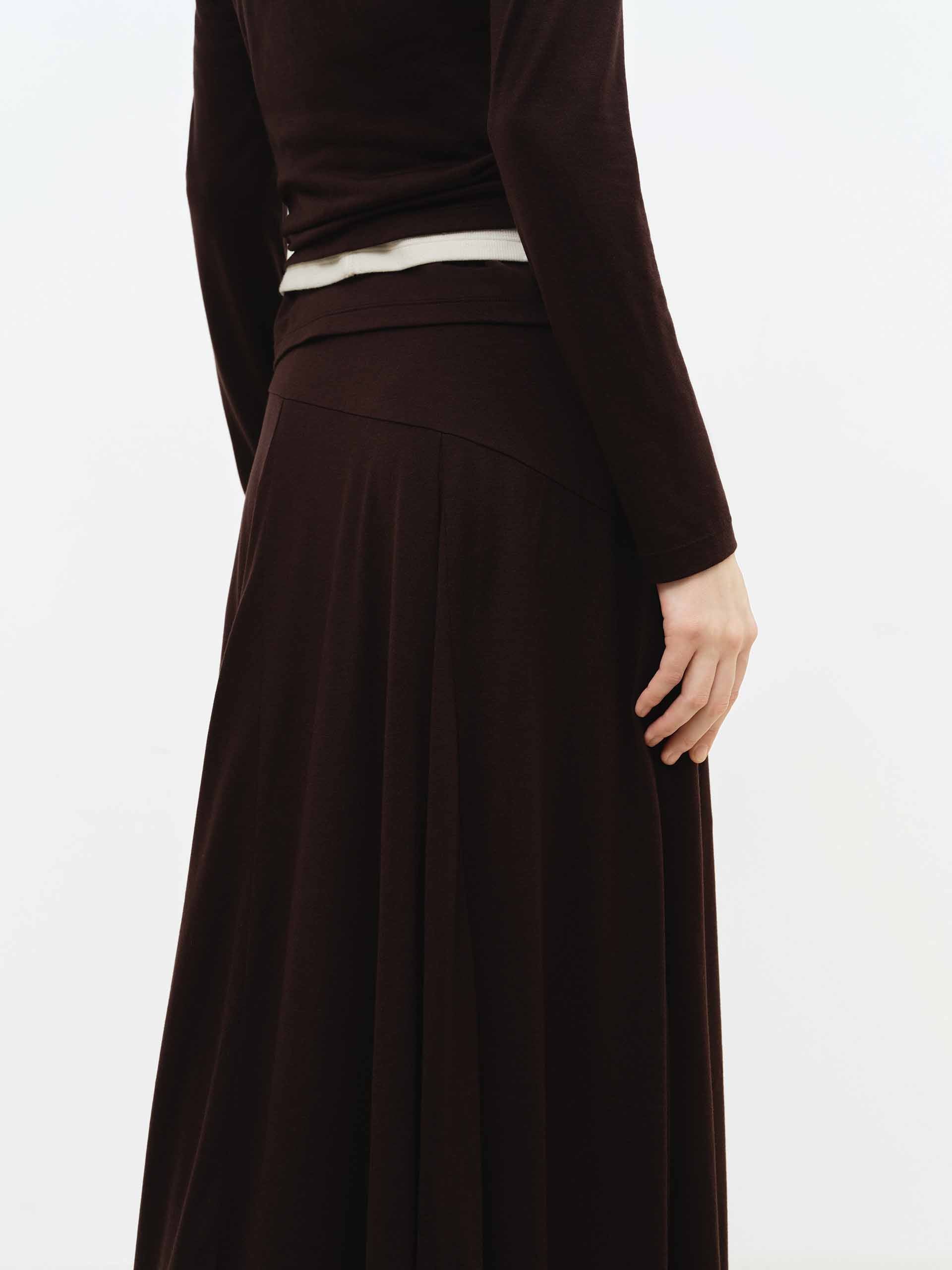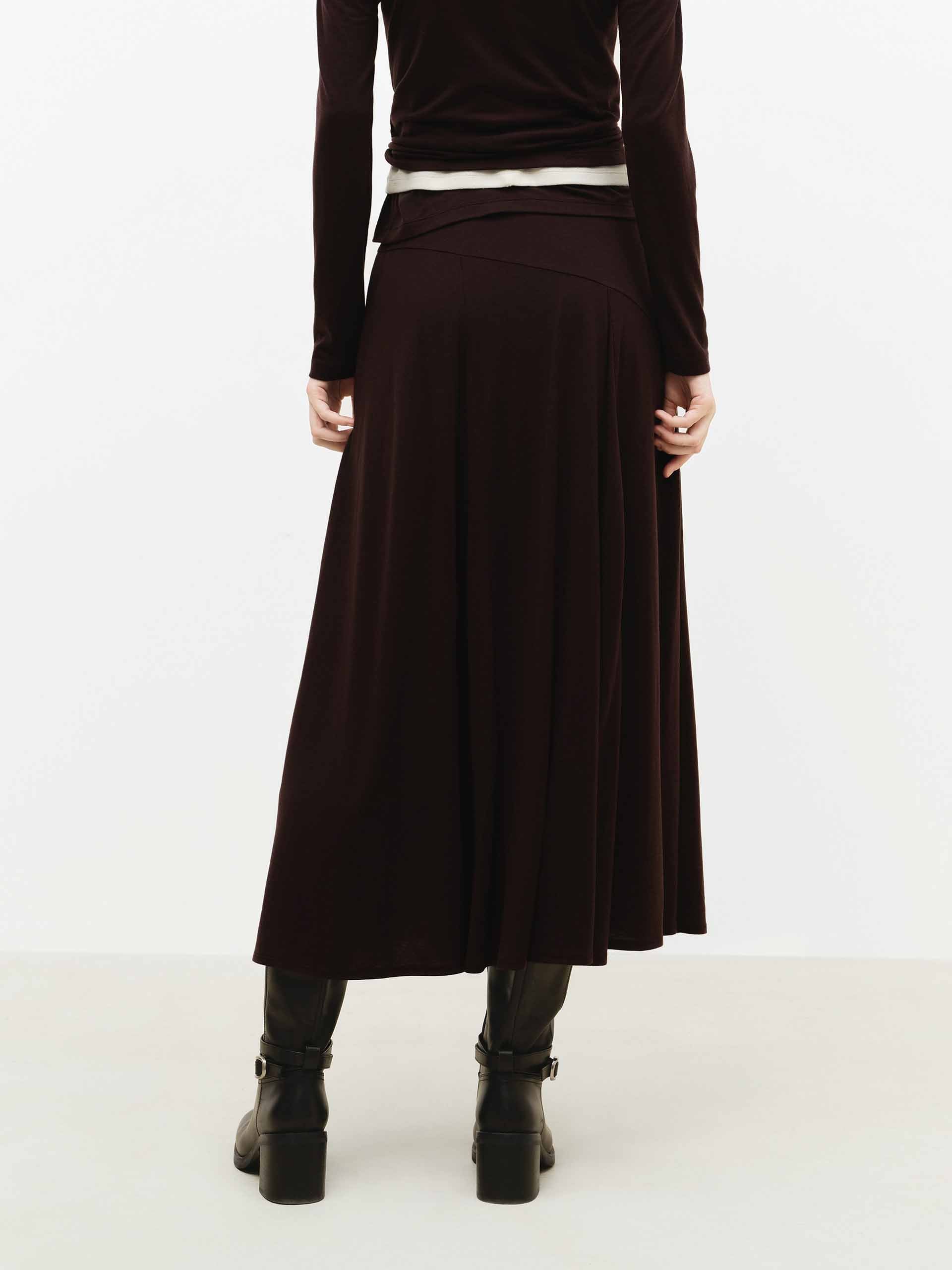The skirt offers a graceful silhouette defined by its elegant movement. Designed with a flattering high waist, it falls to a soft midi length. It's beautifully flowy, cascading hem, crafted from a luxurious soft wool and lyocell blend that ensures both drape and warmth for an effortlessly sophisticated look. Pair with the matching blouse for a more sophisticated and charming look.
