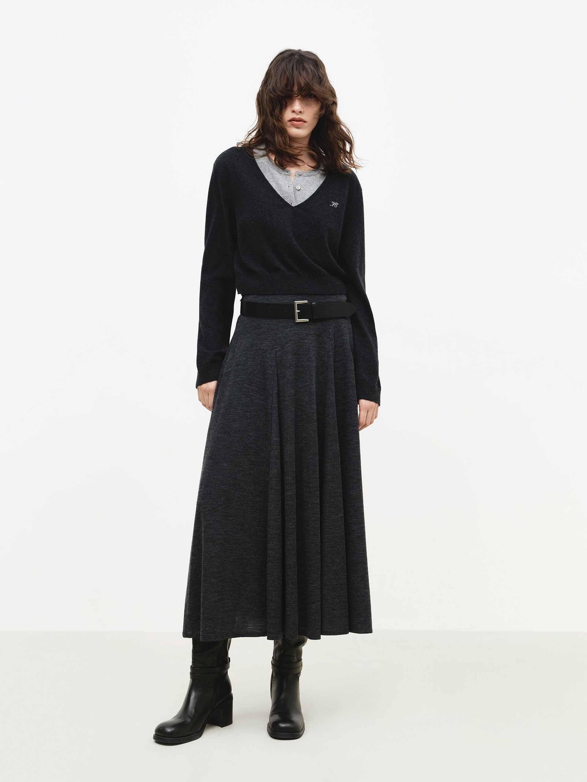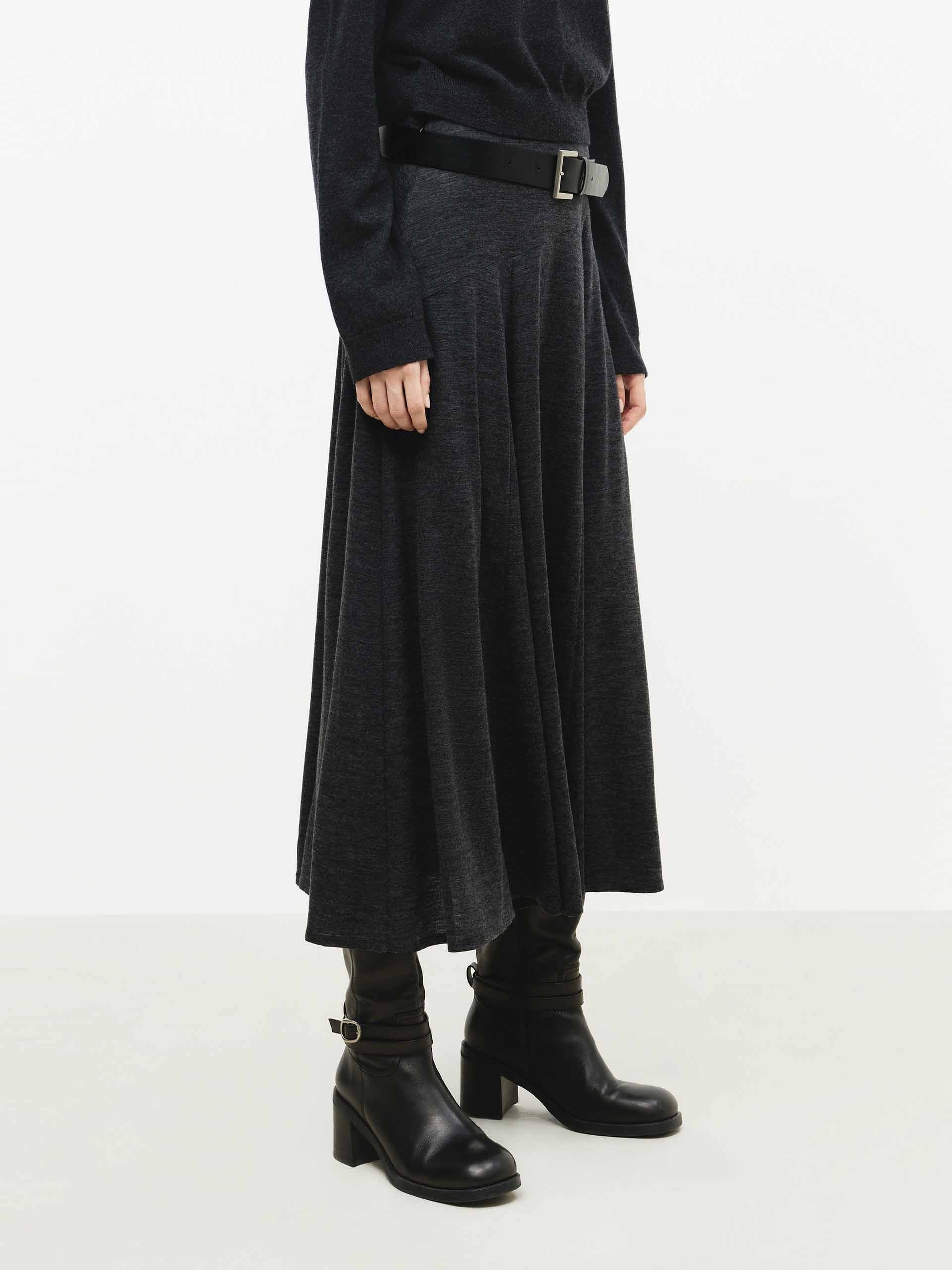 The skirt offers a graceful silhouette defined by its elegant movement. Designed with a regular fit and a flattering high waist, it falls to a soft midi length. The skirt's defining feature is its beautifully flowy, cascading hem, crafted from a luxurious soft wool blend that ensures both drape and warmth for an effortlessly sophisticated look.