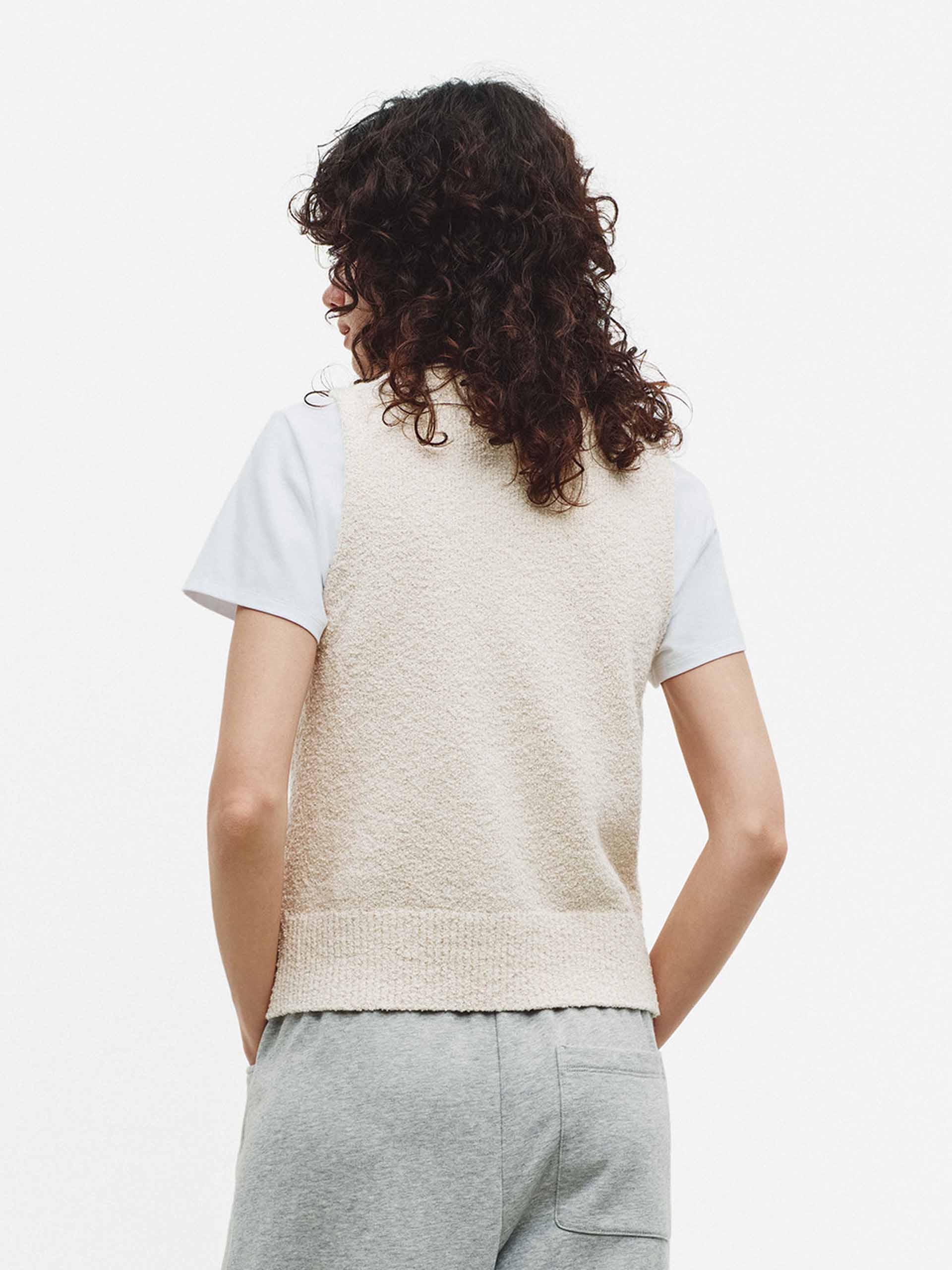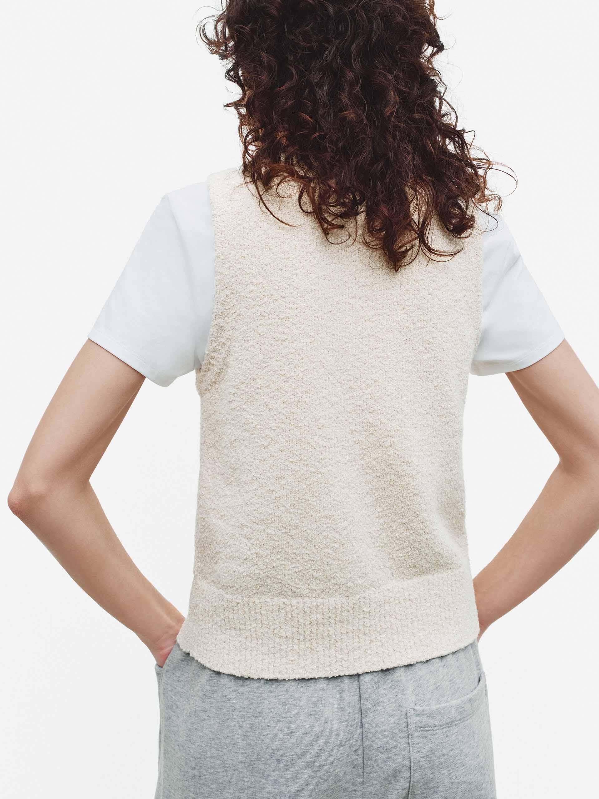 This vest showcases contemporary tailoring with its streamlined proportions and refined crewneck neckline. Crafted from textured knit material that introduces subtle dimension, it delivers both visual sophistication and tactile appeal. The complete button front enables flexible styling options, making it an essential layering piece for creating curated, professional looks across diverse occasions.