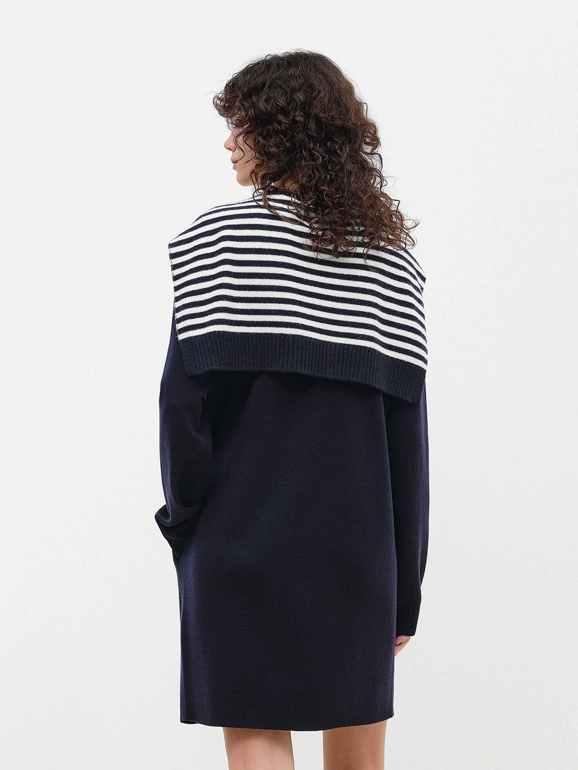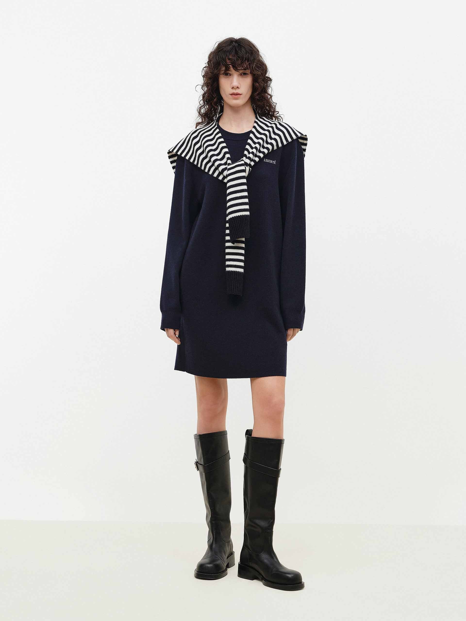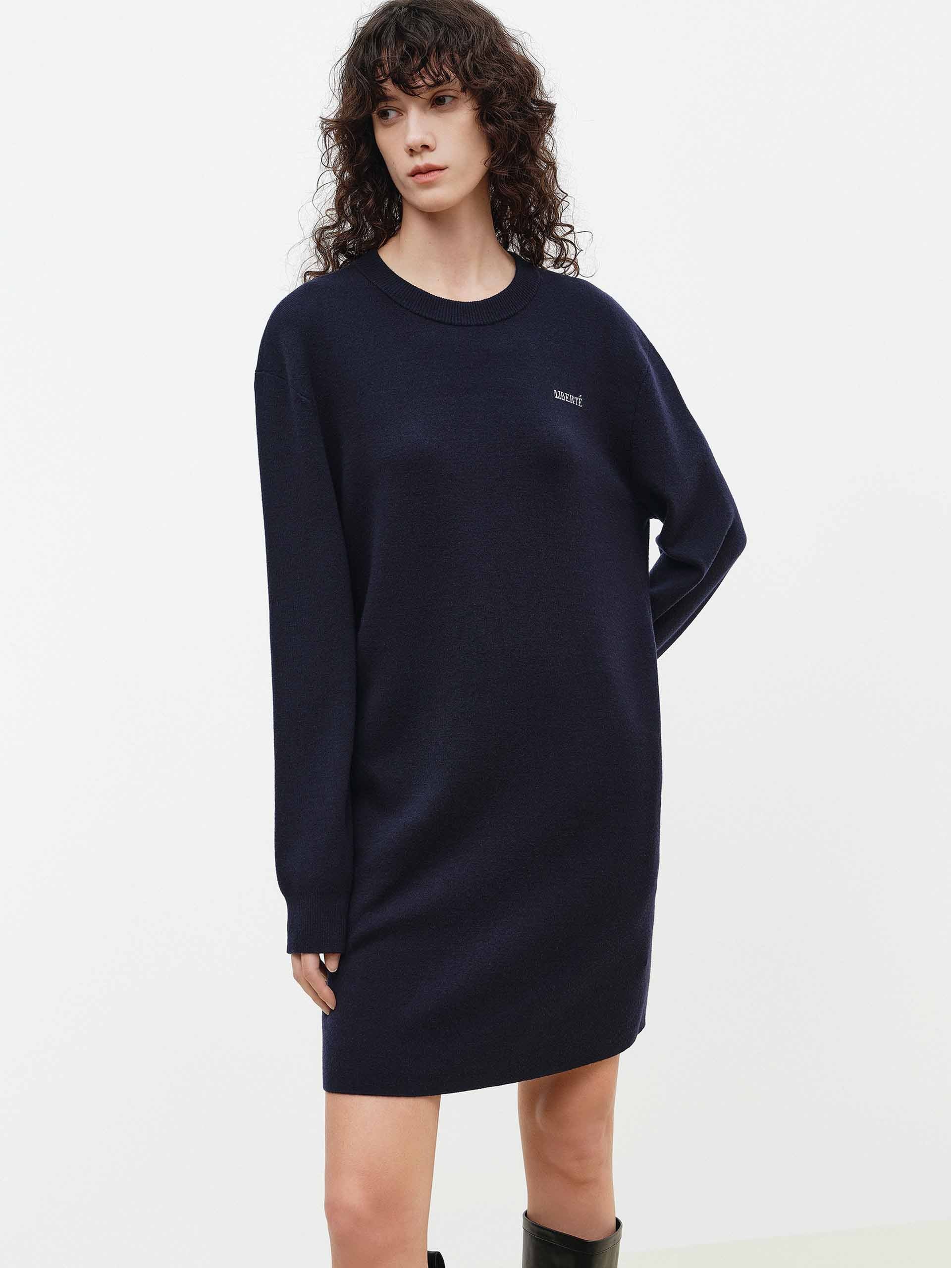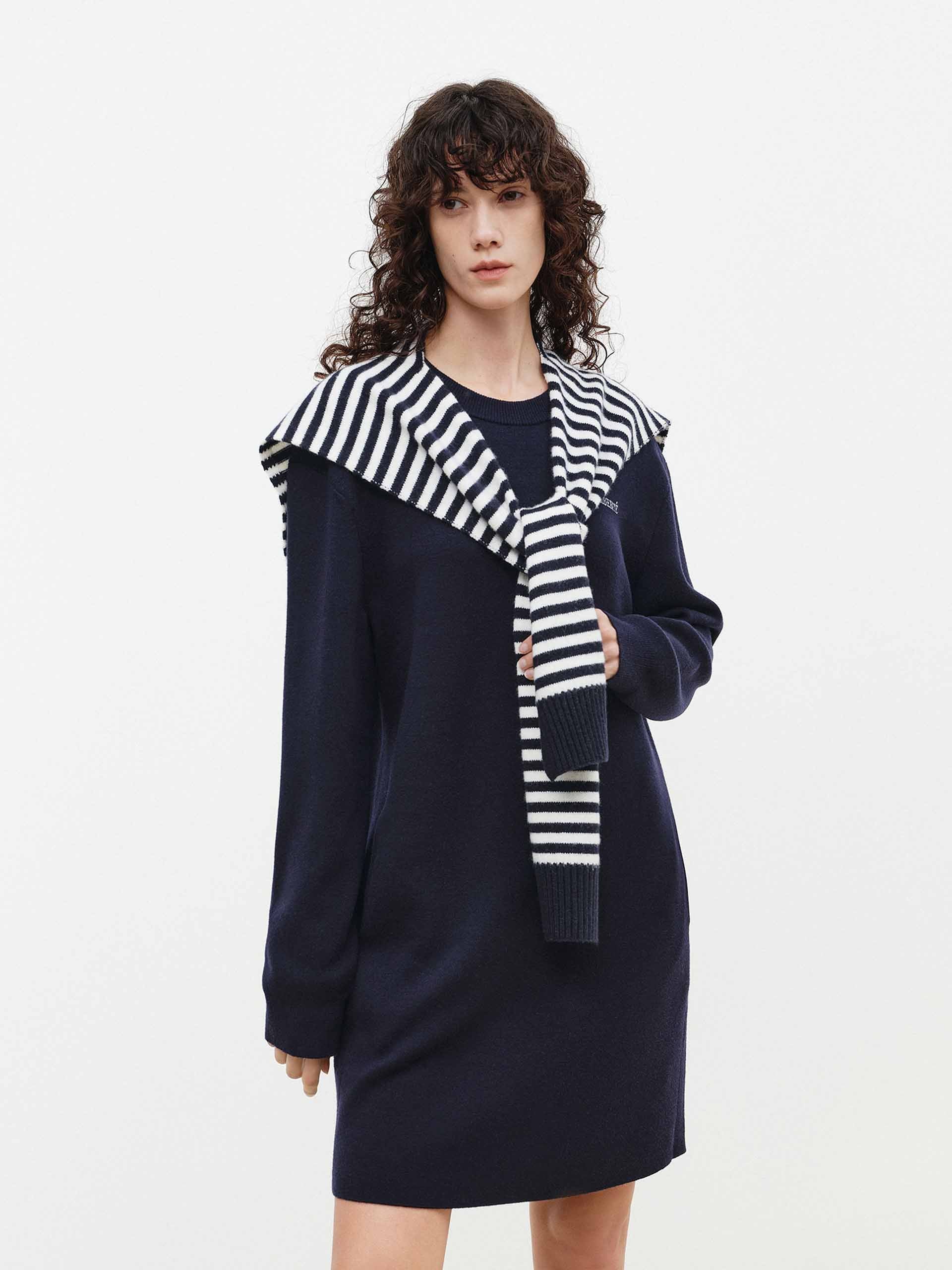 Crafted from sumptuous 100% merino wool, this dress reimagines casual comfort with elevated sophistication. It features a relaxed sweatshirt dress silhouette with a classic round neck and long sleeves. Practical side pockets complement the elegant attached shawl, which adds a layer of graceful drape. This piece masterfully blends cozy, soft warmth with a distinctly polished and versatile aesthetic.