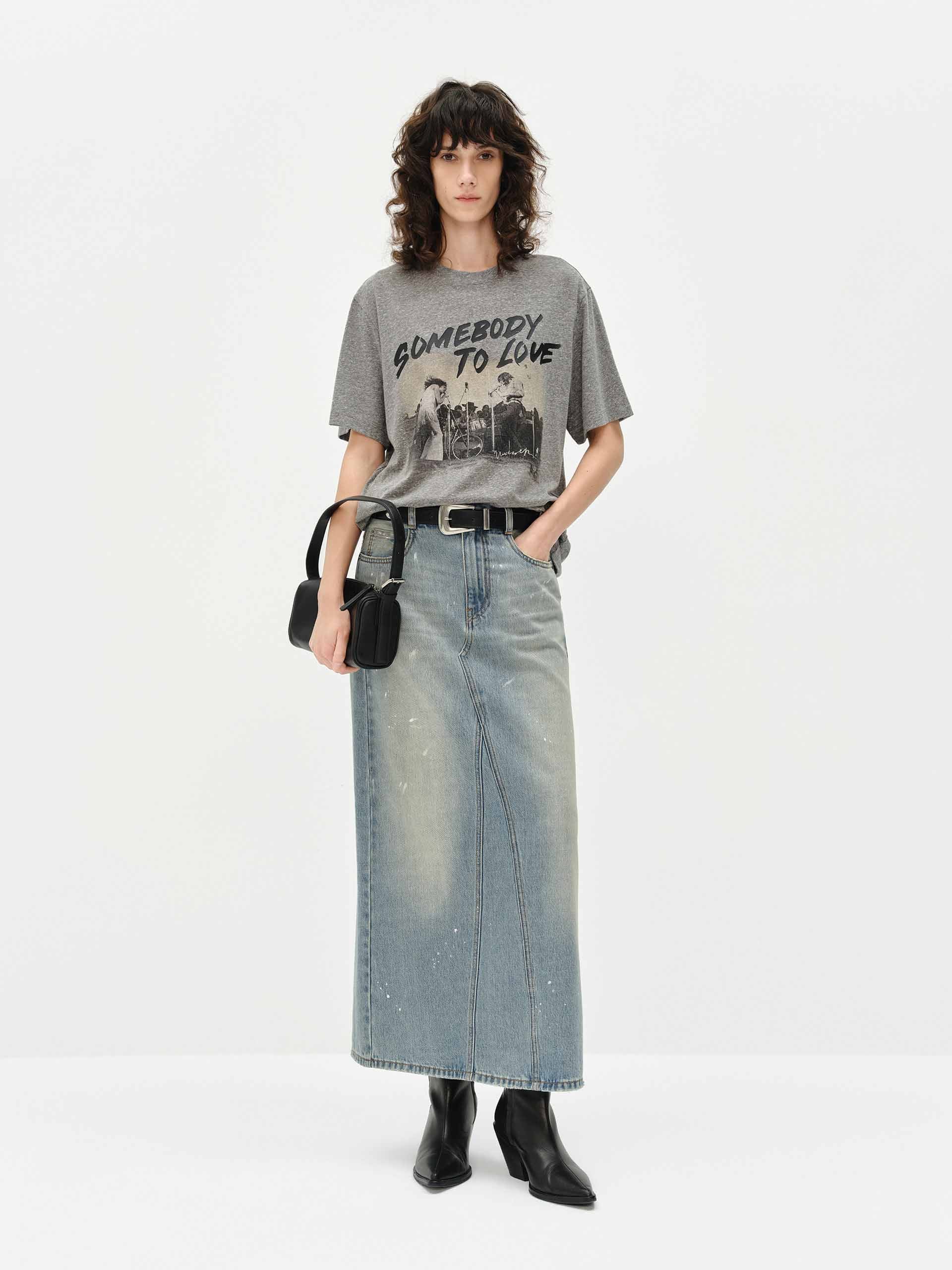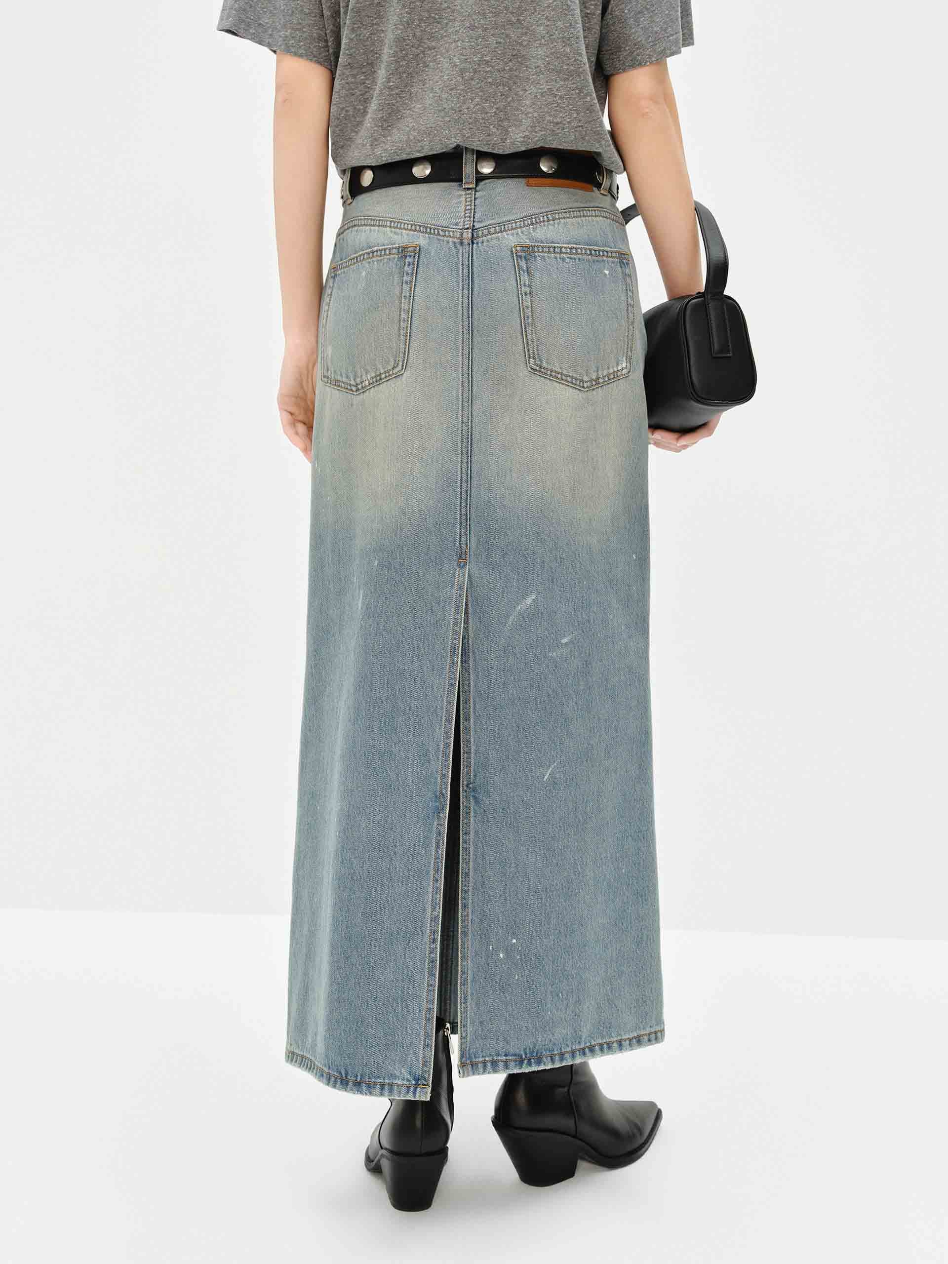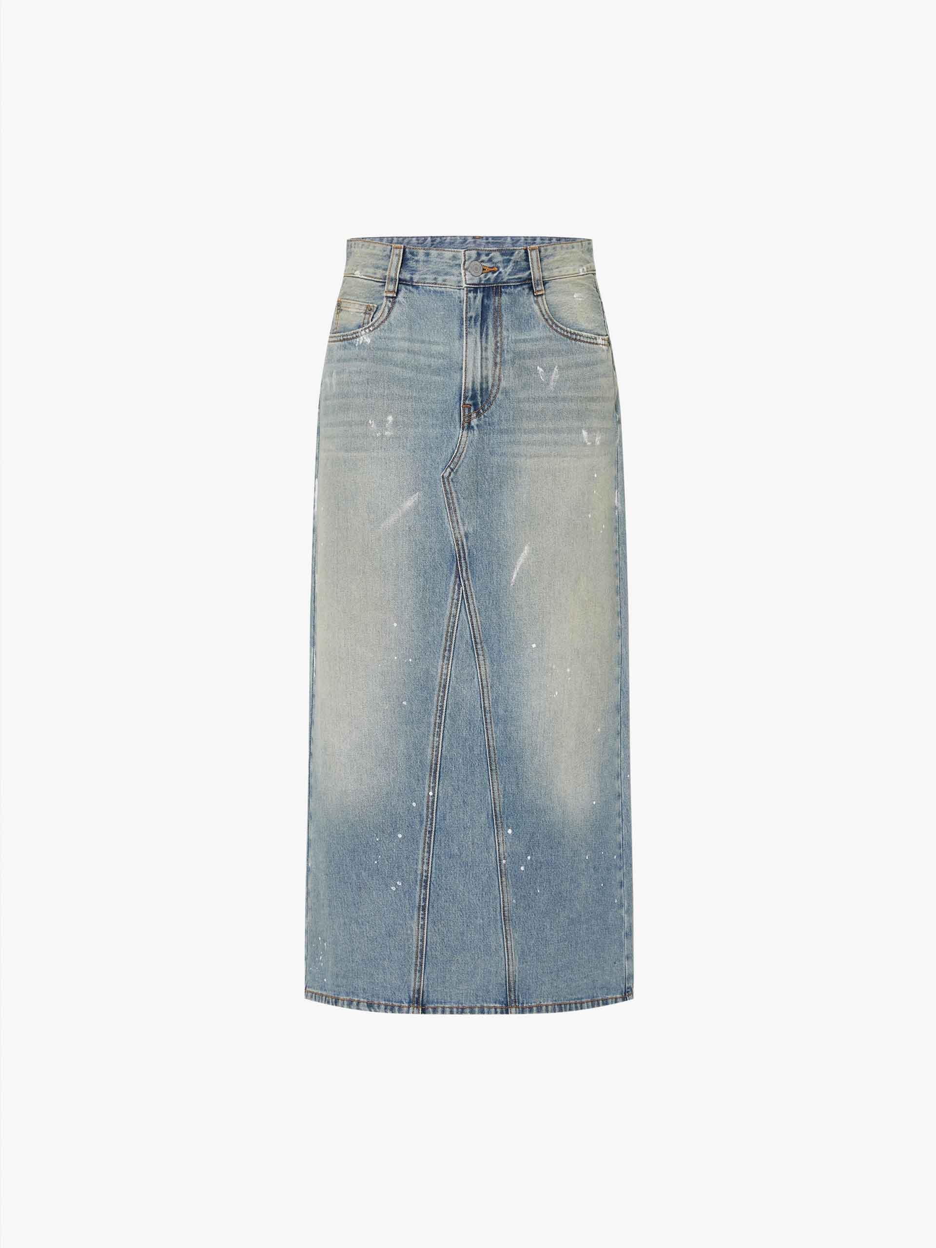 This denim skirt is crafted from pure cotton, offering a comfortable and breathable feel. It’s designed in a straight silhouette with a maxi length, featuring a splash detail for a touch of playful flair and a back slit for added movement and style. This skirt is perfect for casual daytime wear, effortlessly combining comfort and denim elegance.