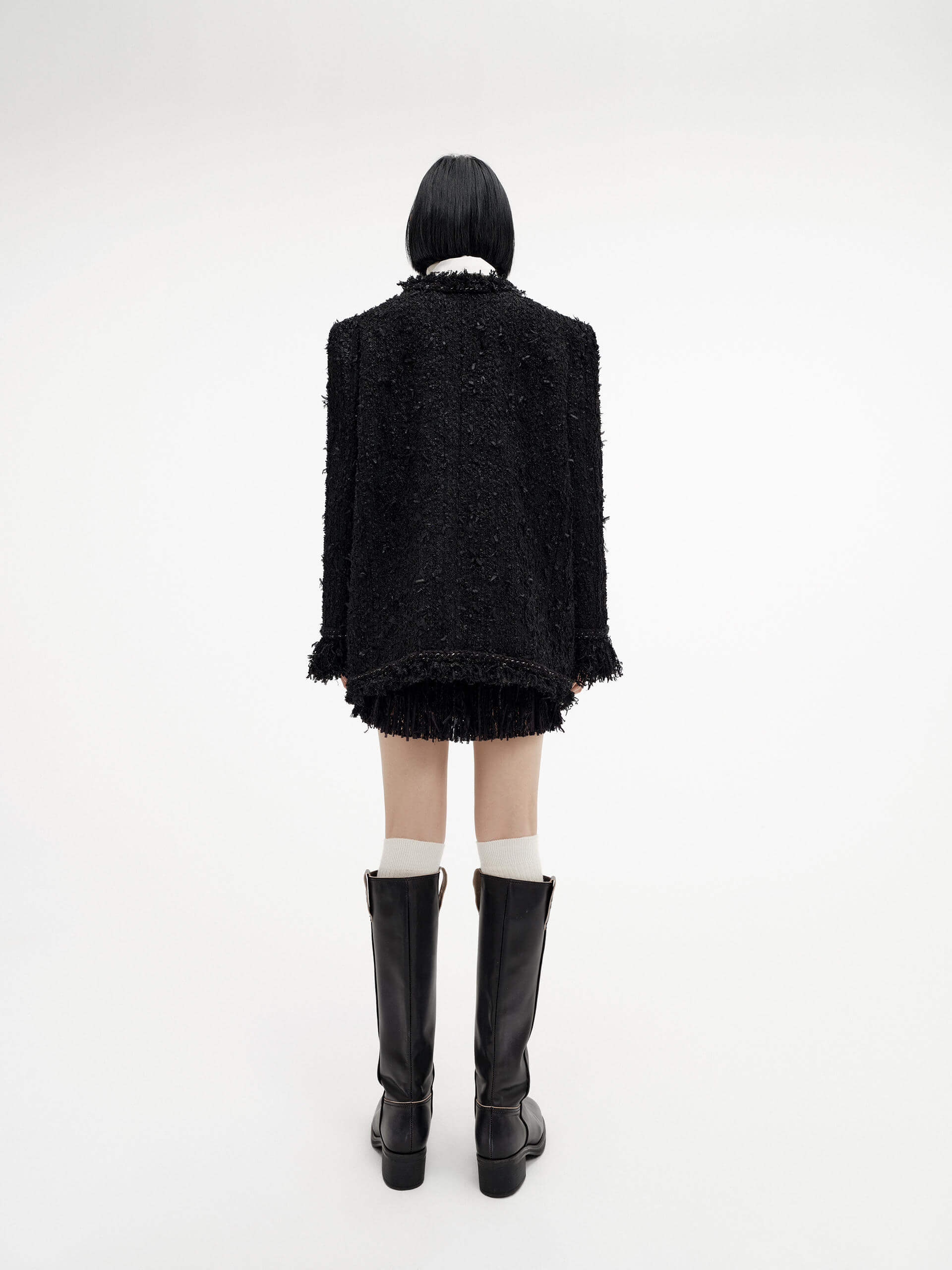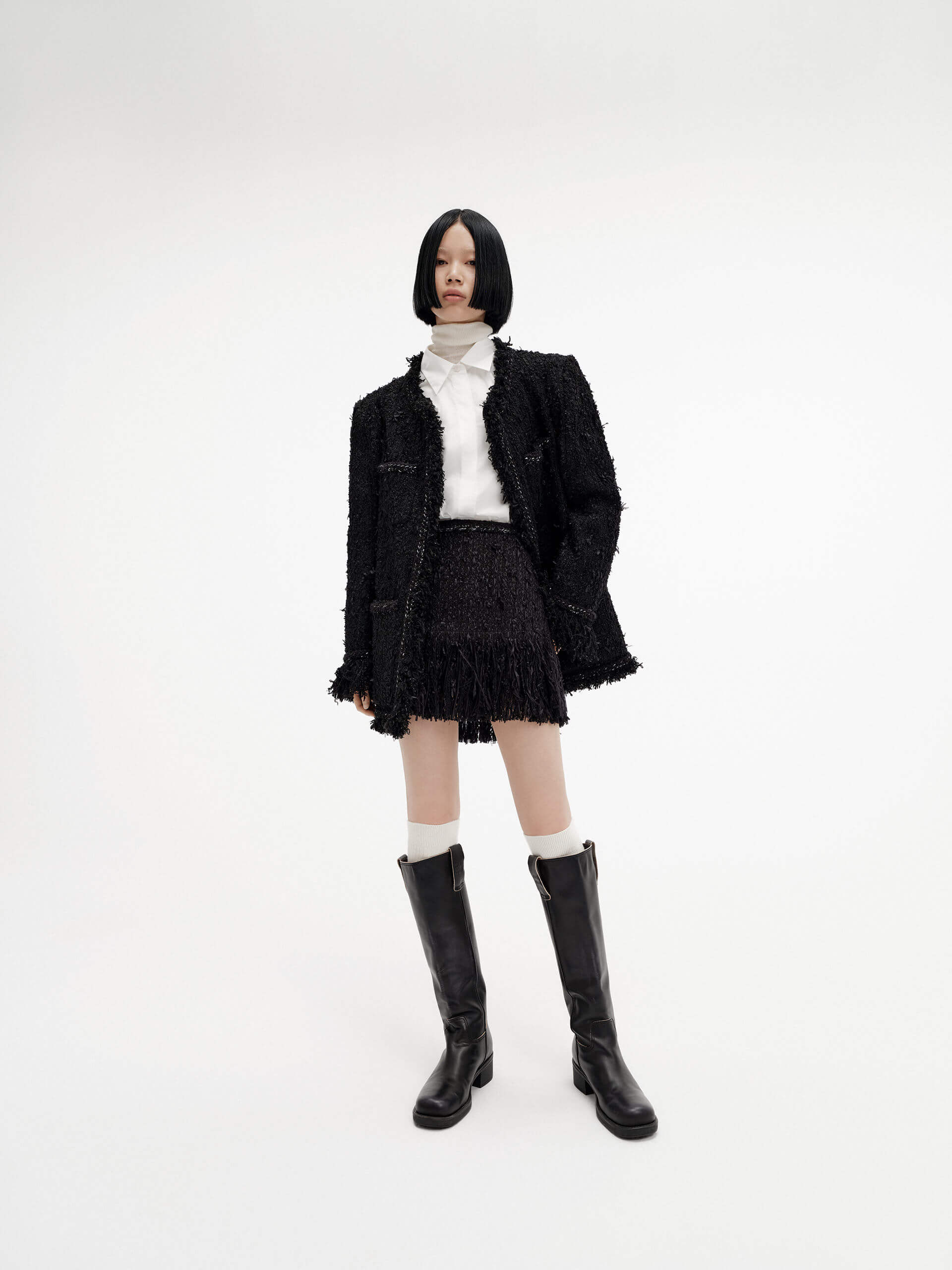 This skirt is calling for parties. This piece is crafted with an alluring A-line silhouette with impeccable features of a luxe tweed touch woven with 7 kinds of yarns, fancy trims created by hands, and a delicate waist designed with sophisticated metallic lines. Plan for a glam moment? This heroine is stand-by.