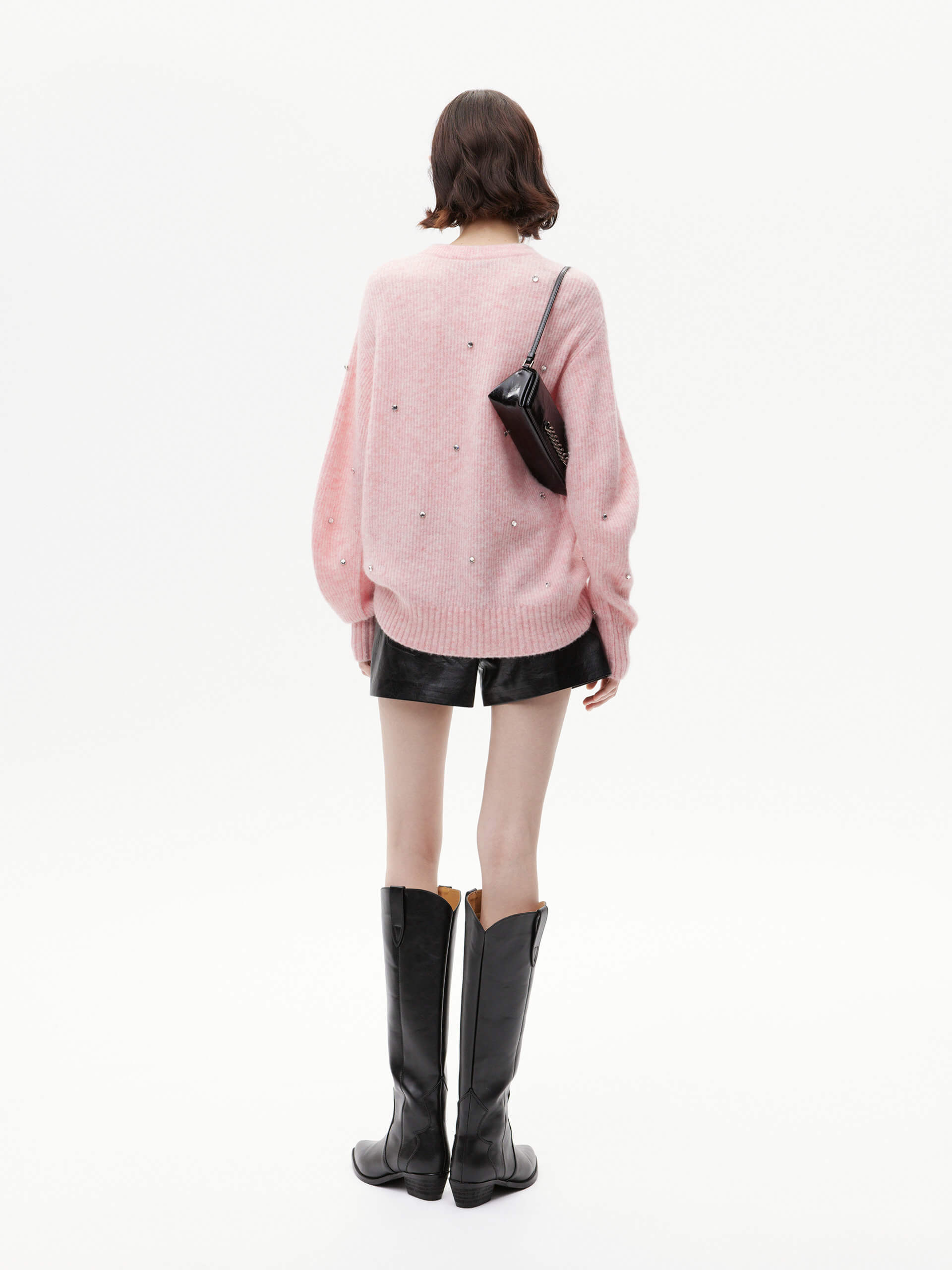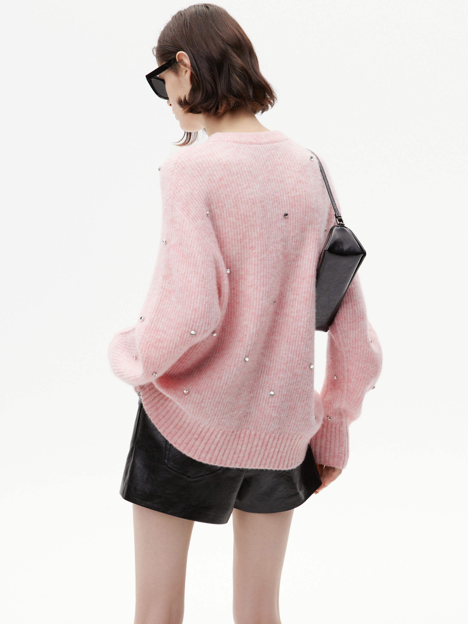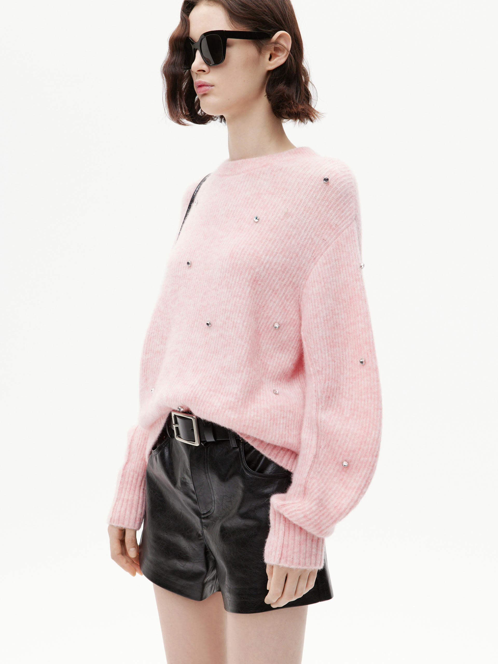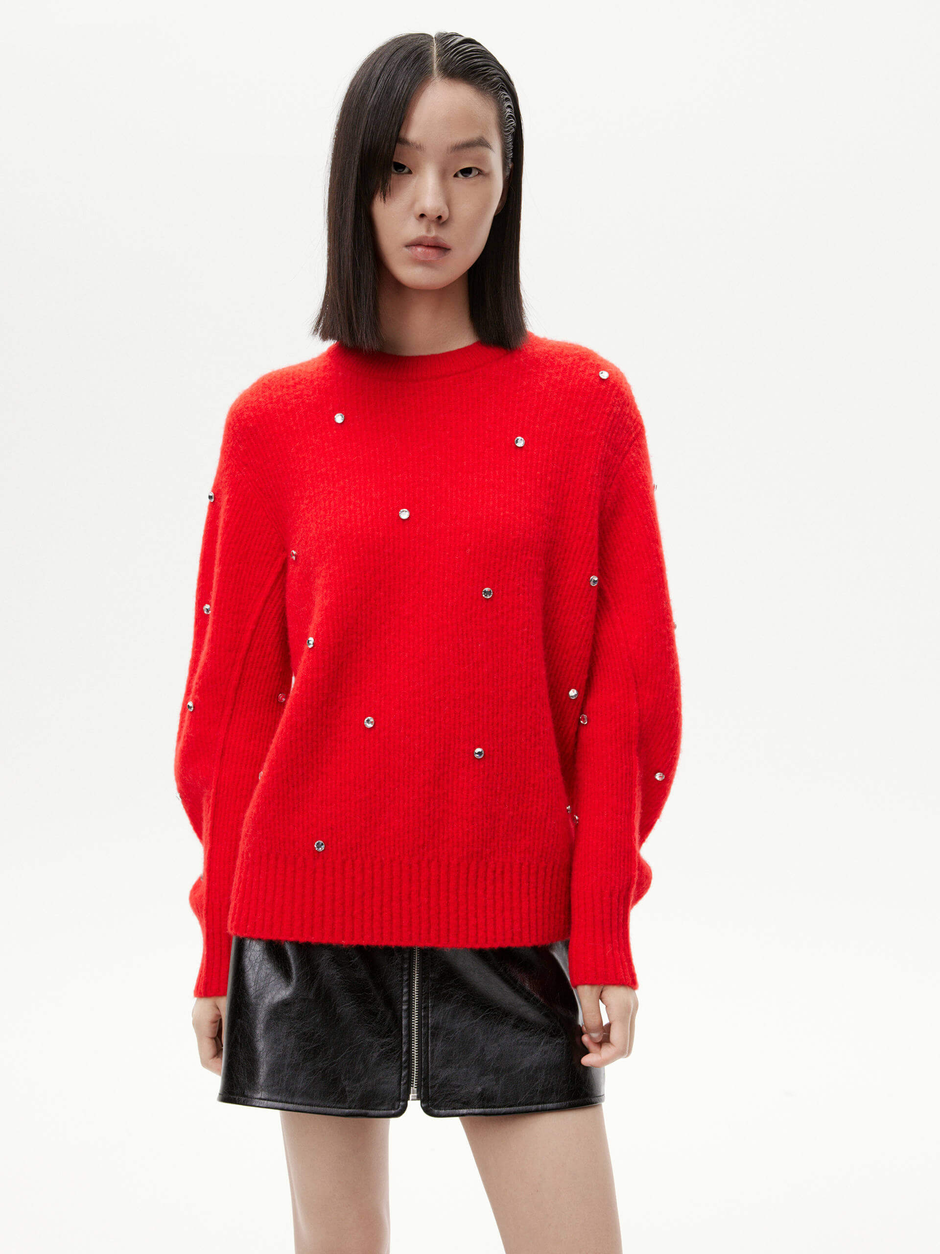 Indulge in the luxurious comfort of our sweater. Crafted with a blend of alpaca wool, it boasts a soft, plush touch. The expertly hand-applied rhinestone design adds a touch of glamour to the relaxed, versatile silhouette.