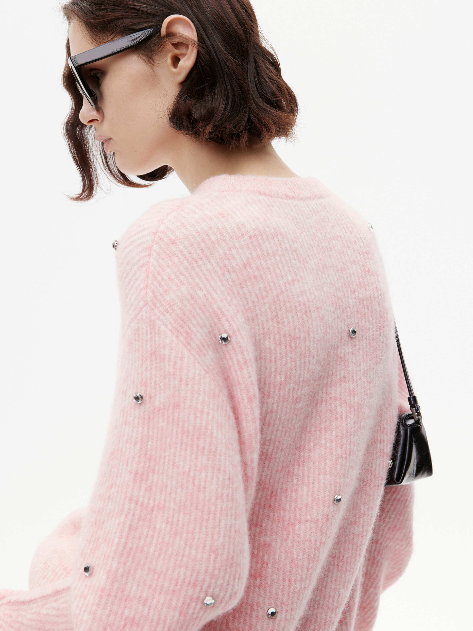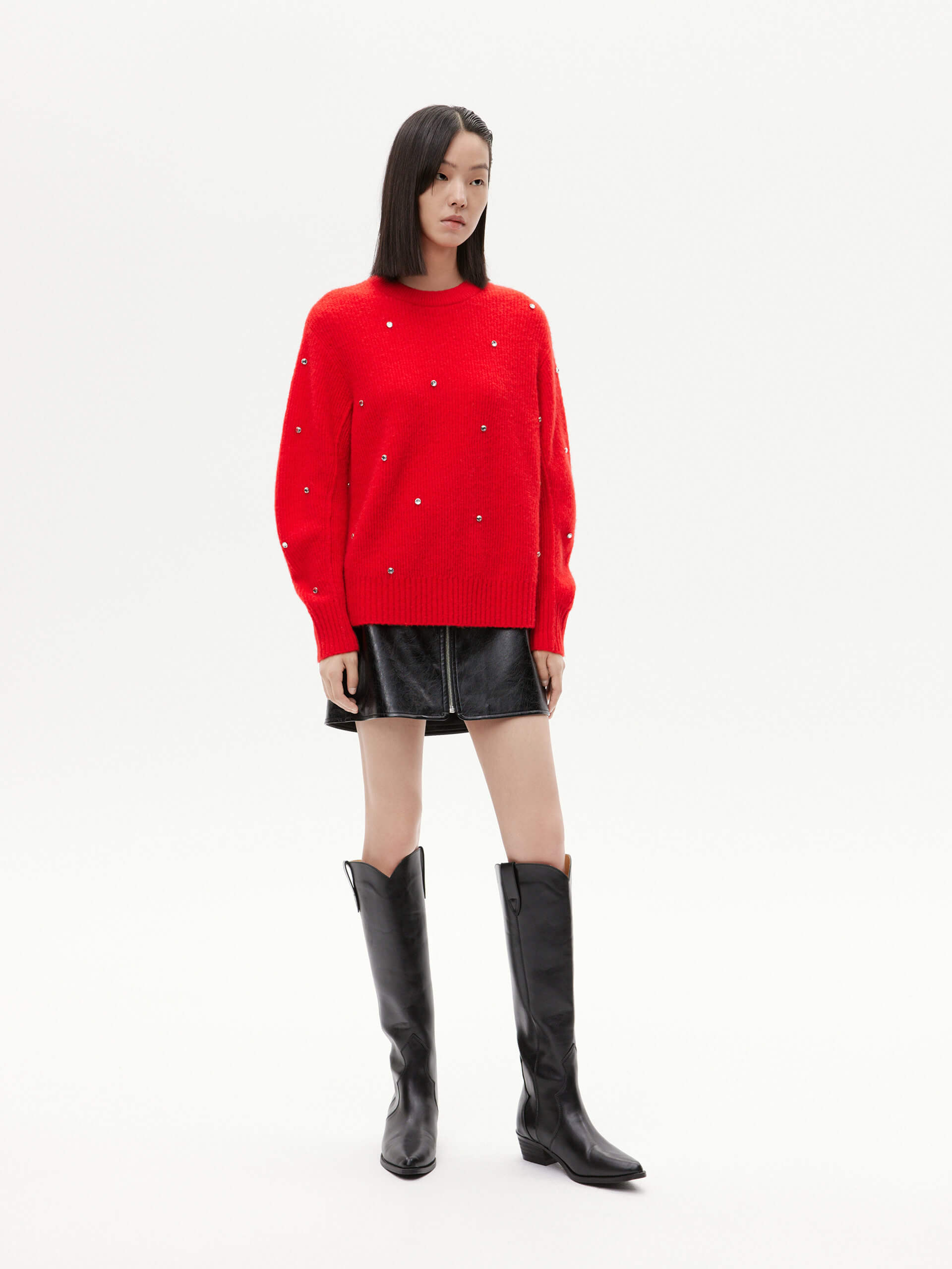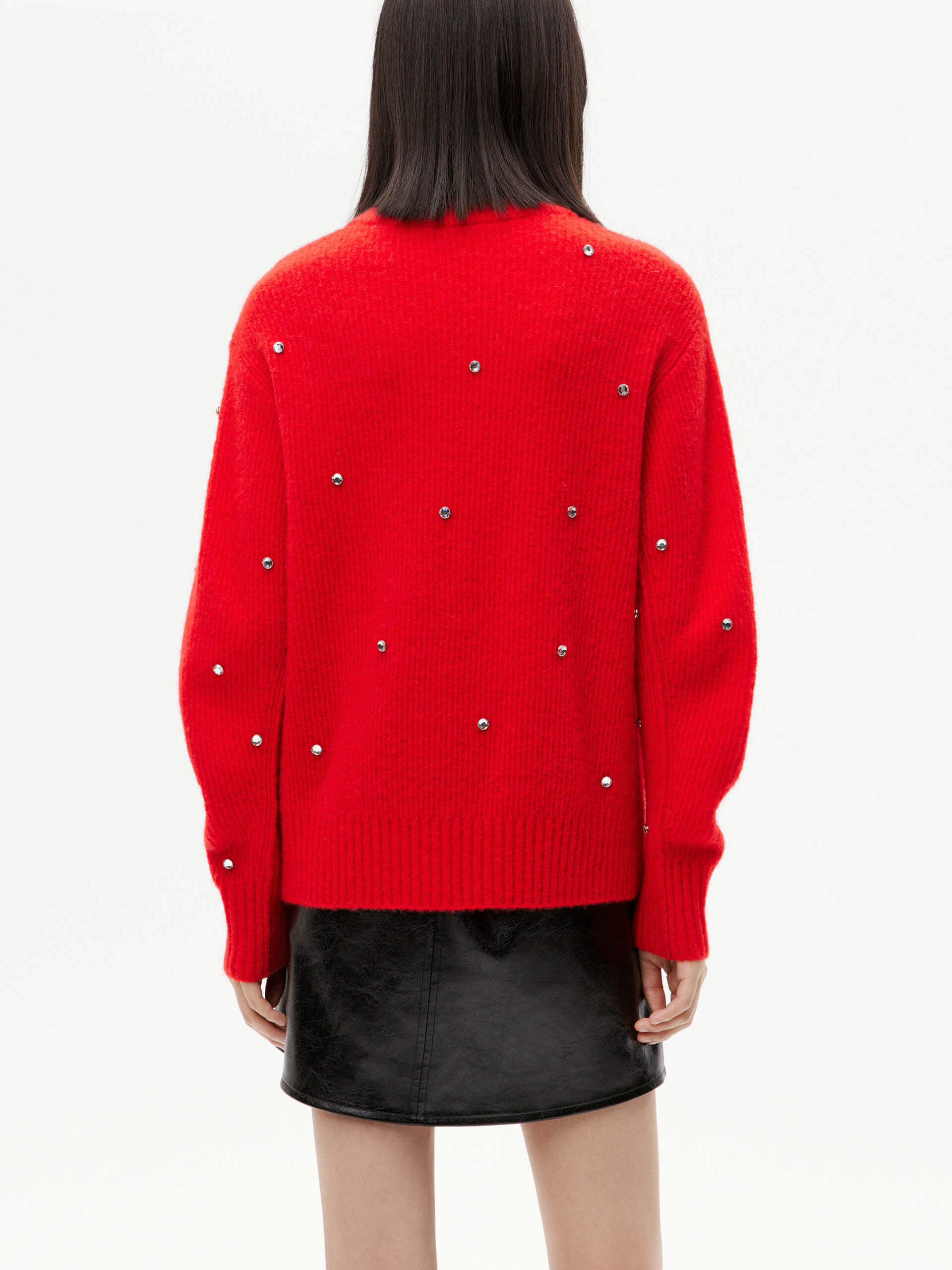 Indulge in the luxurious comfort of our sweater. Crafted with a blend of alpaca wool, it boasts a soft, plush touch. The expertly hand-applied rhinestone design adds a touch of glamour to the relaxed, versatile silhouette.