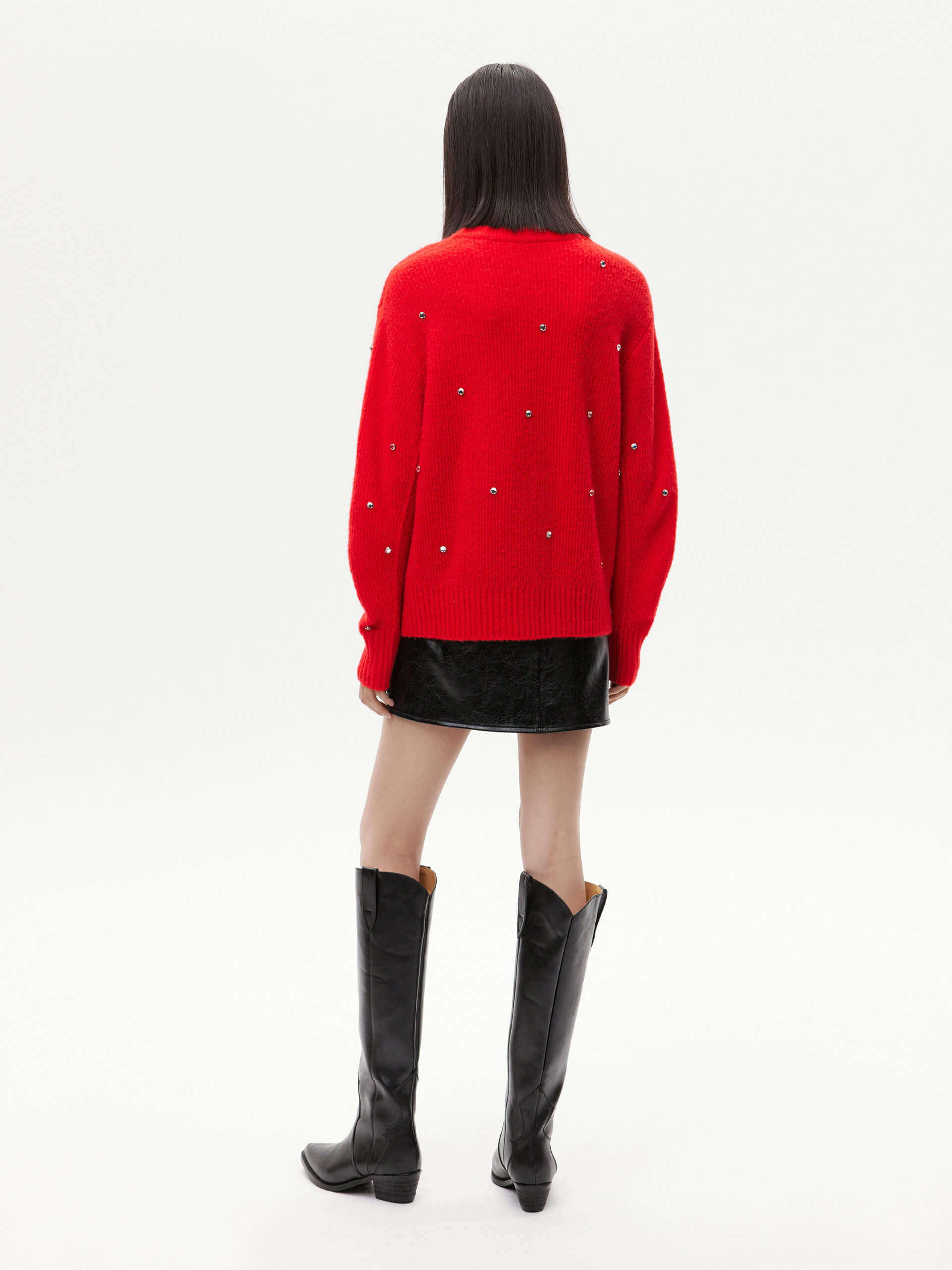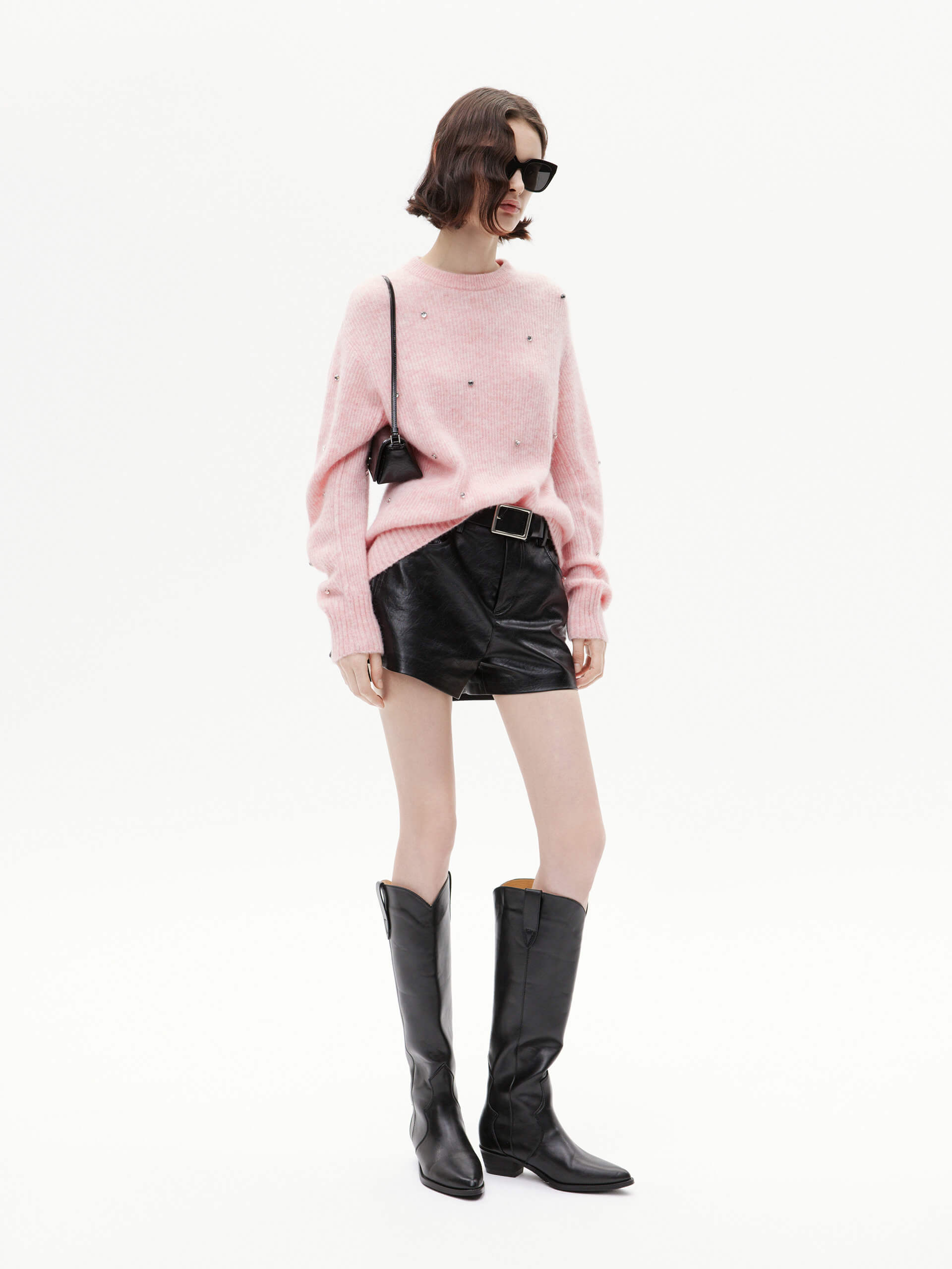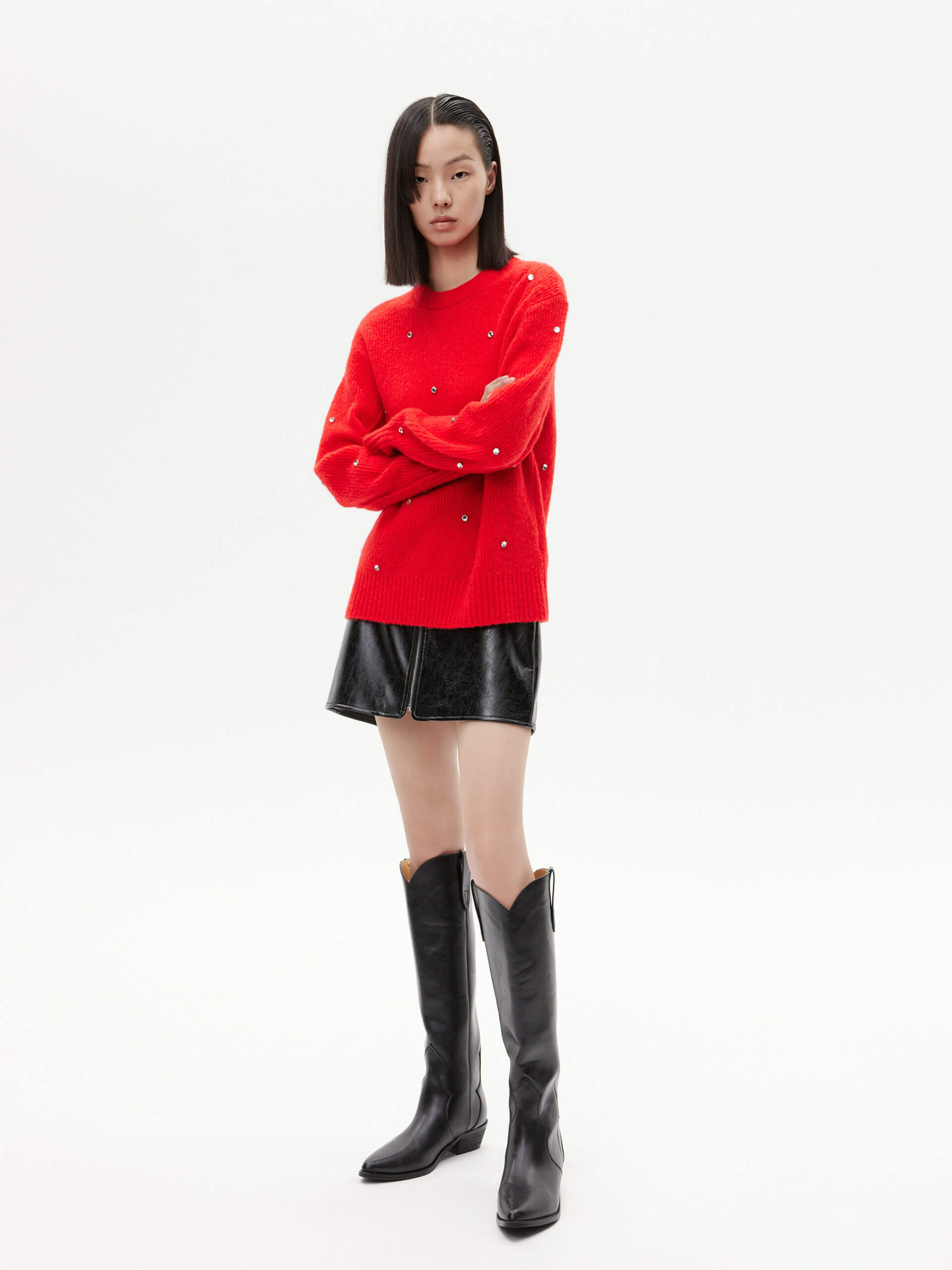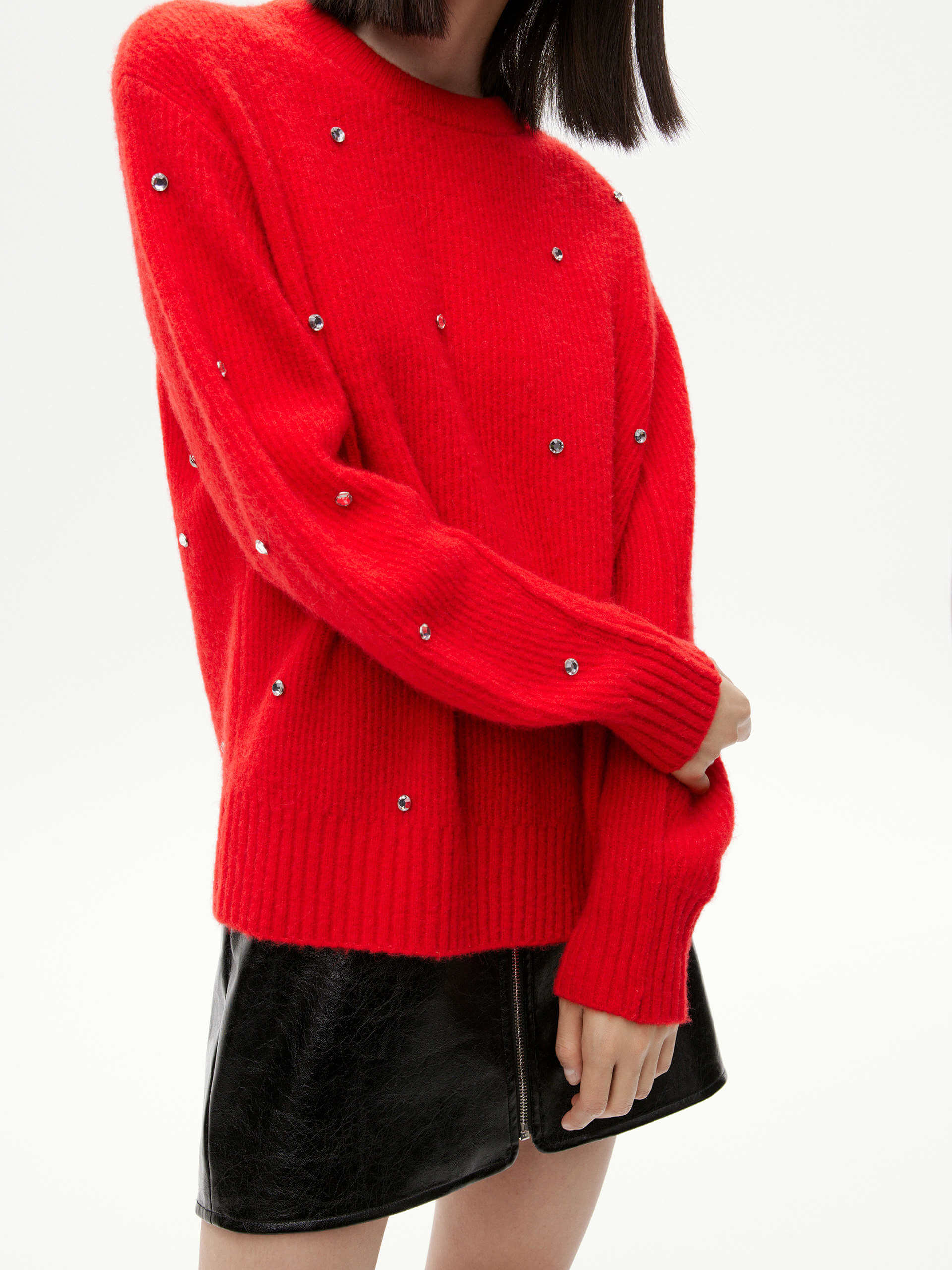 Indulge in the luxurious comfort of our sweater. Crafted with a blend of alpaca wool, it boasts a soft, plush touch. The expertly hand-applied rhinestone design adds a touch of glamour to the relaxed, versatile silhouette.