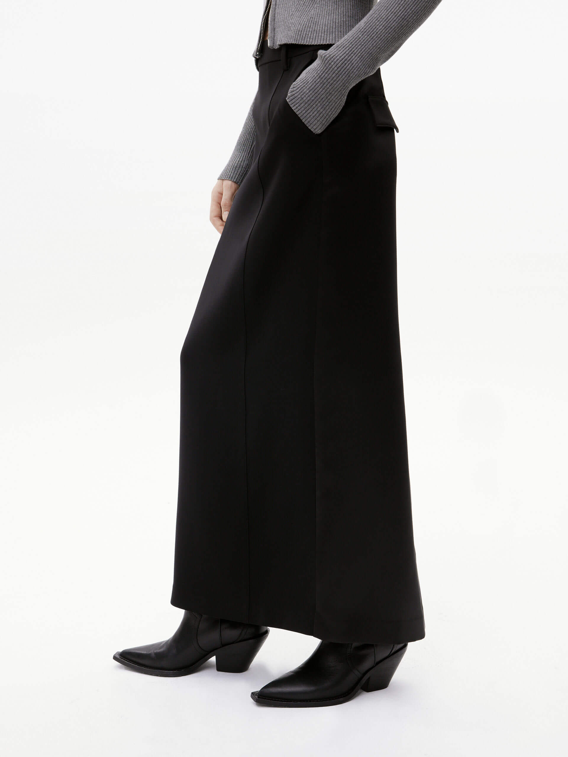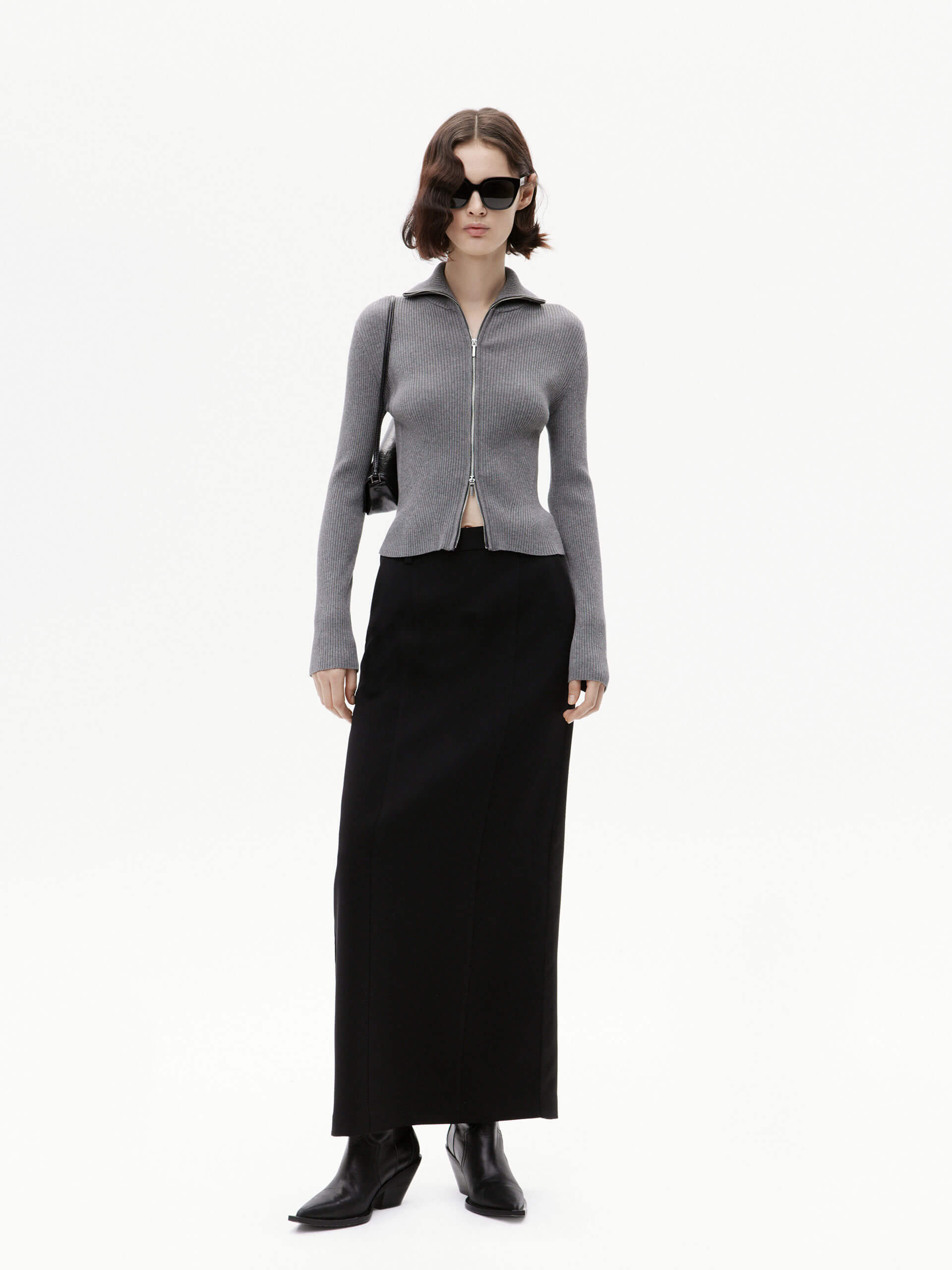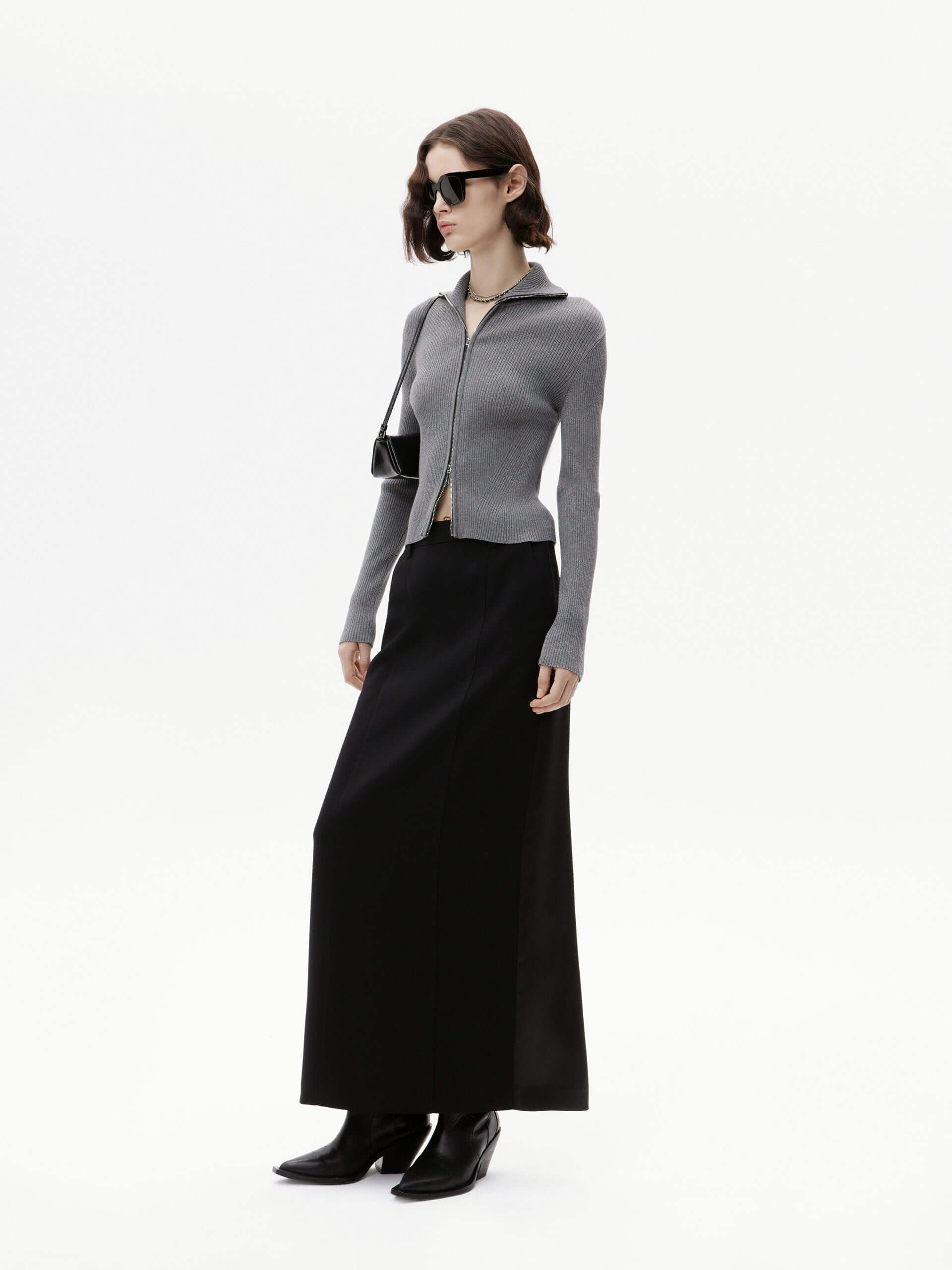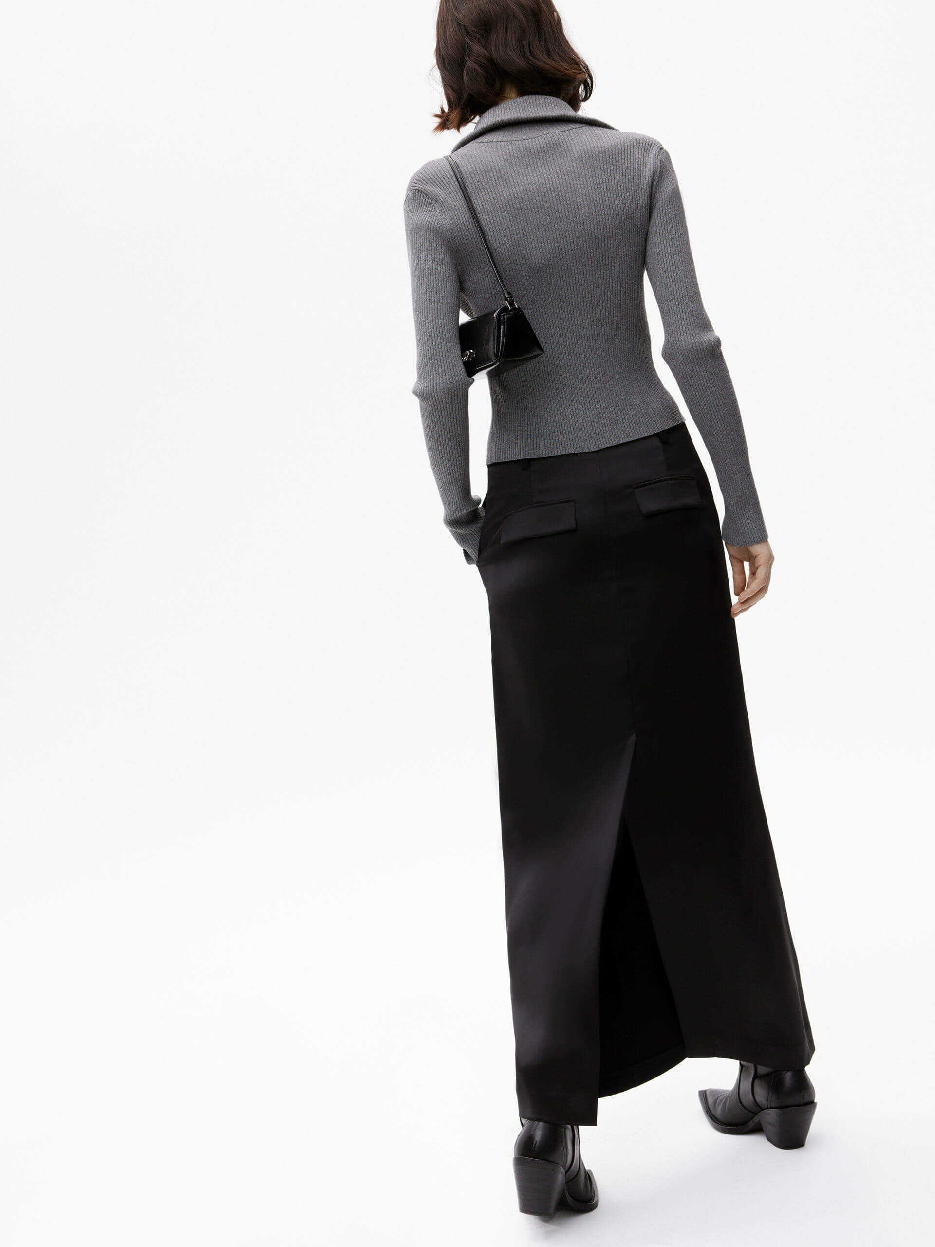 Achieve elegance with this skirt, featuring a silky-smooth fabric that accentuates your curves. High-waisted and expertly tailored with a back zipper and slit, this piece will become your favorite for any occasion or an everyday affair.