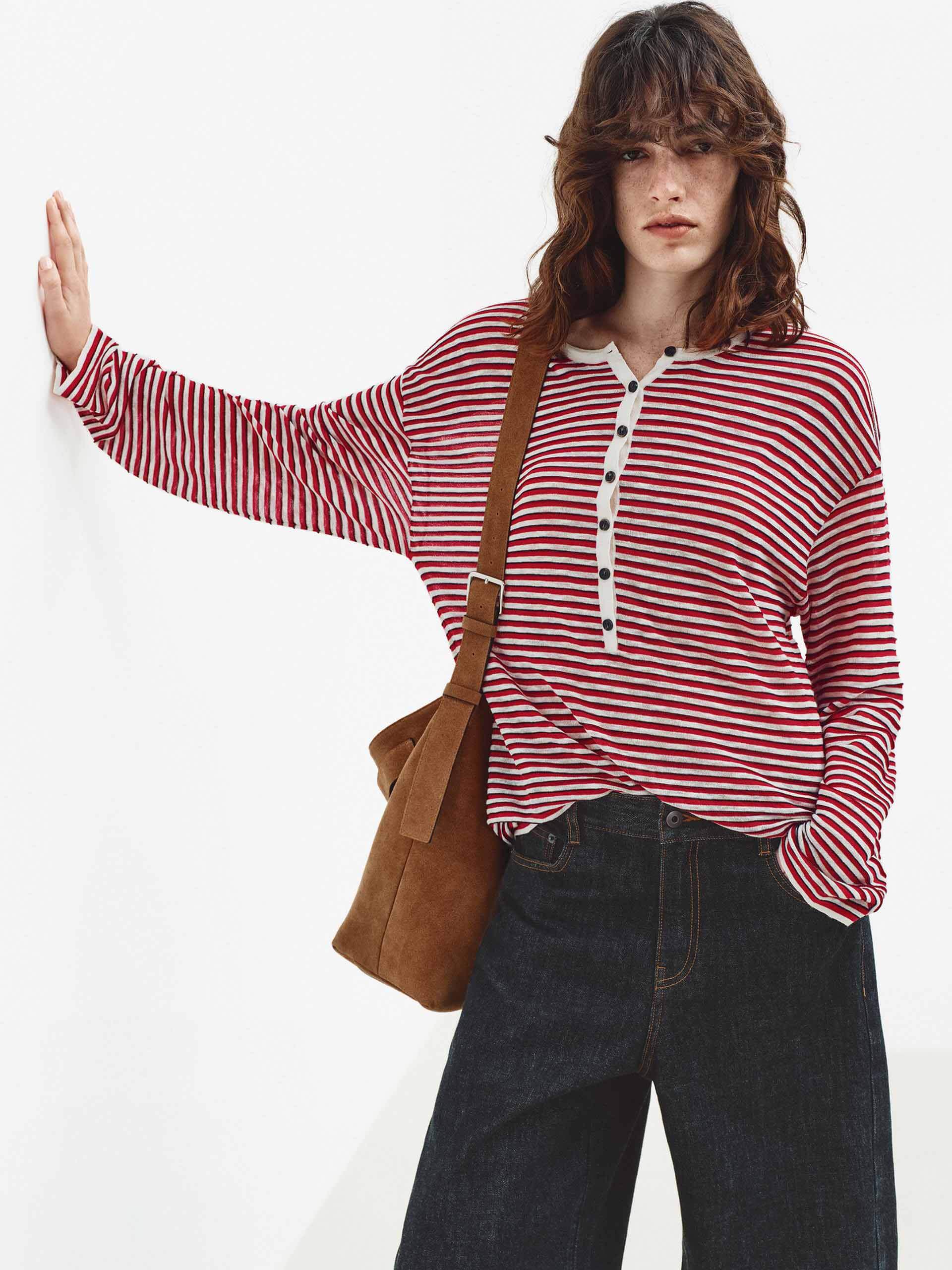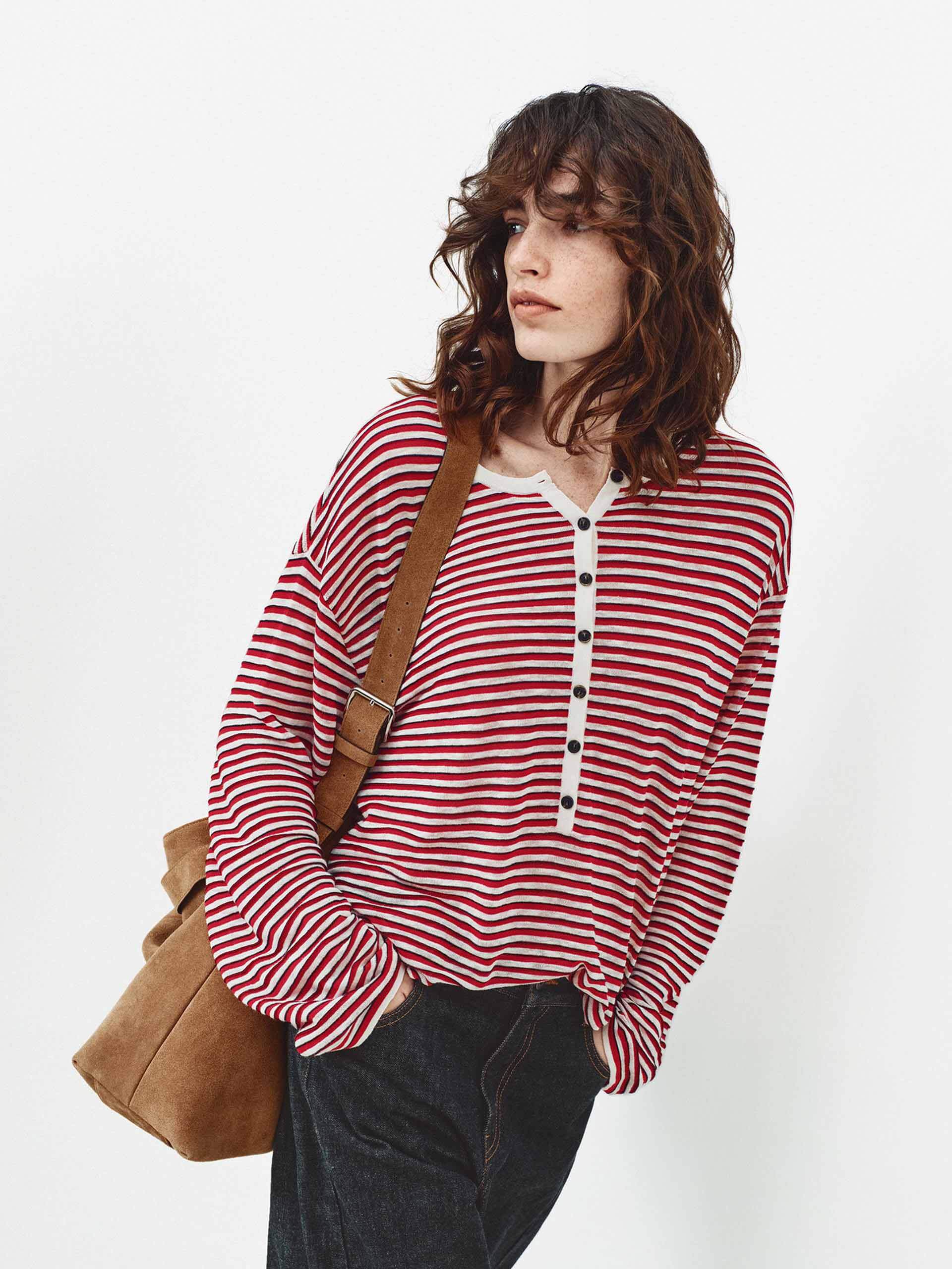 Half Button Striped Knit Top