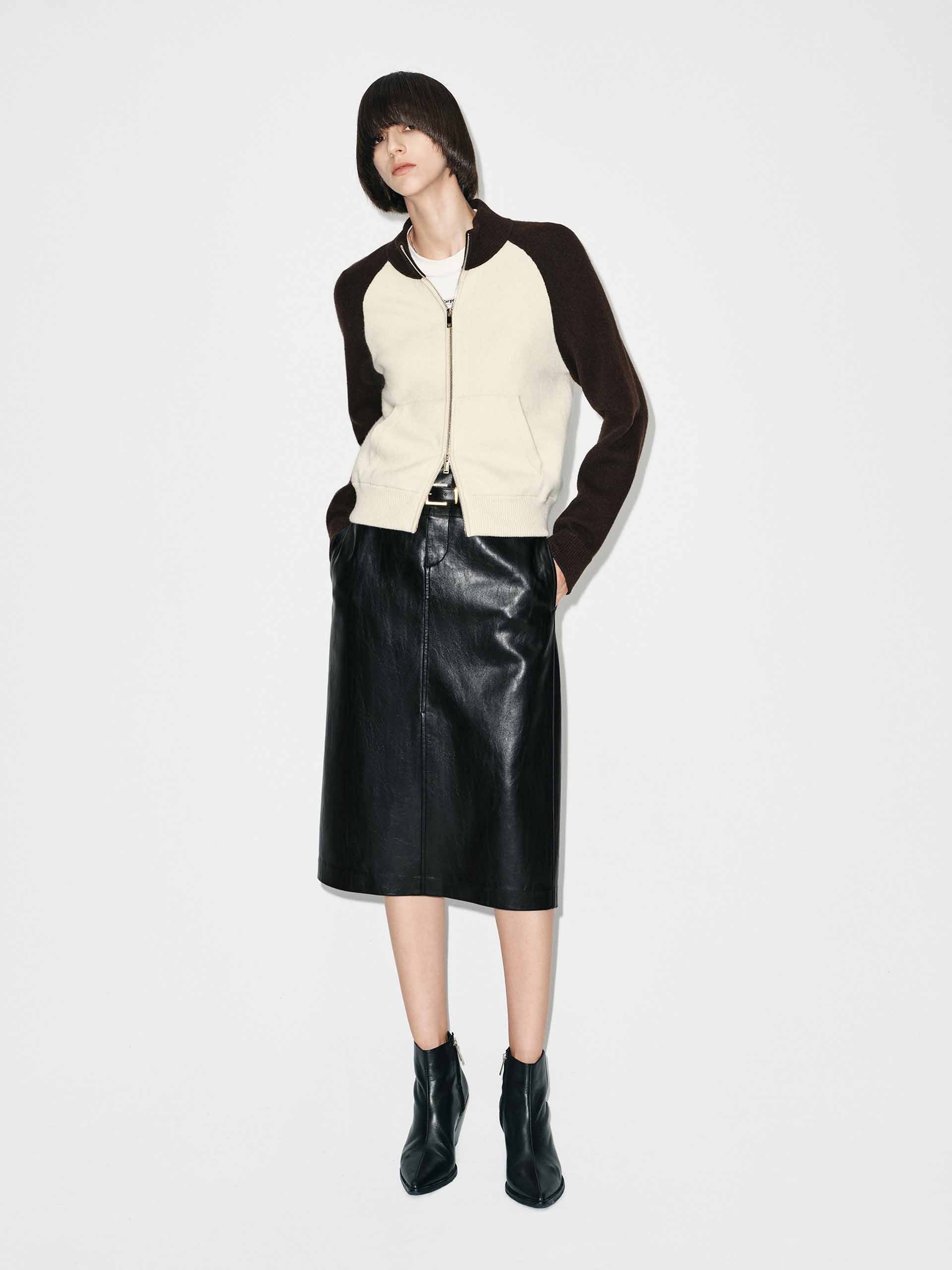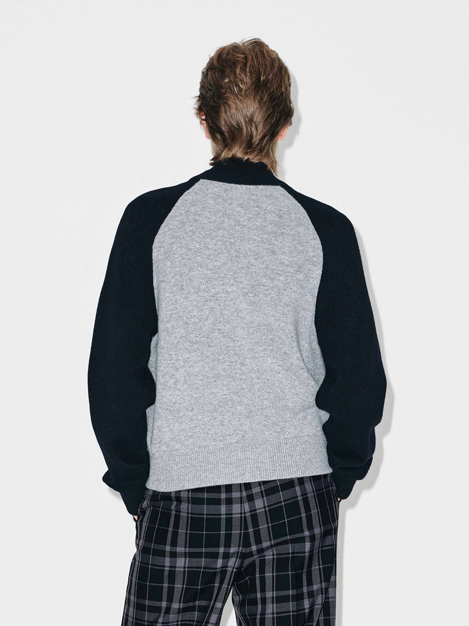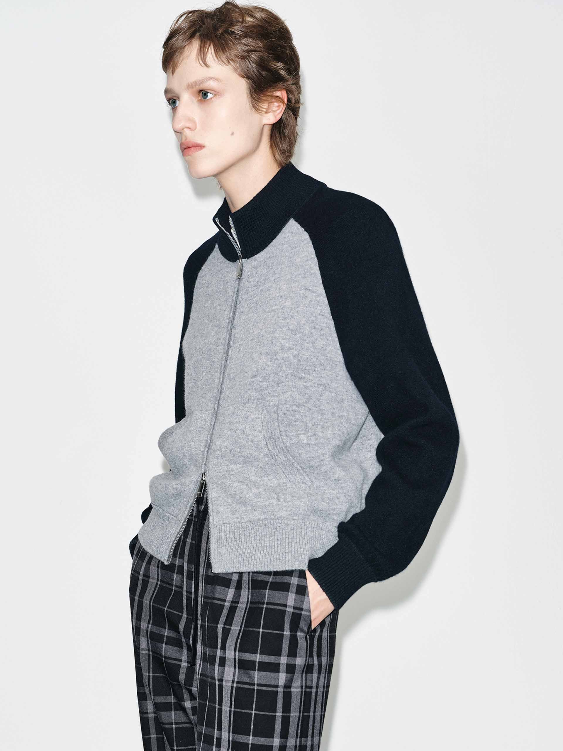 Crafted for versatility and modern comfort, this cardigan combines a soft wool blend construction with thoughtful functional details. The innovative two-way zip closure allows flexible styling. The patch pockets offer practical storage, while bold contrast raglan sleeves and a refined ribbed neckline create sharp visual lines that elevate the minimalist design.
