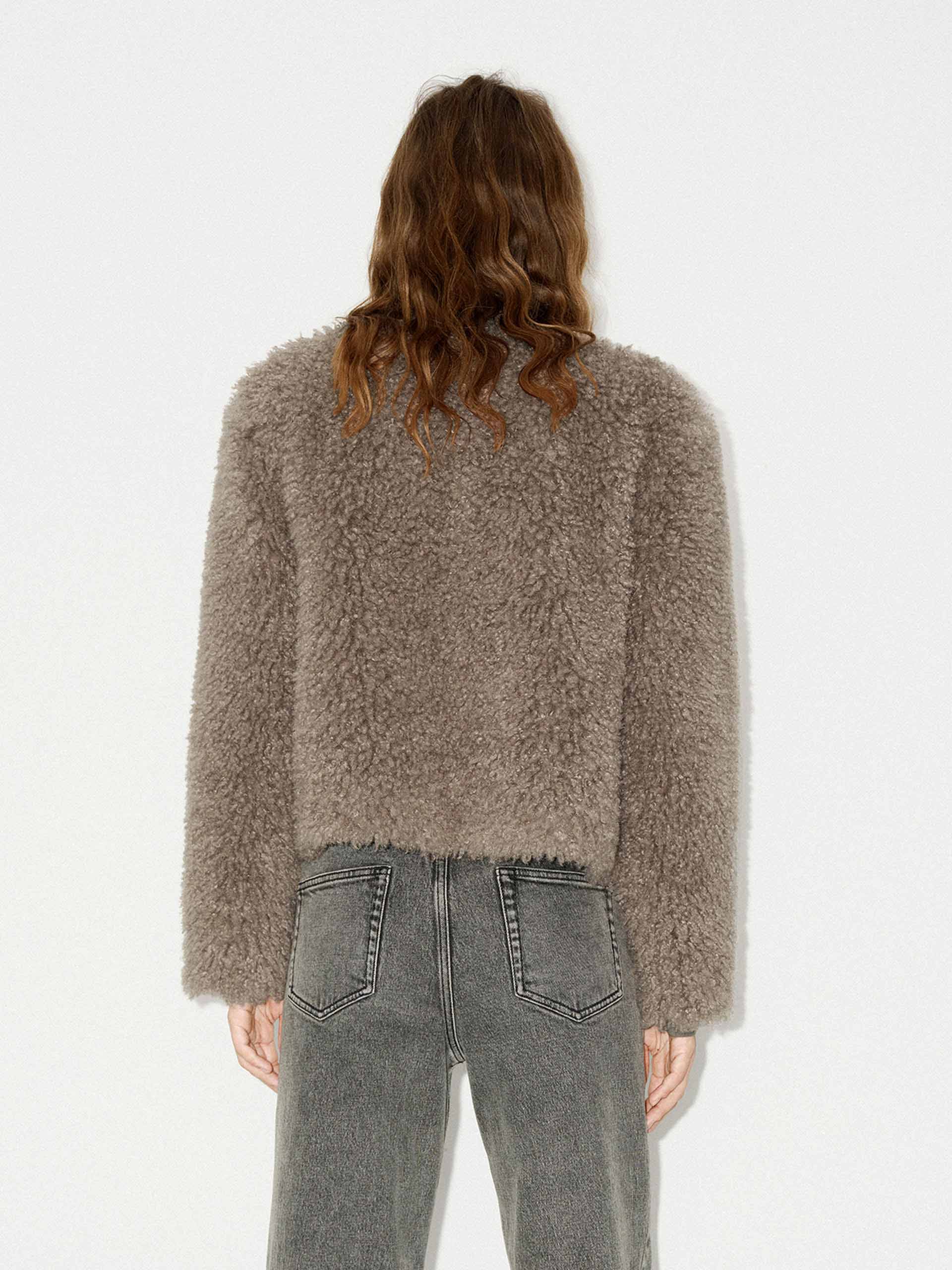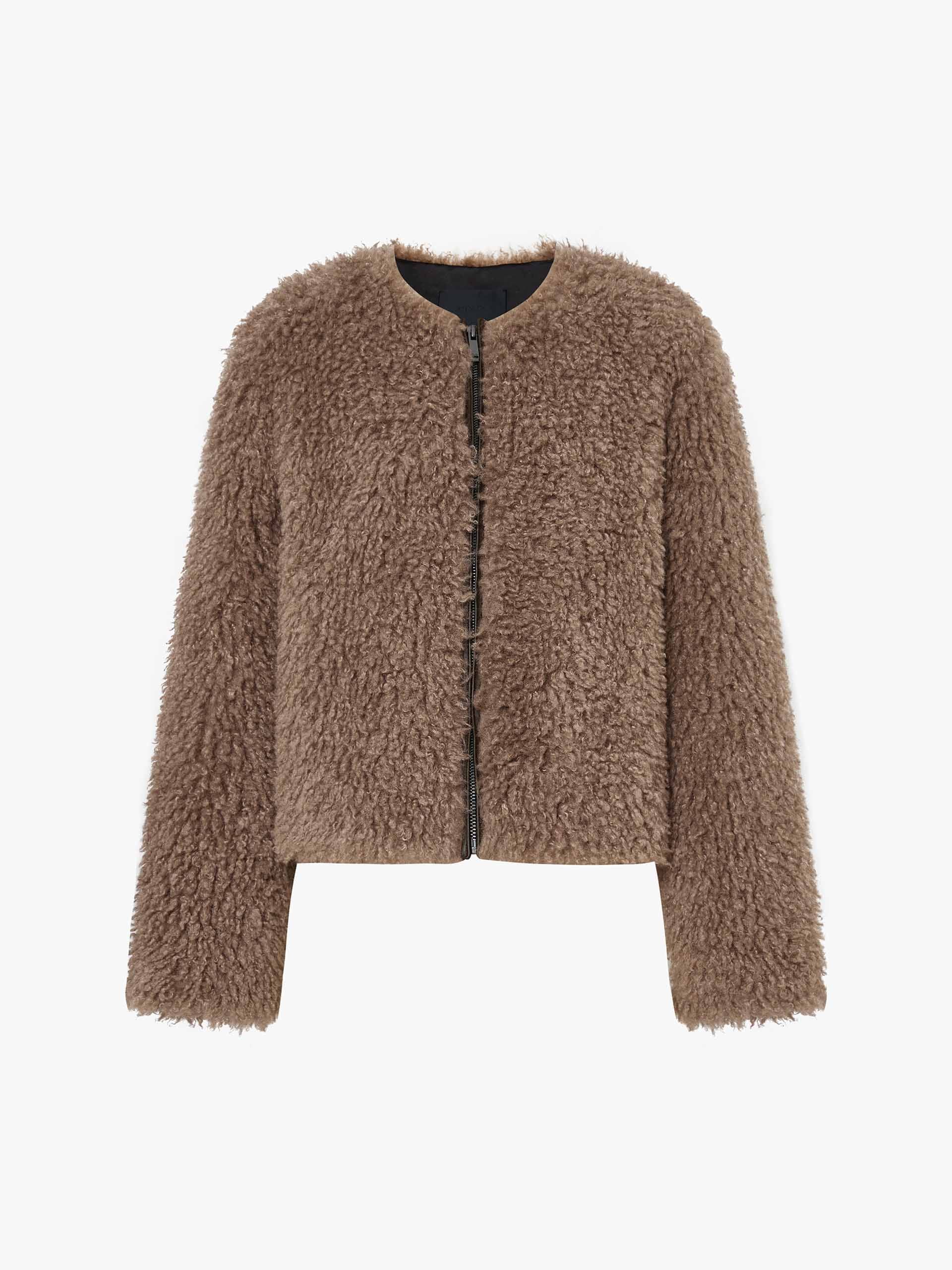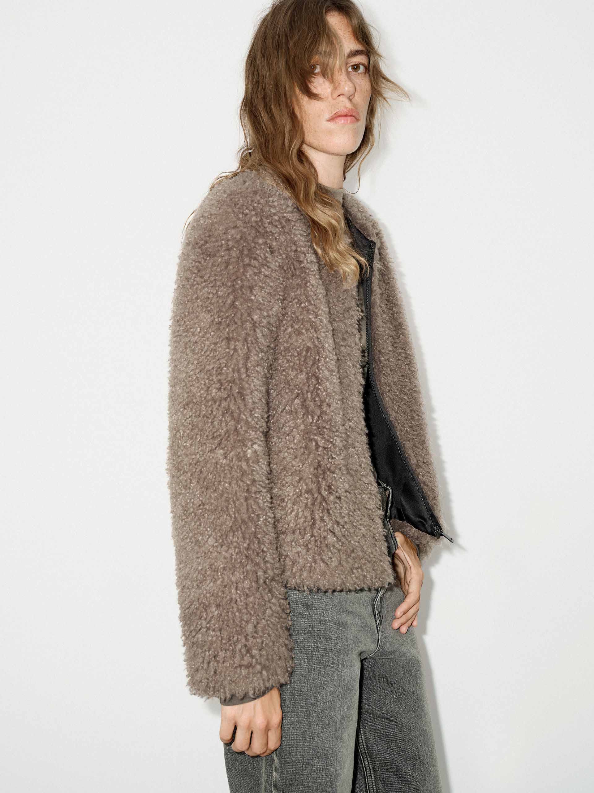 Expertly crafted, this coat offers a stylish and cozy option for colder weather. Features a fluffy boucle texture and faux shearling fur provides a warmth and texture. With its boxy fit, zip closure, and side pockets.
